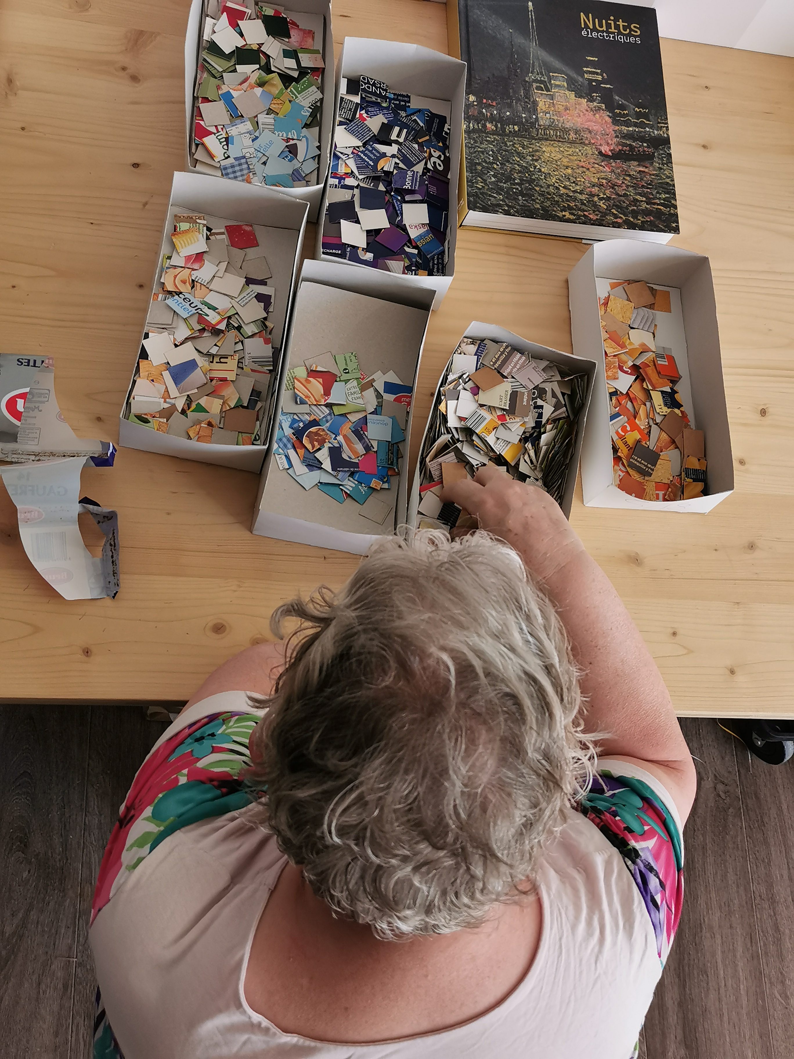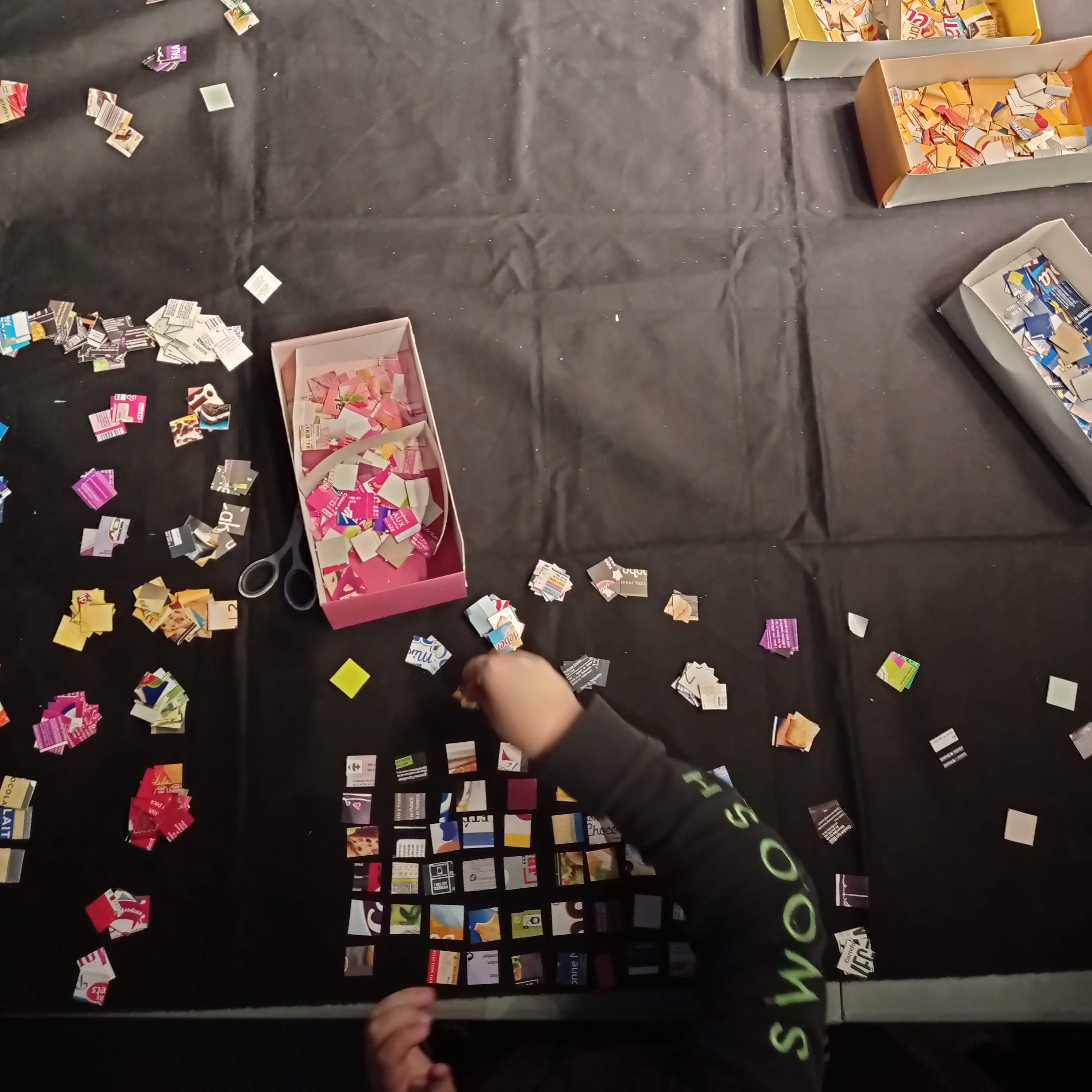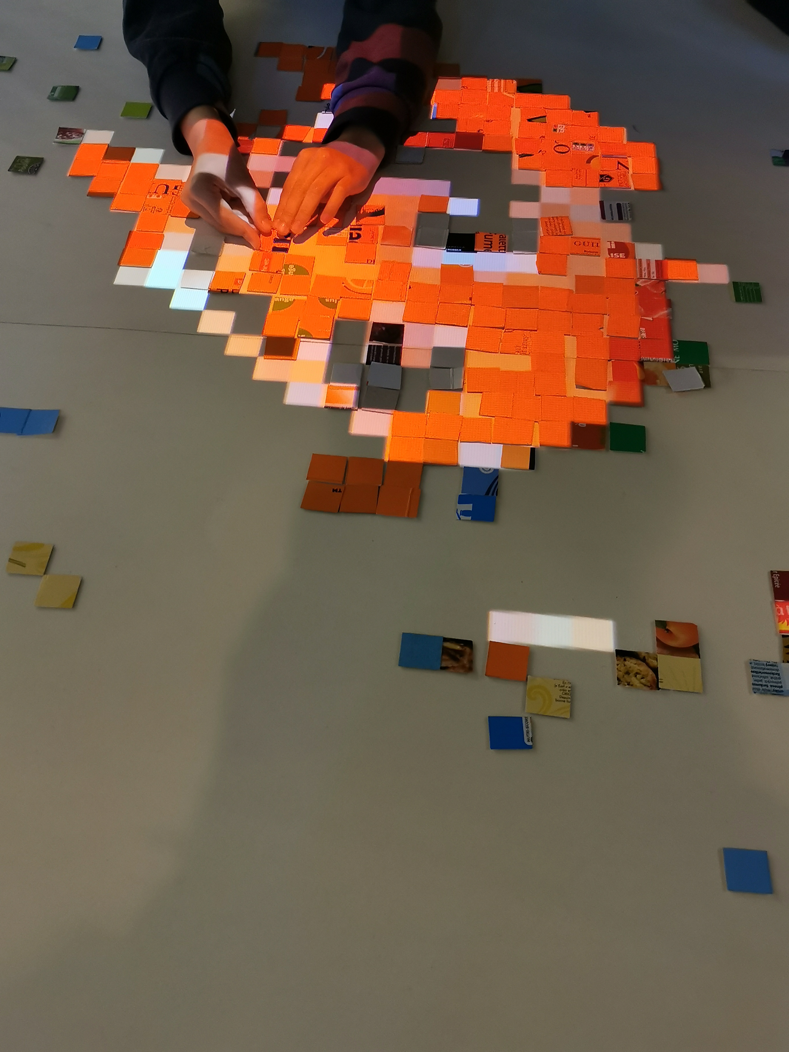 De plus, cohabite une sensibilisation au réemploi du carton d’emballage alimentaire. Dans un esprit d’entraide, organisé ou en auto-gestion, les participant.e.s sont invité.e.s à tracer, découper les emballages en carrés de 2,5 cm, puis les trier par couleur. Les zones colorées sur le support final sont définies par l’image projetée et sont à combler avec les pixels en carton se rapprochant le plus possible de la couleur.