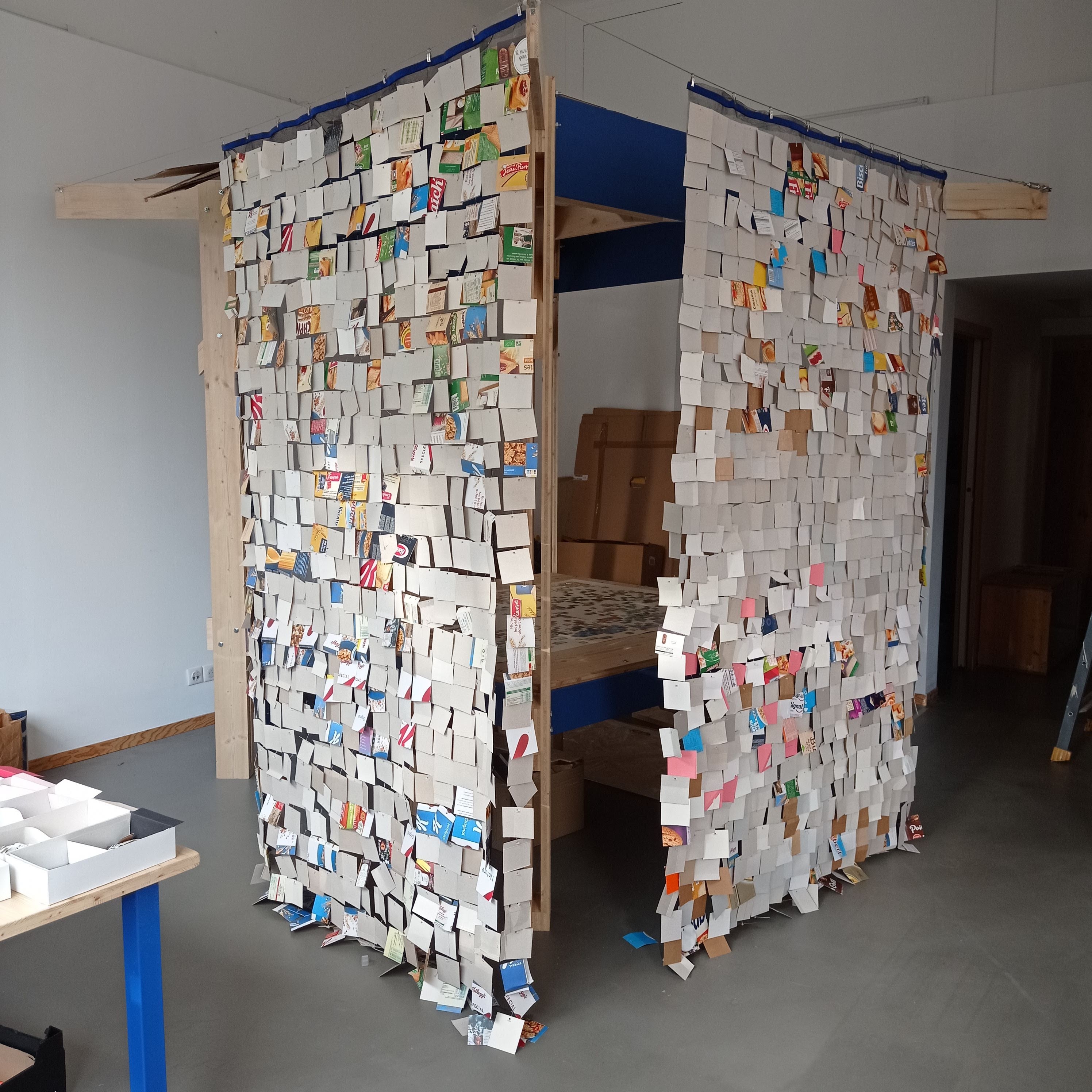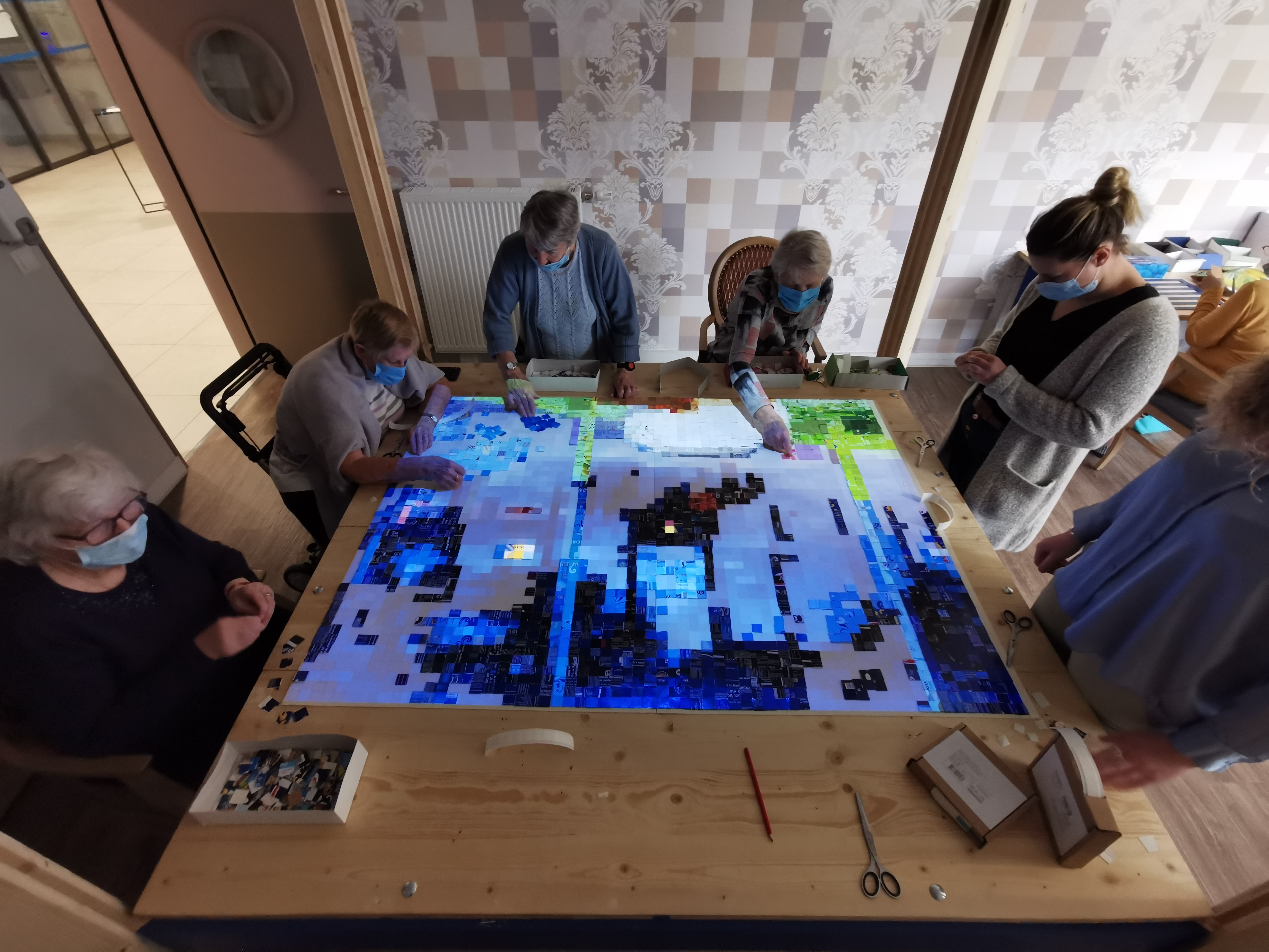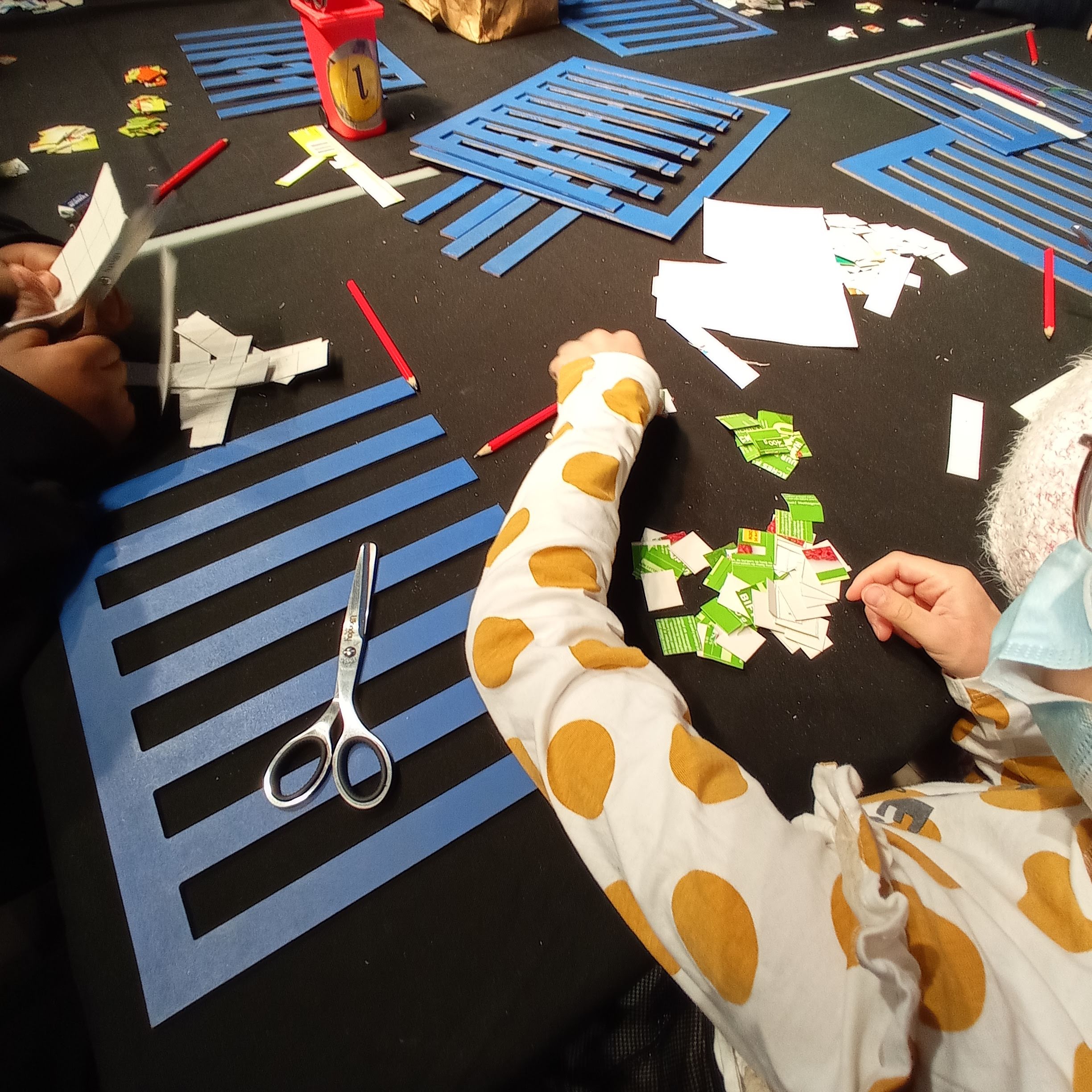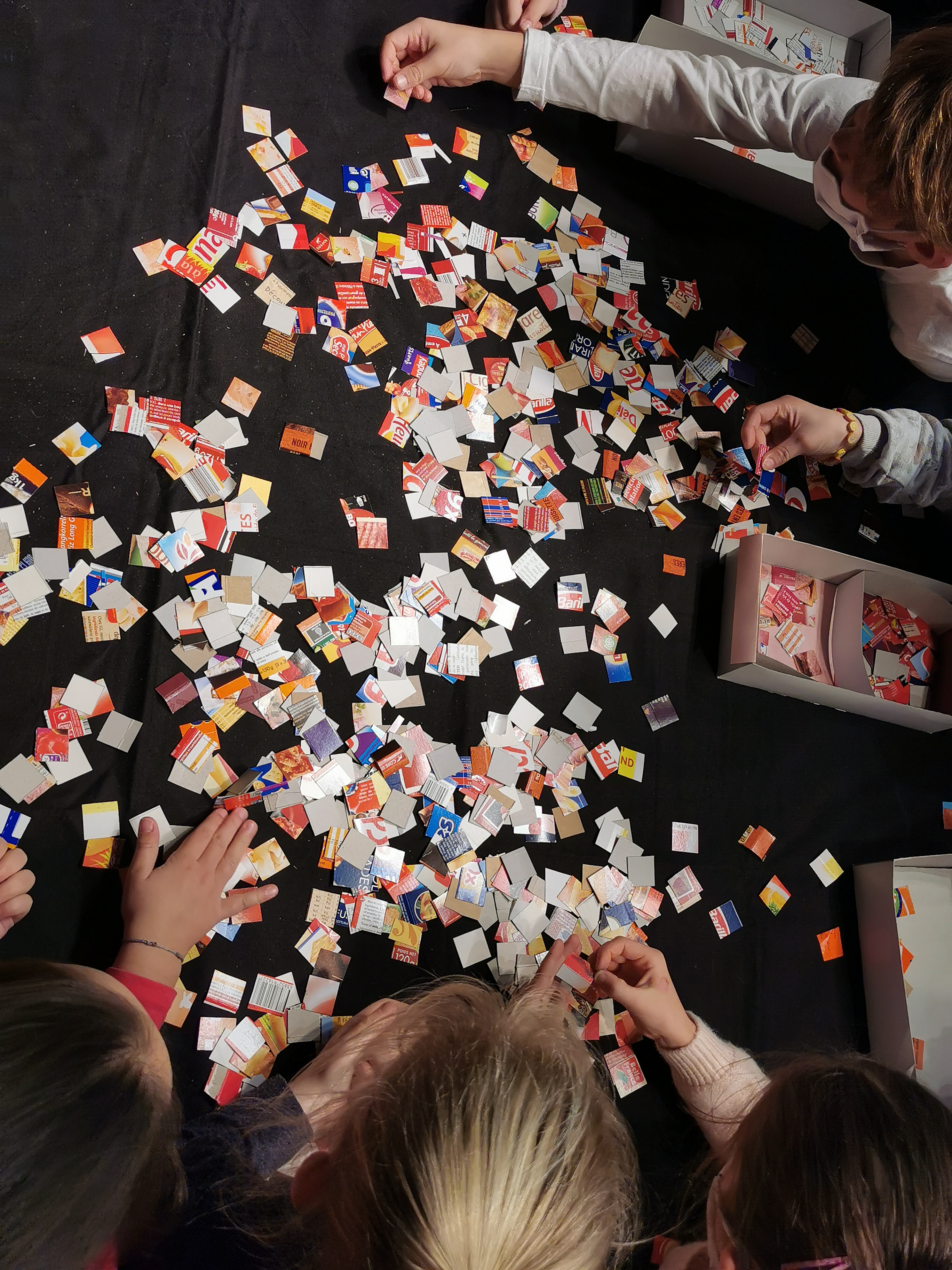 De plus, cohabite une sensibilisation au réemploi du carton d’emballage alimentaire. Dans un esprit d’entraide, organisé ou en auto-gestion, les participant.e.s sont invité.e.s à tracer, découper les emballages en carrés de 2,5 cm, puis les trier par couleur. Les zones colorées sur le support final sont définies par l’image projetée et sont à combler avec les pixels en carton se rapprochant le plus possible de la couleur.