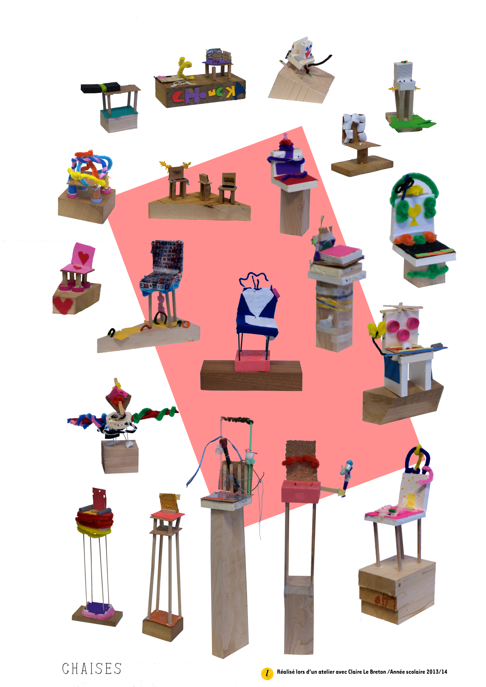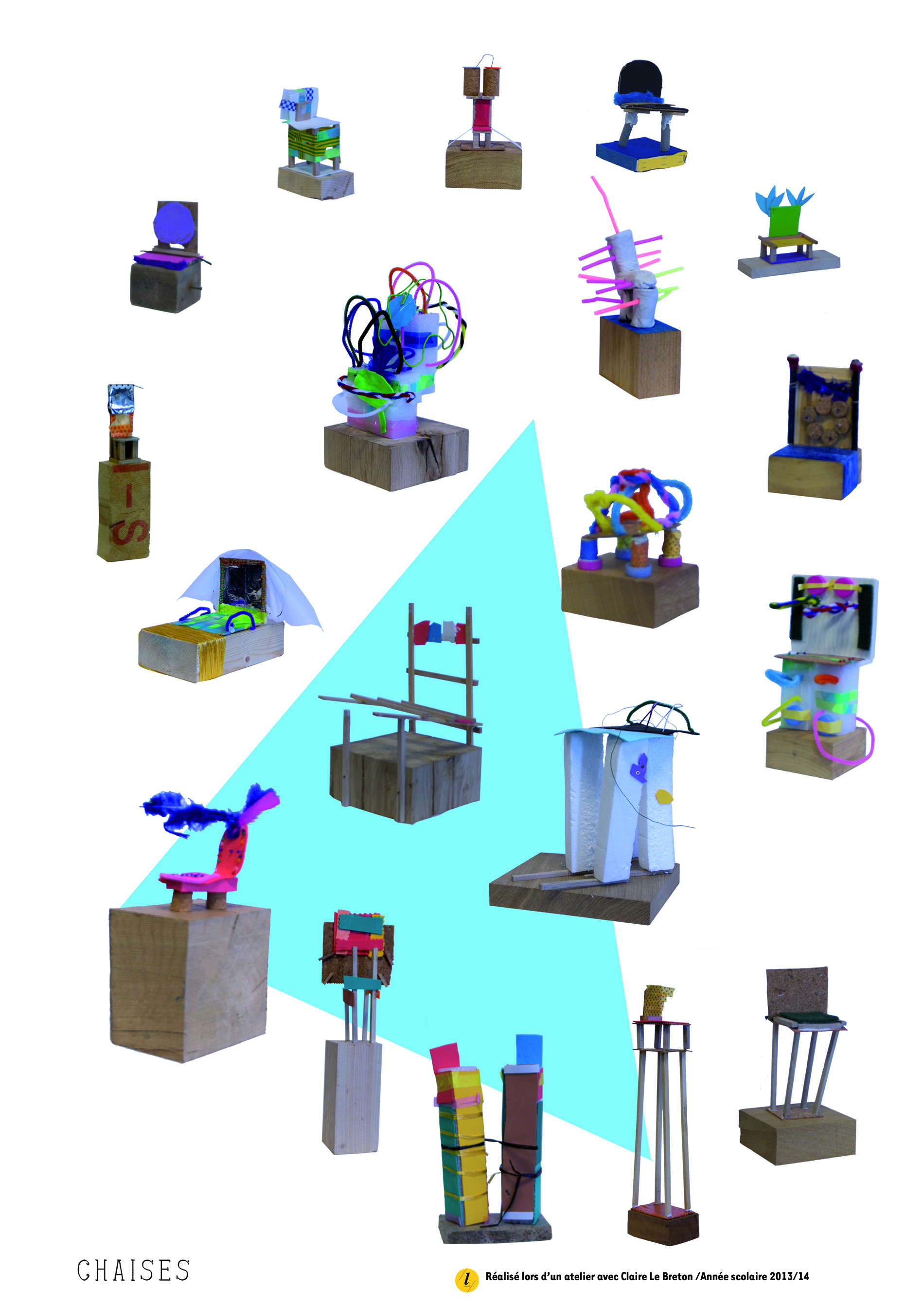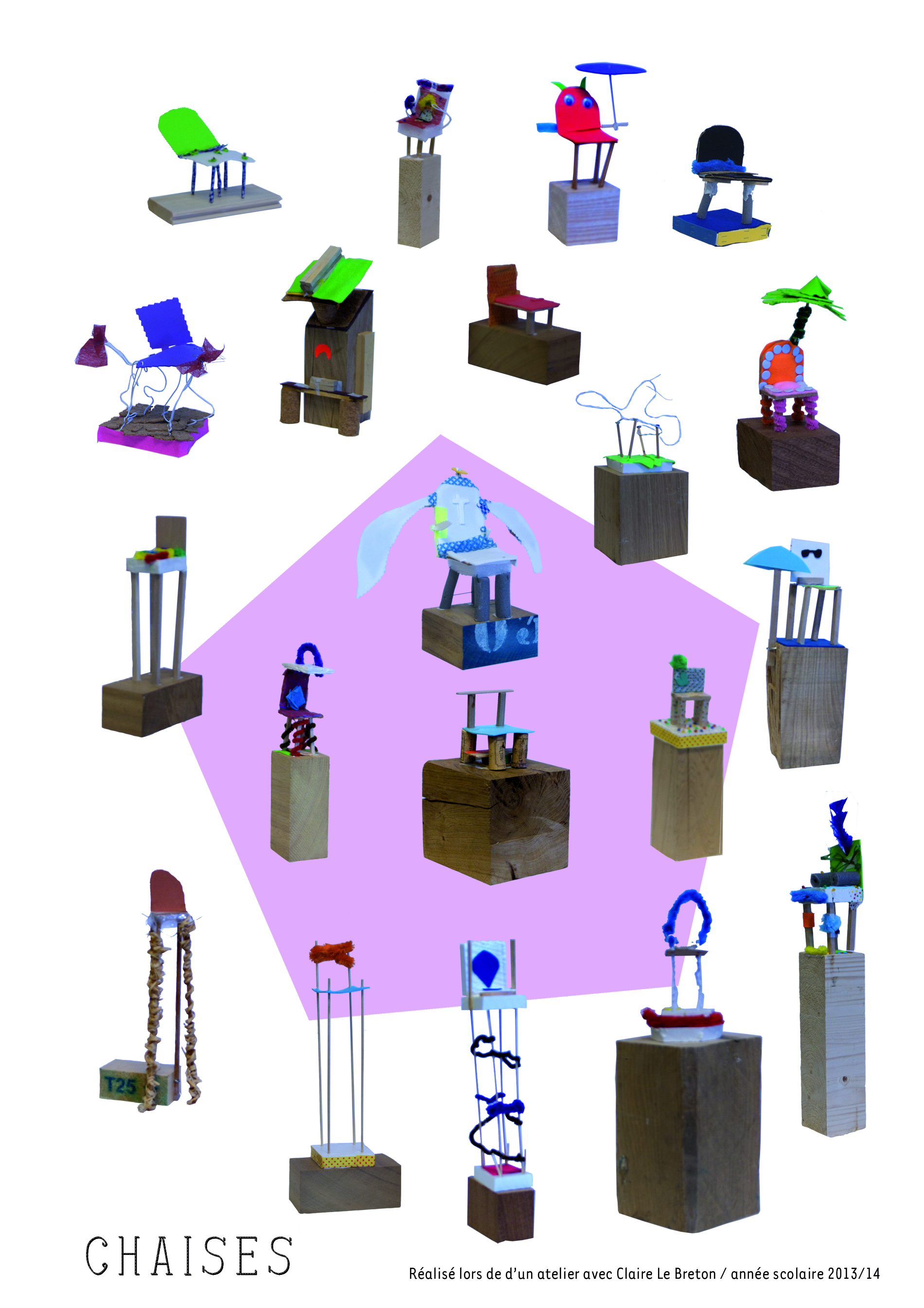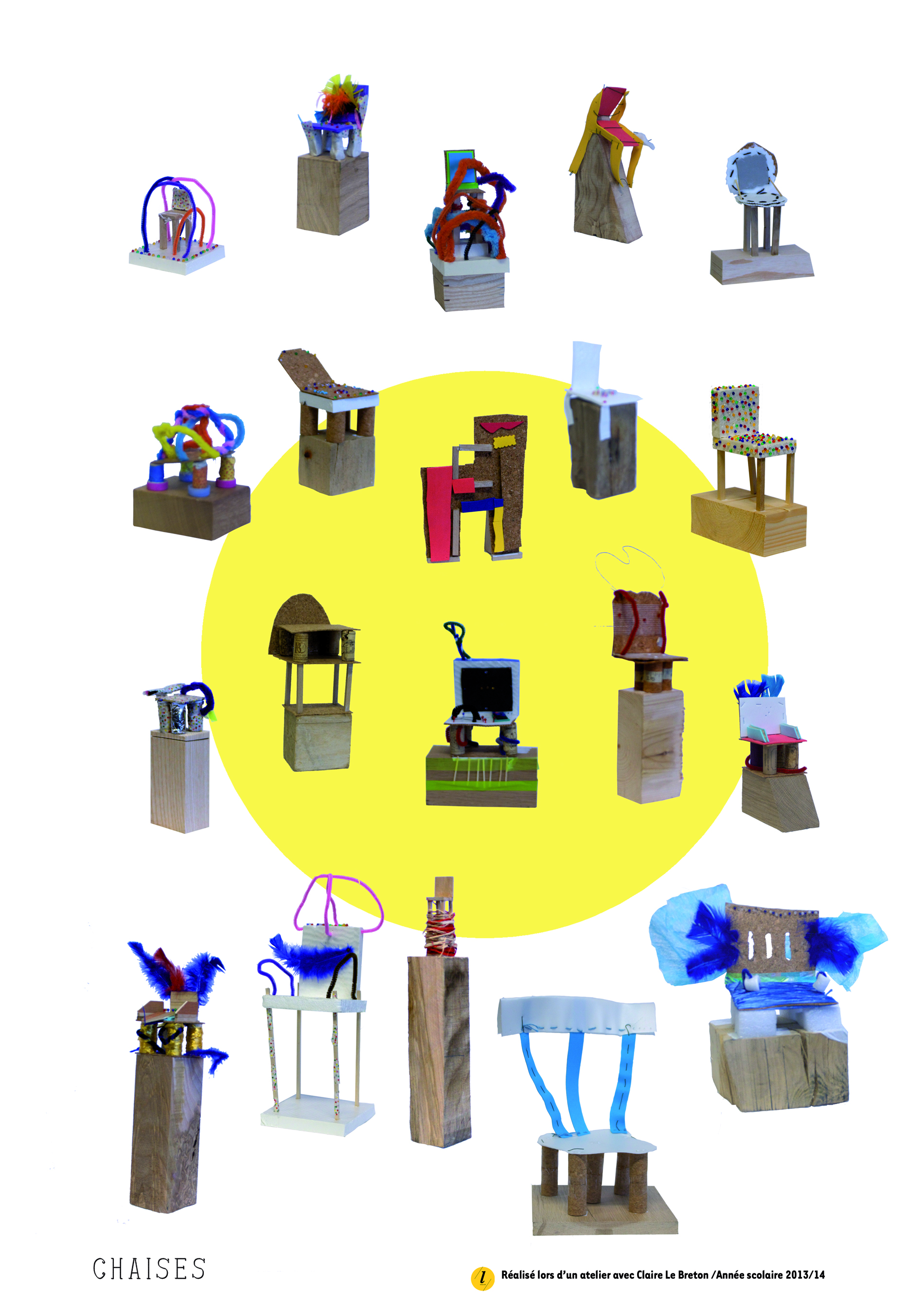 L’atelier a commencé par la découverte d’une installation « à-chaise » de Claire Le Breton présente dans la salle d’exposition de l’école Varlin 2 puis par la présentation d’une trentaine de chaises de créateurs (plasticiens et designers).