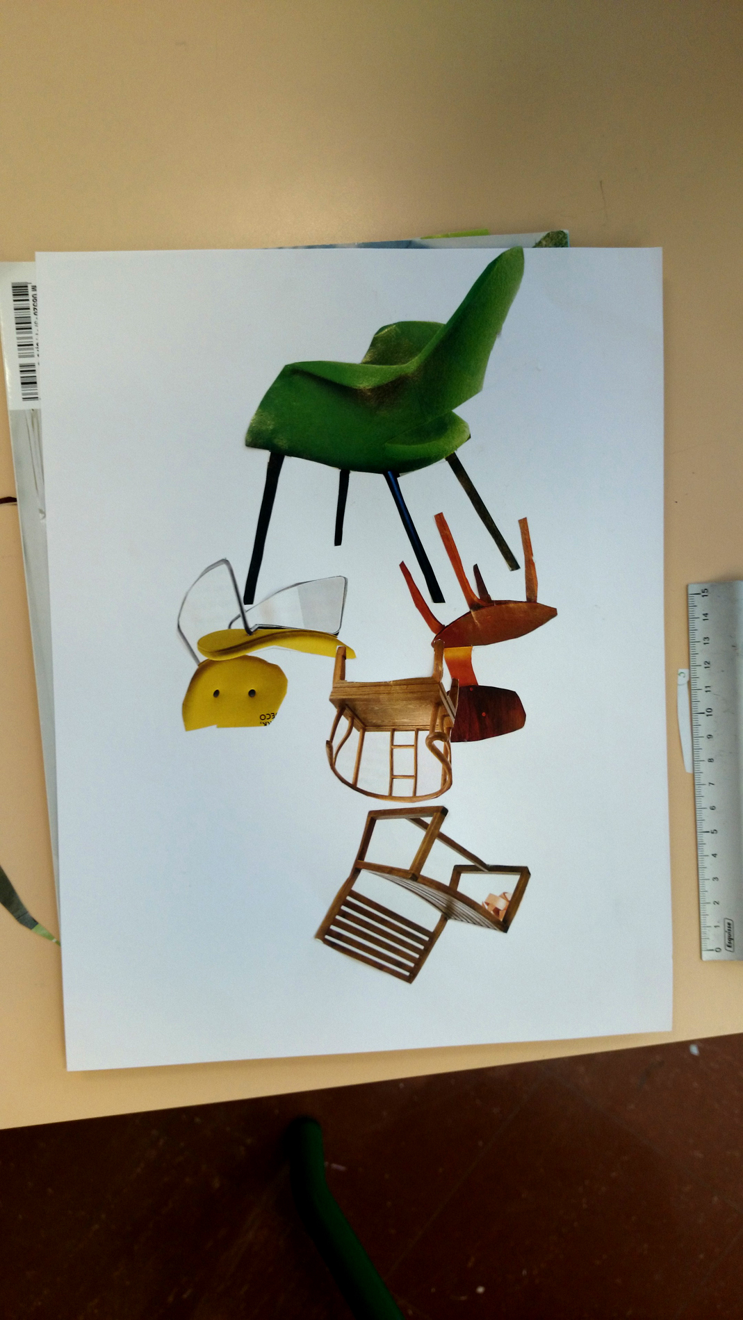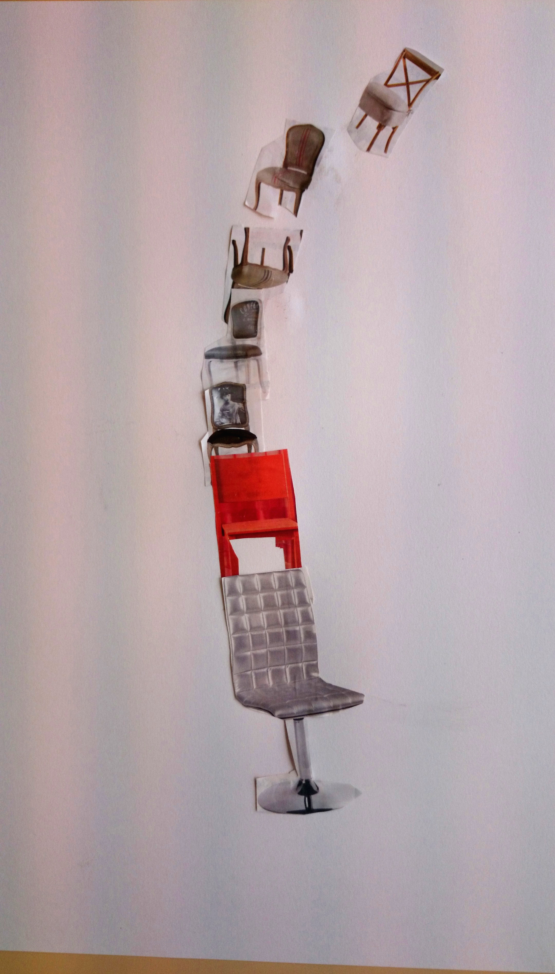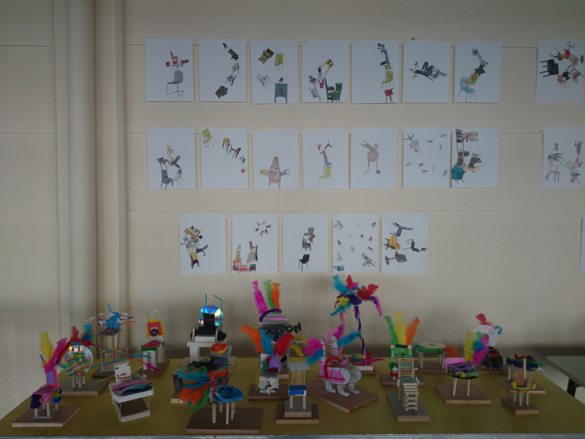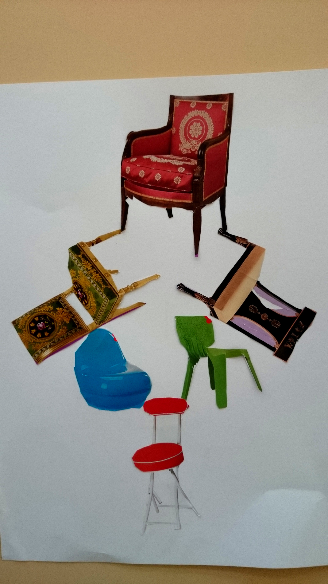 Dans un premier temps (contrairement à l’école Varlin 2) les élèves ont été invité à créer un composition à partir d’images de chaises découpés dans des catalogues.
