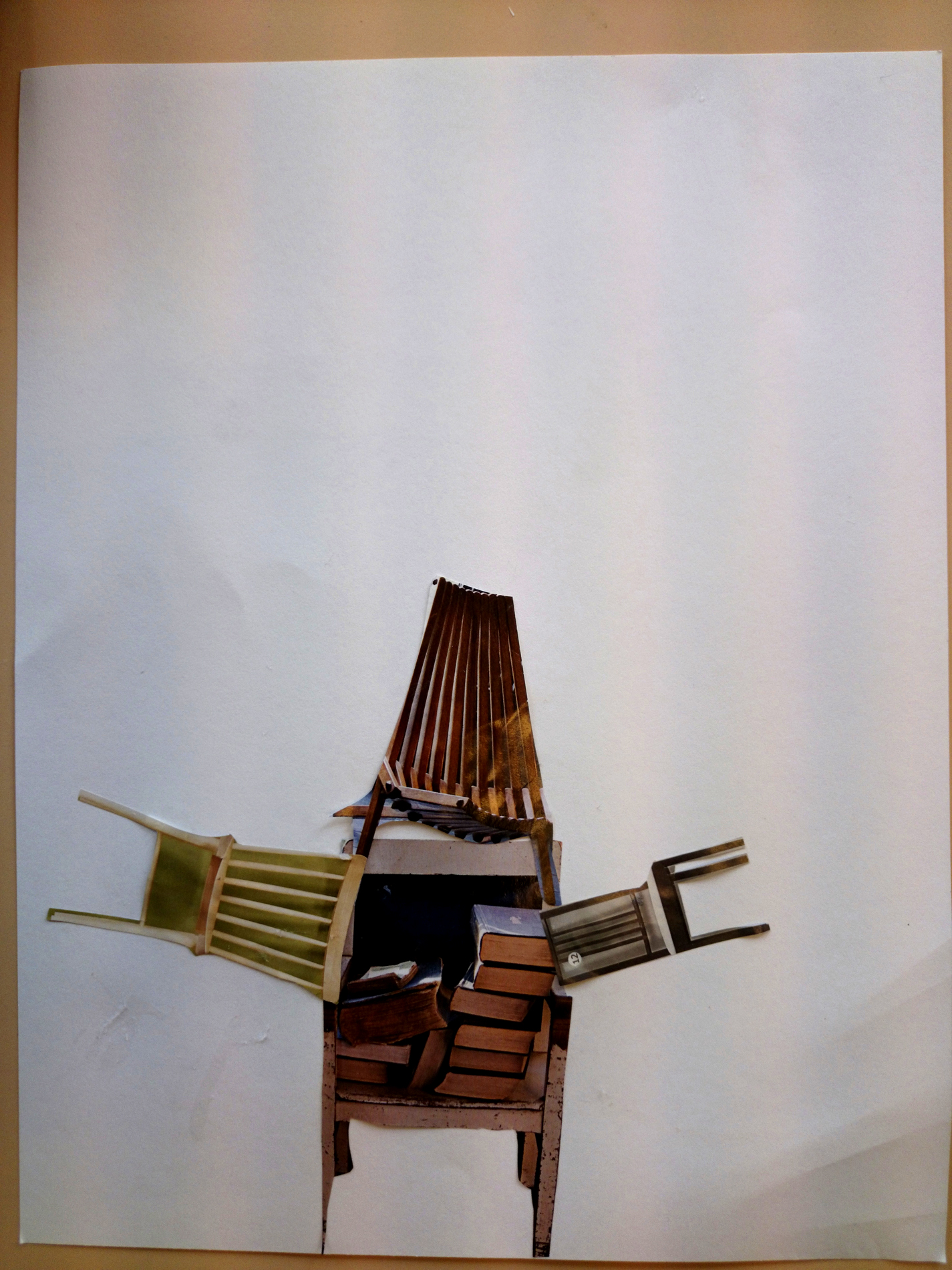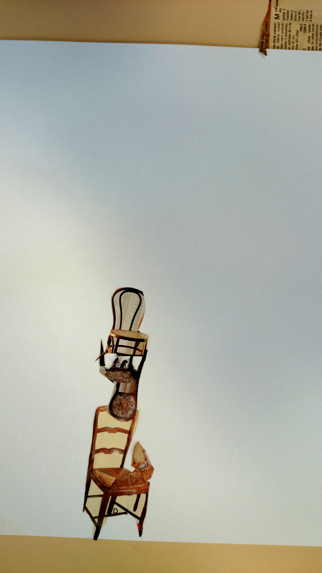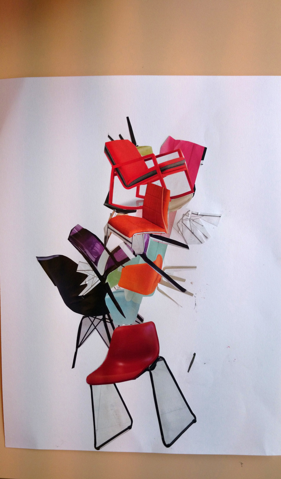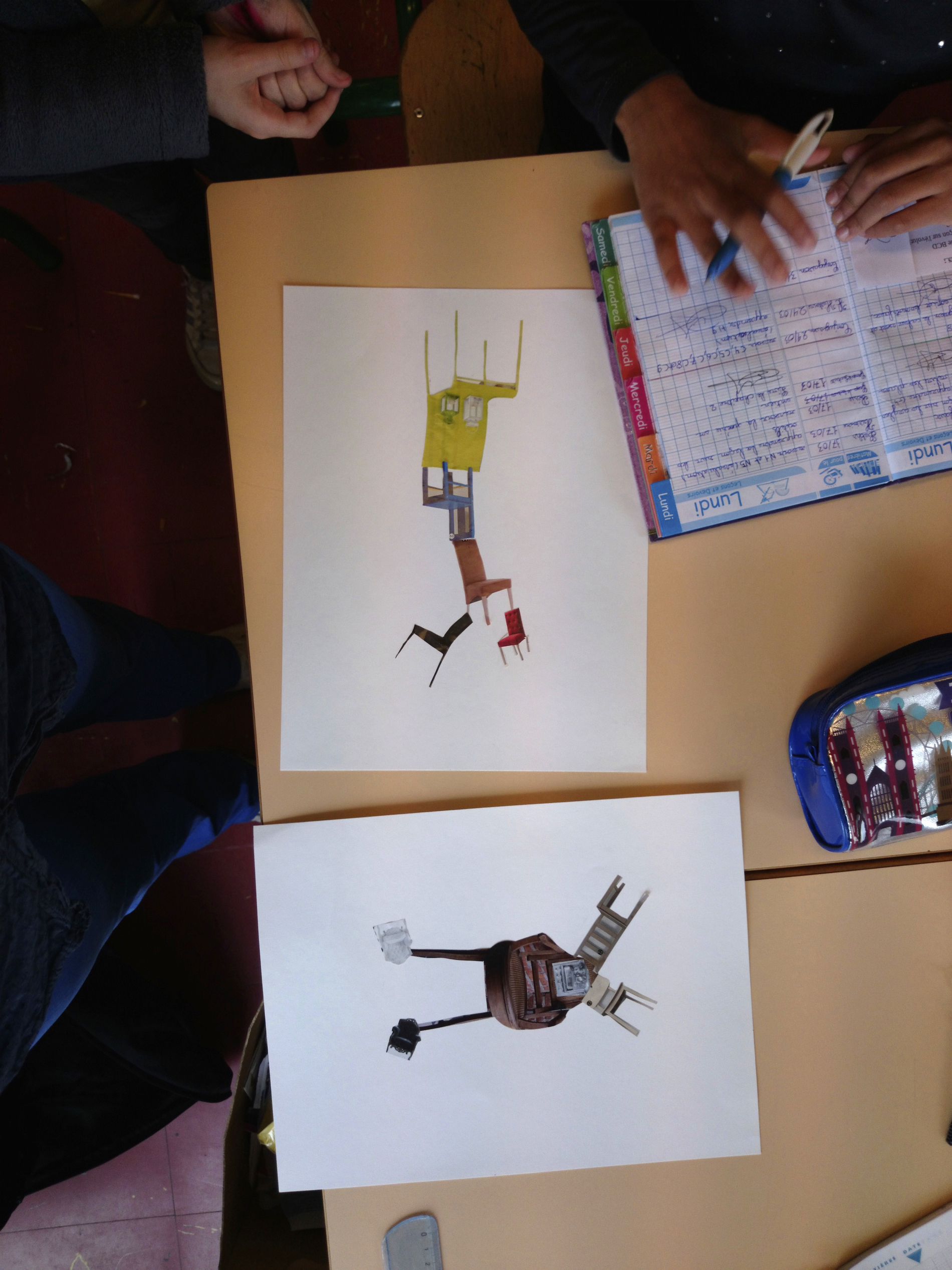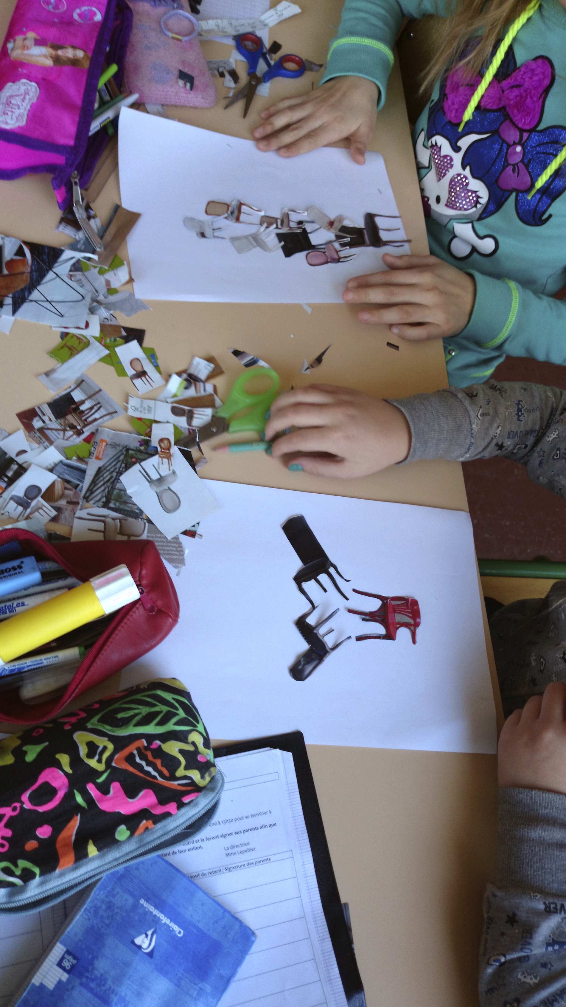 Dans un premier temps (contrairement à l’école Varlin 2) les élèves ont été invité à créer un composition à partir d’images de chaises découpés dans des catalogues.