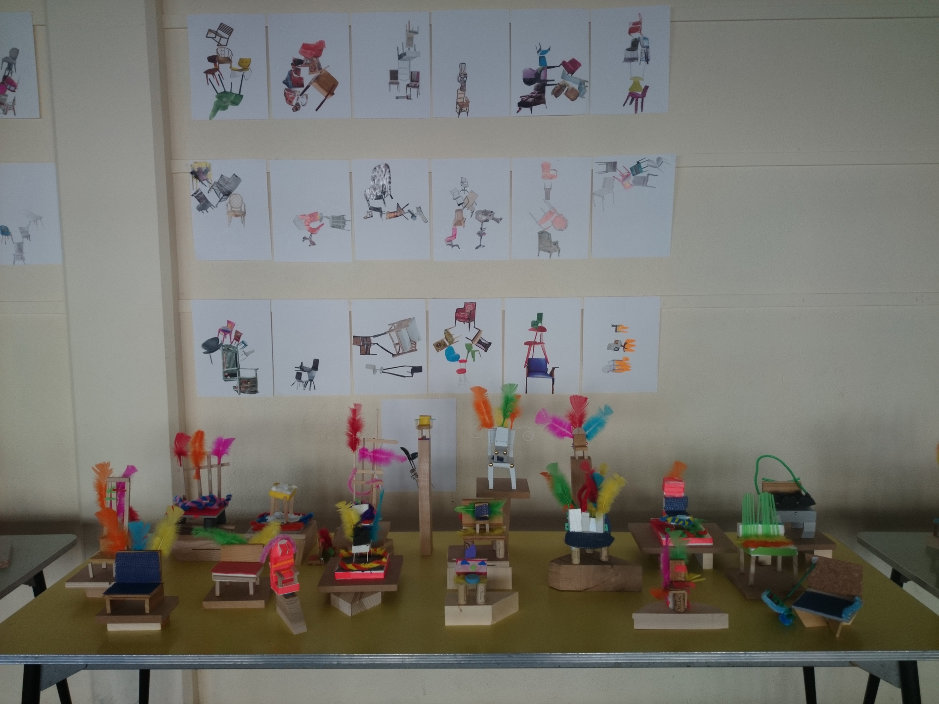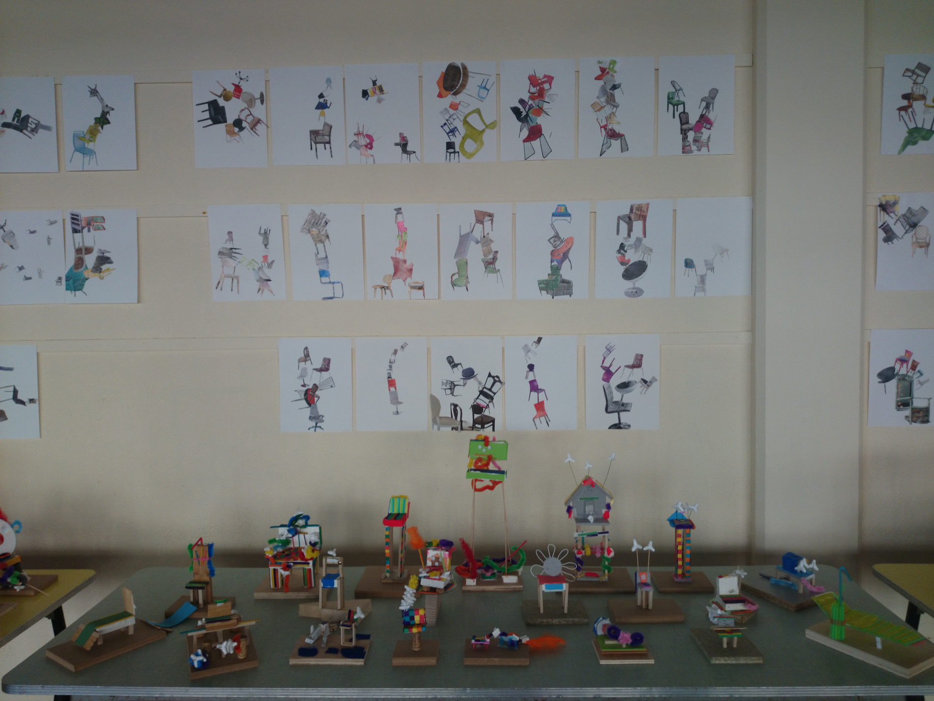 L’atelier a commencé par la découcerte d’une installation « à-chaise » de Claire Le Breton présente dans la salle d’exposition de l’école Varlin 2 puis par la présentation d’une trentaine de chaises de créateurs (plasticiens et designers).