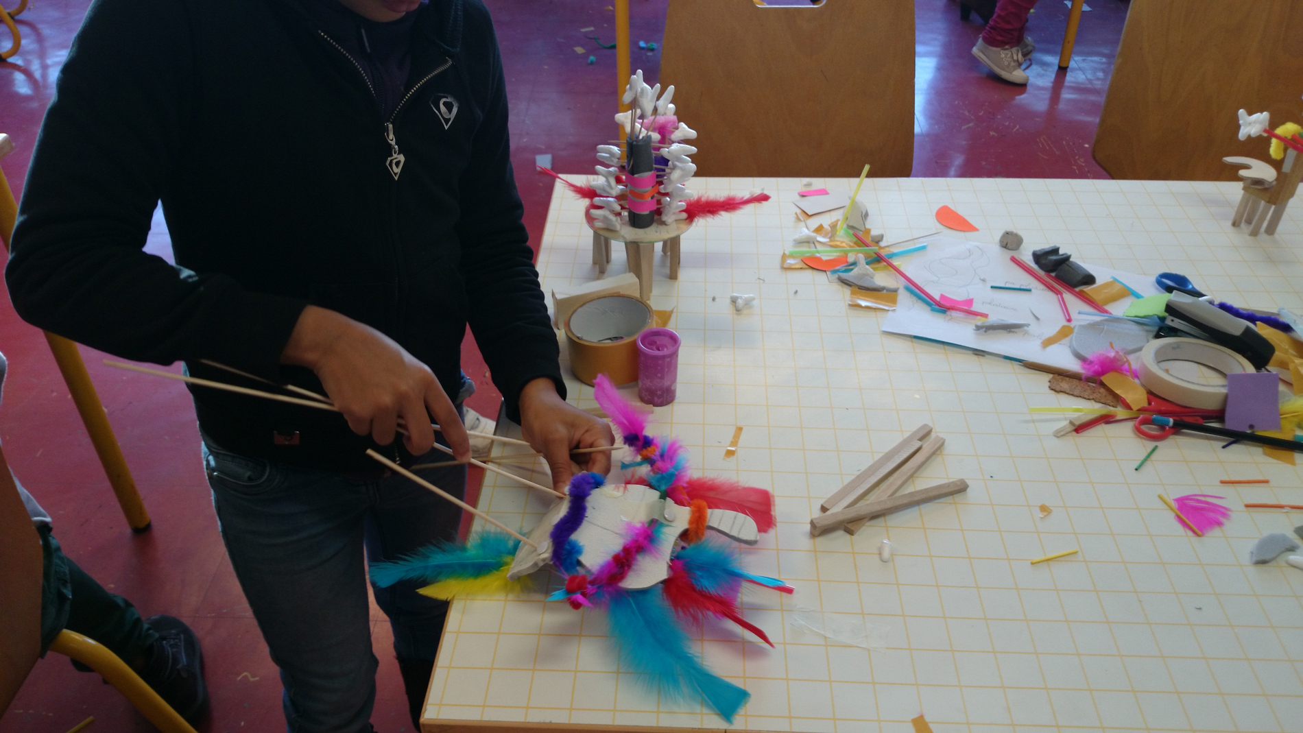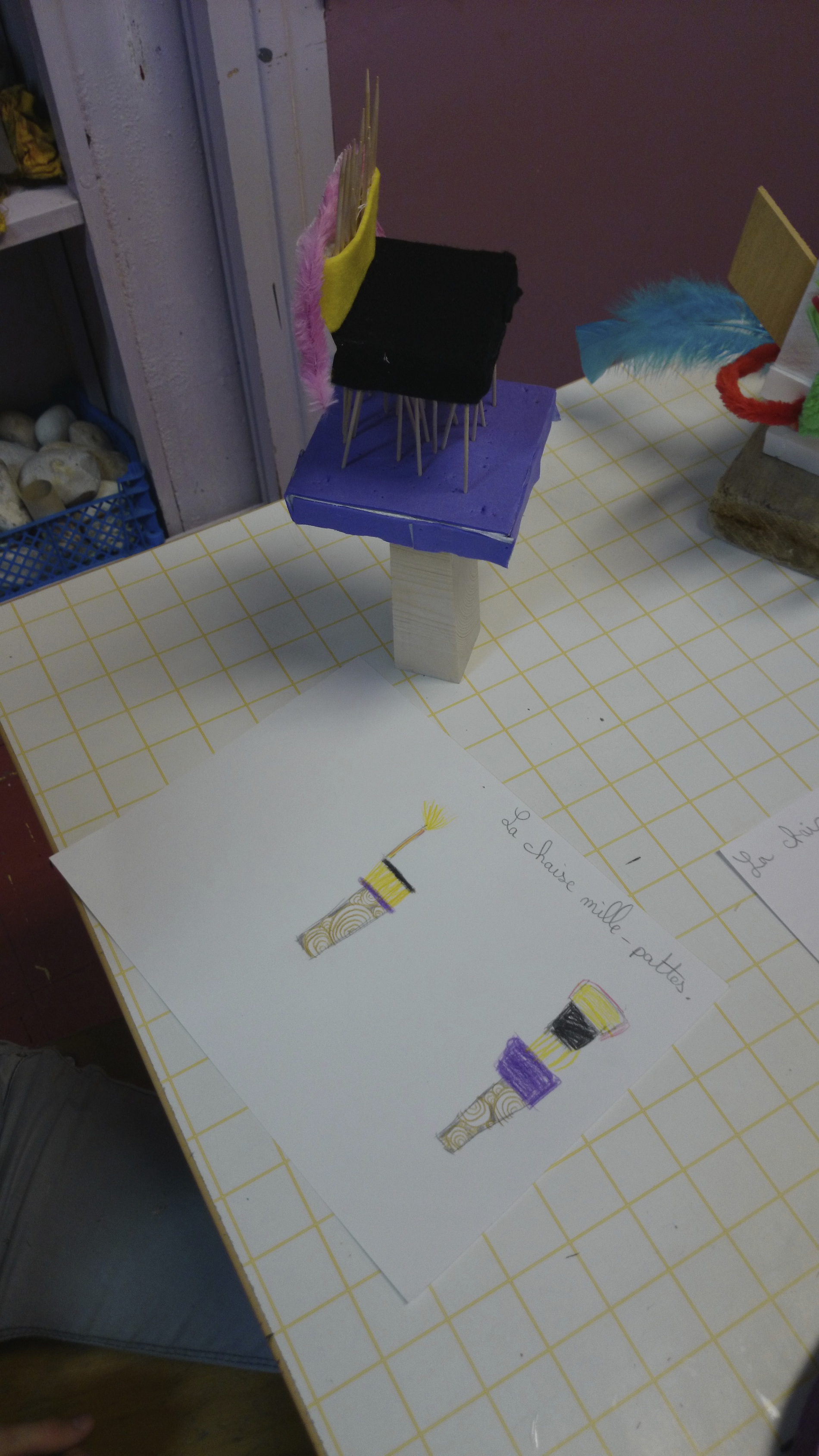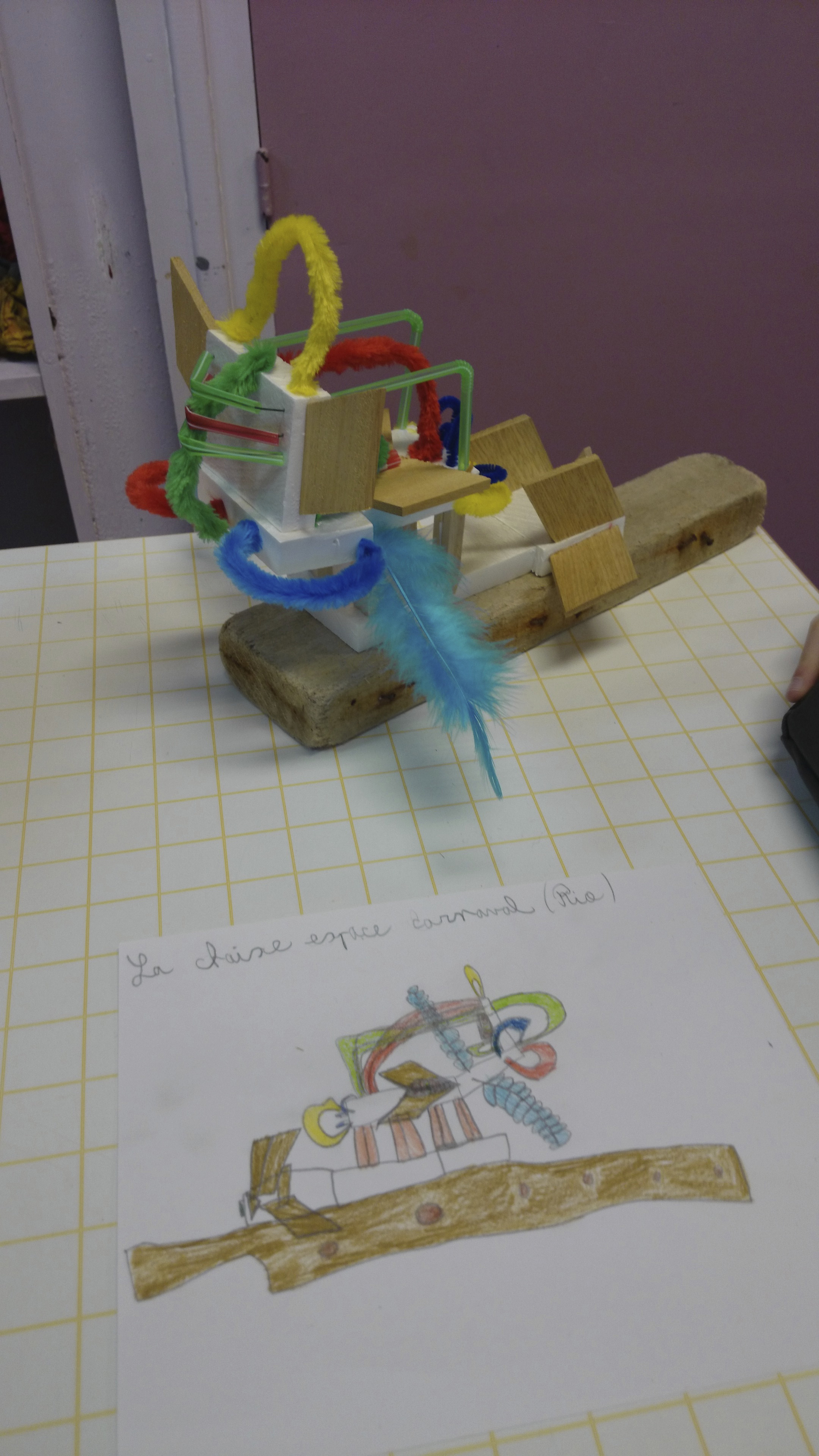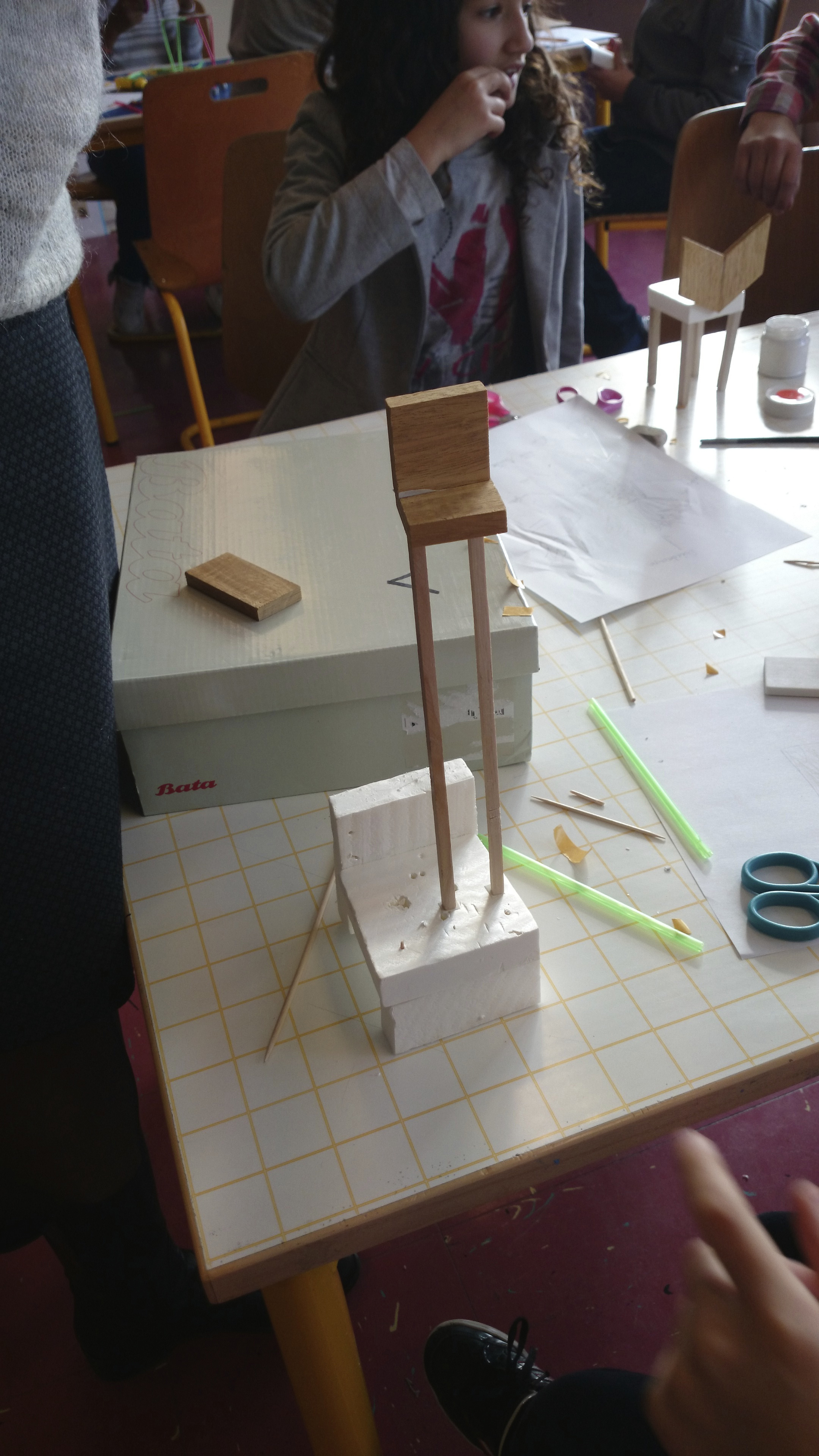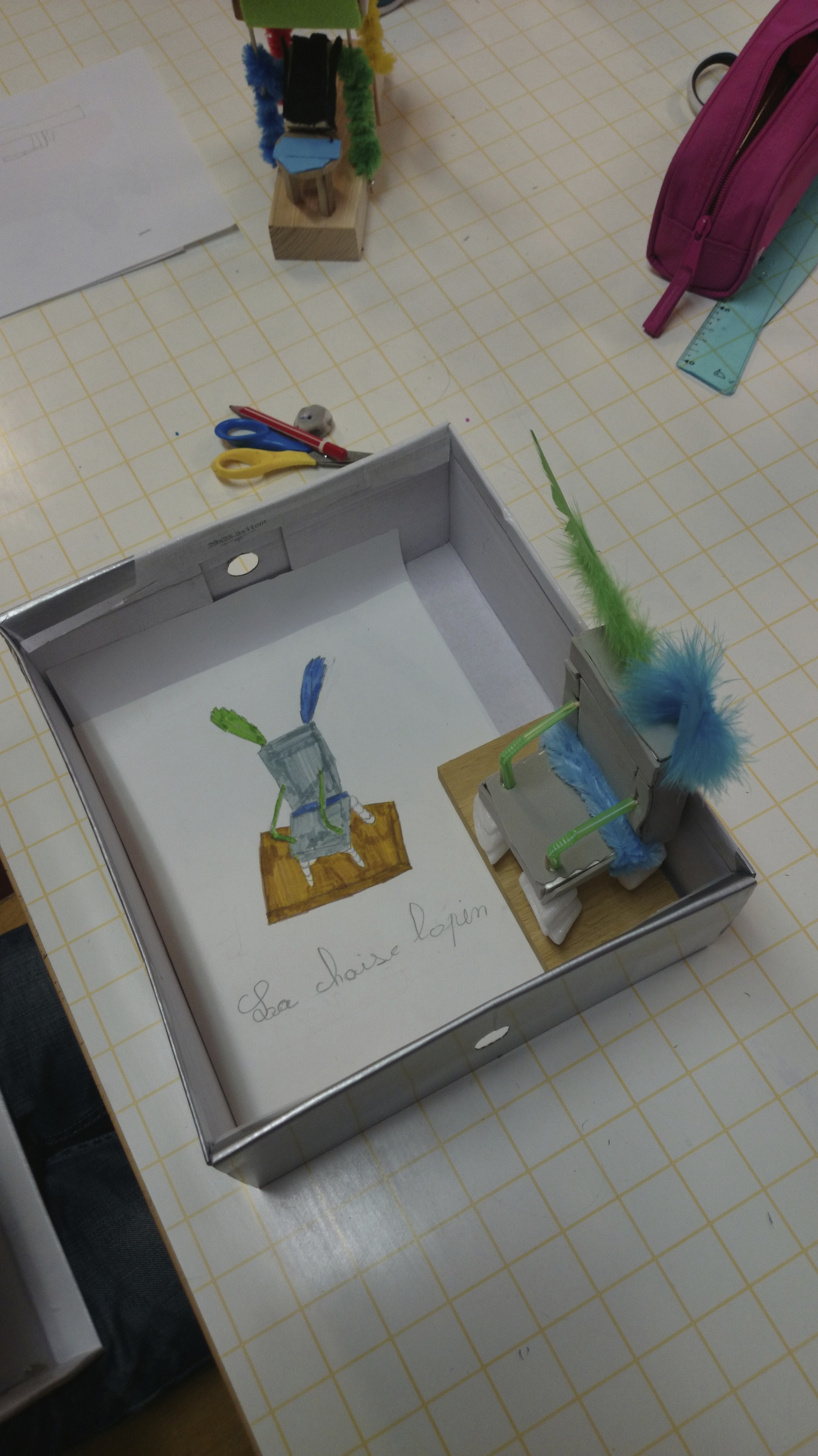 Après la présentation des différents matériaux mis à leur disposition, ils ont dessiné la chaise qu’il aimerait concevoir, pour ensuite la réaliser en miniature avec une grande variété de matériaux mis à disposition.