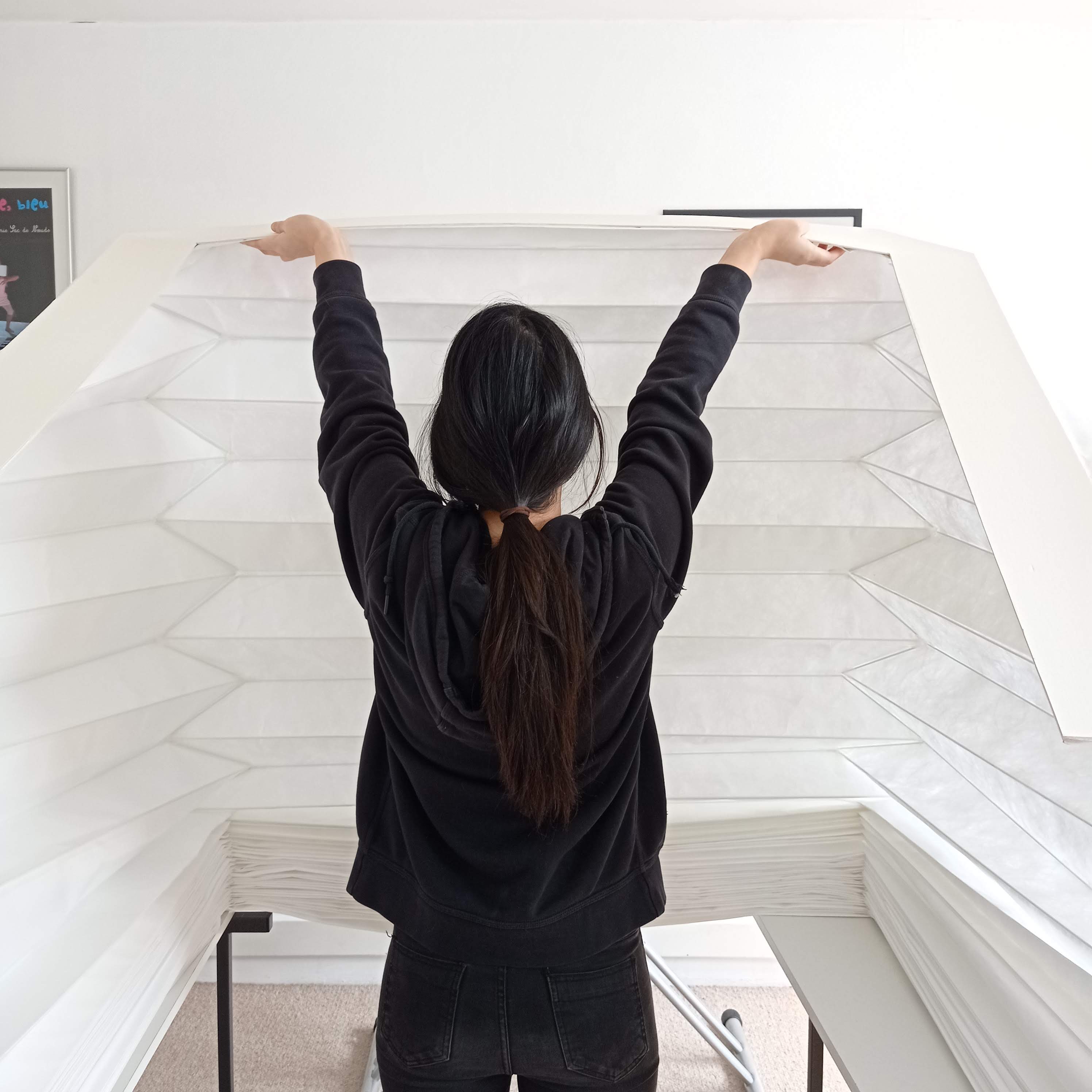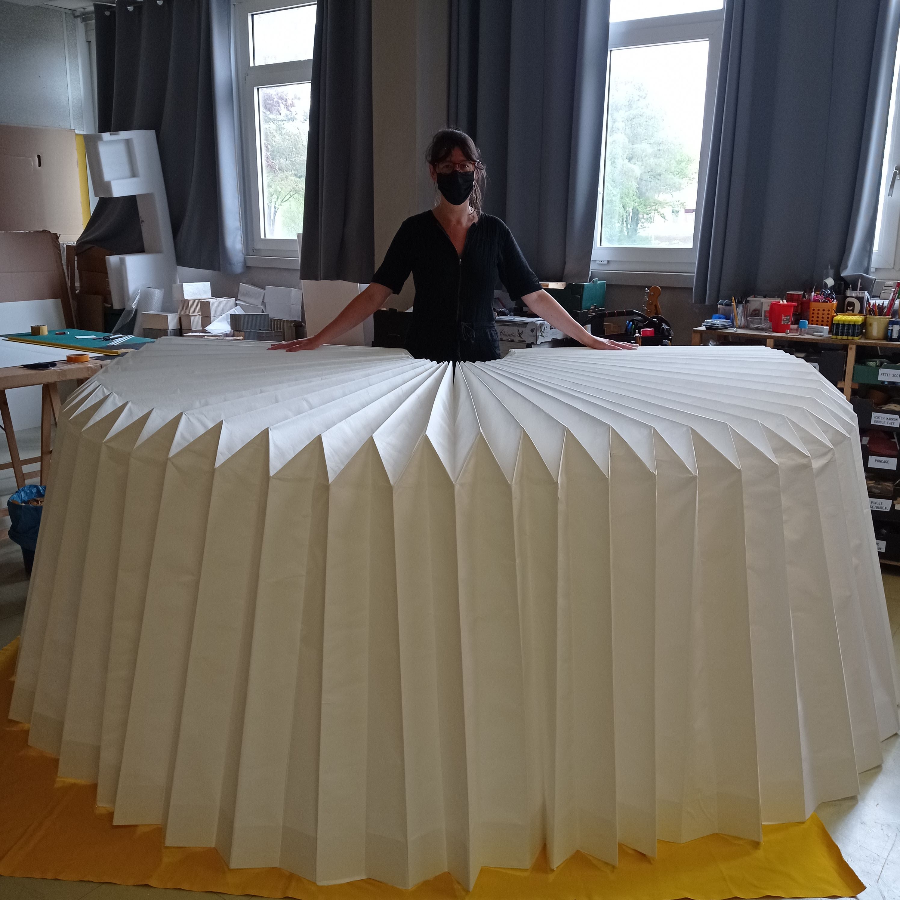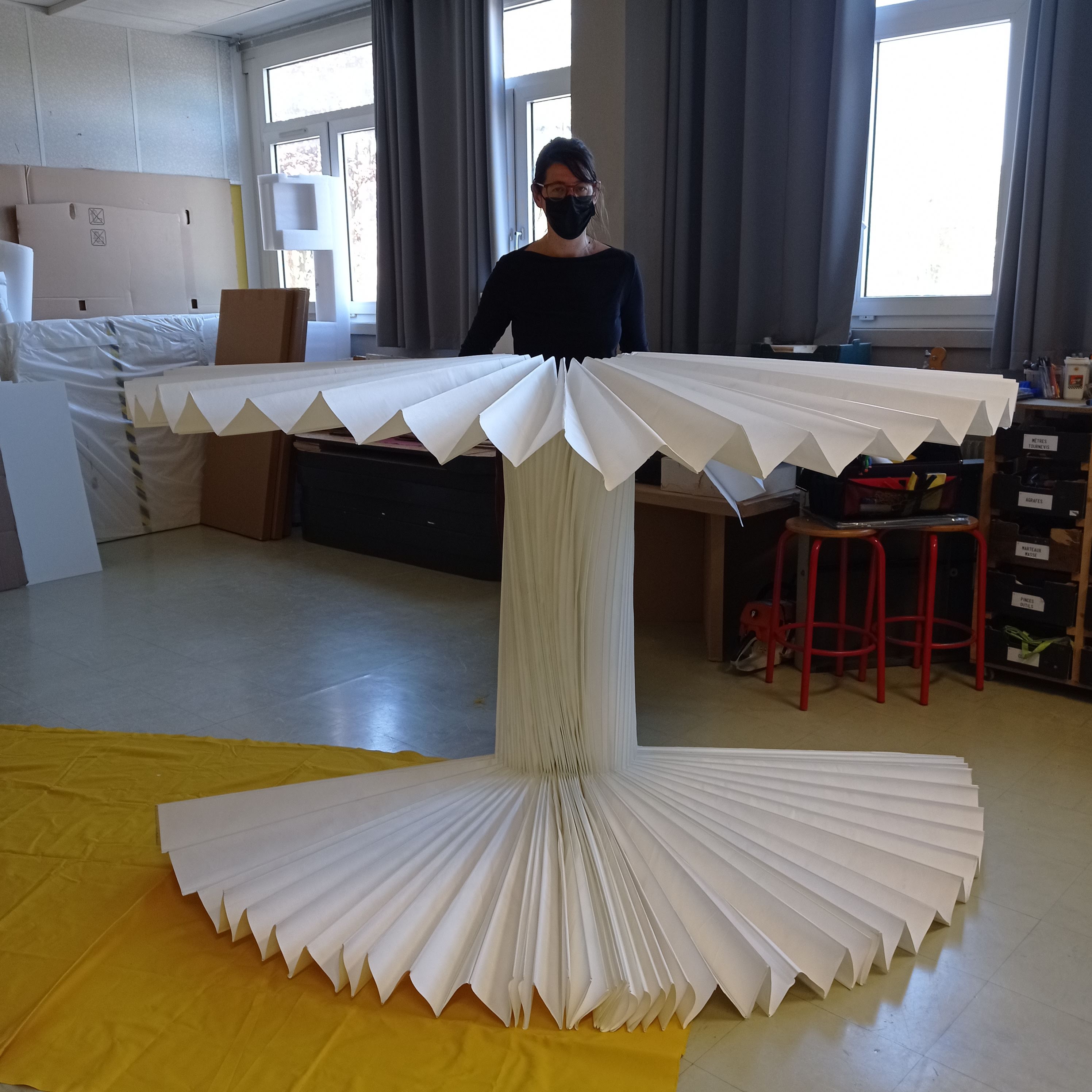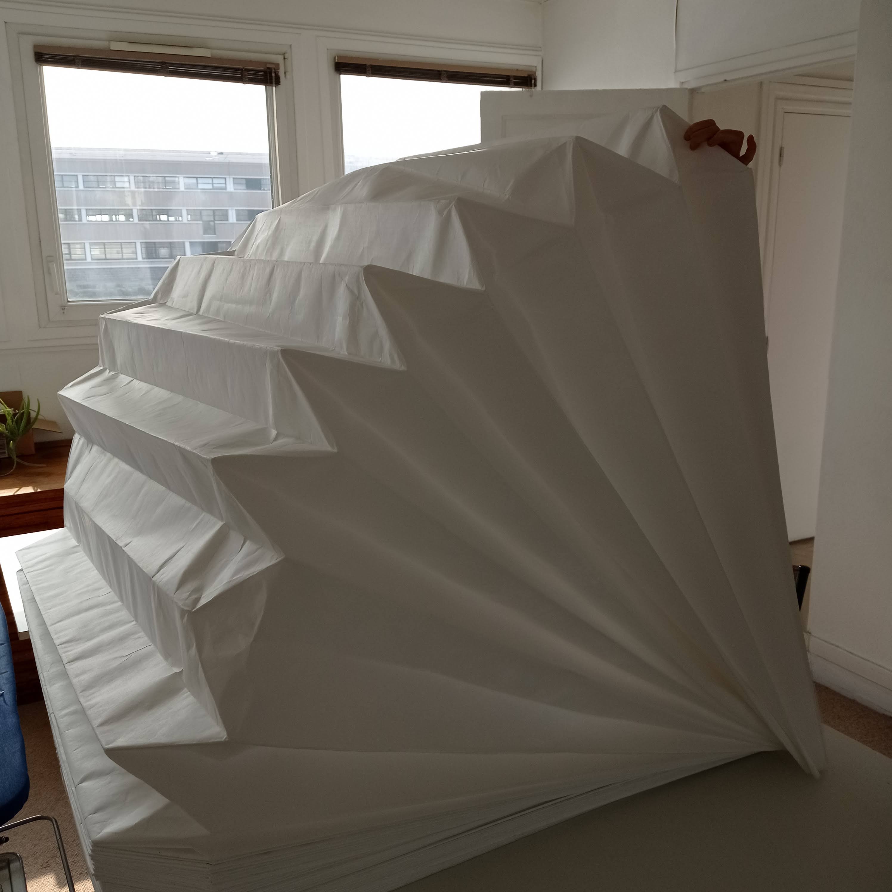 Suite à l’invitation de la compagnie de danse Sac de Noeuds pour leur nouvelle création Corpuscule, Claire Le Breton a confectionné des volumes en papier plié, à déployer (via les procédés Chénel) ainsi qu’une série d’ objets moulés en papier de soie blanc.