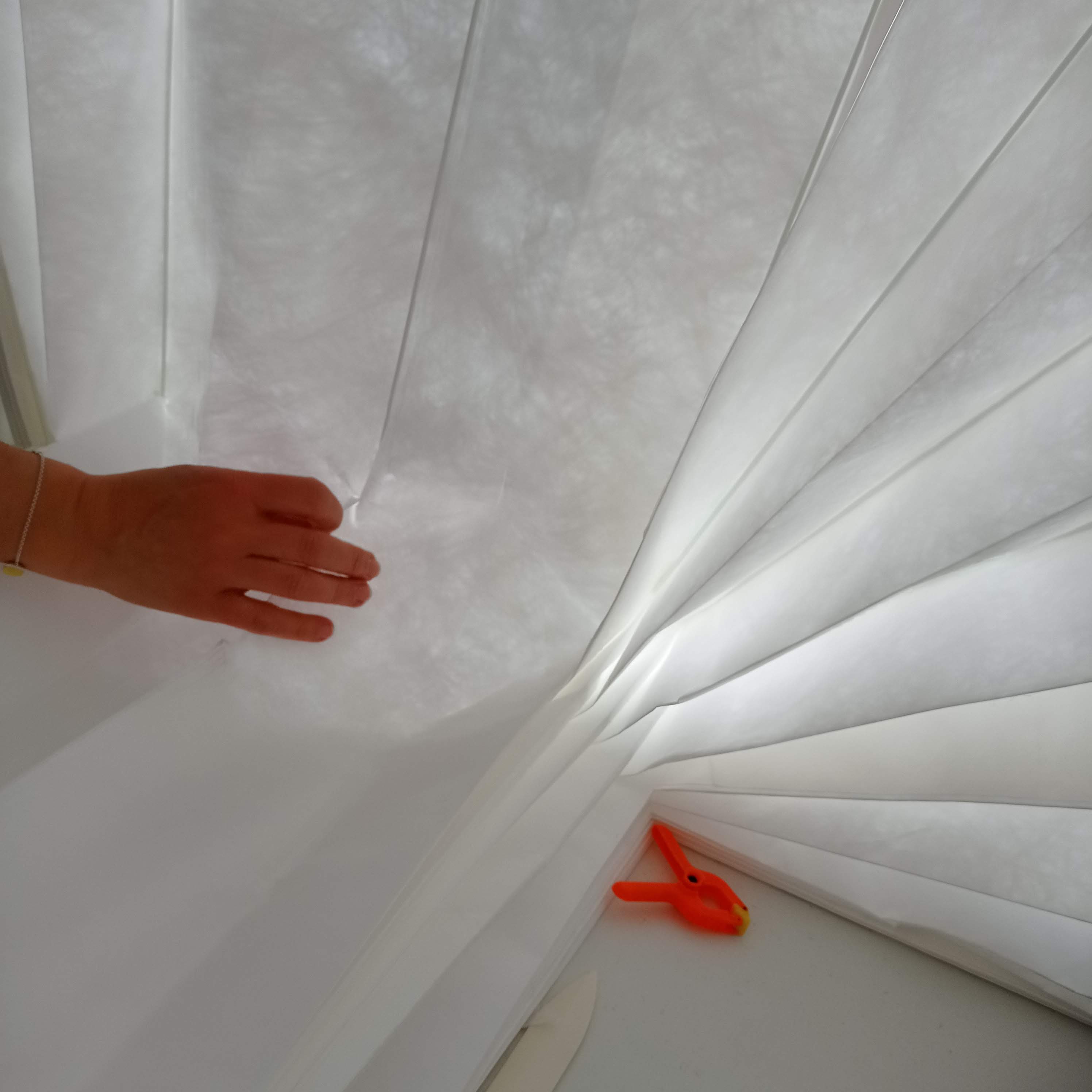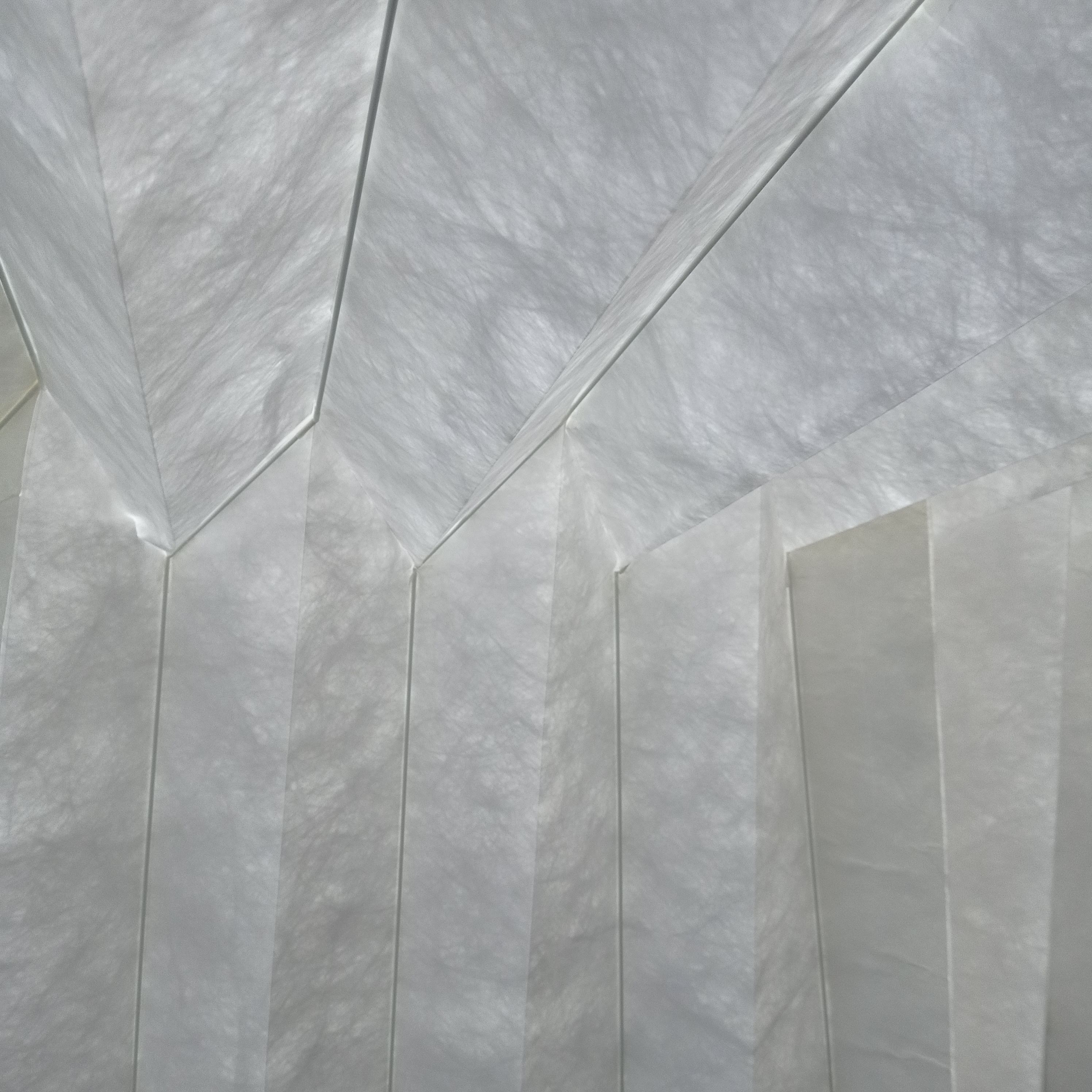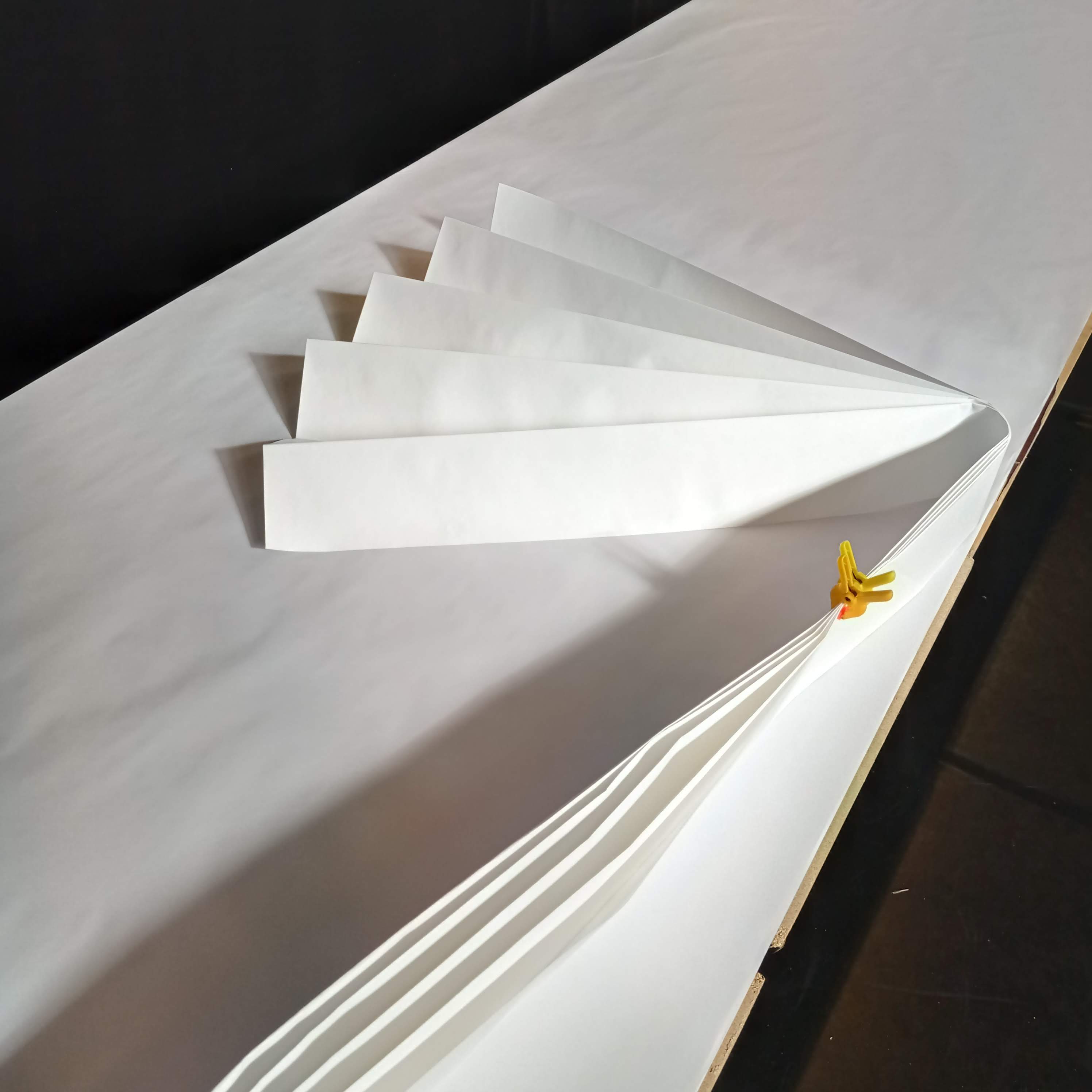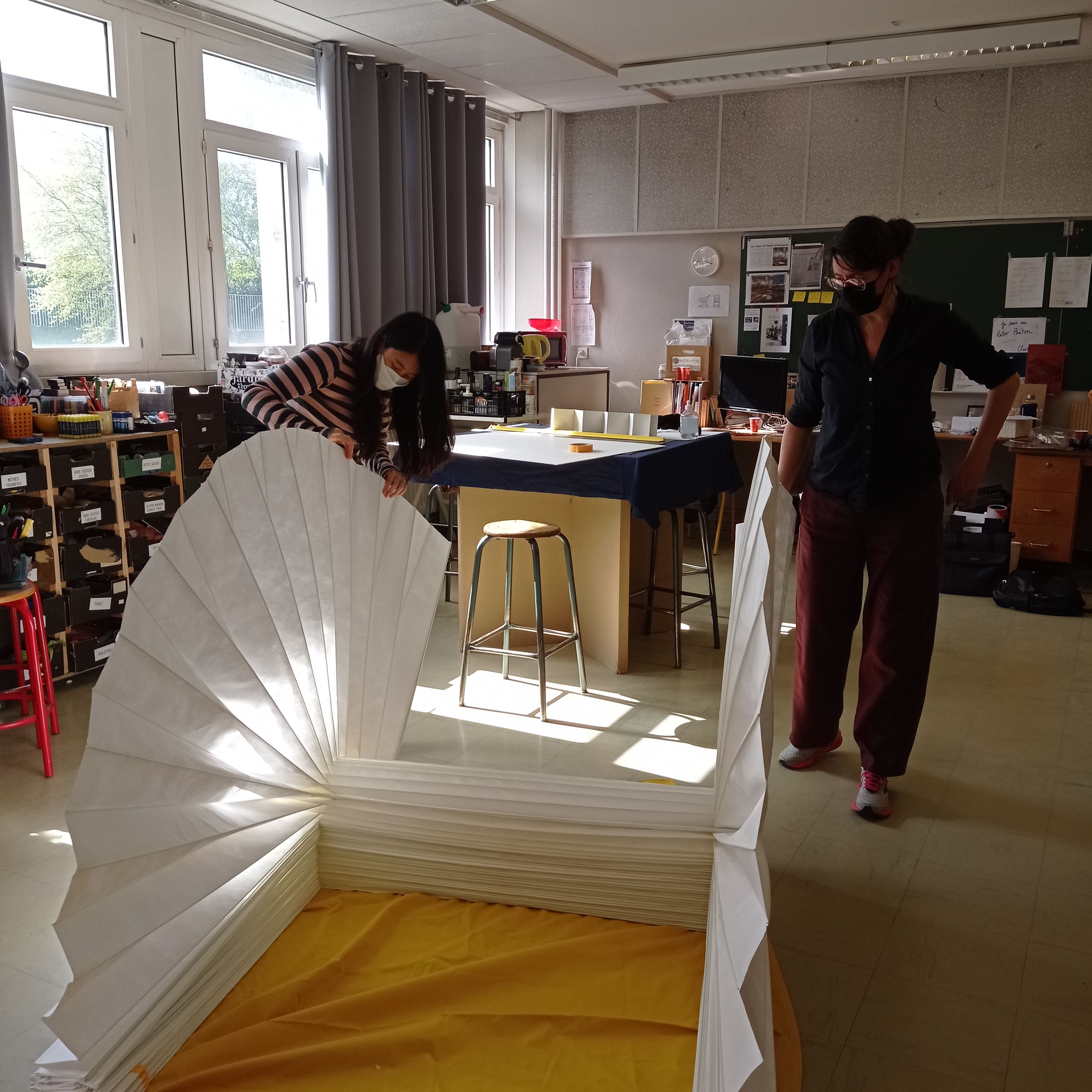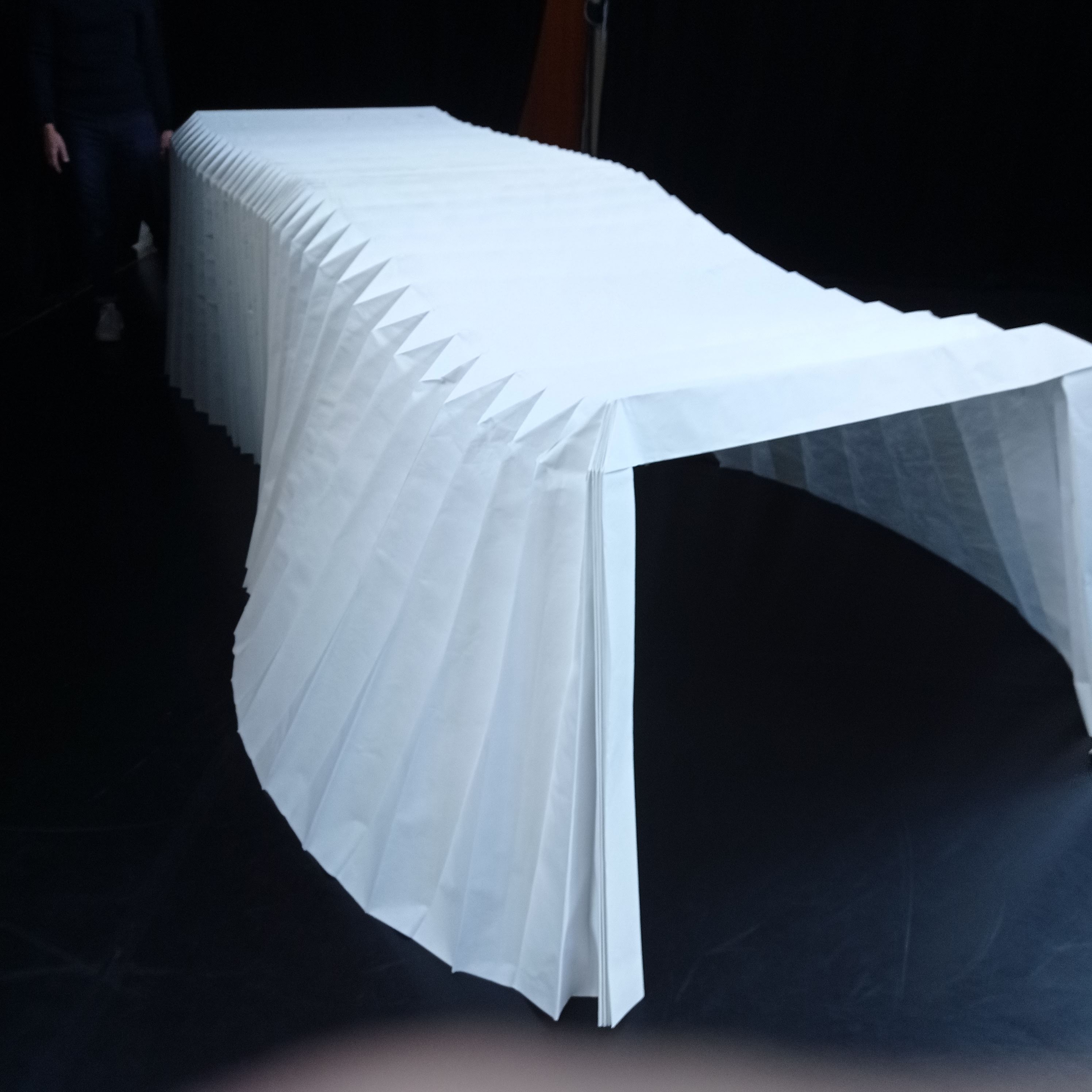 Suite à l’invitation de la compagnie de danse Sac de Noeuds pour leur nouvelle création Corpuscule, Claire Le Breton a confectionné des volumes en papier plié, à déployer (via les procédés Chénel) ainsi qu’une série d’ objets moulés en papier de soie blanc.