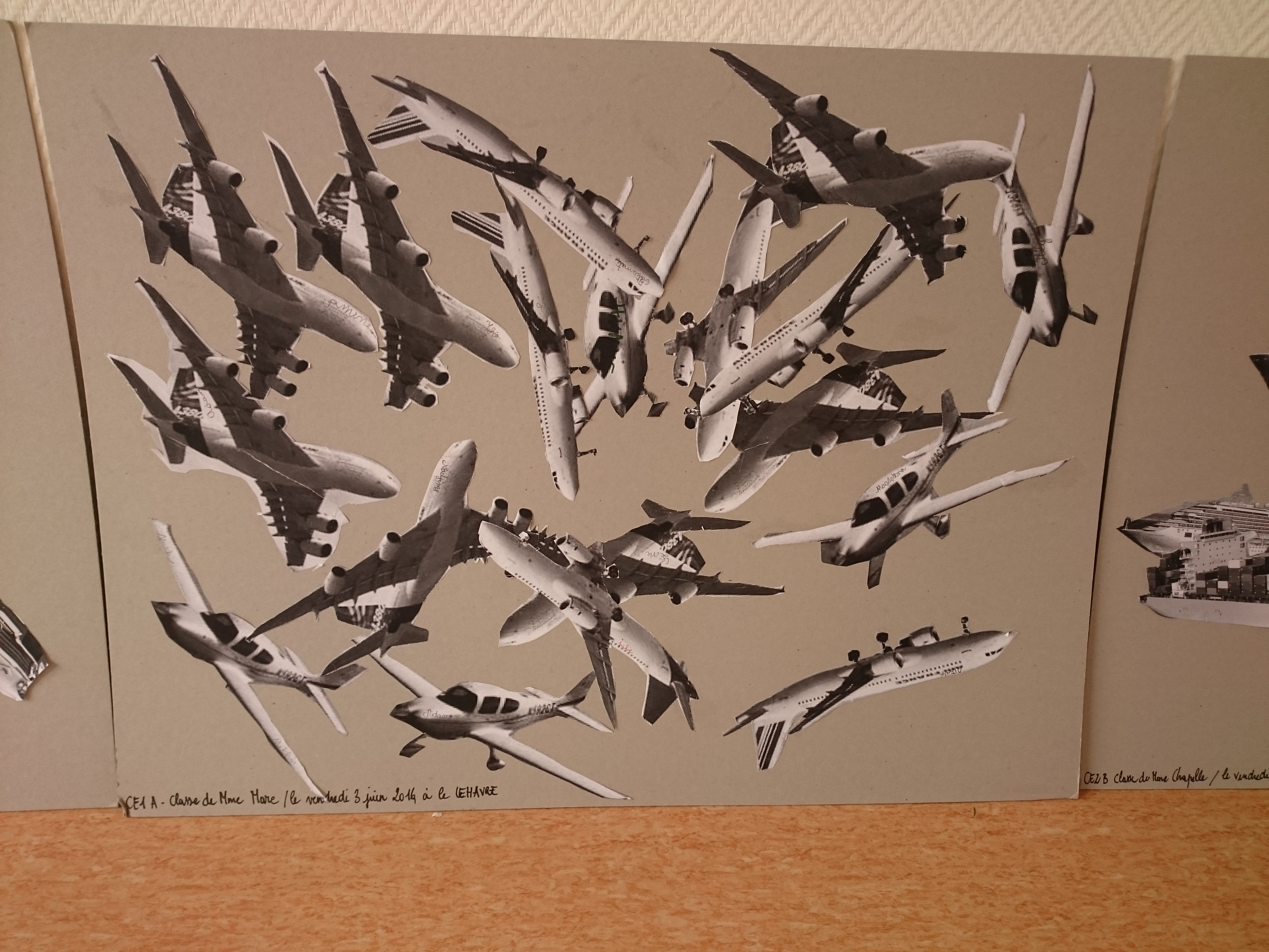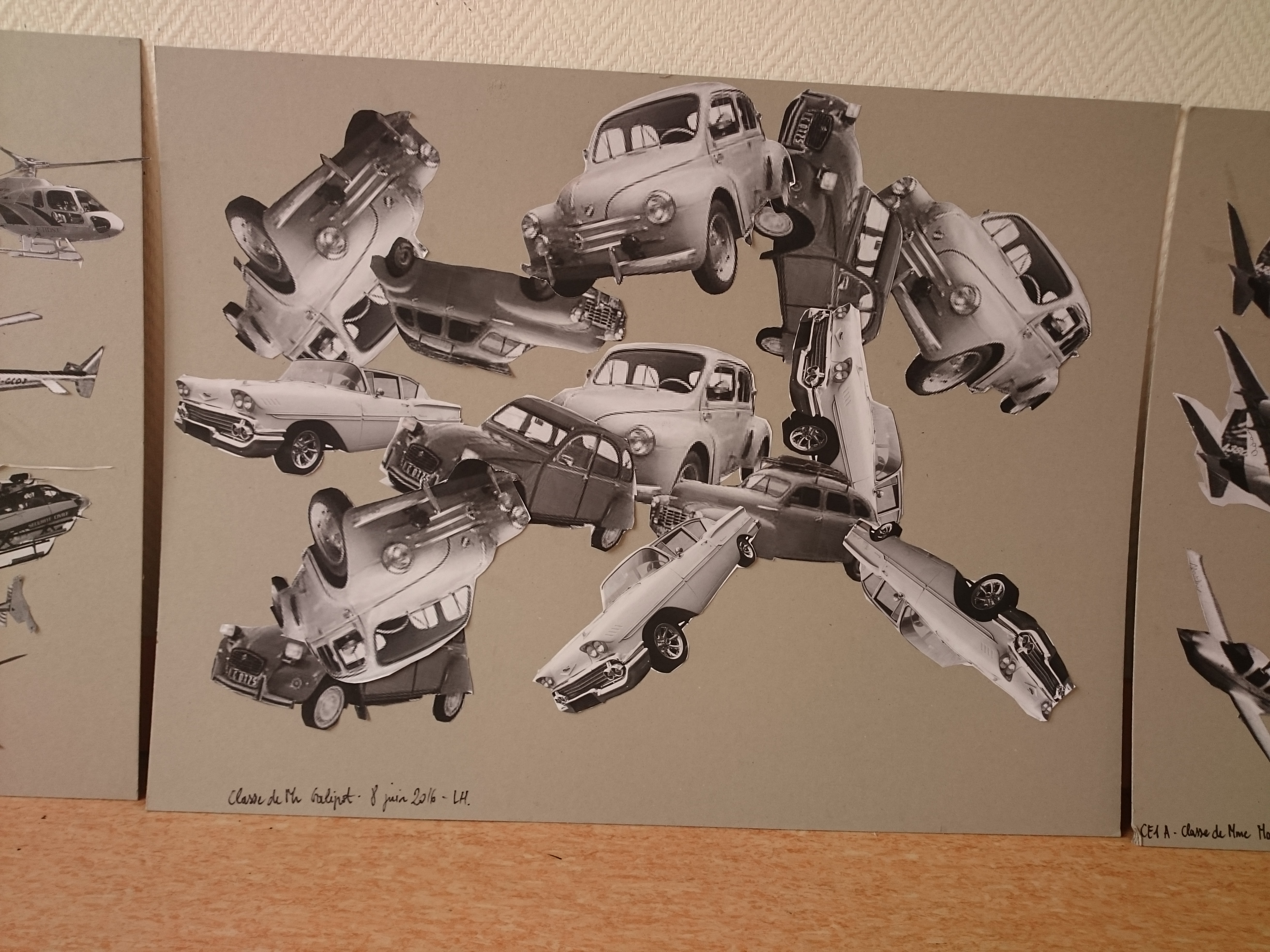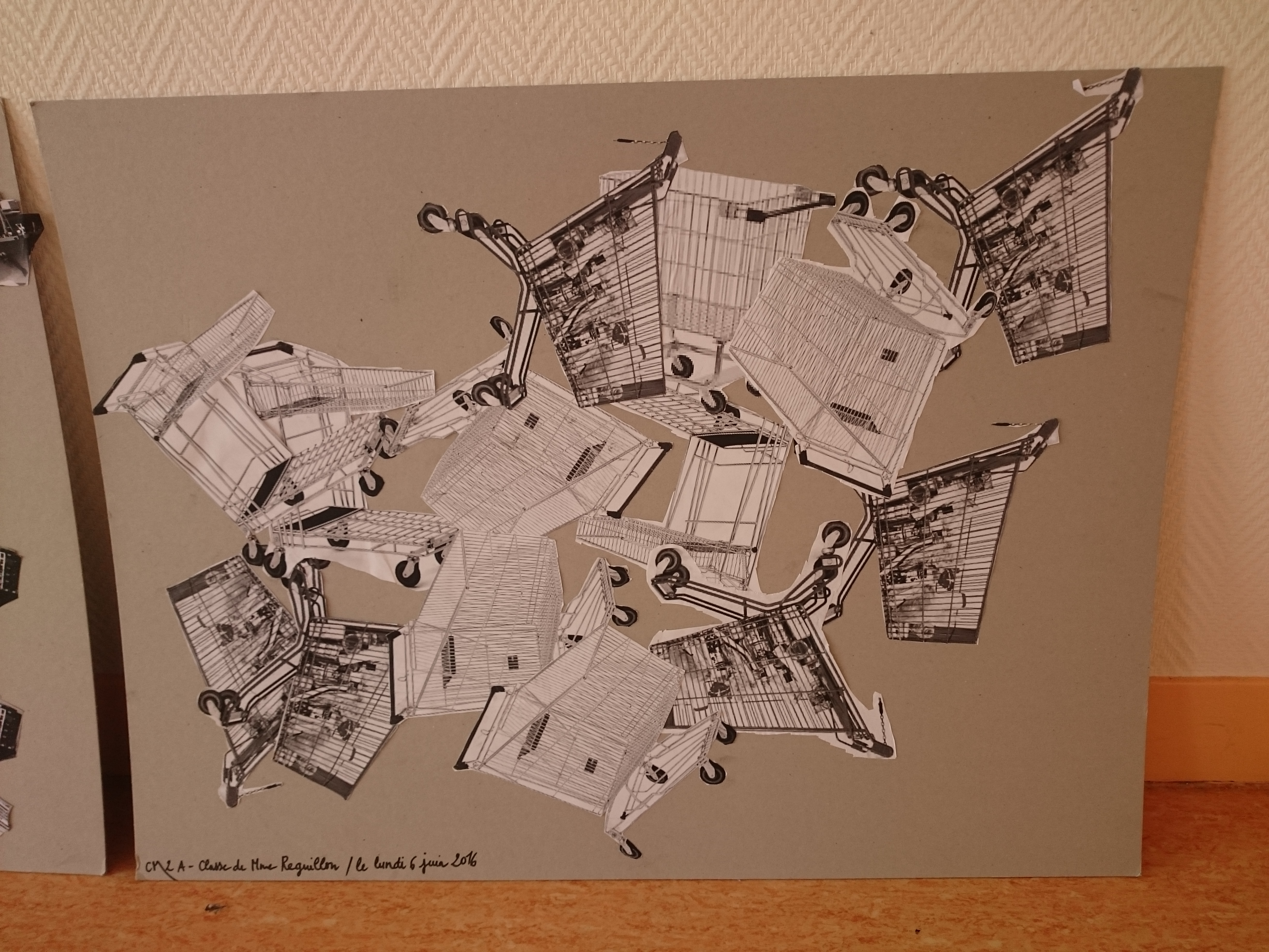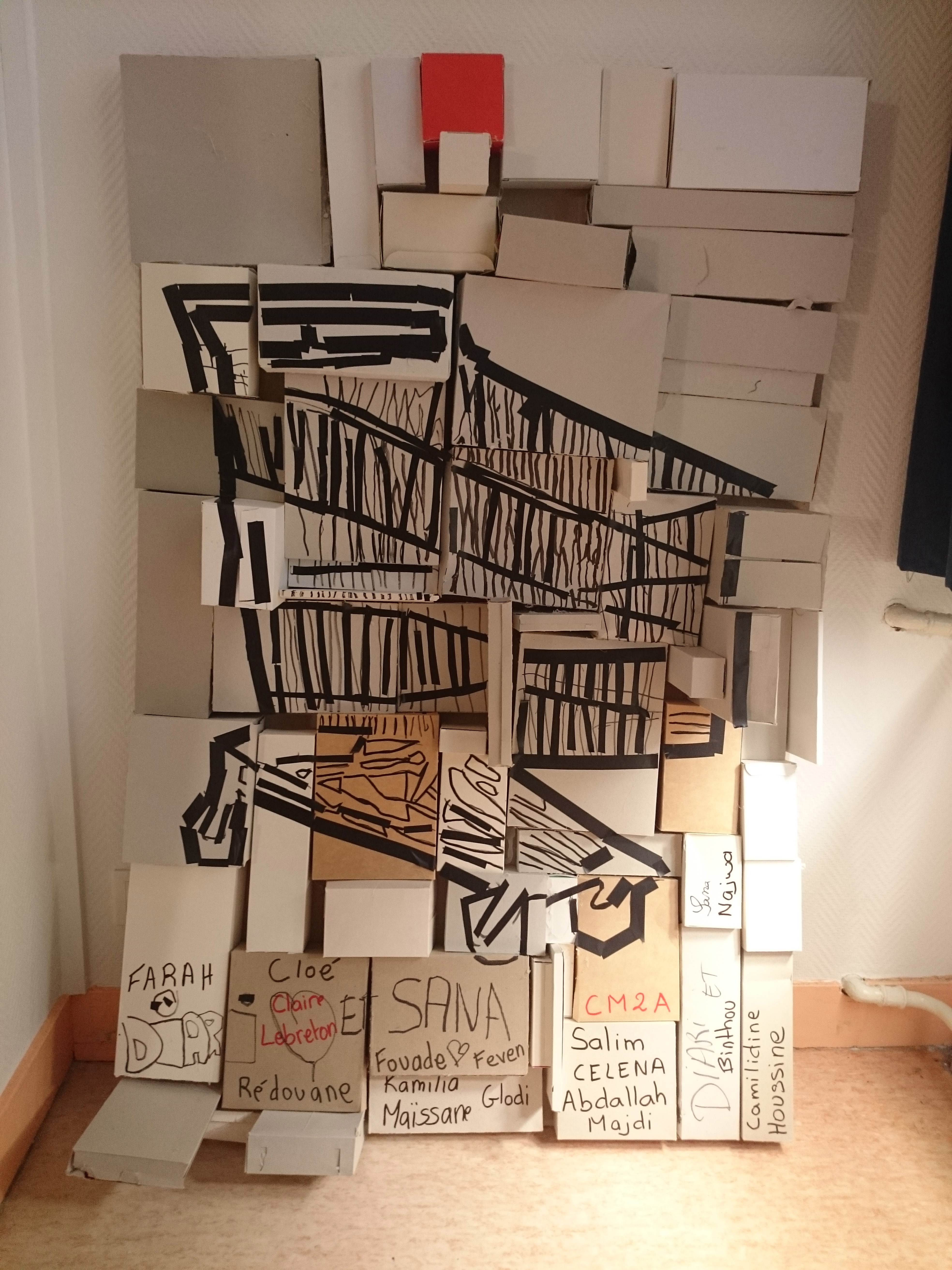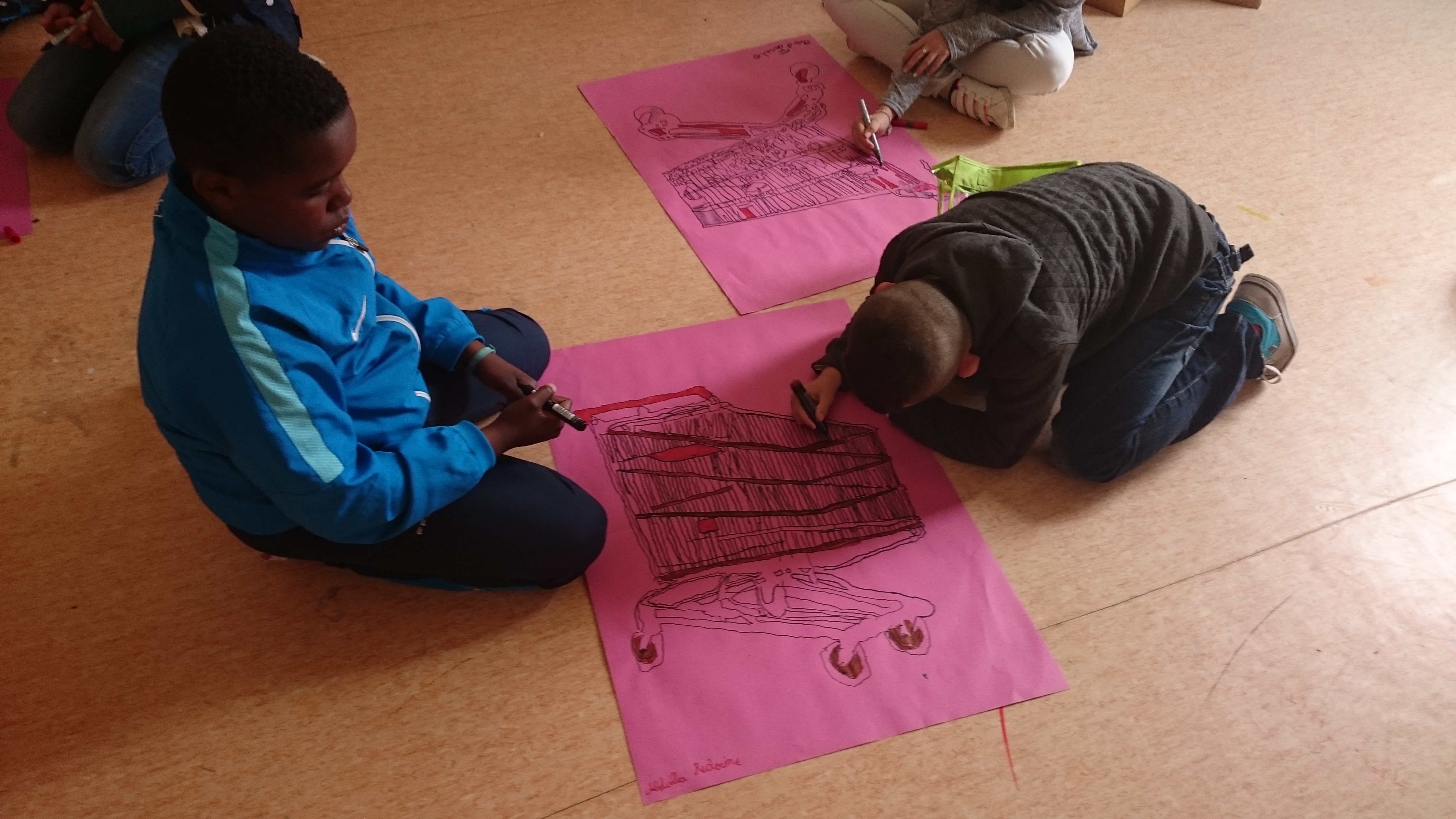 Les élèves de l’école Jules Guesde ont réalisé une sorte de jeu de construction graphique. Les enfants et ont été invités à réfléchir, puis réaliser des recherches graphiques autour du thème du transport et de l’acheminement des marchandises (vélo, voiture, camion, bateau, avion, hélicoptère, port containers…) afin d’expérimenter plusieurs procédés graphiques sur papier et sur des cartons d’emballages alimentaire.