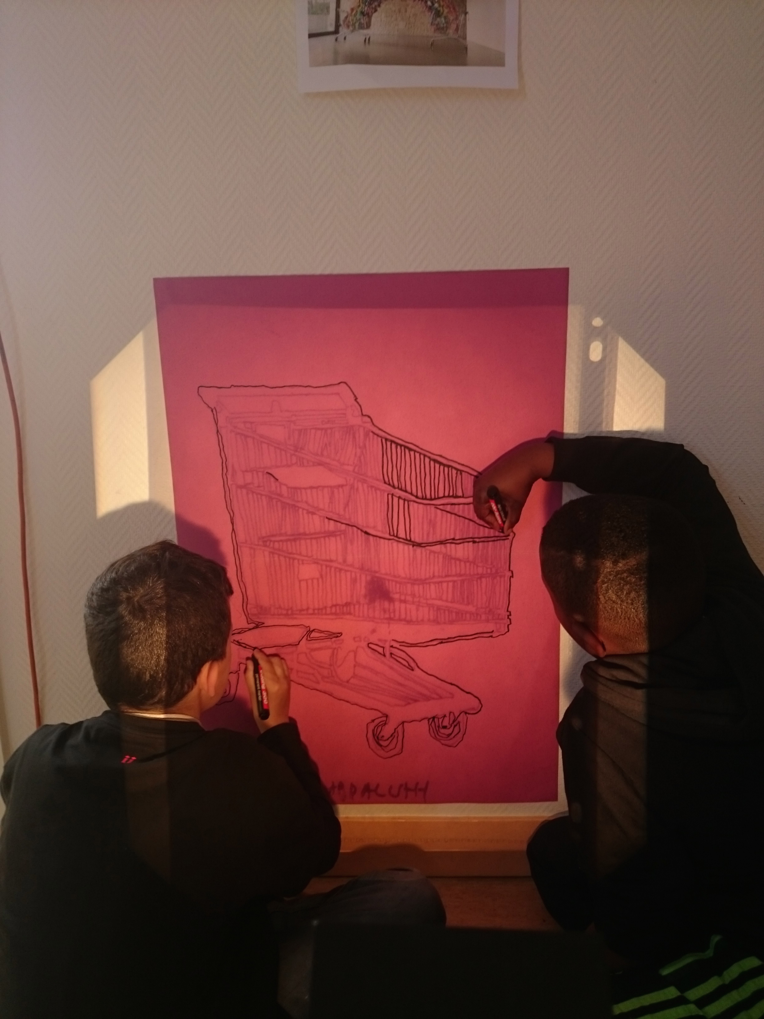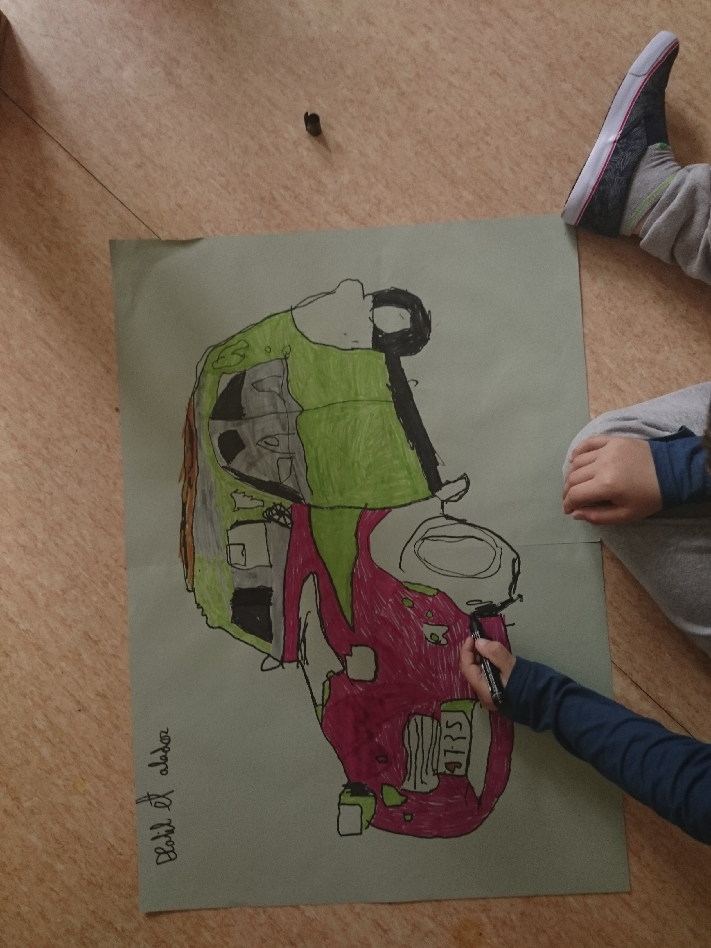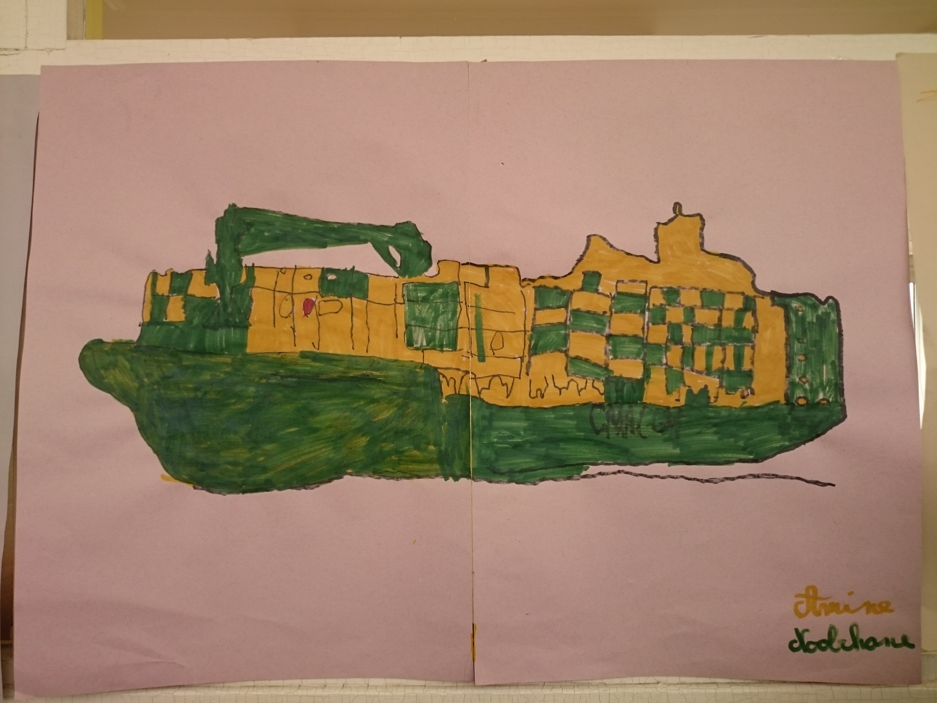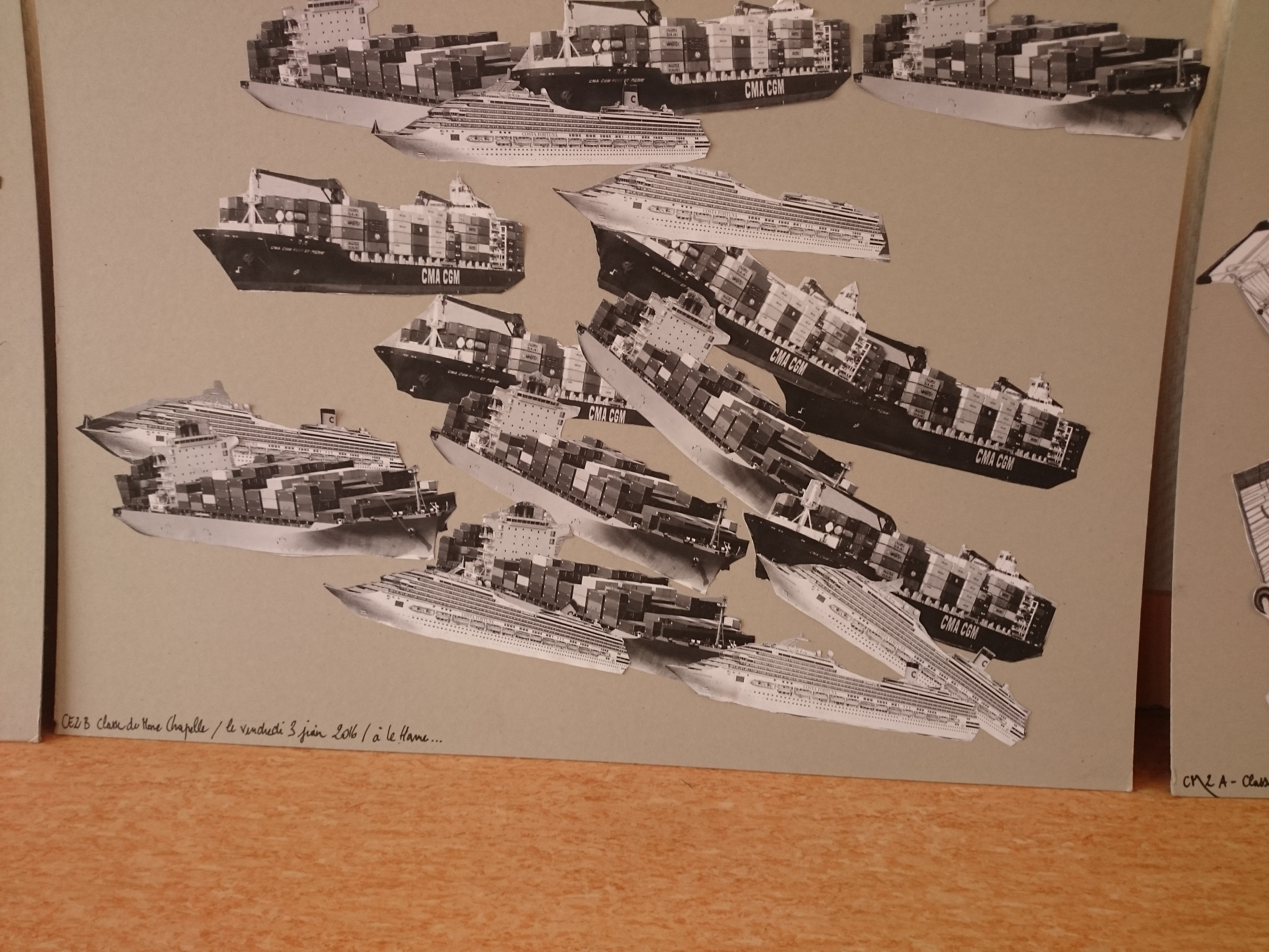 Les élèves de l’école Jules Guesde ont réalisé une sorte de jeu de construction graphique. Les enfants et ont été invités à réfléchir, puis réaliser des recherches graphiques autour du thème du transport et de l’acheminement des marchandises (vélo, voiture, camion, bateau, avion, hélicoptère, port containers…) afin d’expérimenter plusieurs procédés graphiques sur papier et sur des cartons d’emballages alimentaire.