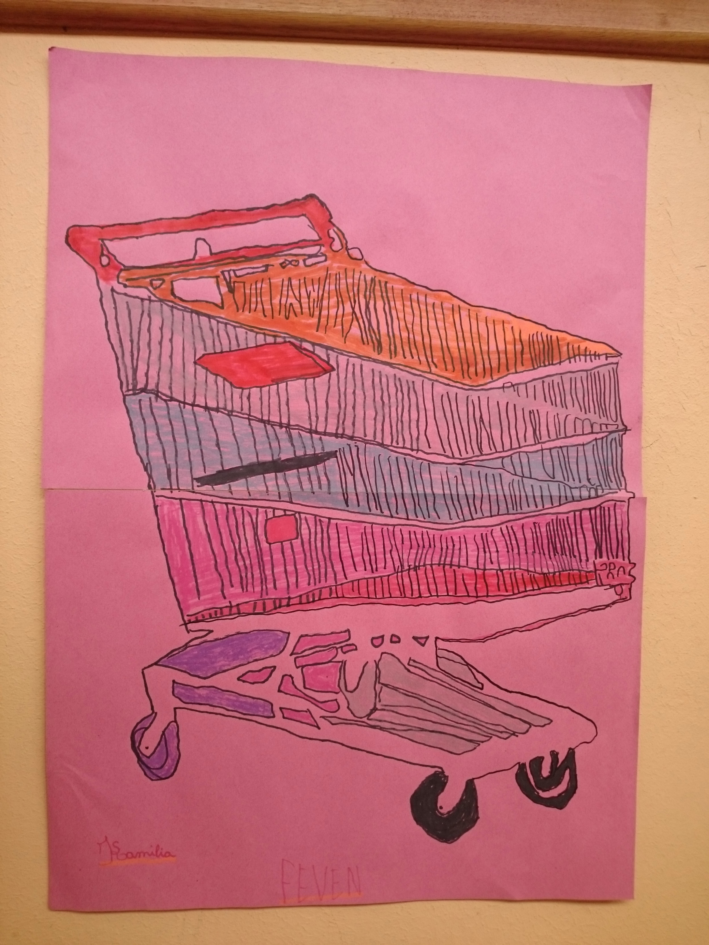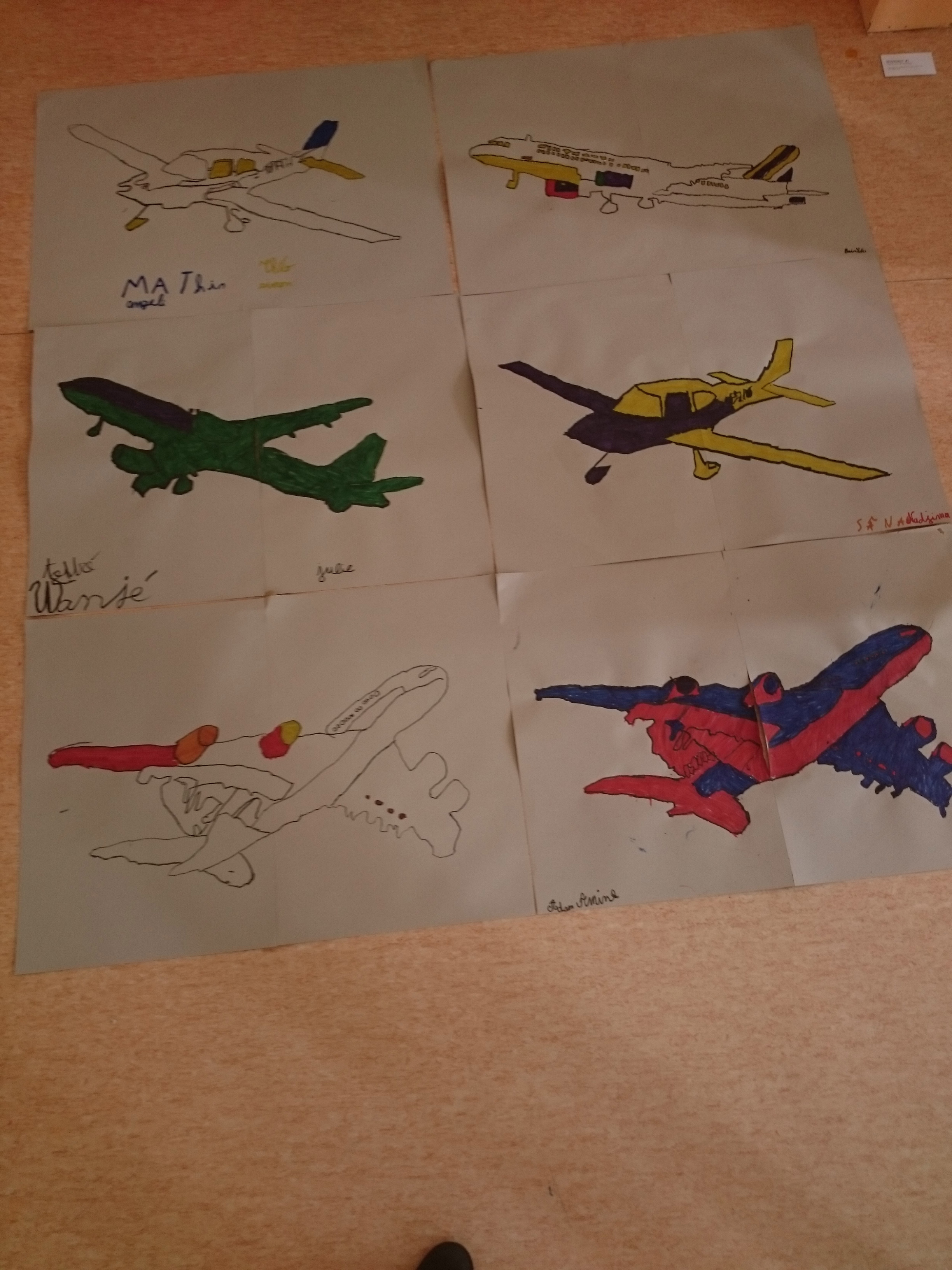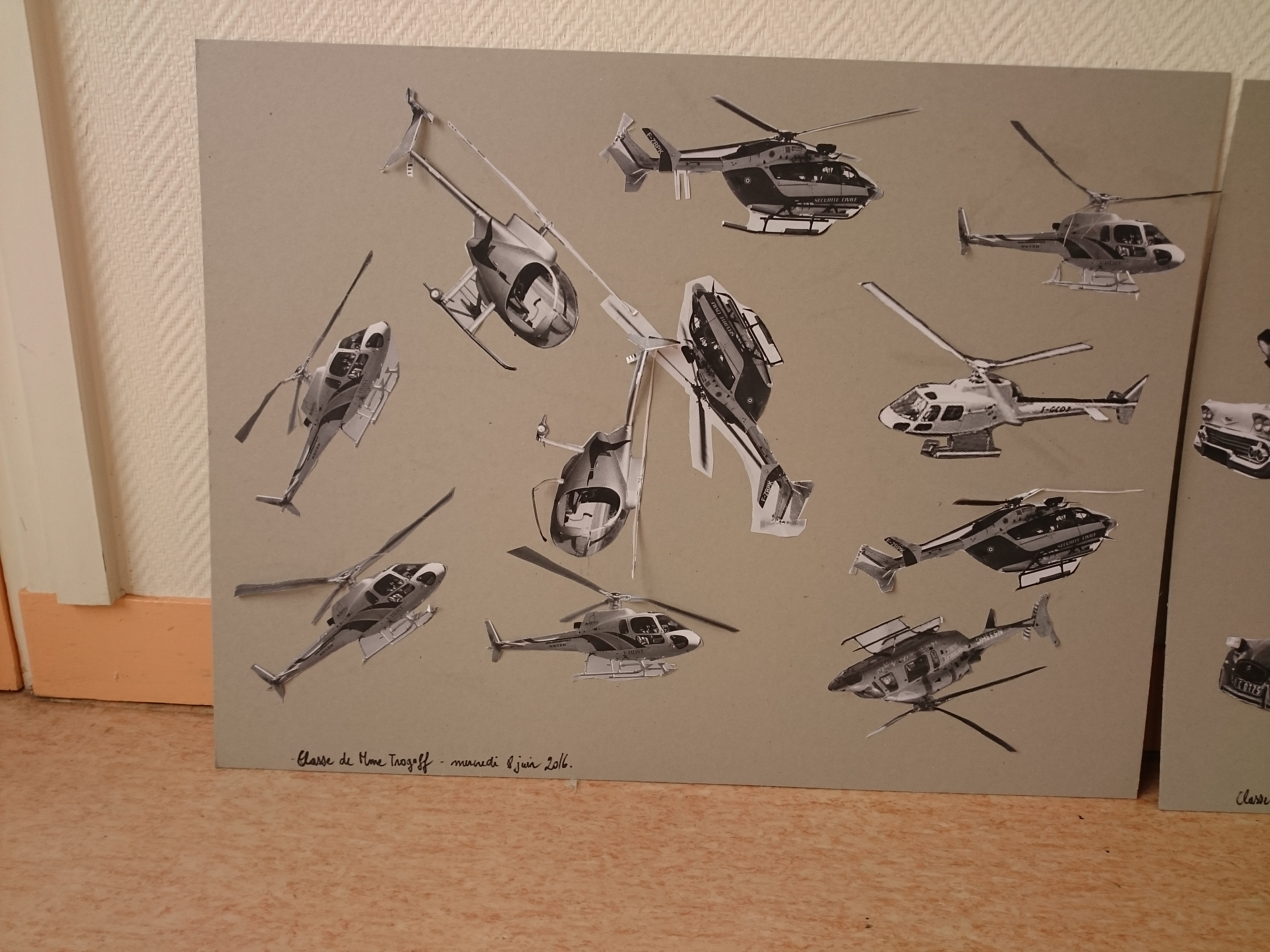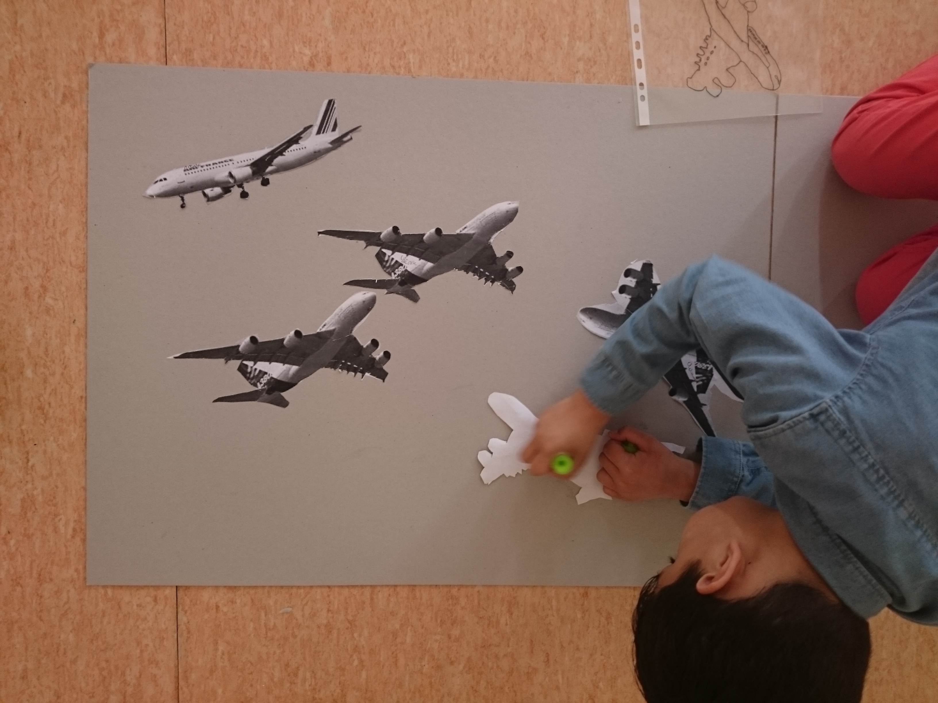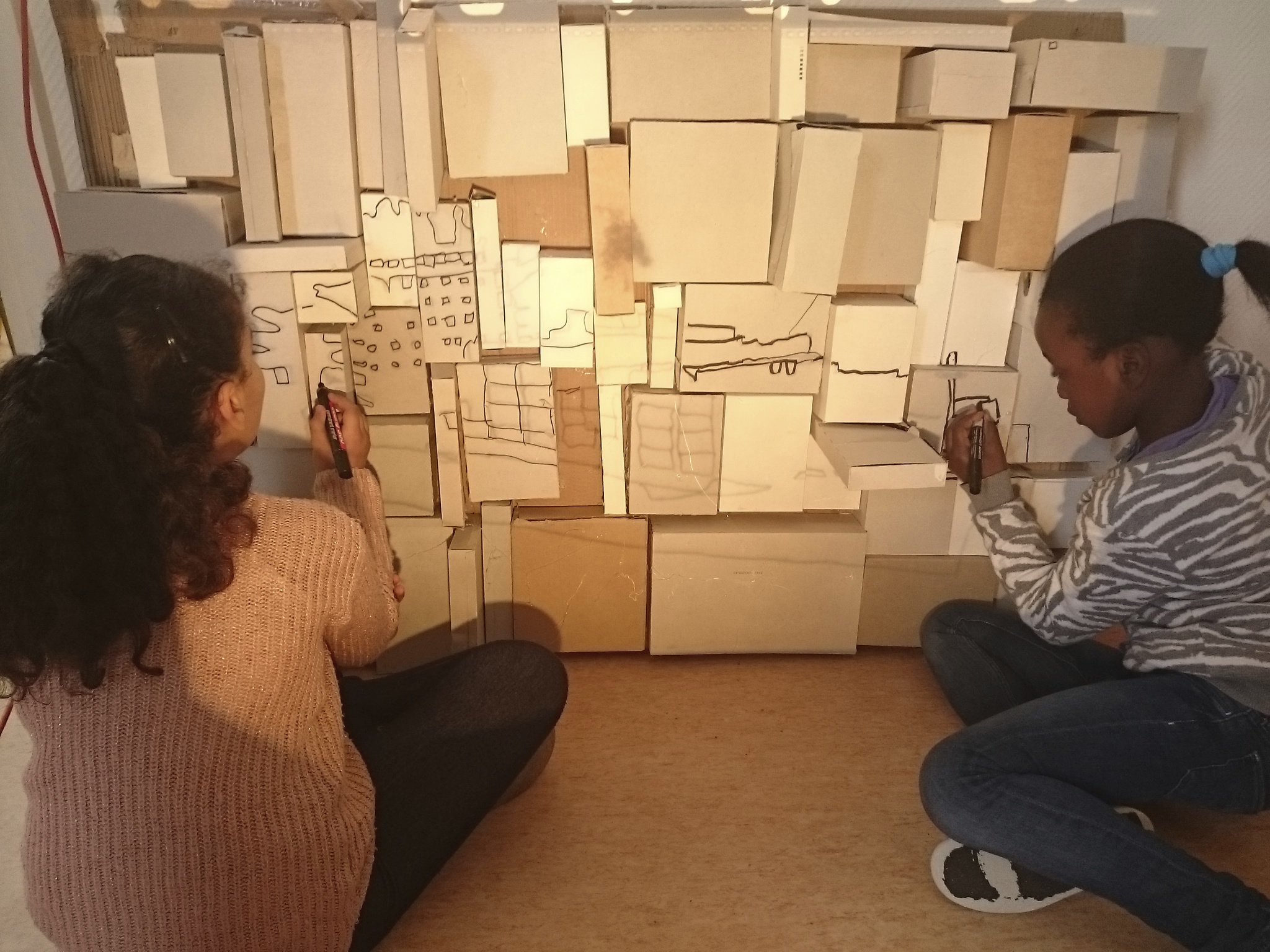 Les élèves de l’école Jules Guesde ont réalisé une sorte de jeu de construction graphique. Les enfants et ont été invités à réfléchir, puis réaliser des recherches graphiques autour du thème du transport et de l’acheminement des marchandises (vélo, voiture, camion, bateau, avion, hélicoptère, port containers…) afin d’expérimenter plusieurs procédés graphiques sur papier et sur des cartons d’emballages alimentaire.