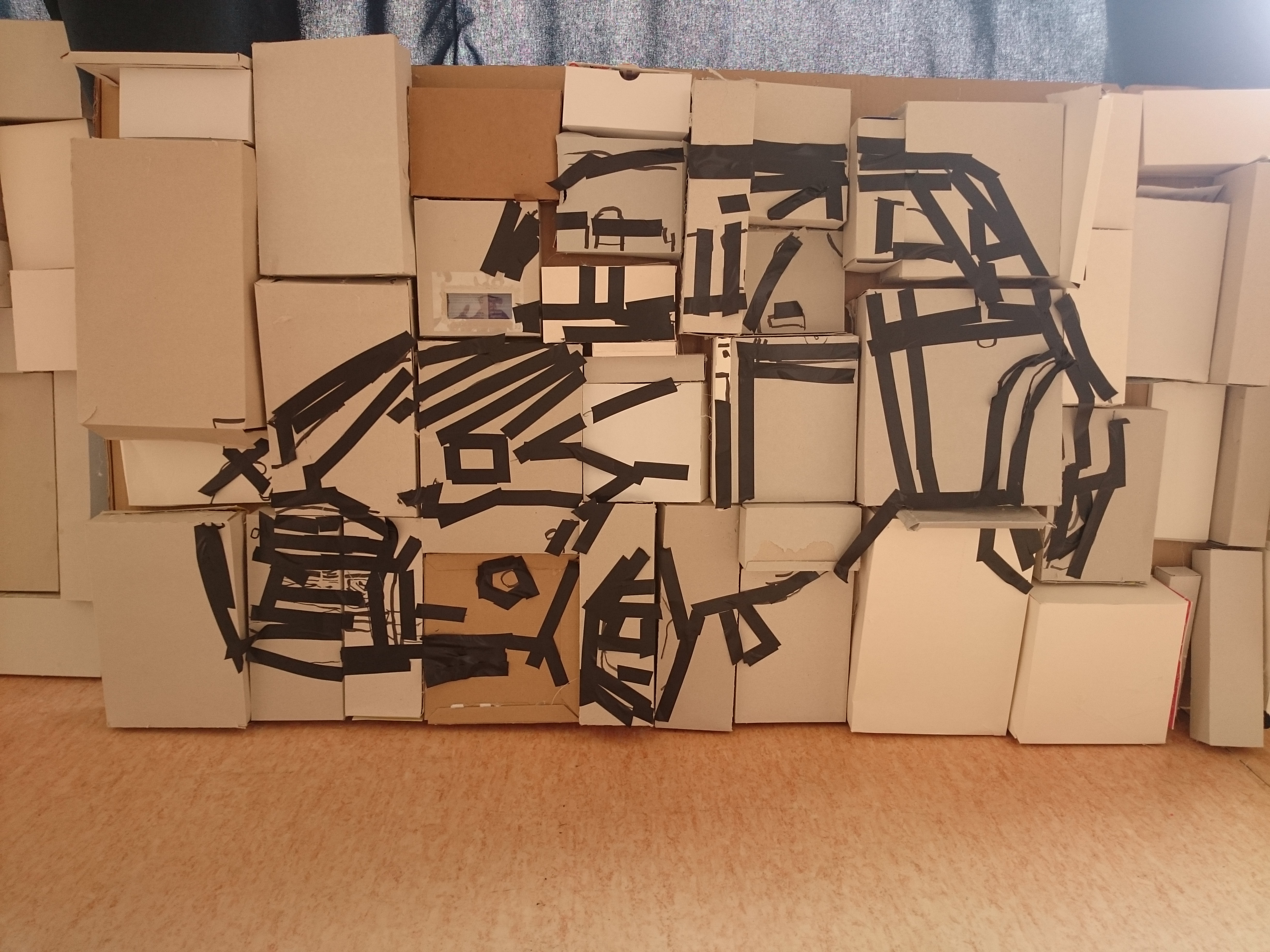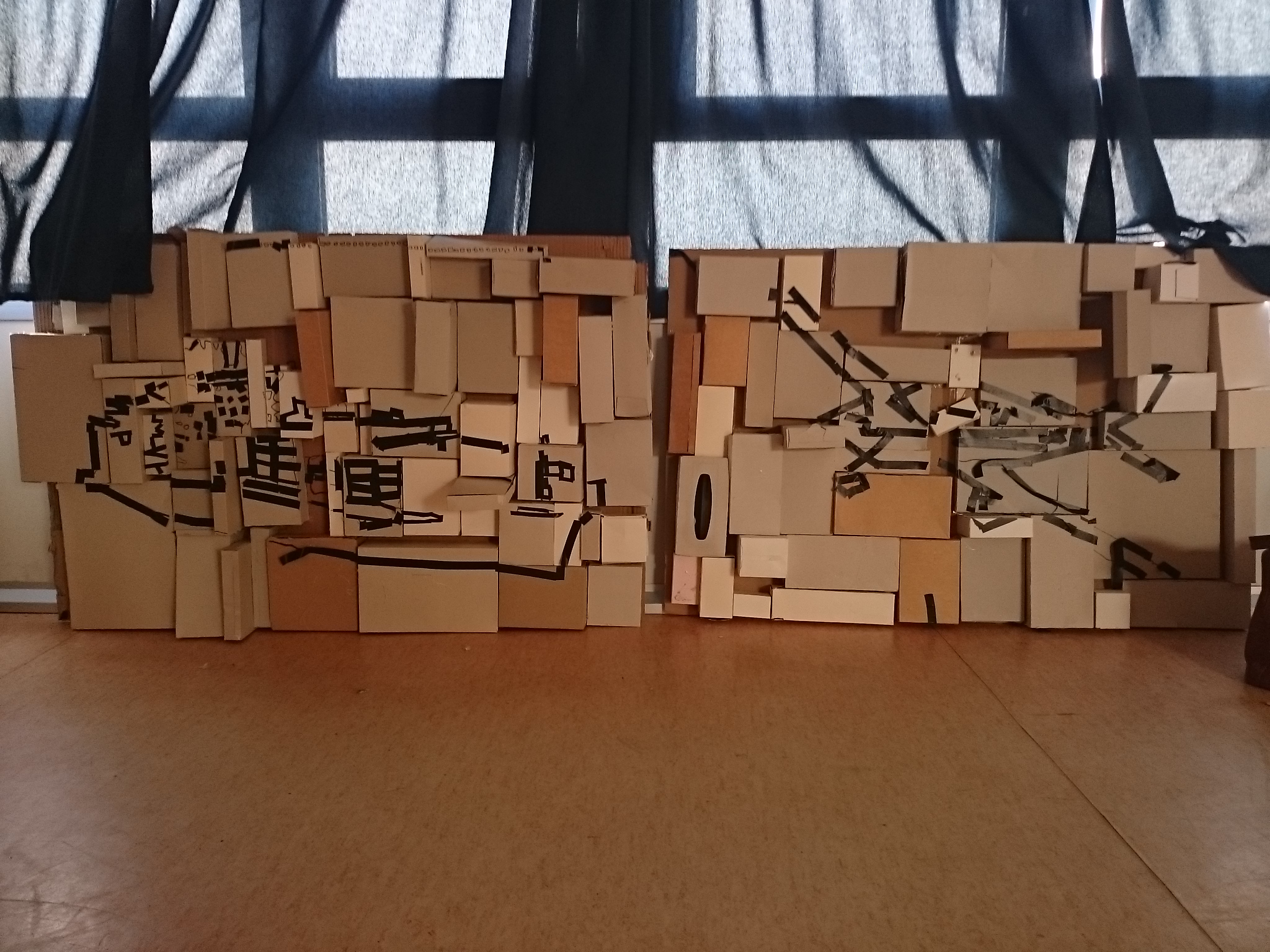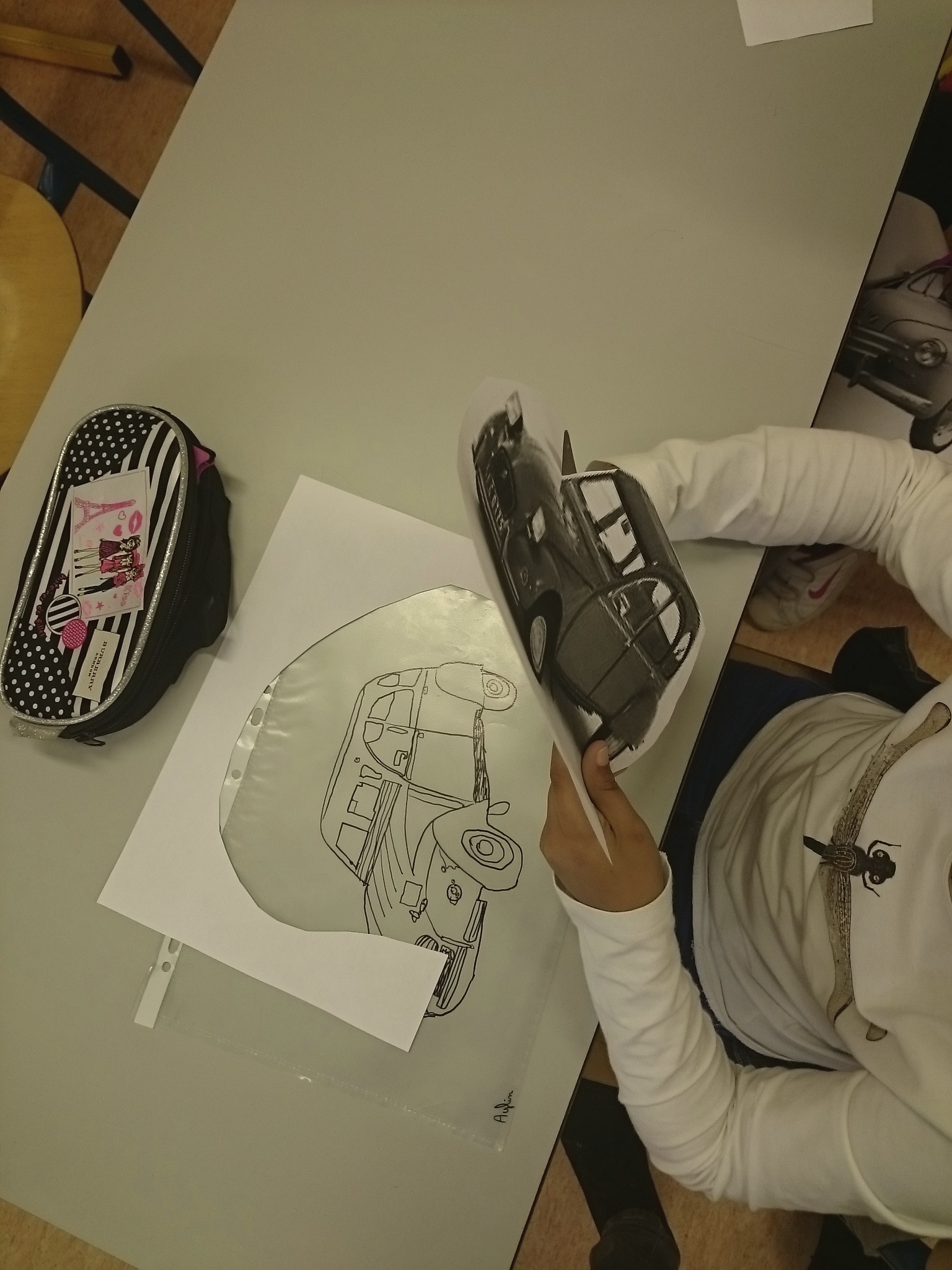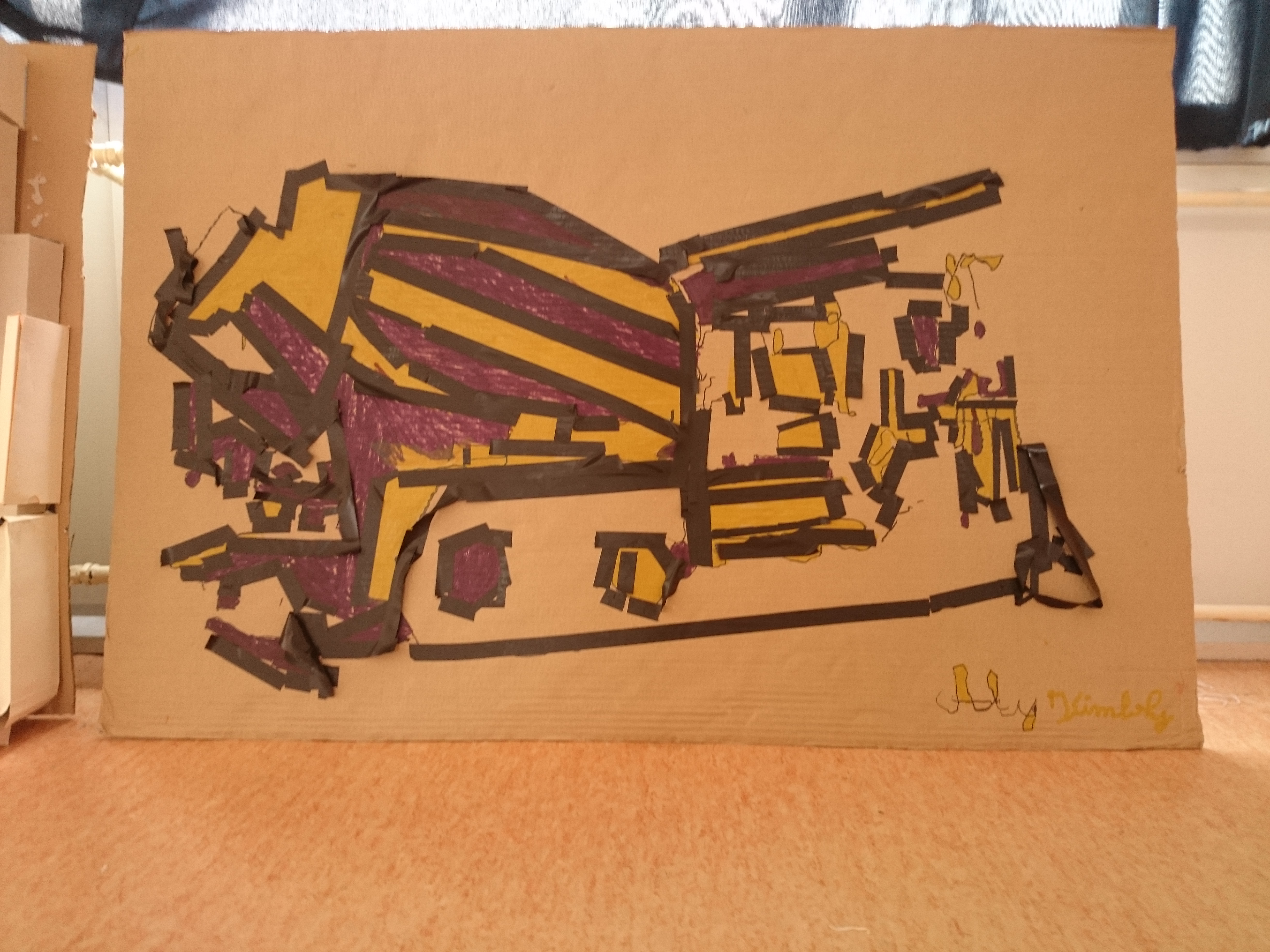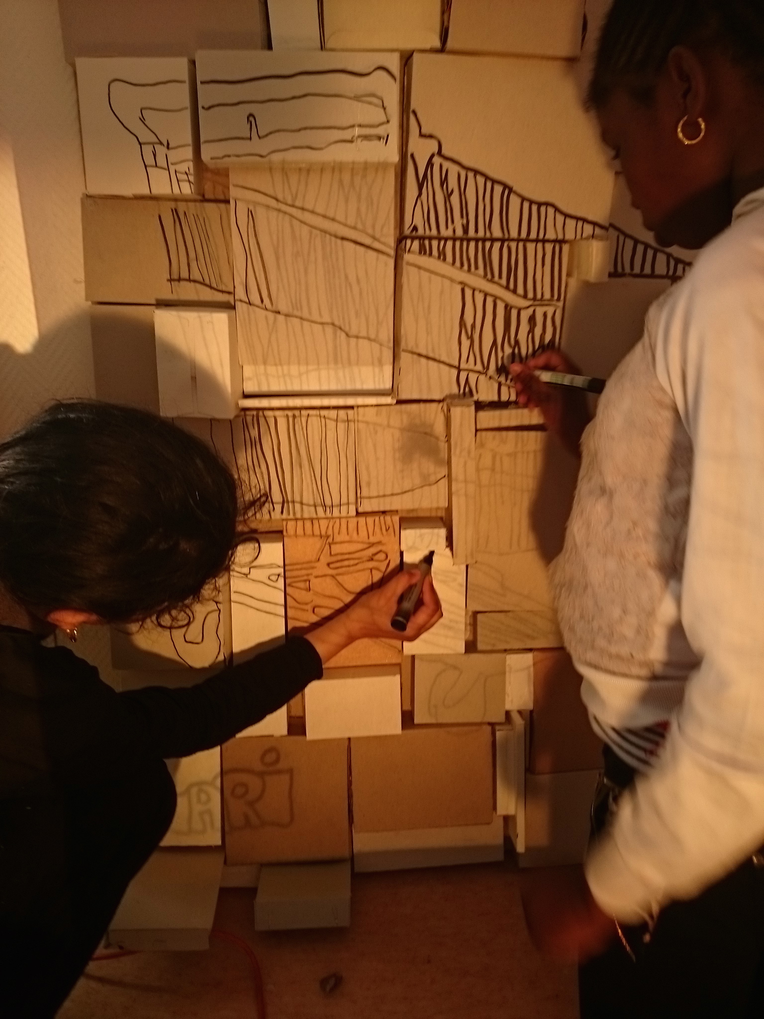 Les élèves de l’école Jules Guesde ont réalisé une sorte de jeu de construction graphique. Les enfants et ont été invités à réfléchir, puis réaliser des recherches graphiques autour du thème du transport et de l’acheminement des marchandises (vélo, voiture, camion, bateau, avion, hélicoptère, port containers…) afin d’expérimenter plusieurs procédés graphiques sur papier et sur des cartons d’emballages alimentaire.