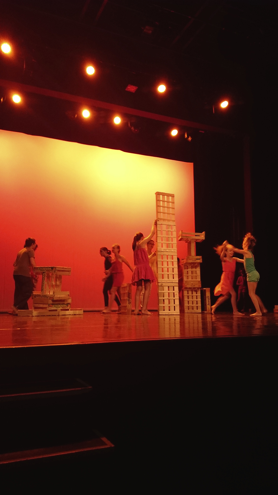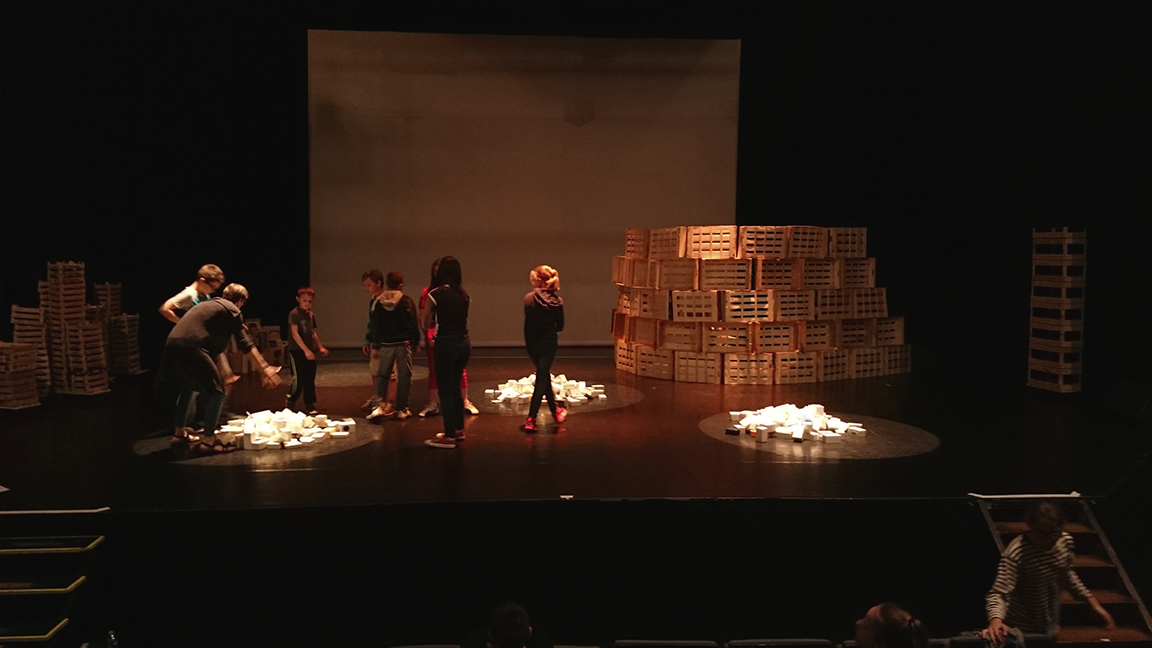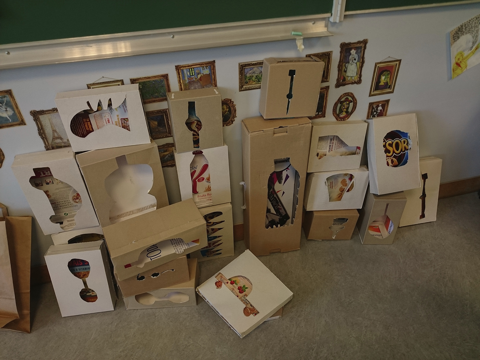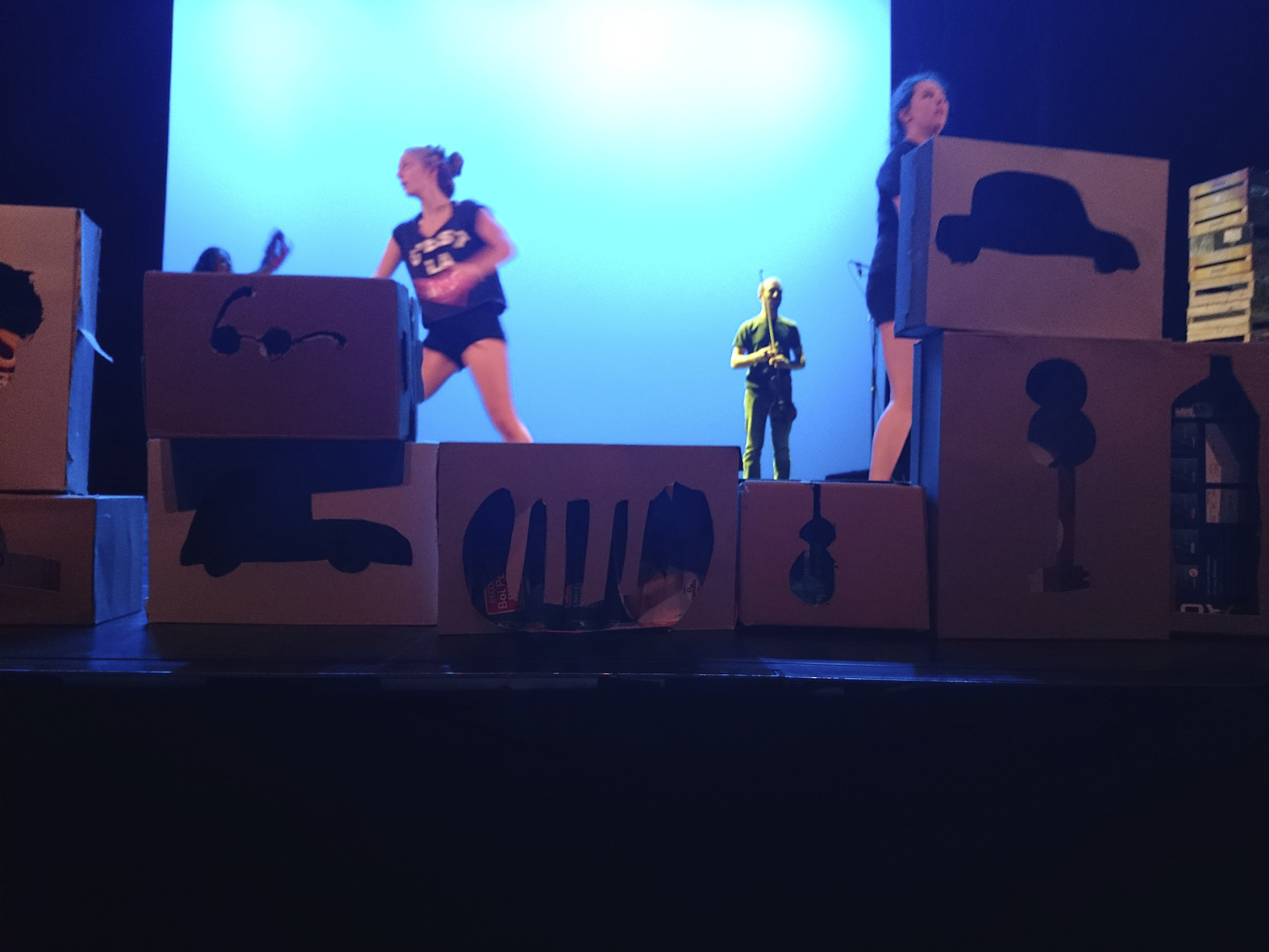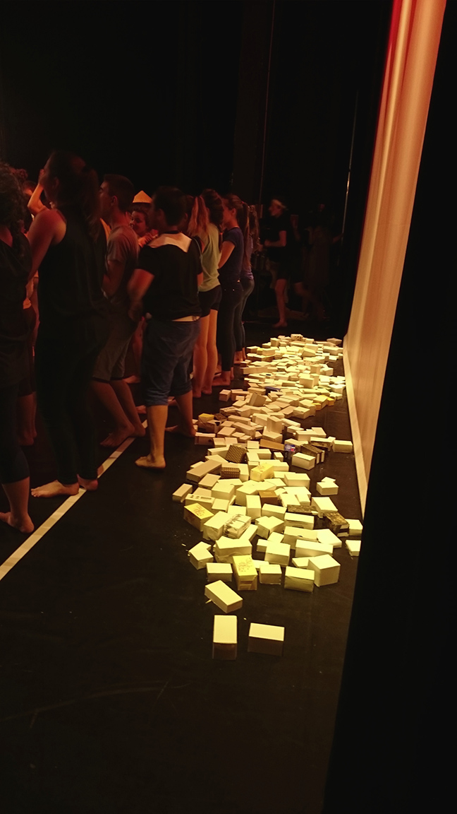 Réalisation de sept tableaux sans fermeture de rideau / L’intention est d’amener les élèves à poser un regard et des geste sur des objets du quotidiens tel que les emballages (par une analyse graphique et une expérimentation via des compositions graphiques et spatiales) dans le but de créer une scénographie pour un spectacle de danse en perpétuel mouvement.