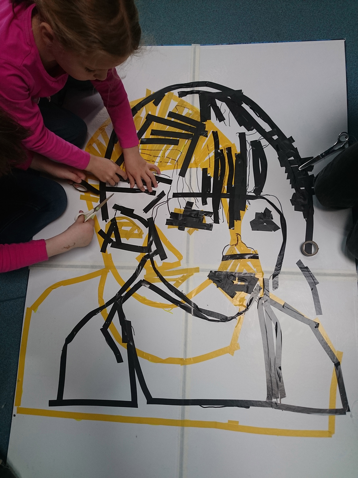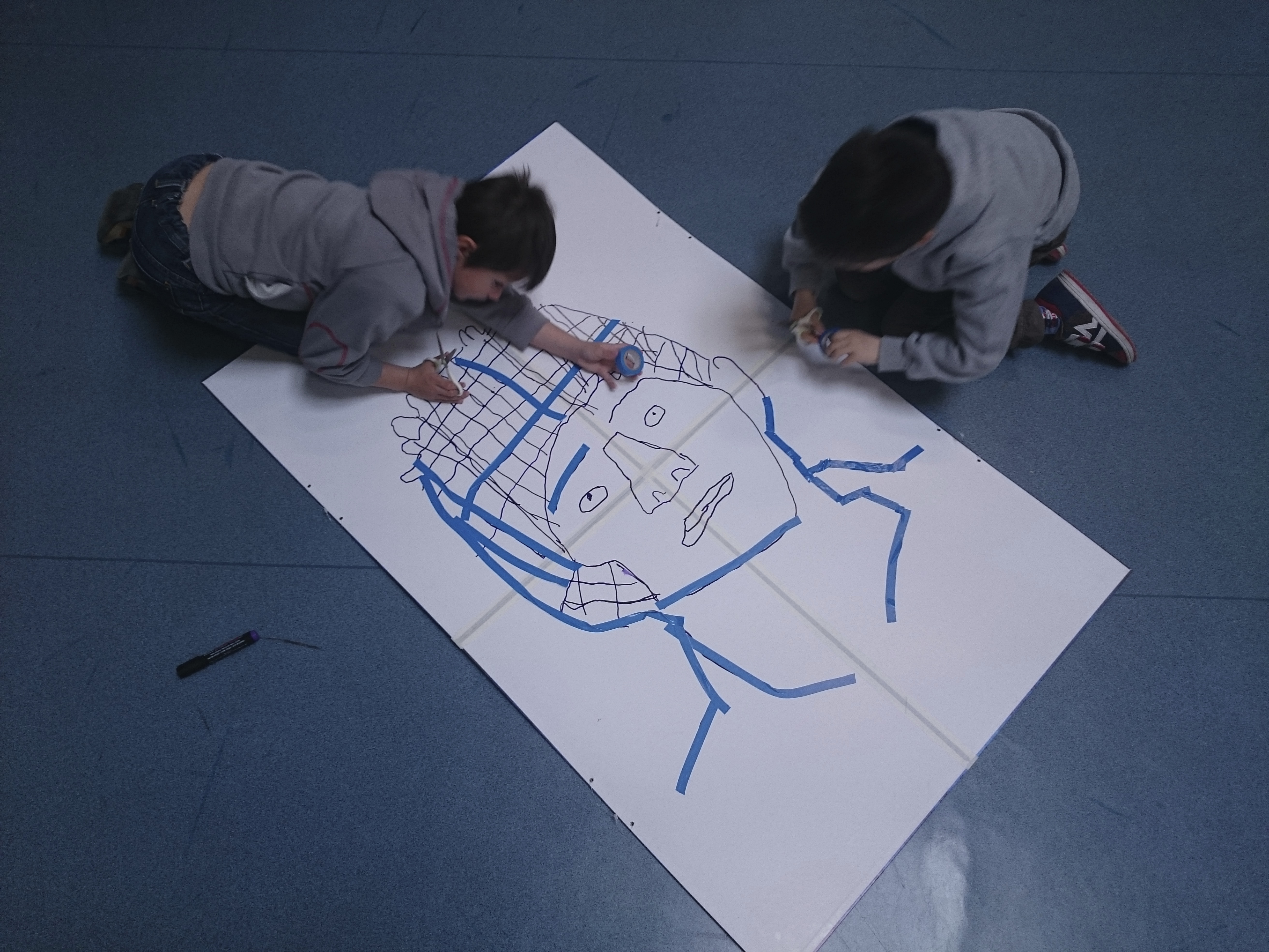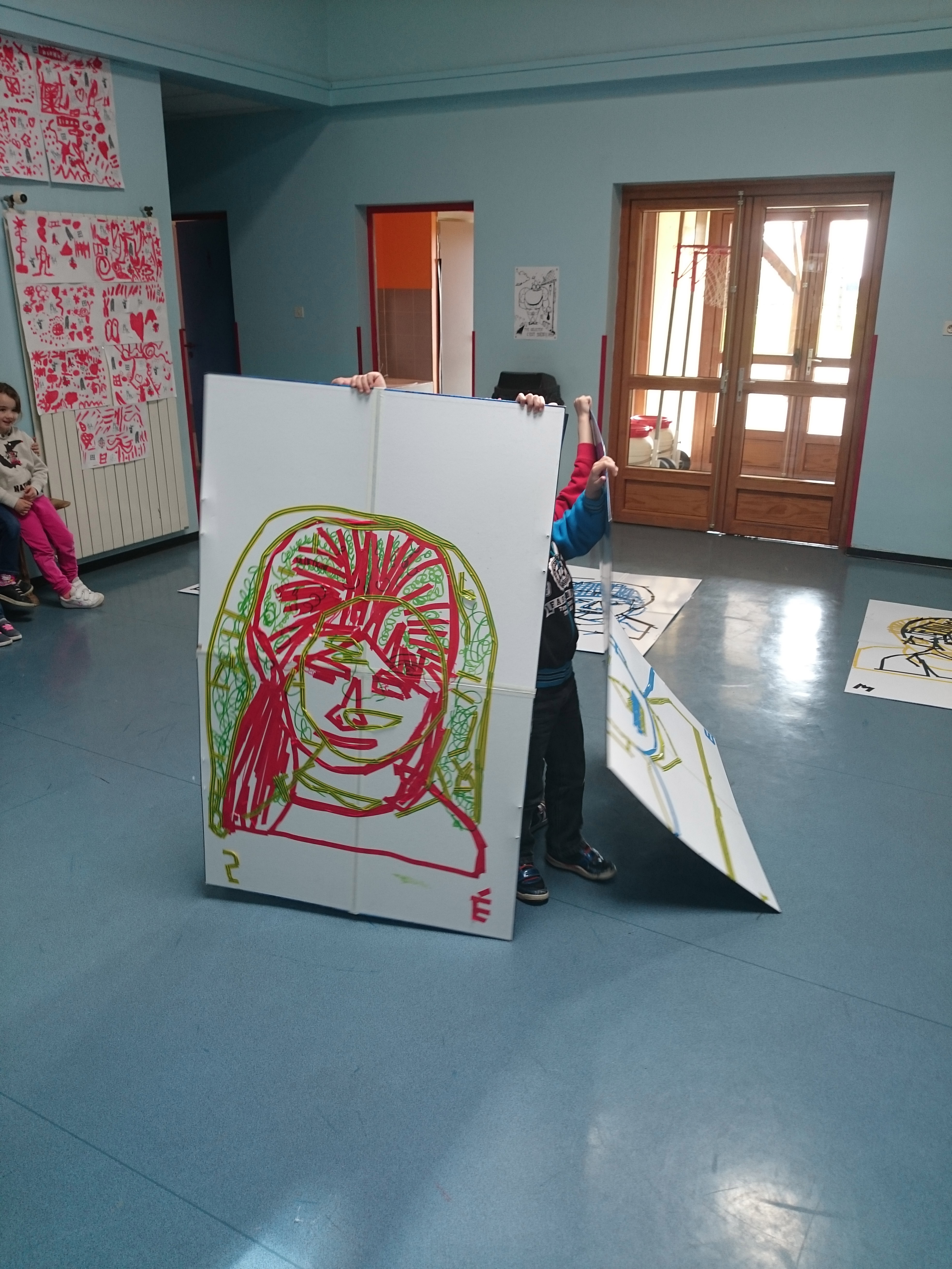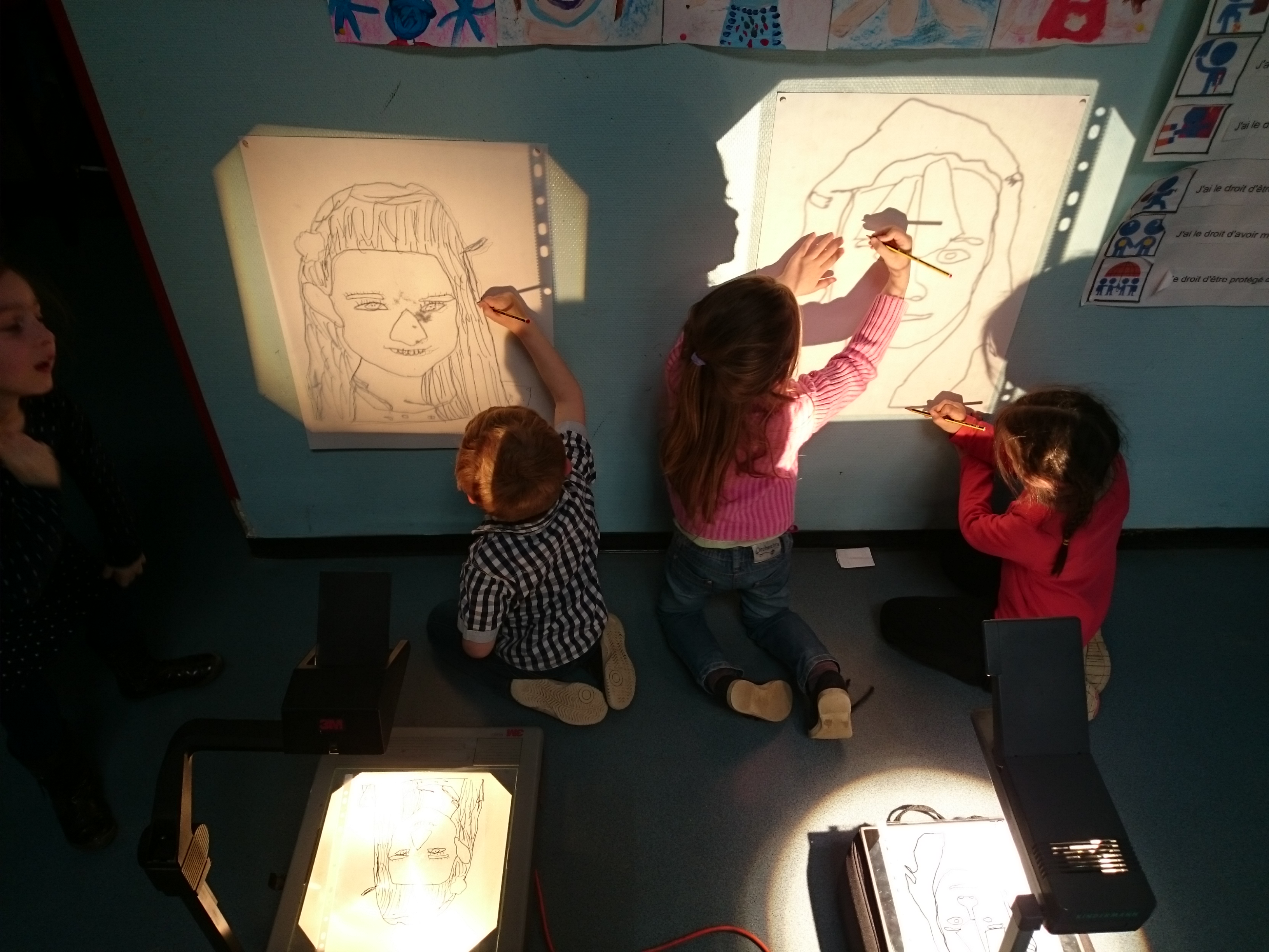 Les enfants ont dessiné leurs autoportraits sur des transparents pour ensuite être projetés sur de grande plaque (via un vidéo projecteur) dans le but d’expérimenter plusieurs procédés graphiques (décalage, agrandissements…). Par la suite, ils ont « dessiné » la projection avec du scotch. Leurs productions d’auto portrait-géants ont ensuite été exposés à la médiathèque d’Yvetot, au cours de la dernière période de l’année scolaire.