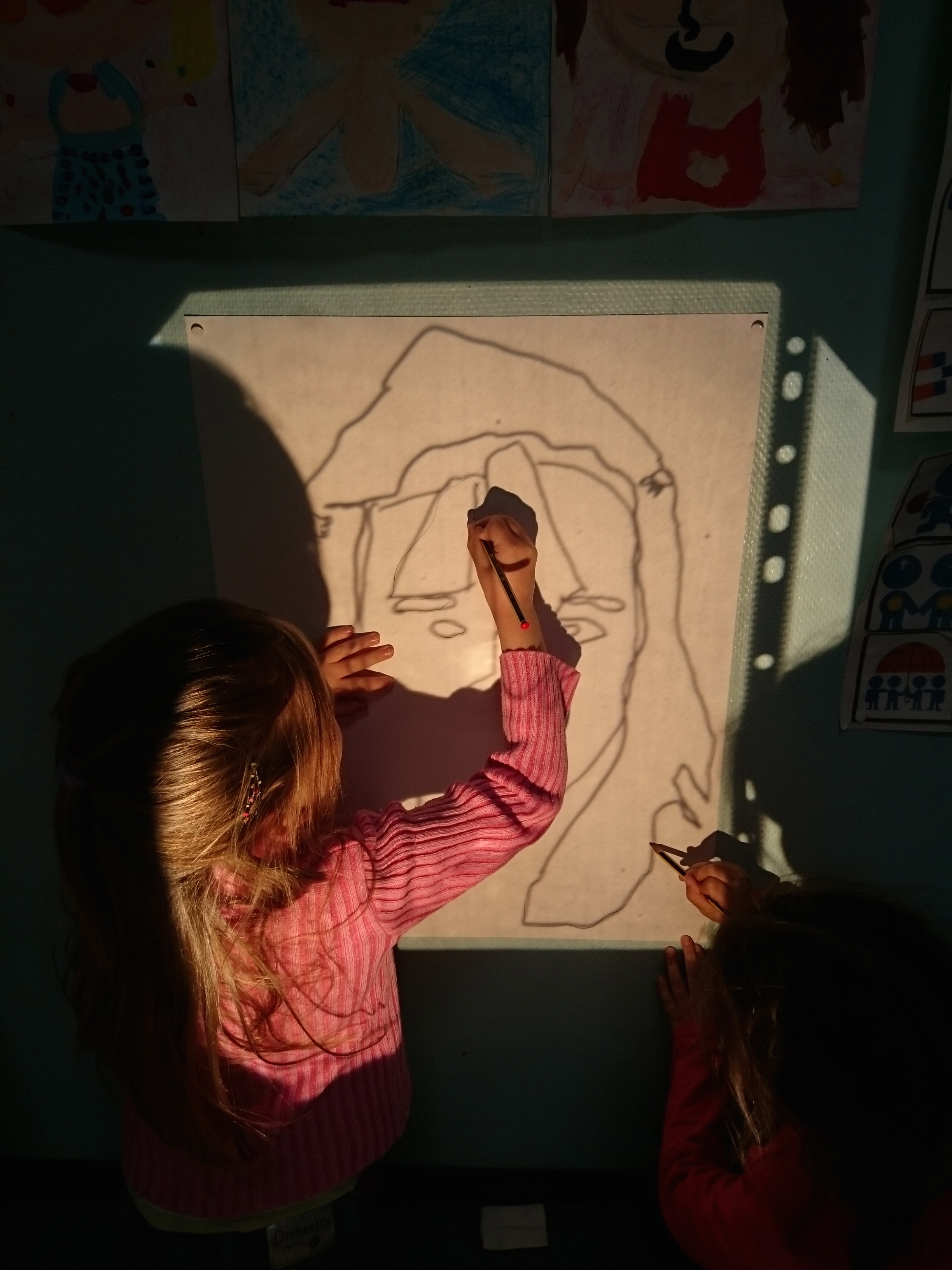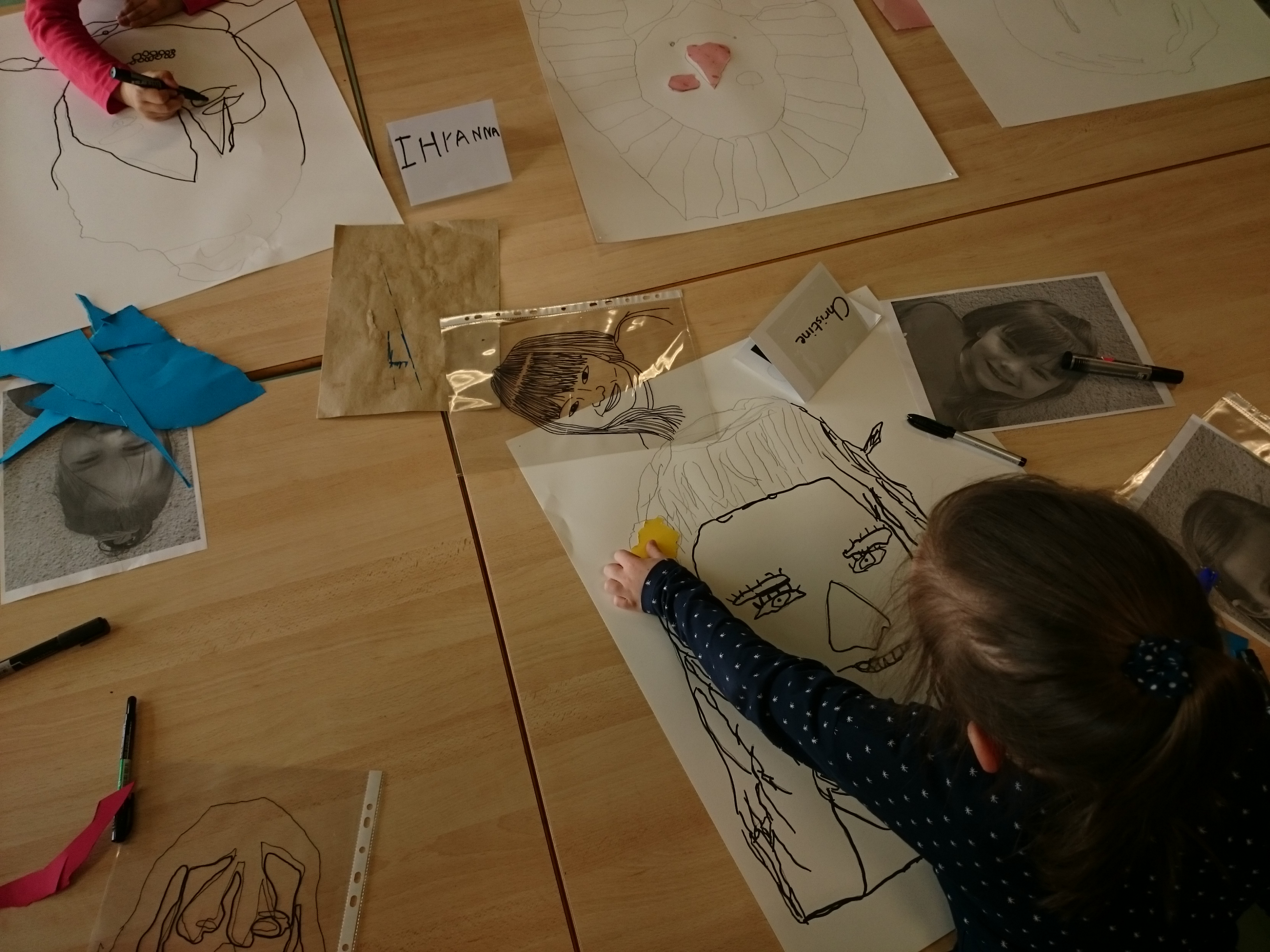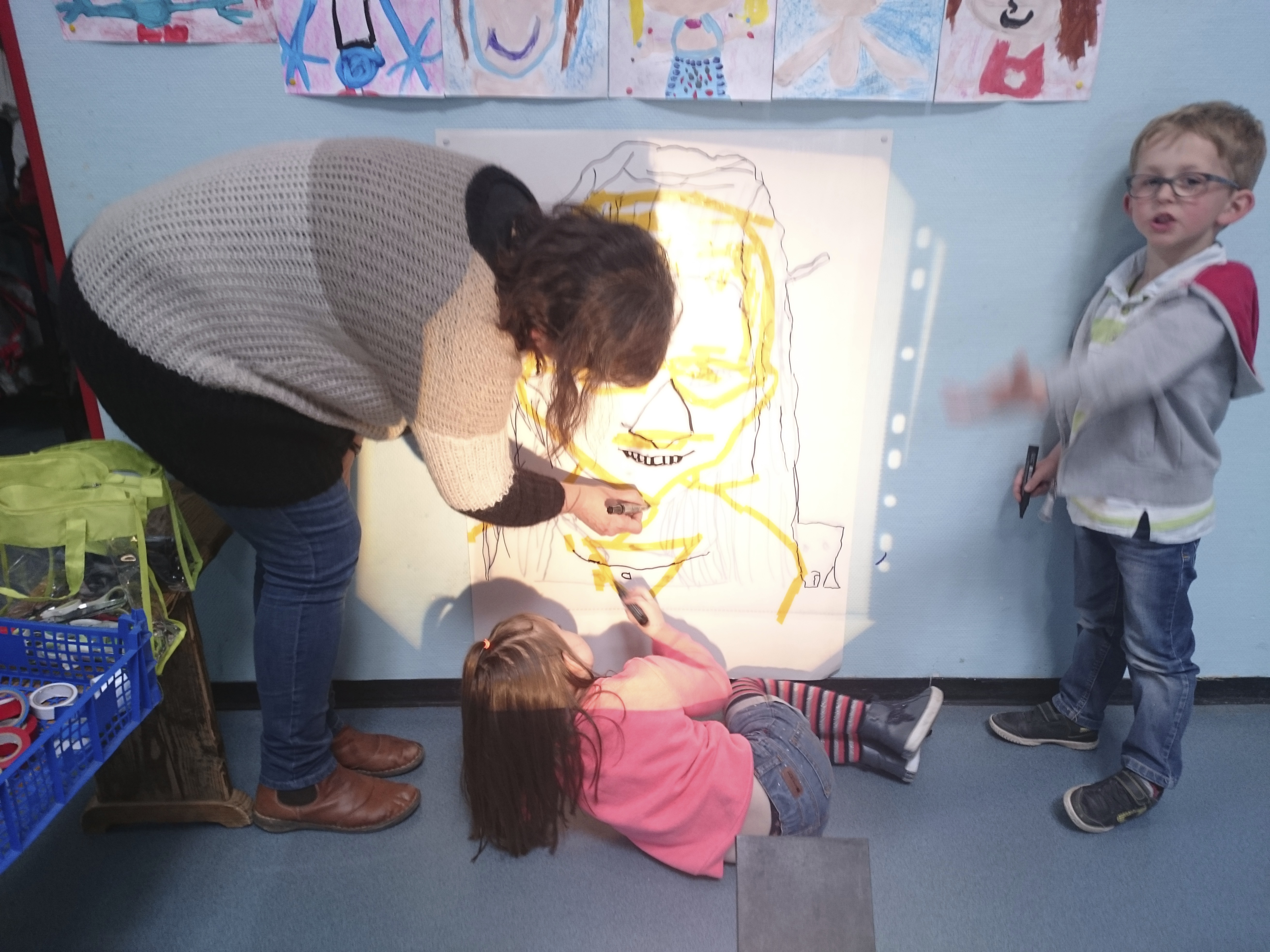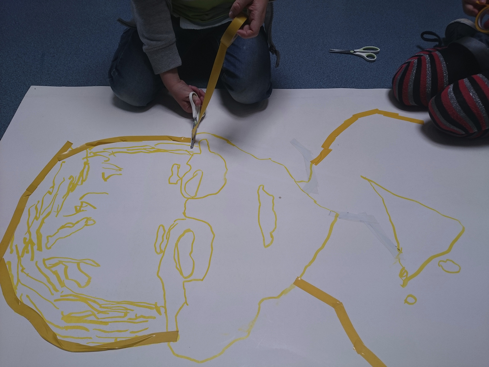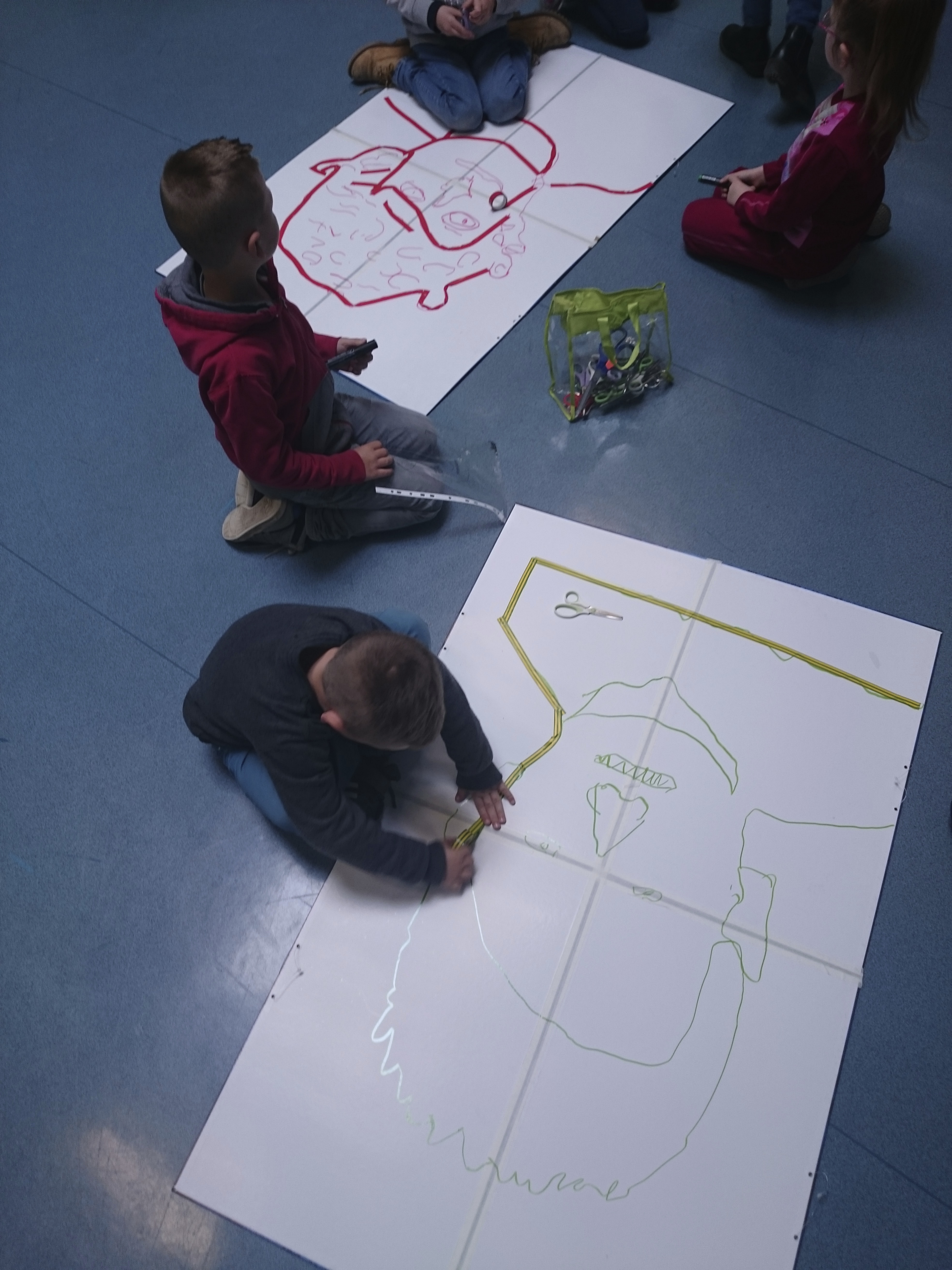 Les enfants ont dessiné leurs autoportraits sur des transparents pour ensuite être projetés sur de grande plaque (via un vidéo projecteur) dans le but d’expérimenter plusieurs procédés graphiques (décalage, agrandissements…). Par la suite, ils ont « dessiné » la projection avec du scotch. Leurs productions d’auto portrait-géants ont ensuite été exposés à la médiathèque d’Yvetot, au cours de la dernière période de l’année scolaire.