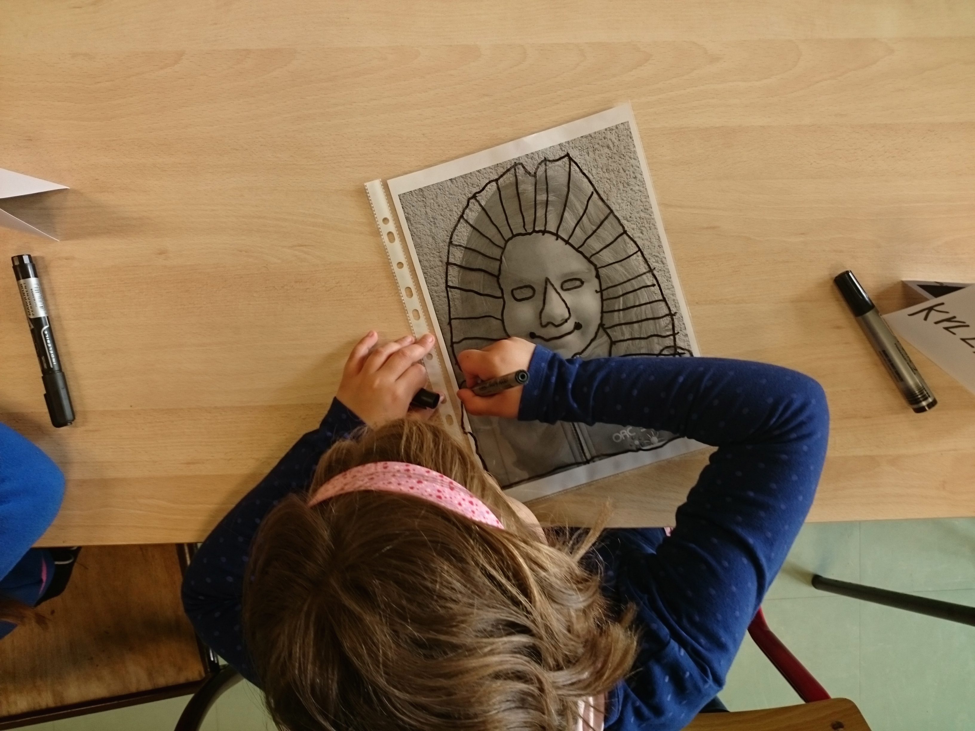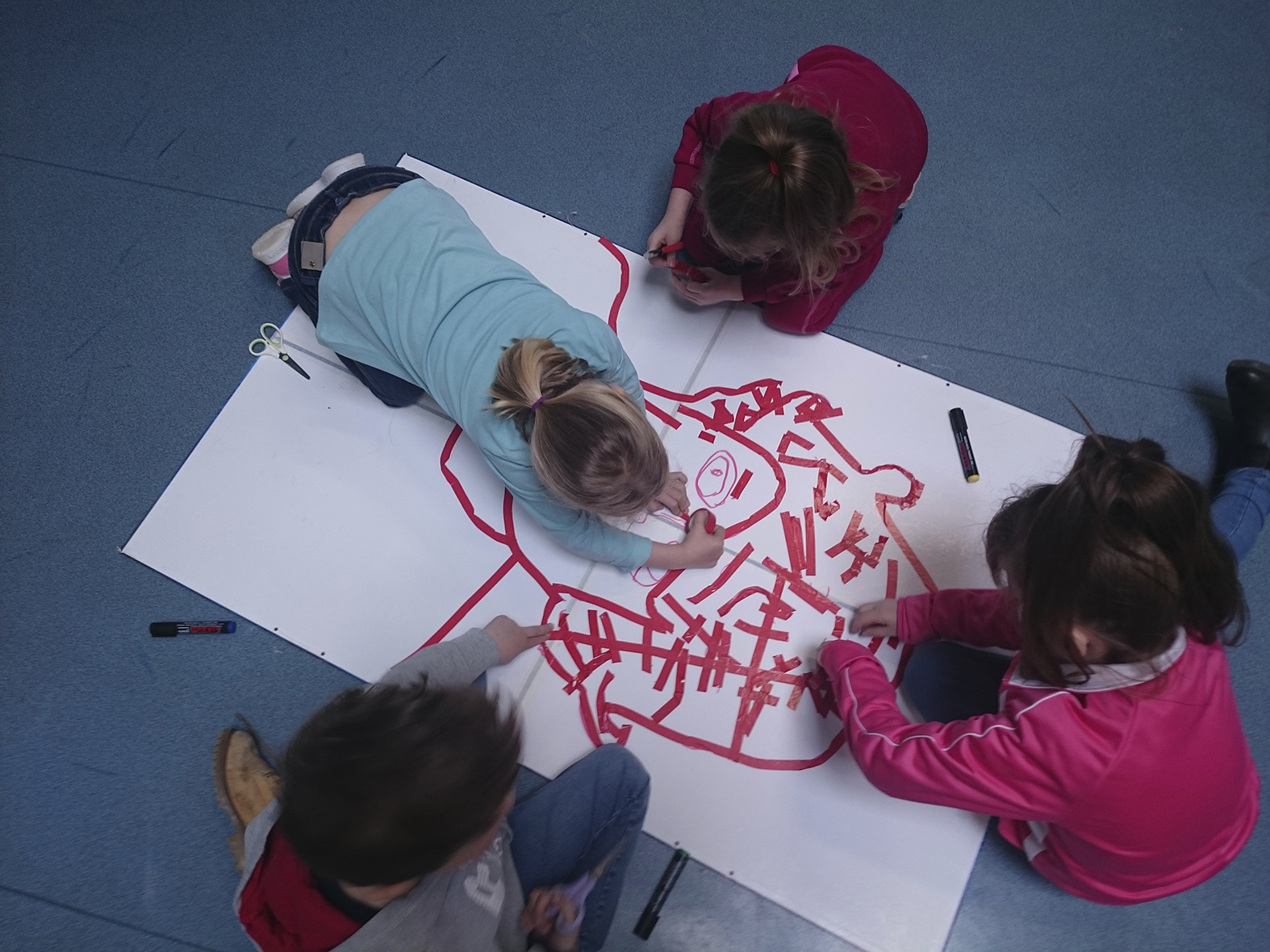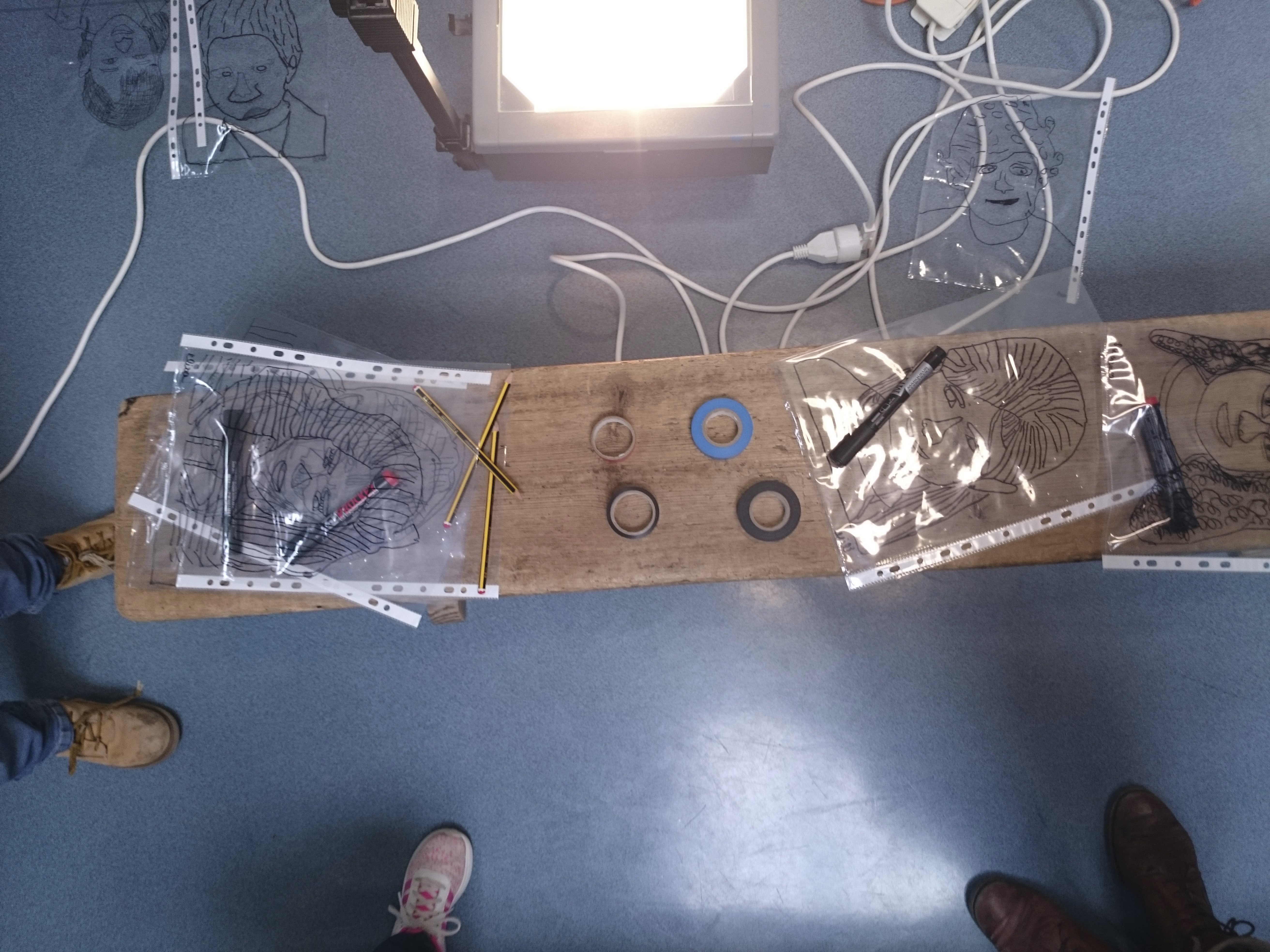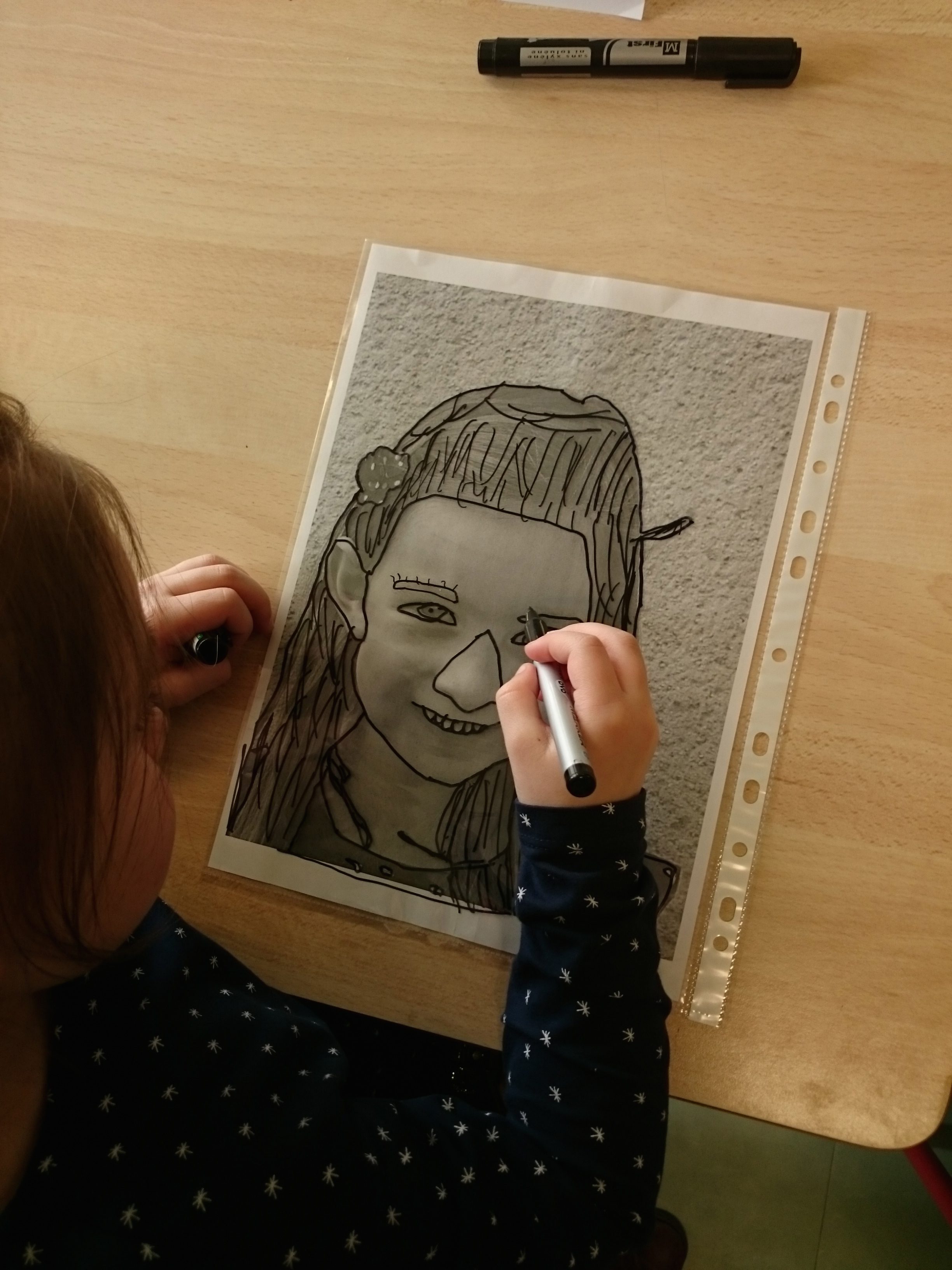 Les enfants ont dessiné leurs autoportraits sur des transparents pour ensuite être projetés sur de grande plaque (via un vidéo projecteur) dans le but d’expérimenter plusieurs procédés graphiques (décalage, agrandissements…). Par la suite, ils ont « dessiné » la projection avec du scotch. Leurs productions d’auto portrait-géants ont ensuite été exposés à la médiathèque d’Yvetot, au cours de la dernière période de l’année scolaire.