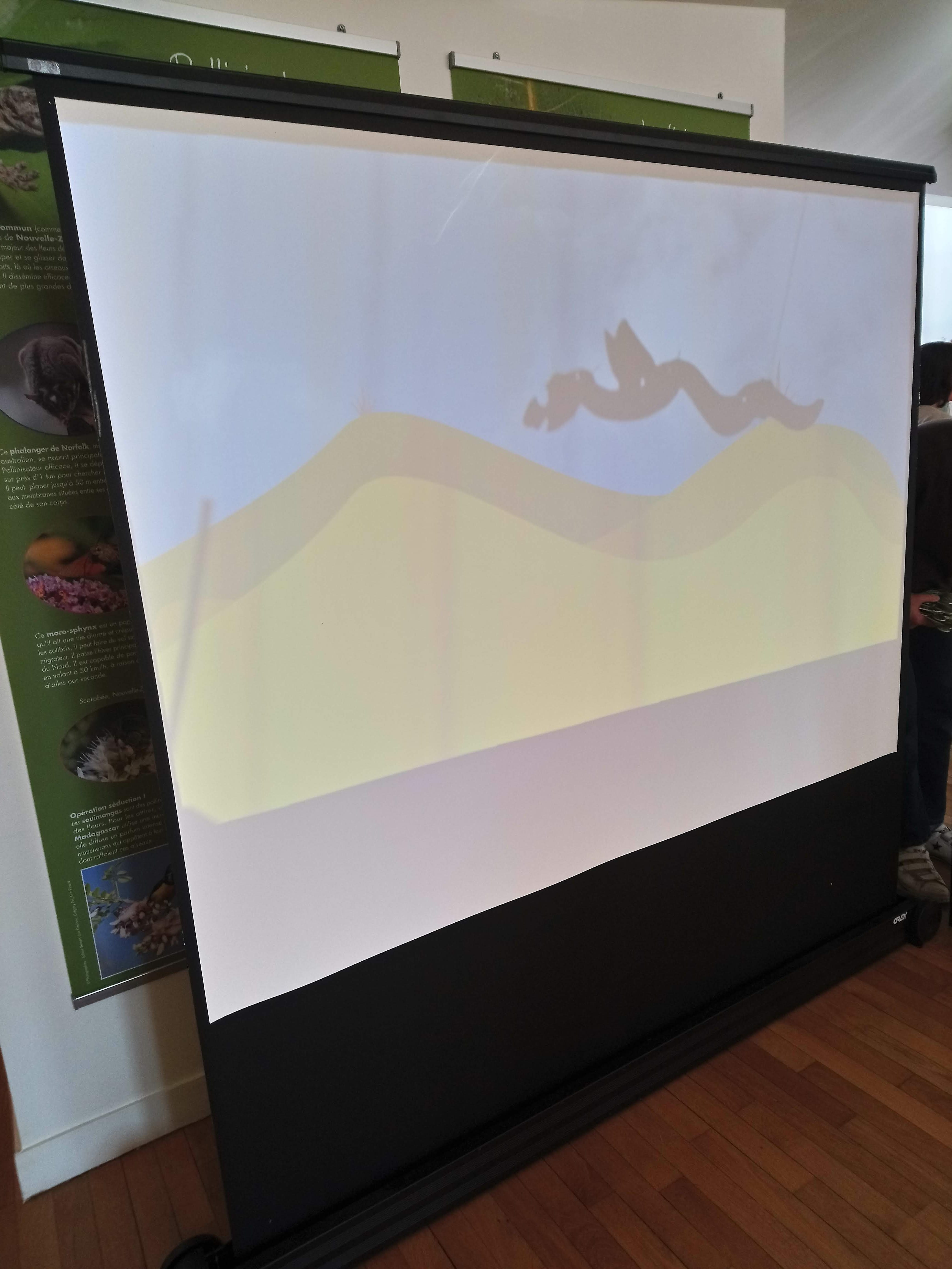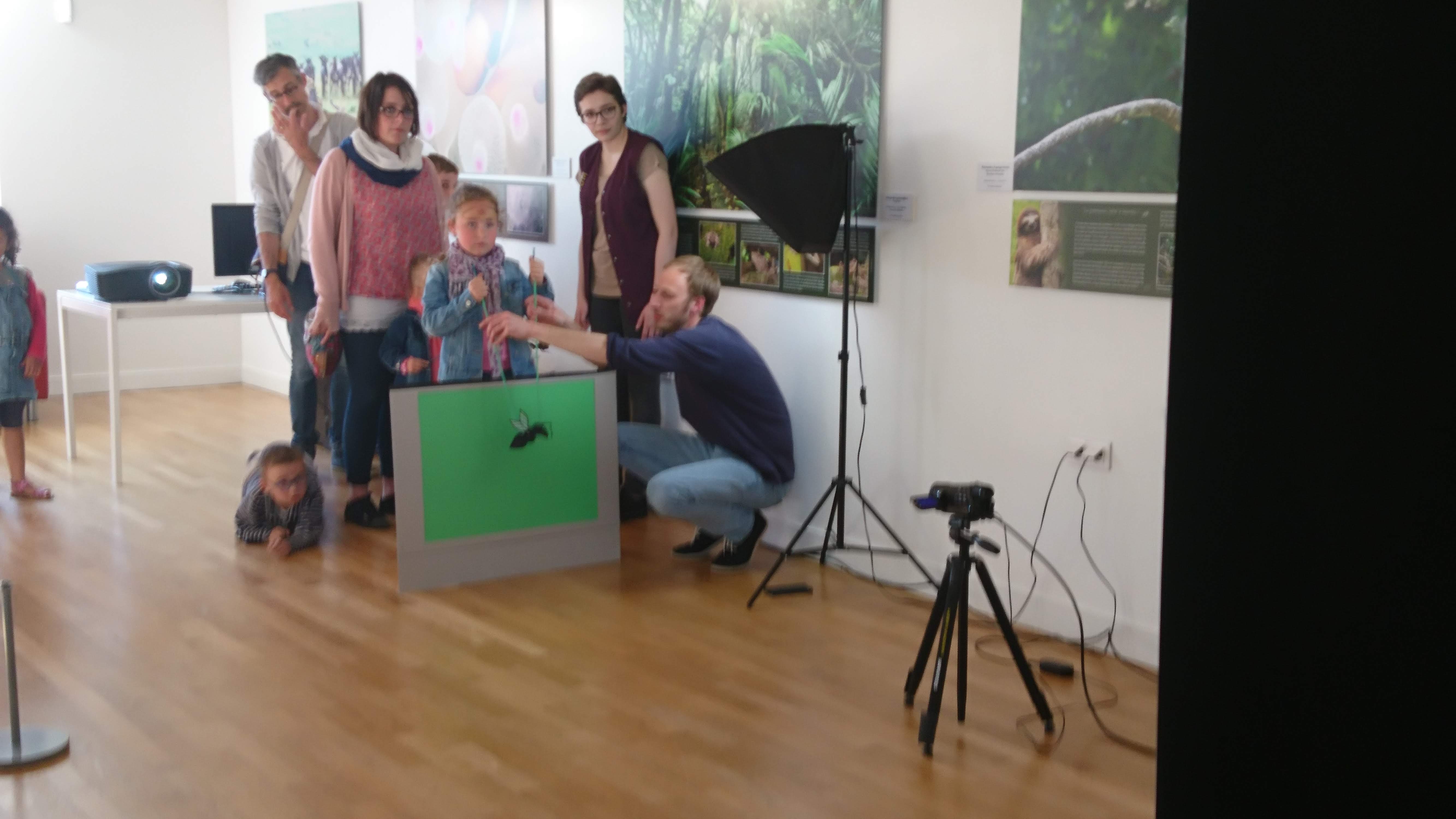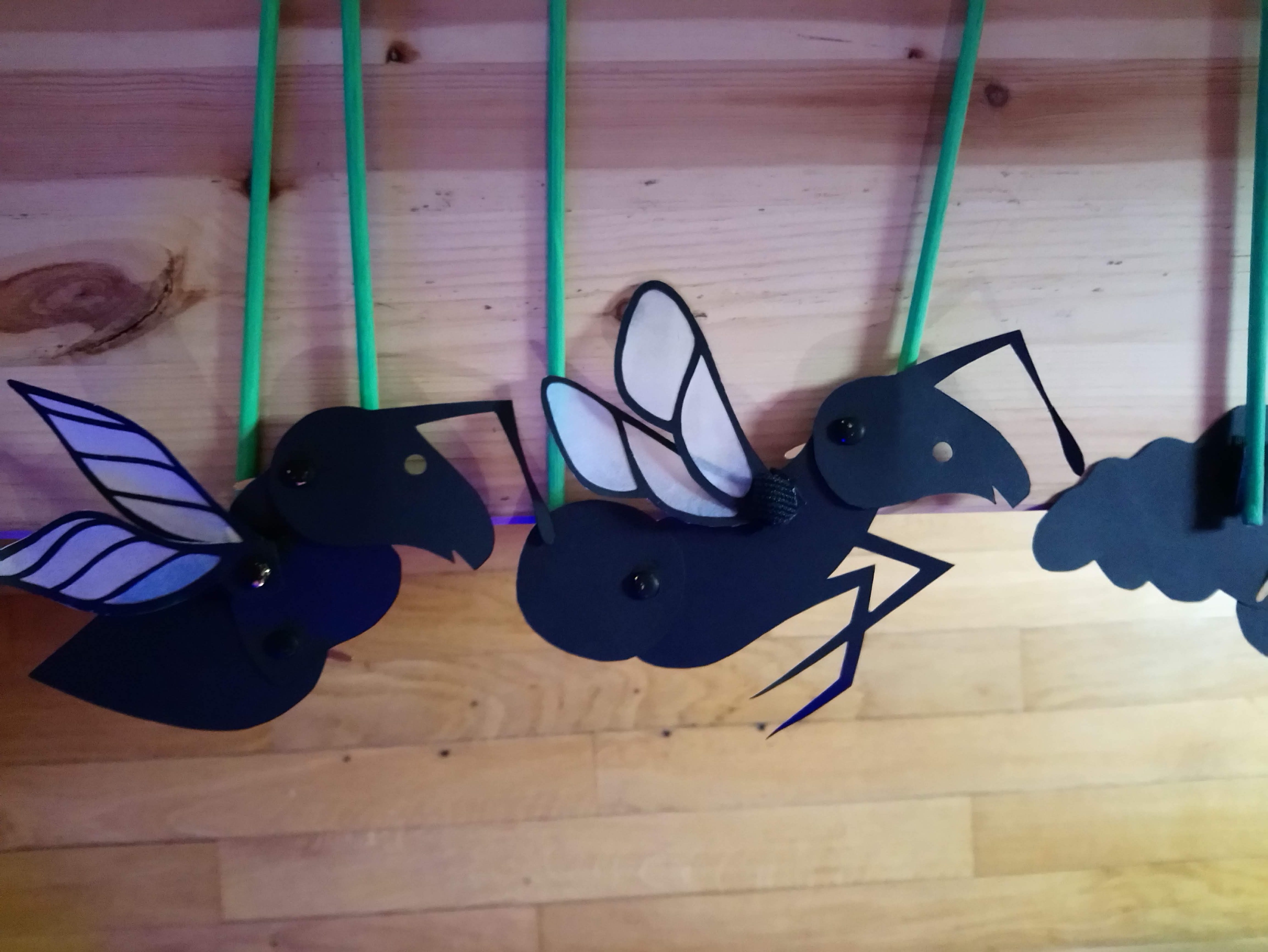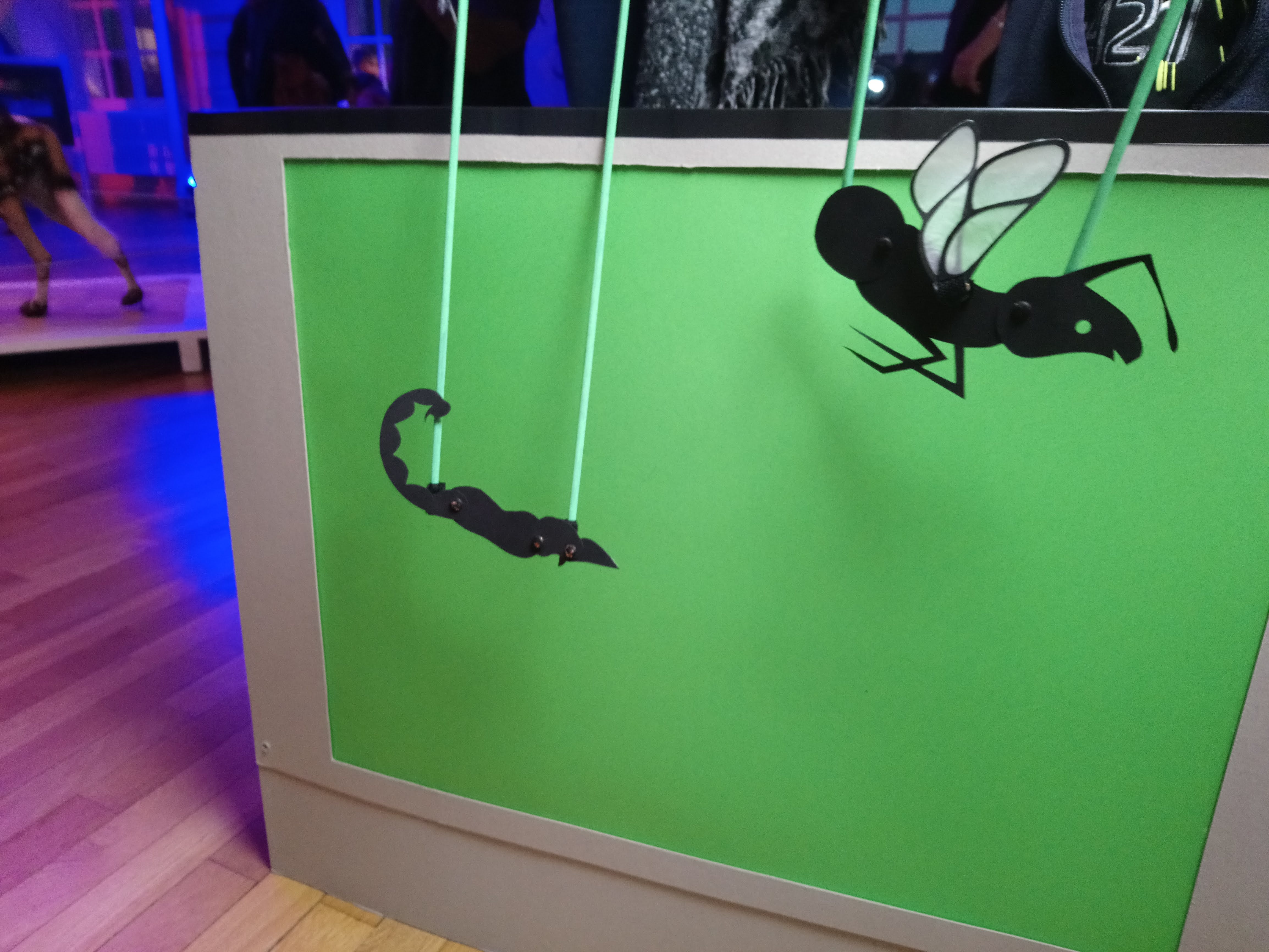 Insectes virtuels est un dispositif de manipulation d’insectes en papier découpé sur fond vert. Grâce à la technique chromakey (vidéo sur fond vert), les marionnettes sont incrustées en direct dans différents décors virtuels.