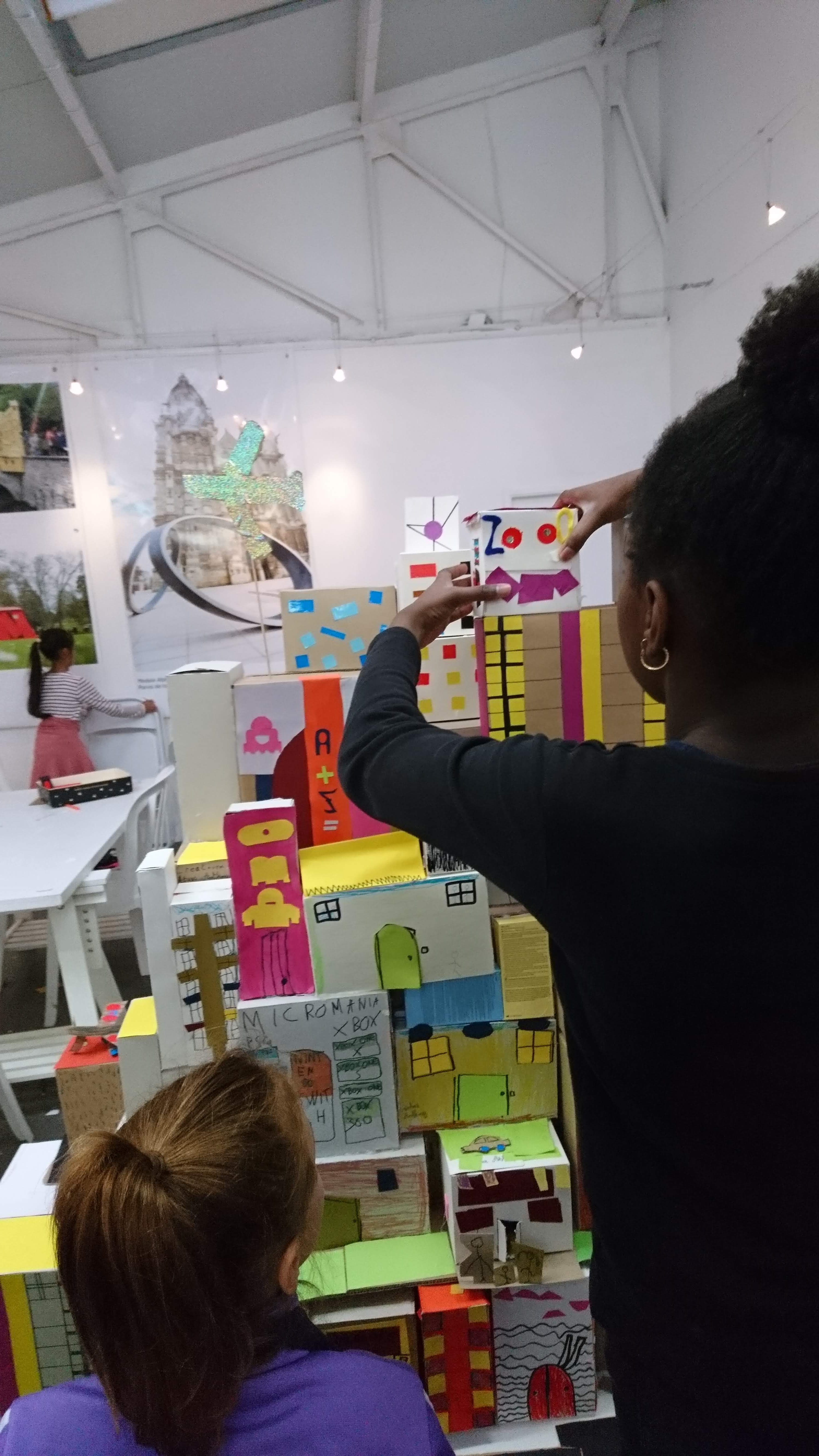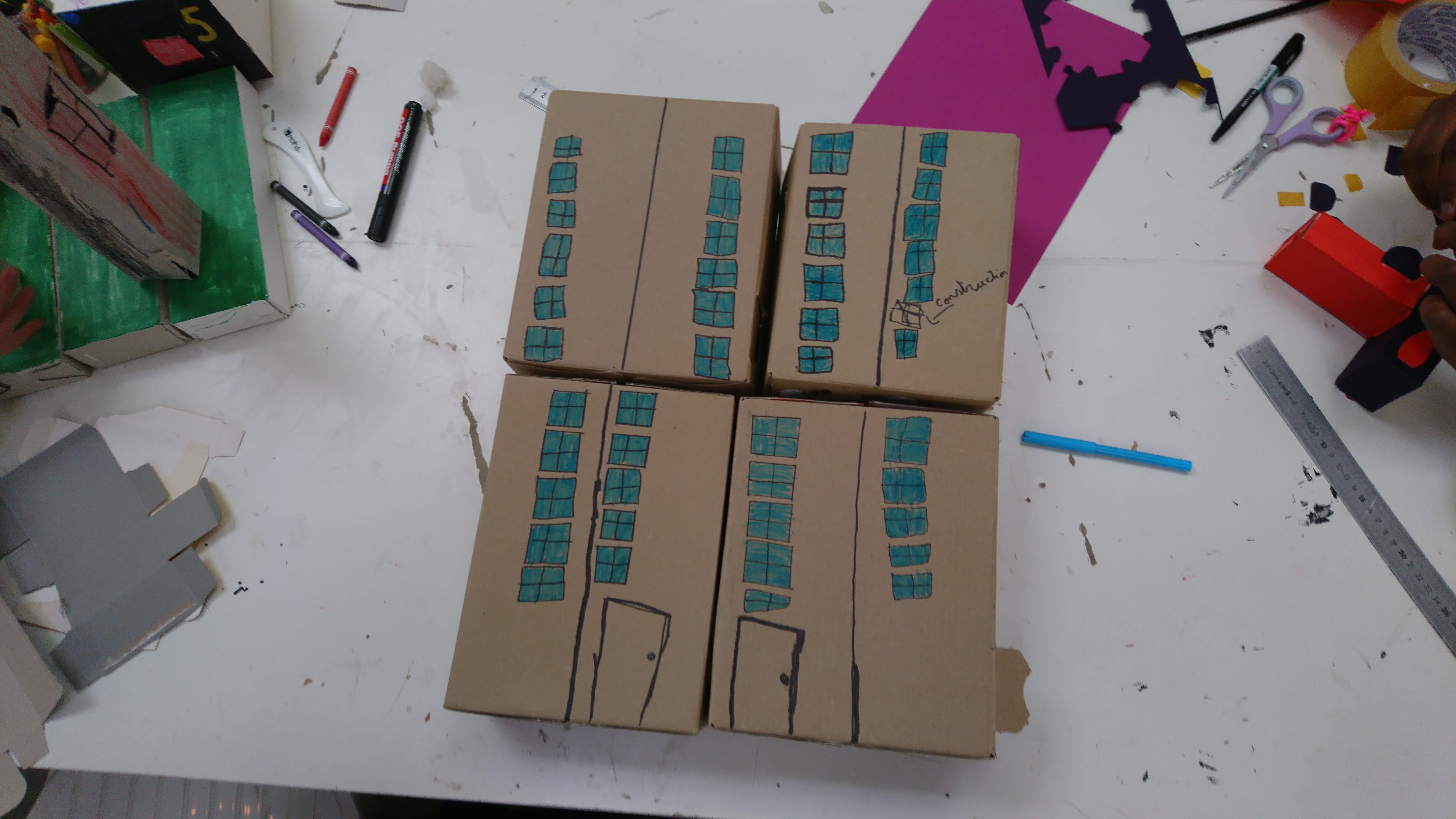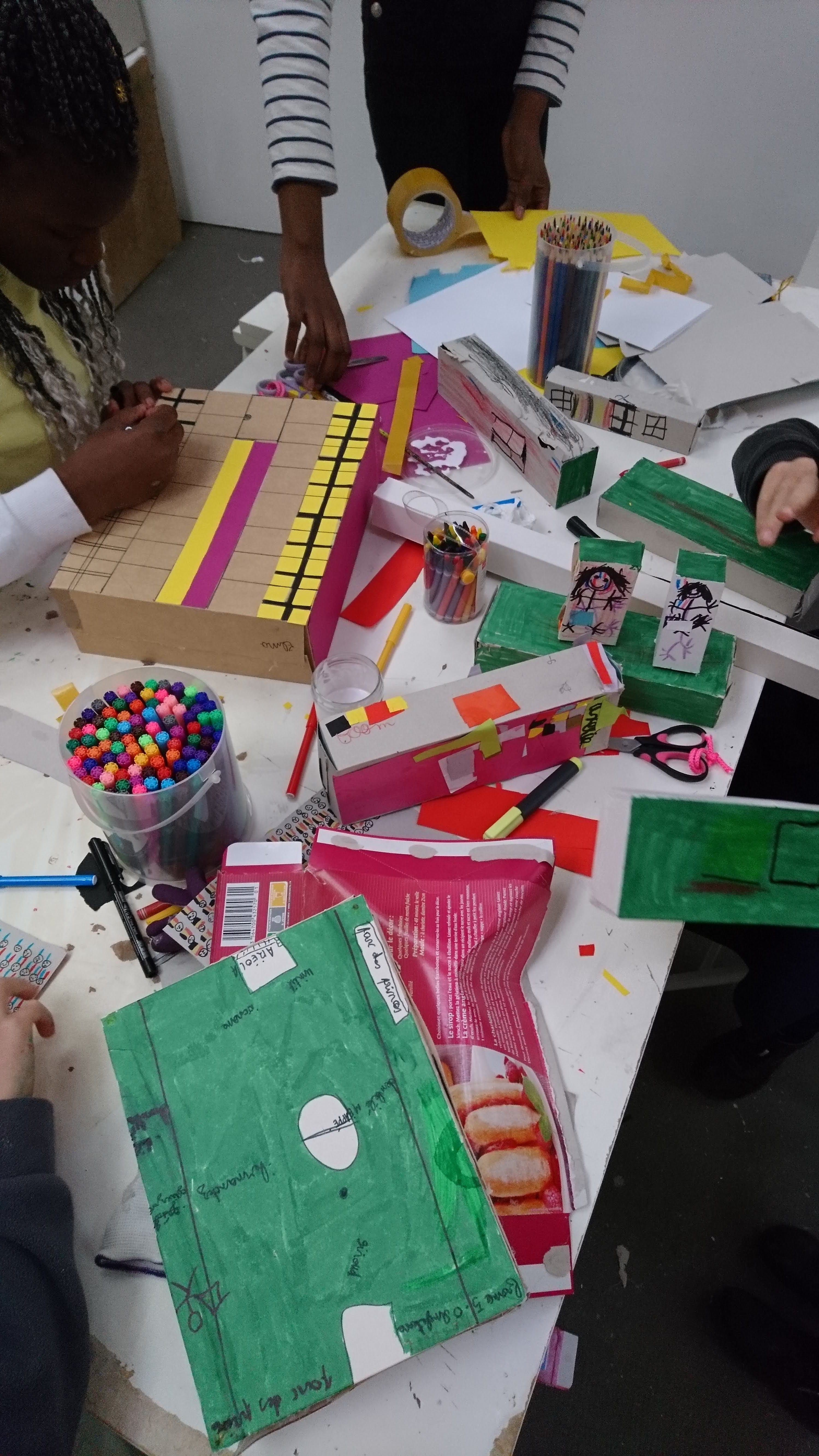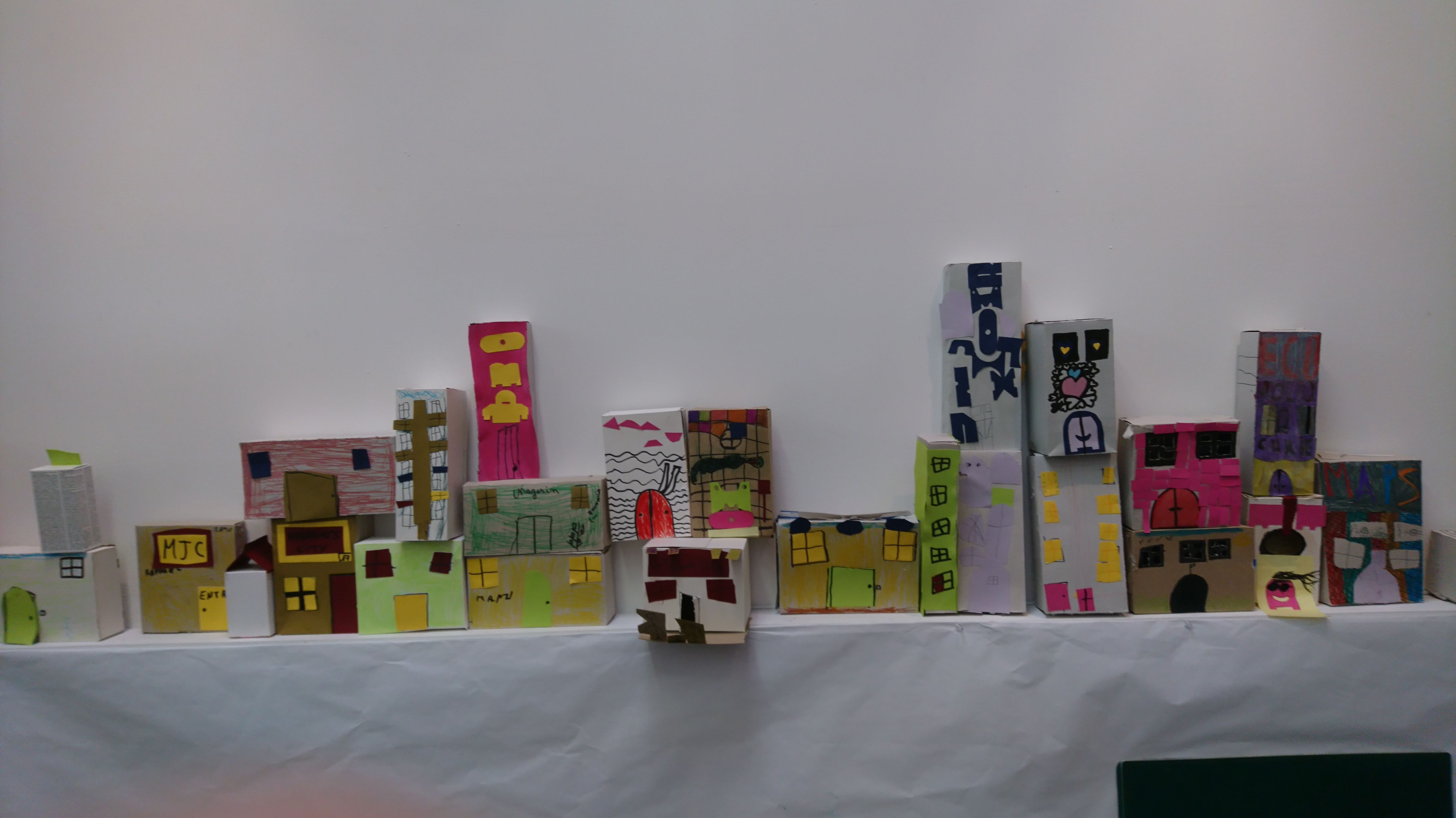 Les boîtes sont retournées côté gris, devenant ainsi le supports de création pour imaginer une multitude de petites maisons sur lesquelles sont coloriés et découpés des fenêtres, des portes, des toits. Ces boîtes sont ensuite assemblées et superposées les unes aux autres sur des supports afin de recréer des villes où grouillent différents habitats et abris imaginés par les enfants.