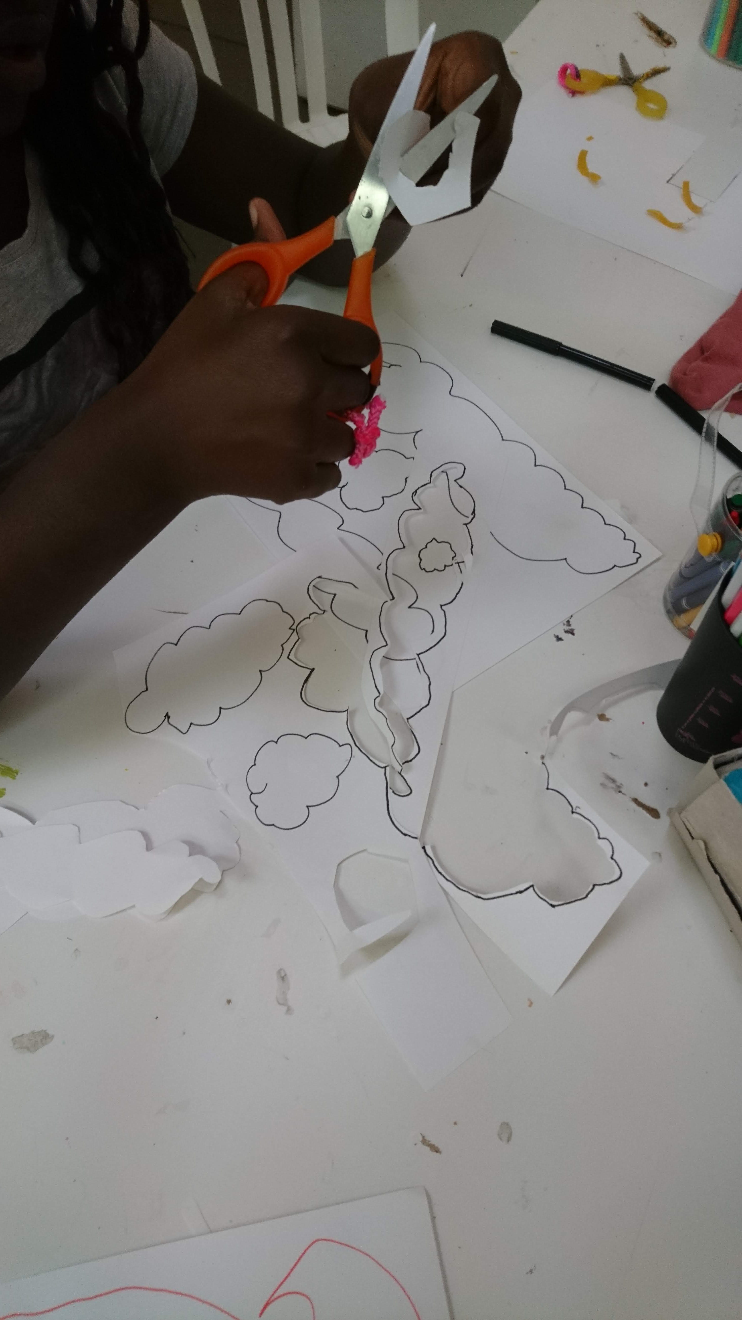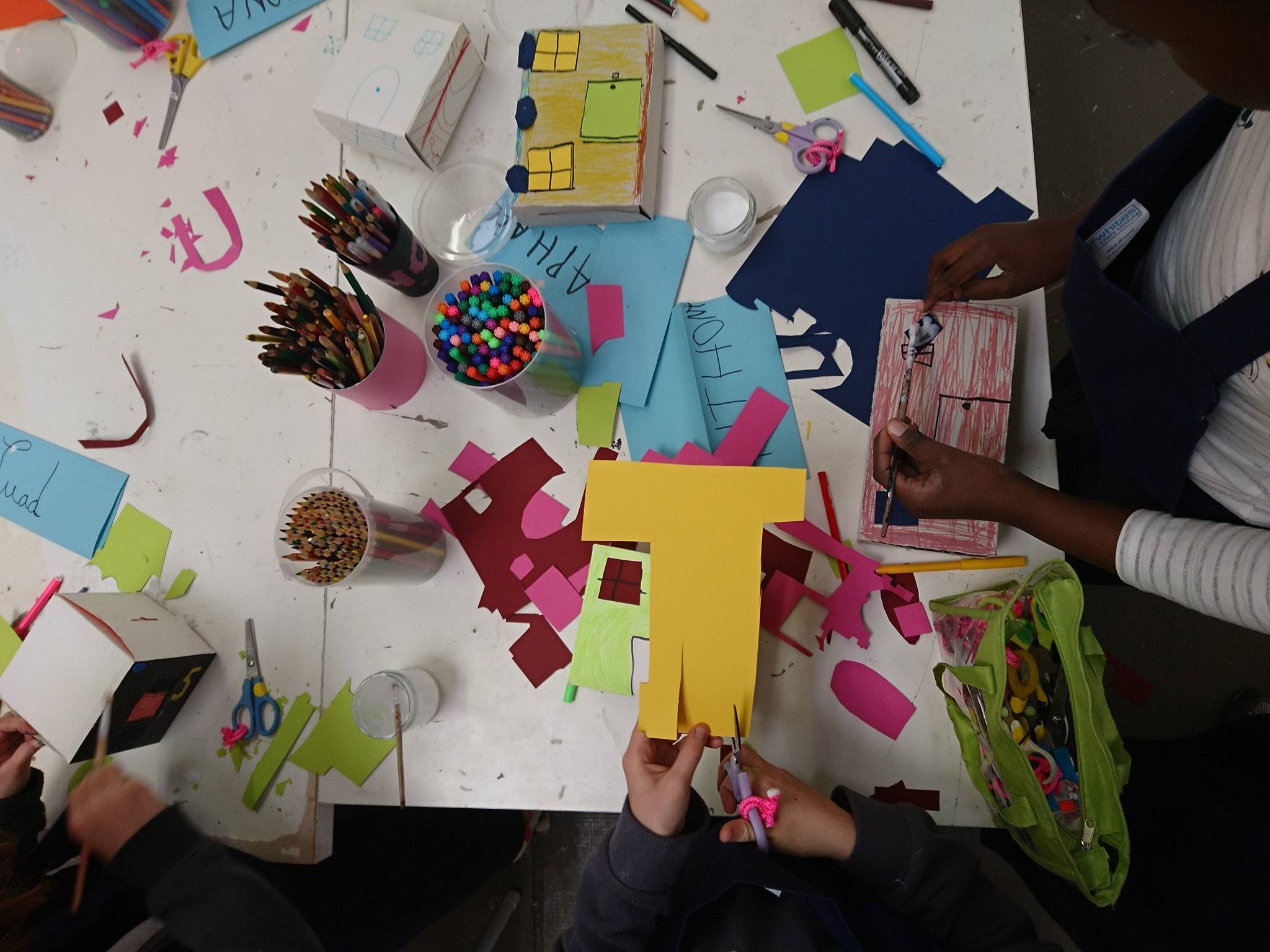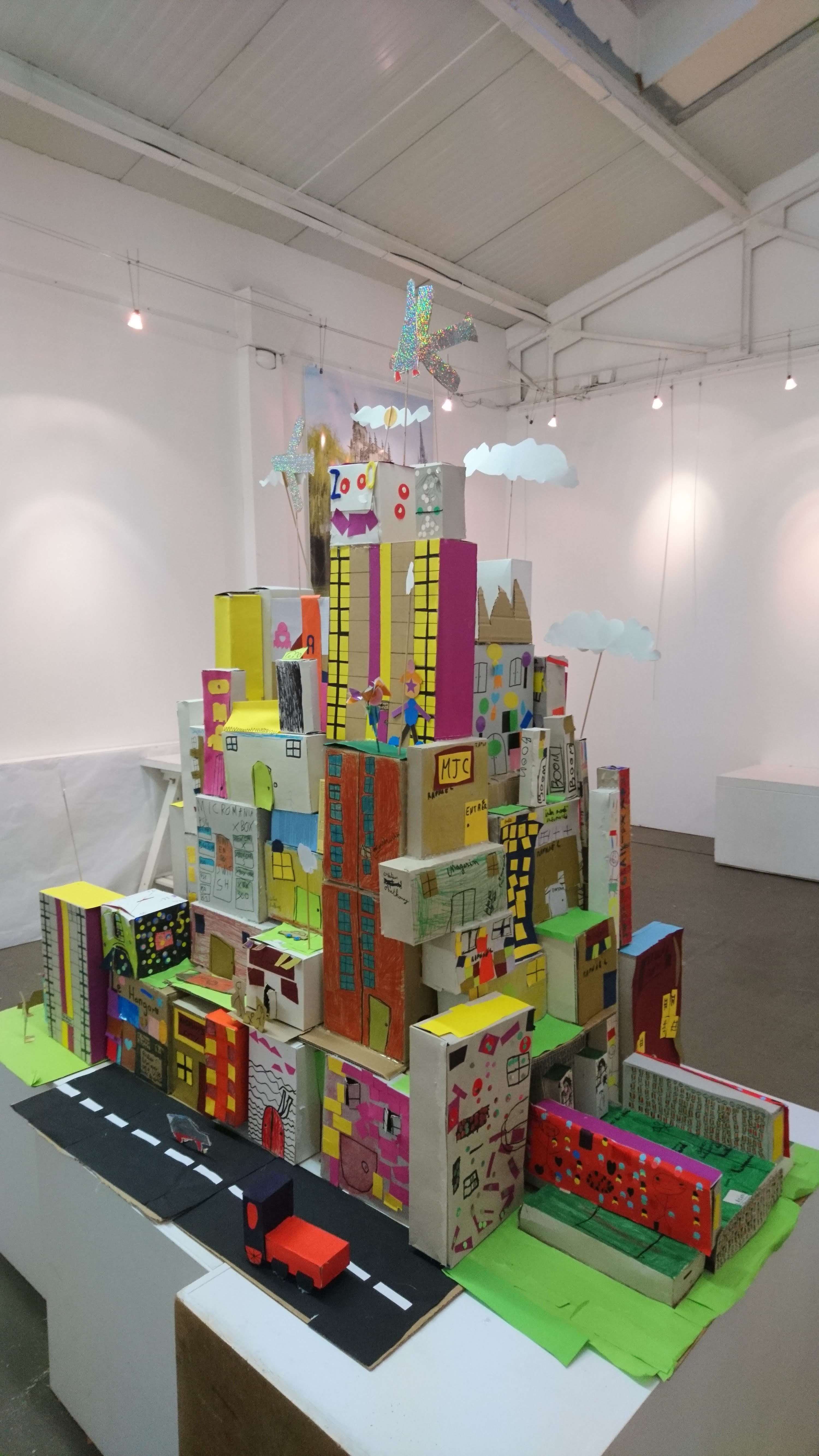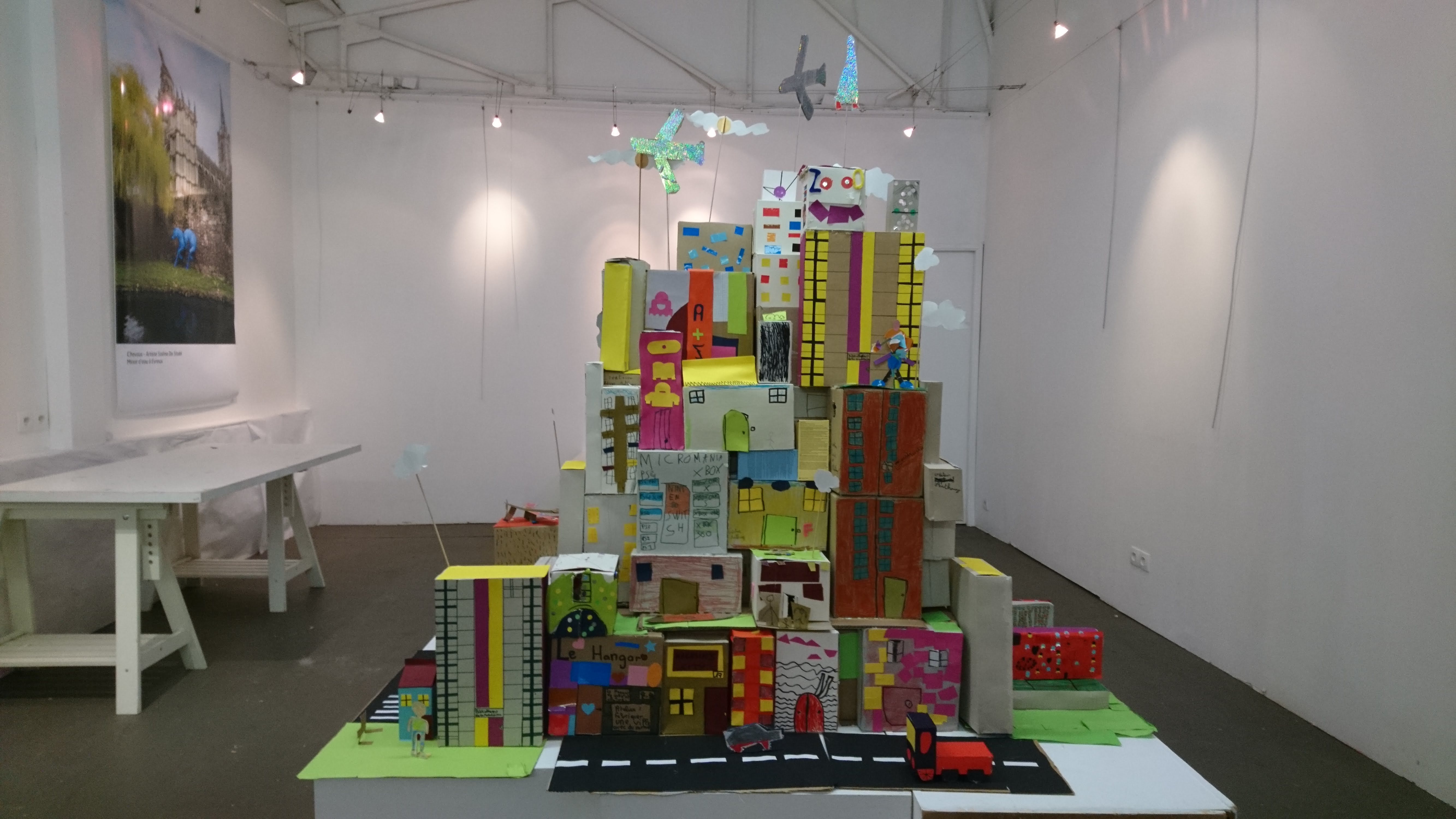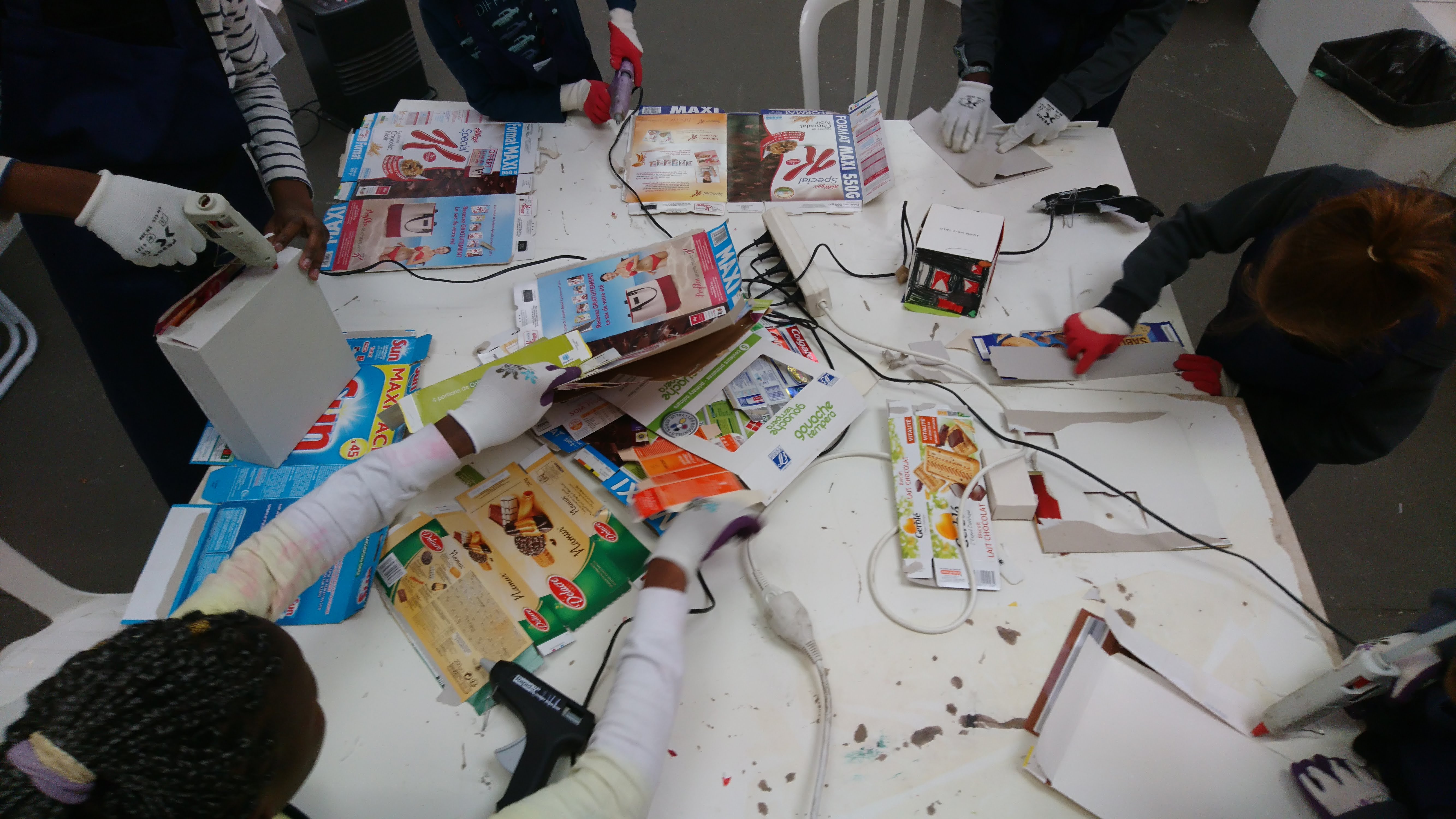 Les boîtes sont retournées côté gris, devenant ainsi le supports de création pour imaginer une multitude de petites maisons sur lesquelles sont coloriés et découpés des fenêtres, des portes, des toits. Ces boîtes sont ensuite assemblées et superposées les unes aux autres sur des supports afin de recréer des villes où grouillent différents habitats et abris imaginés par les enfants.