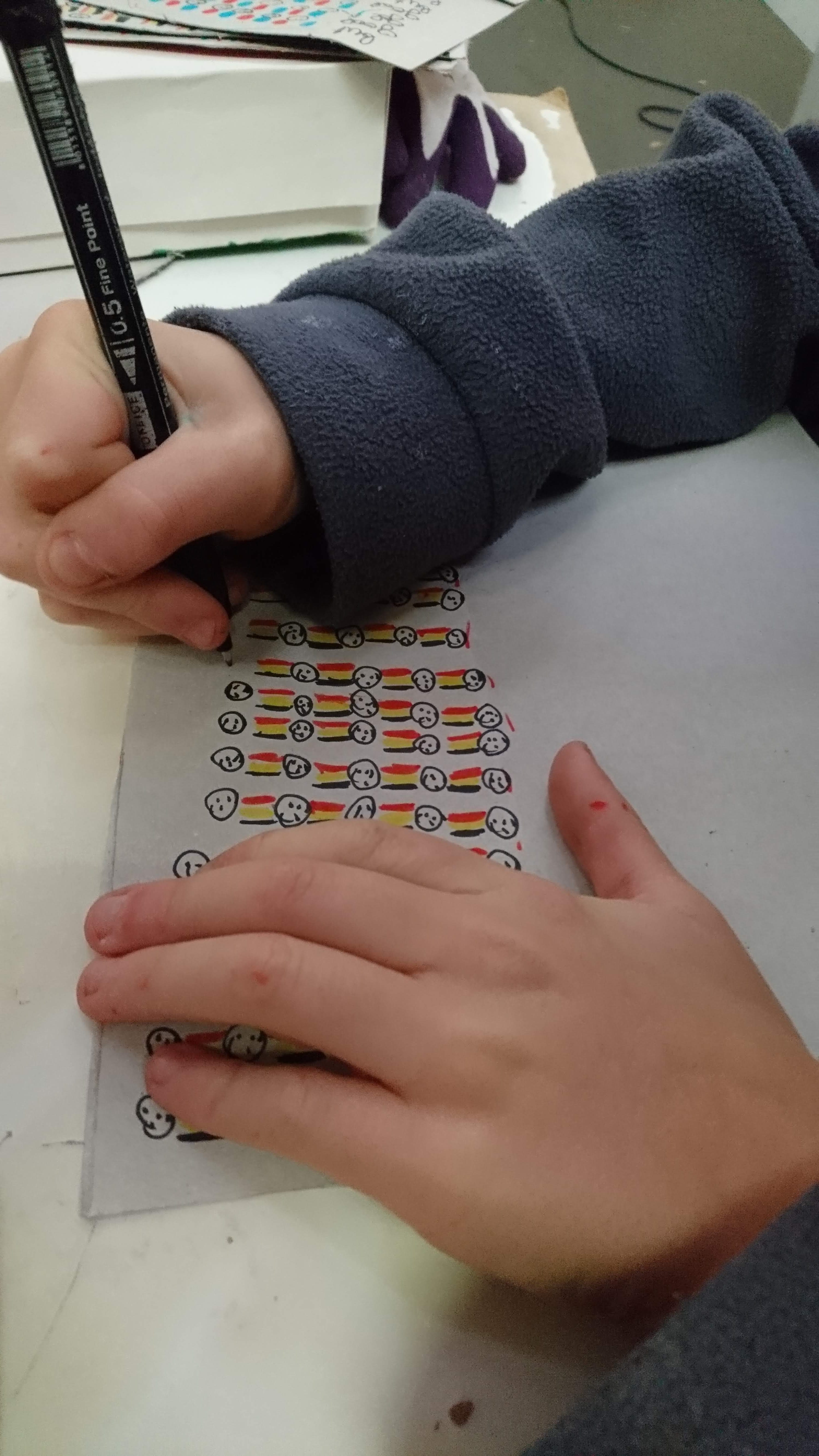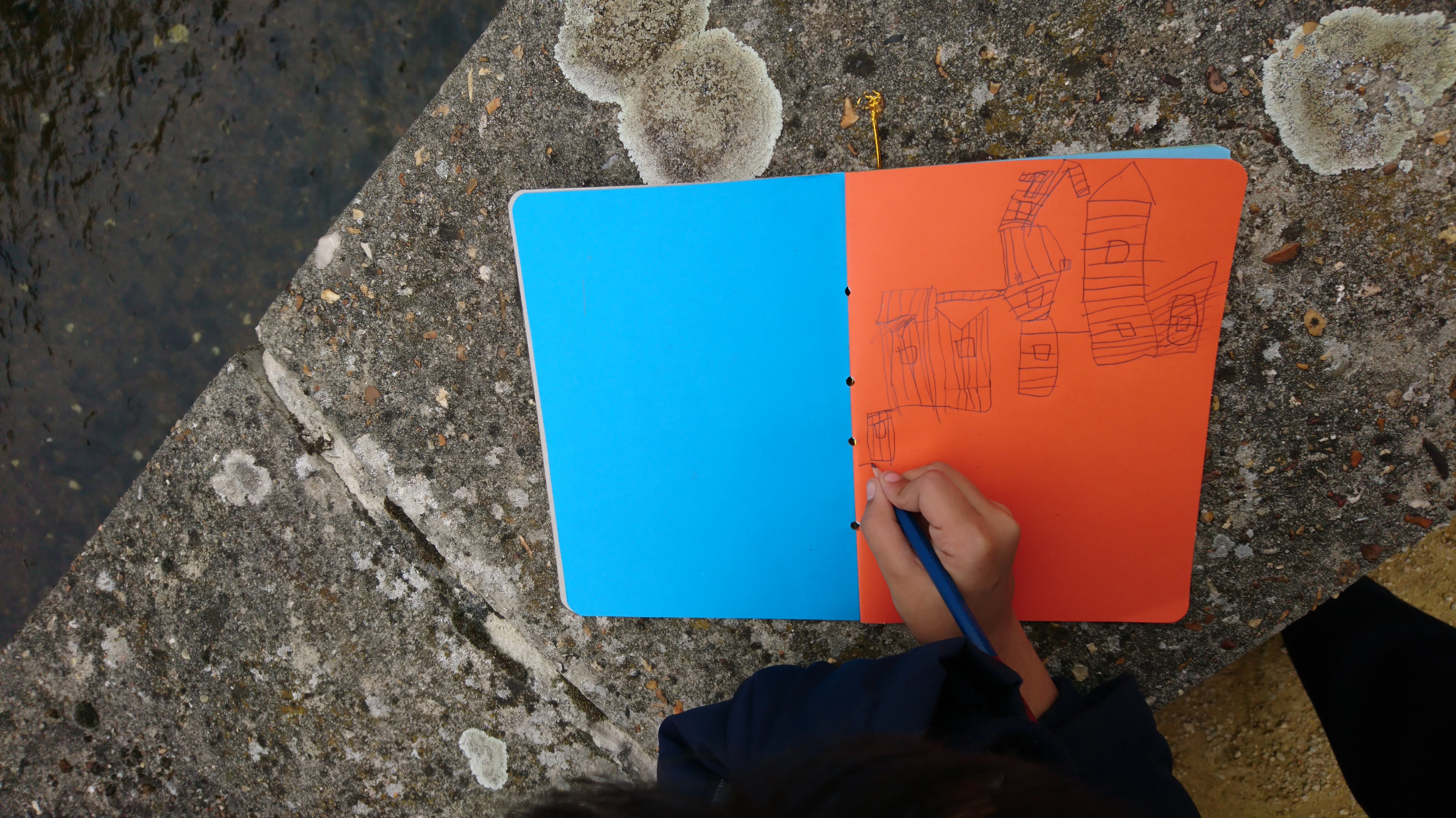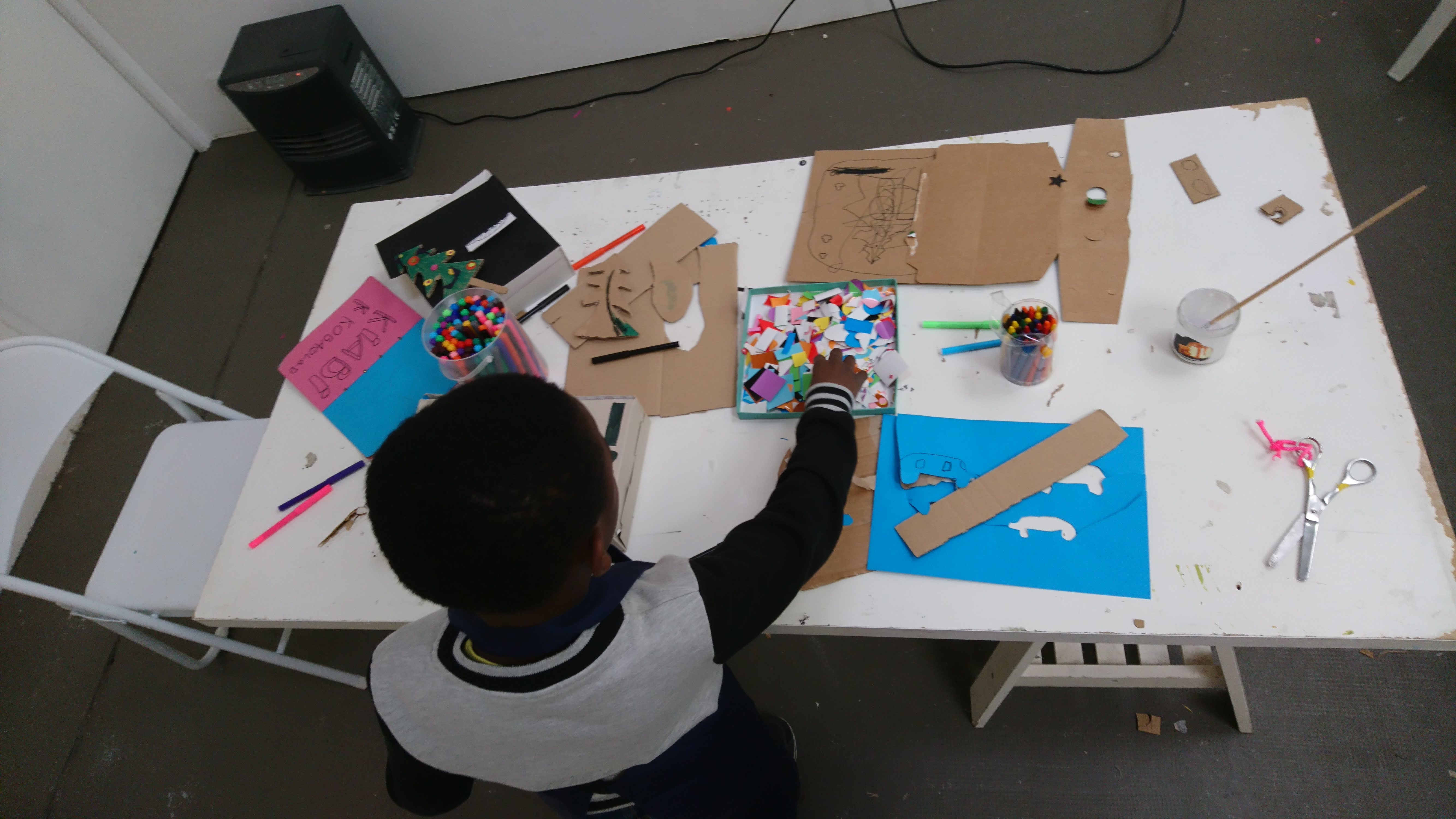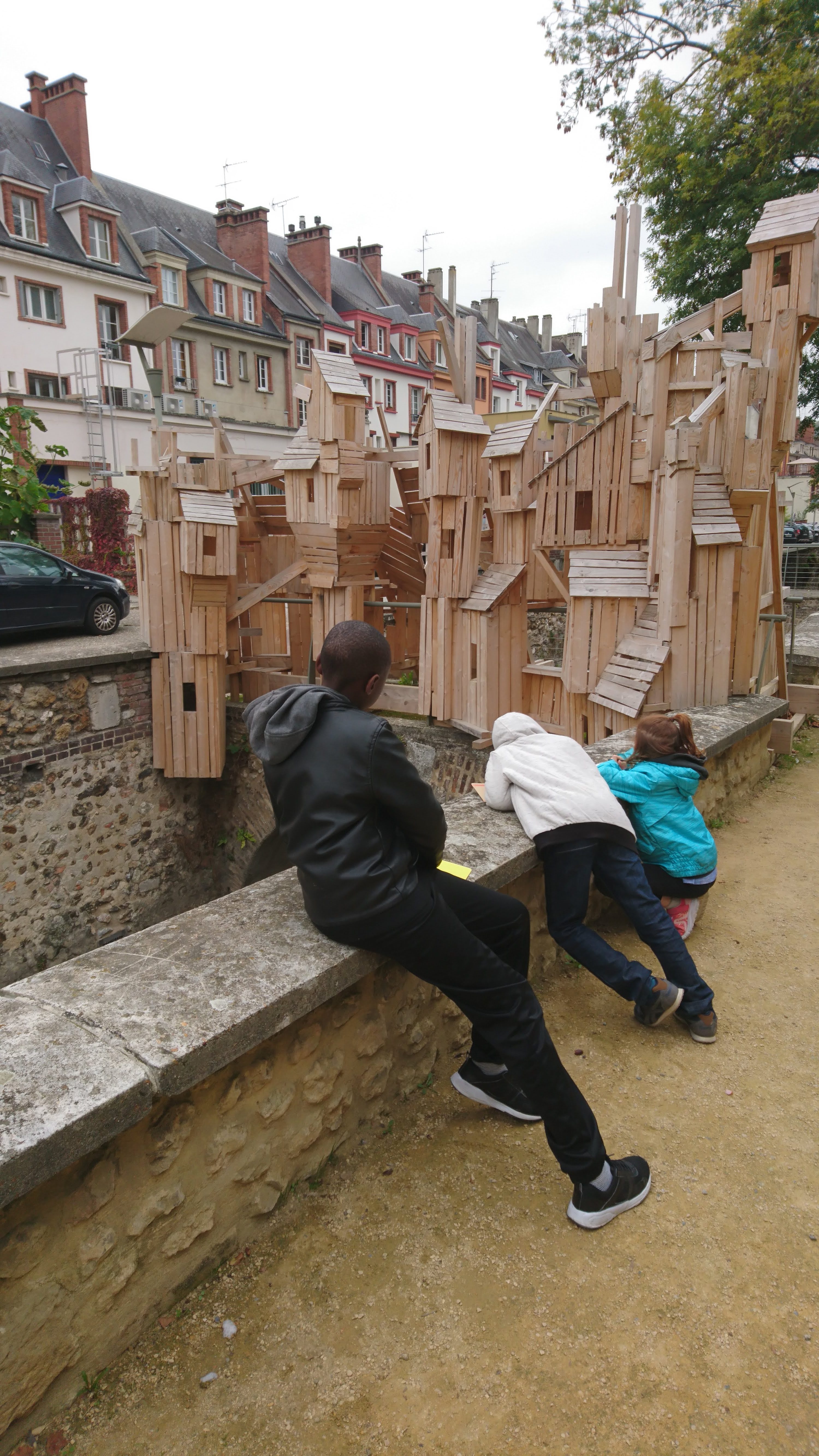 Les boîtes sont retournées côté gris, devenant ainsi le supports de création pour imaginer une multitude de petites maisons sur lesquelles sont coloriés et découpés des fenêtres, des portes, des toits. Ces boîtes sont ensuite assemblées et superposées les unes aux autres sur des supports afin de recréer des villes où grouillent différents habitats et abris imaginés par les enfants.