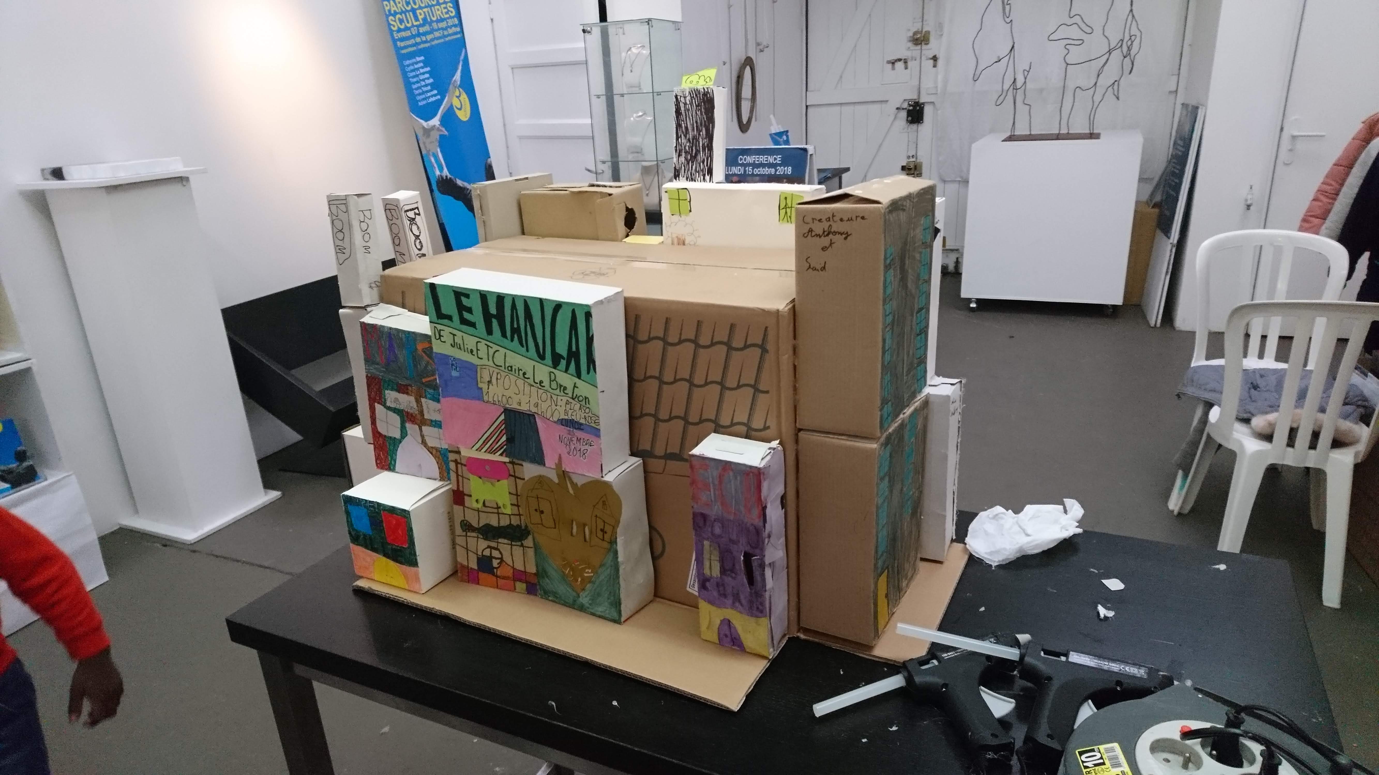 Création d’une installation collective à partir de cartons d’emballages alimentaires en s’inspirant de l’oeuvre de « Sur le pont / Sous le pont » de Thierry Gilotte et du thème de la maison et de l’habitat. Atelier réalisé les jeudi 25, vendredi 26, lundi 29 et mardi 30 octobre 2018.