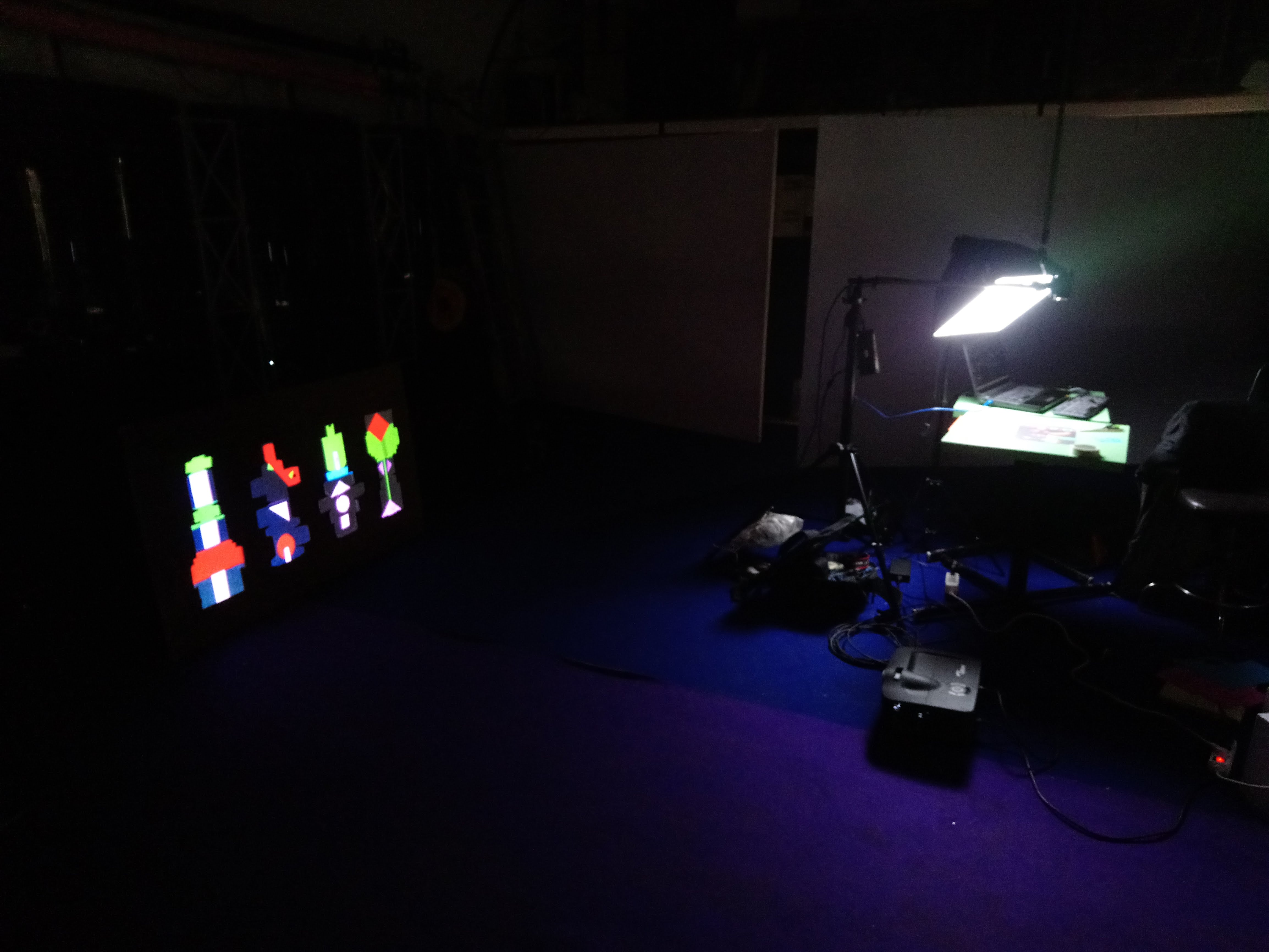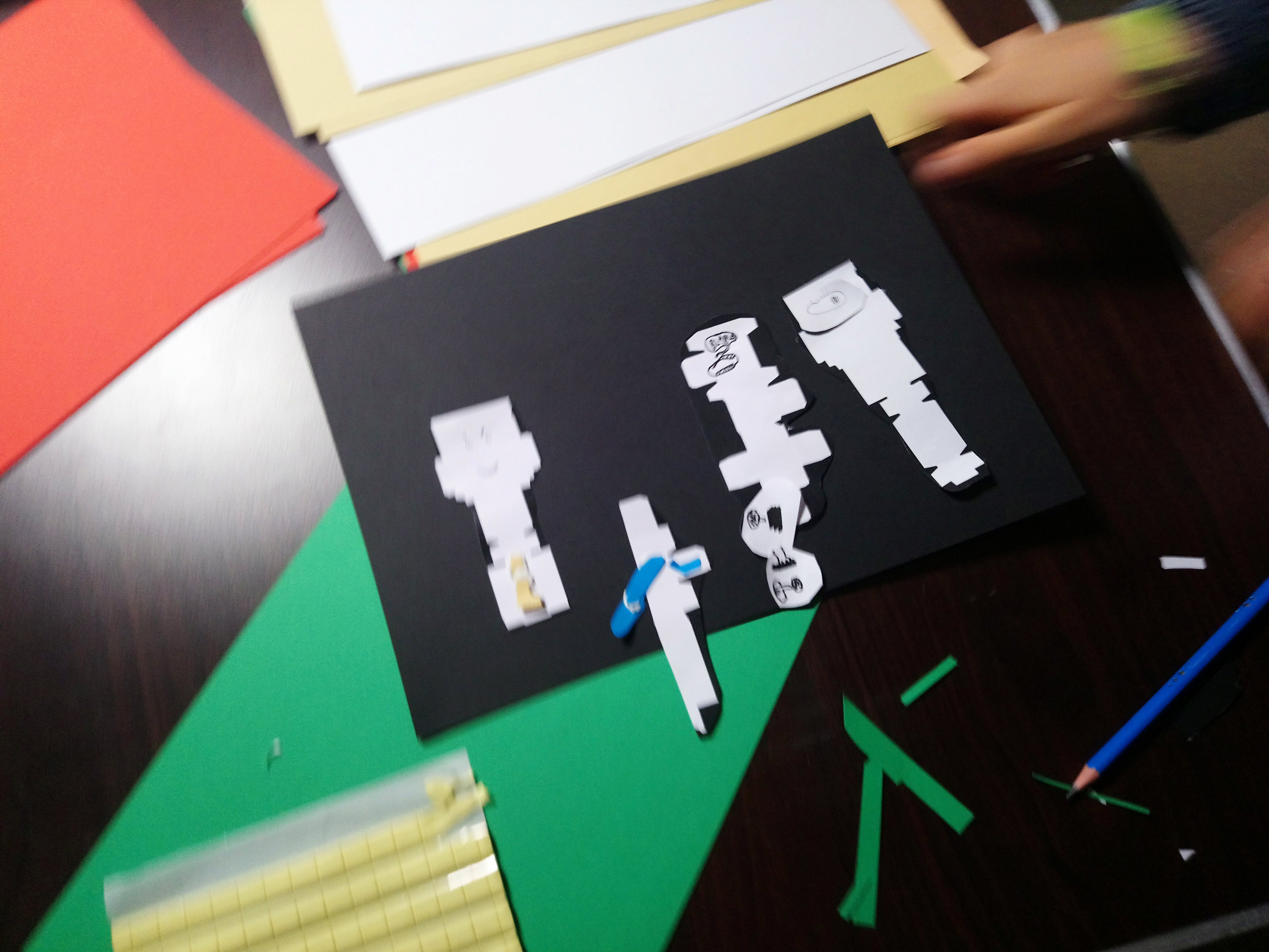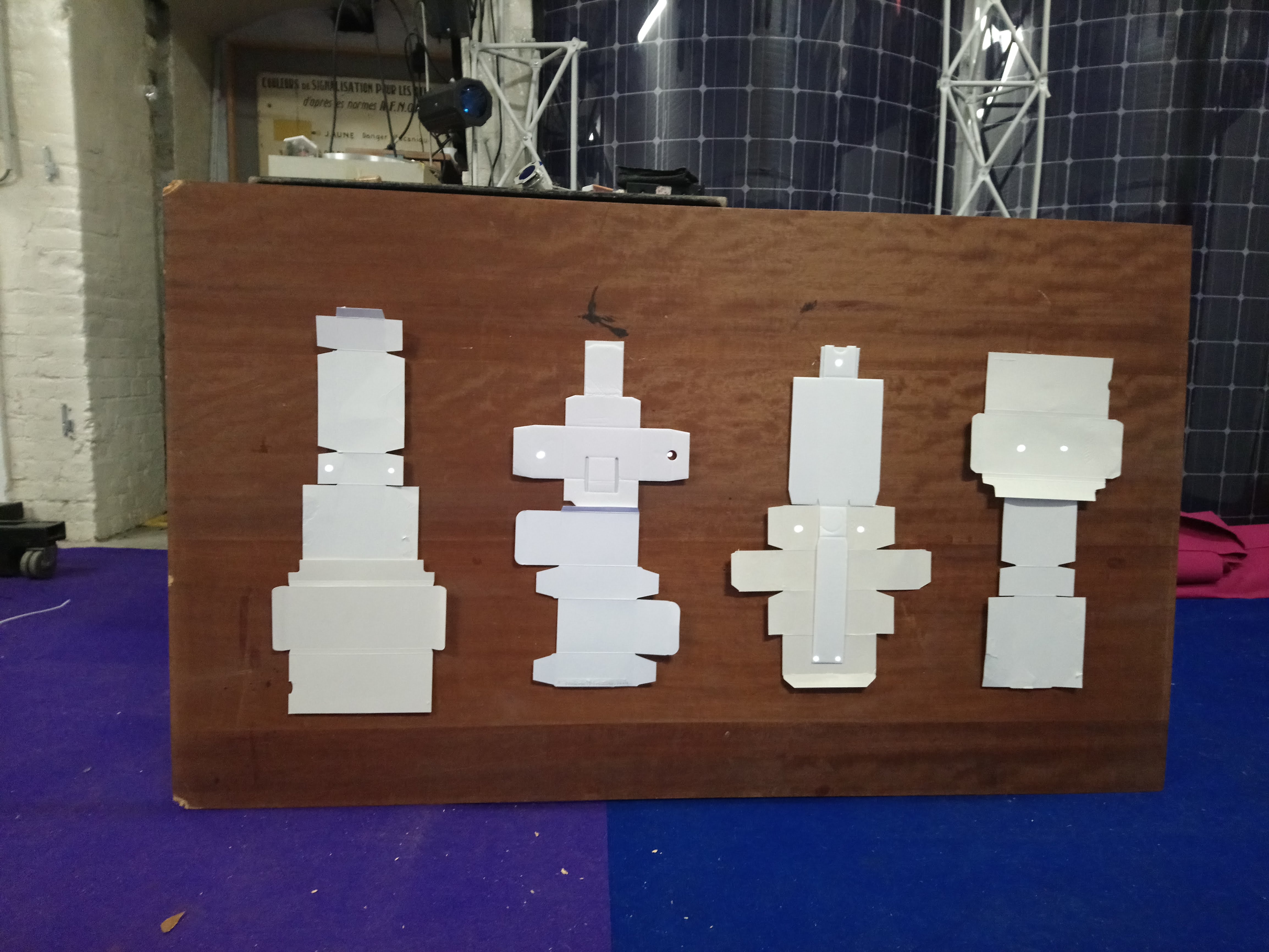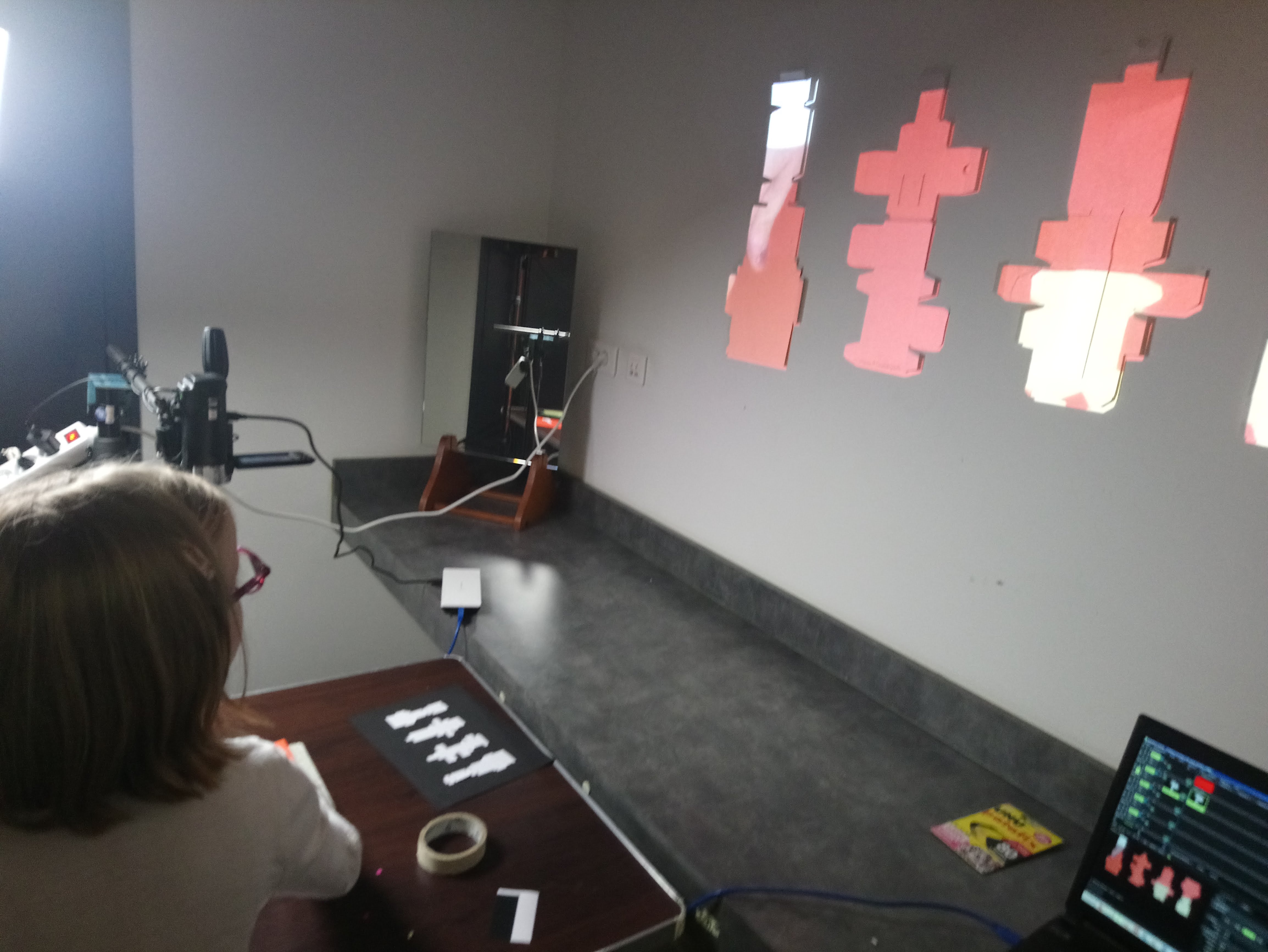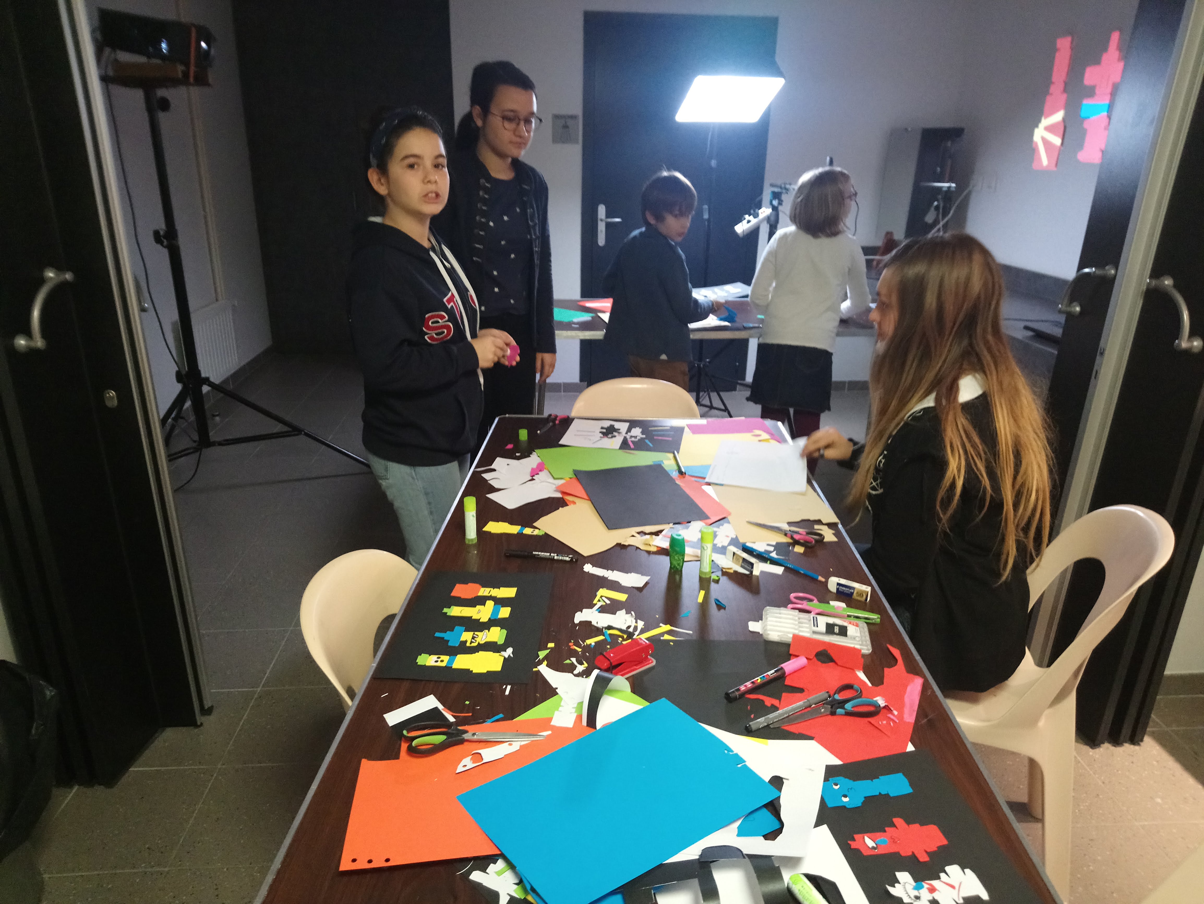 Les enfants ont réalisé des images à partir d’un gabarit en papier découpé. Chacune de ces images est pensée pour être animée. Avec les techniques du stop-motion et de la video-projection, leurs productions ont ensuite été projetées sur des totems en cartons alimentaires retournés.