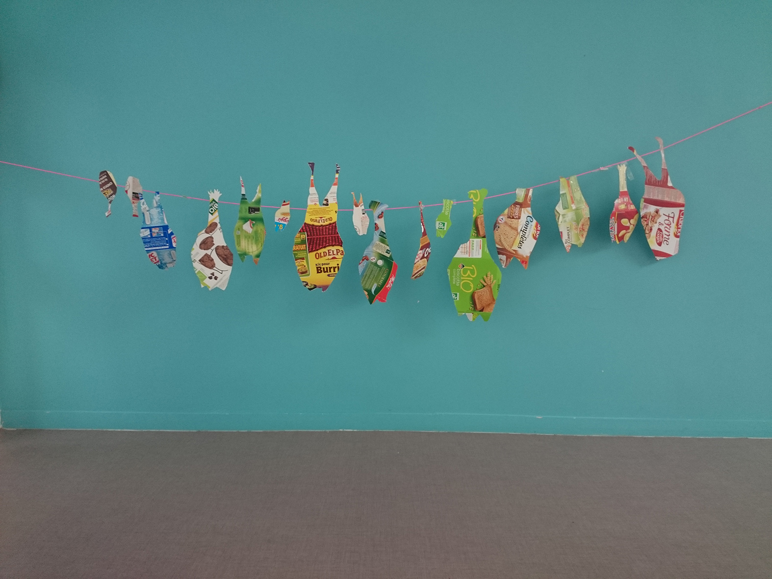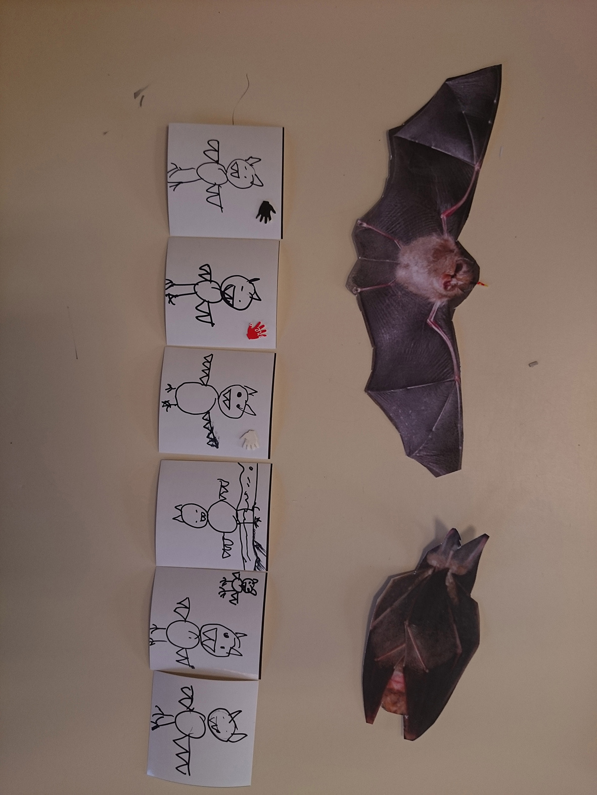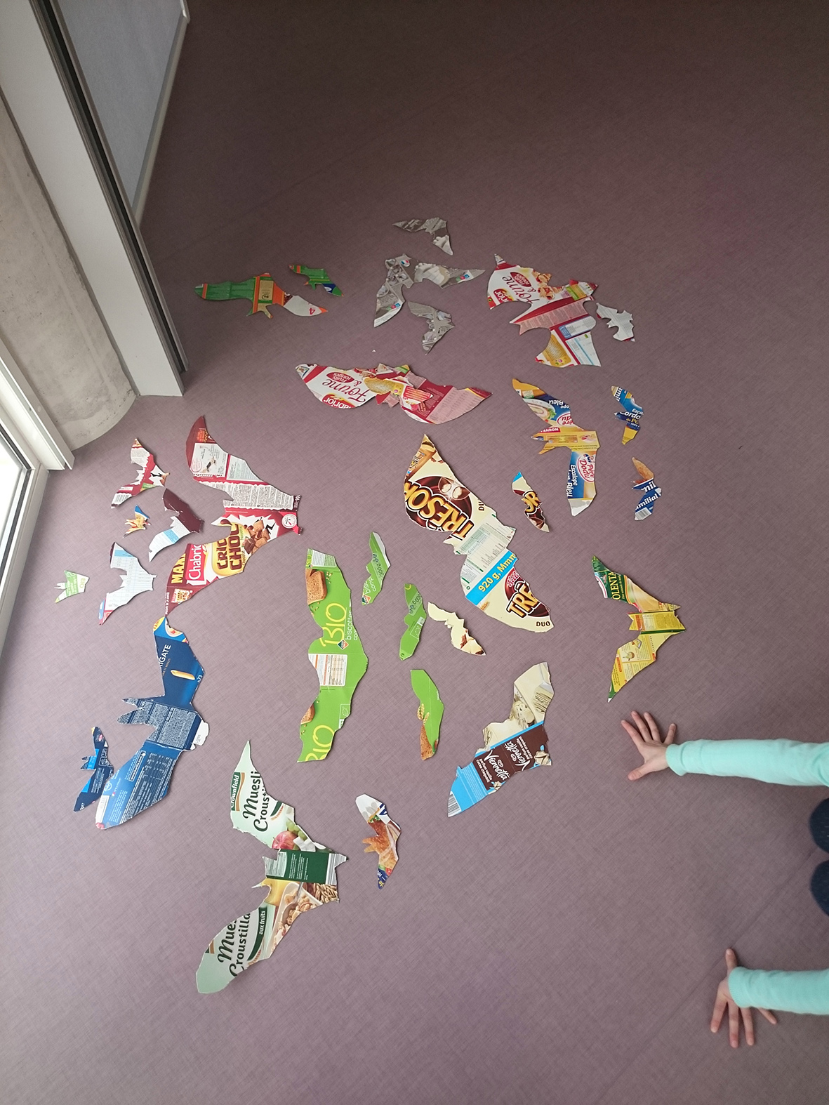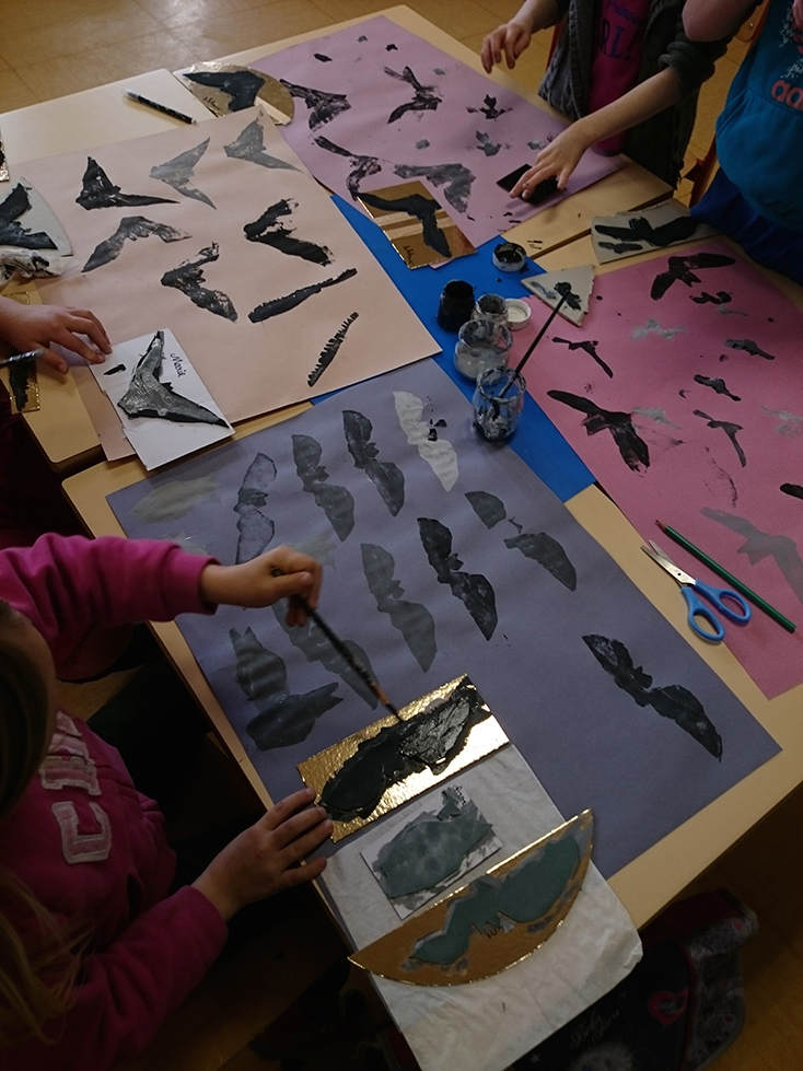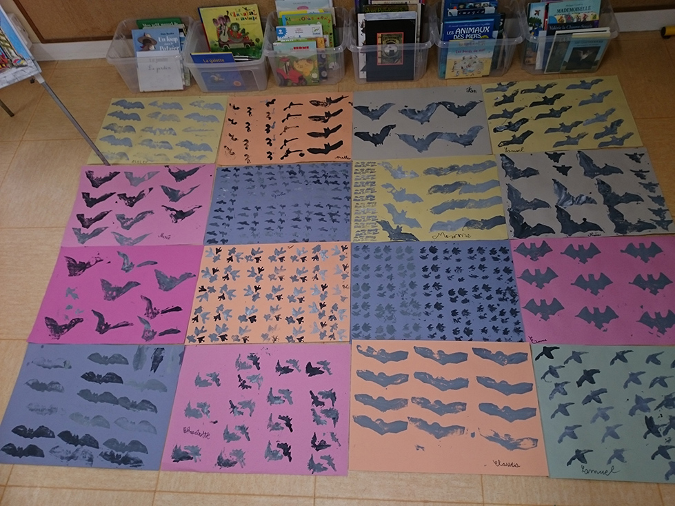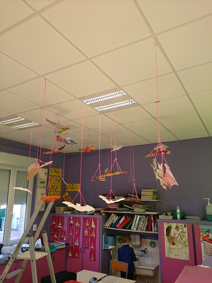 Réalisation de volumes à suspendre en reprenant la forme très caractéristique des ailes de chauves-souris (à partir d’images réalisées par Léonard de Vinci). L’idée était de reprendre les notions déployées dans le spectacle Chauve souris d’André Mandarino : l’aérien, l’envol, la suspension, par l’utilisation du décalage, découpage, pliage. Le résultat a été installé ensuite dans un endroit de l’école telle une constellation d’une cinquantaine de formes ailées.