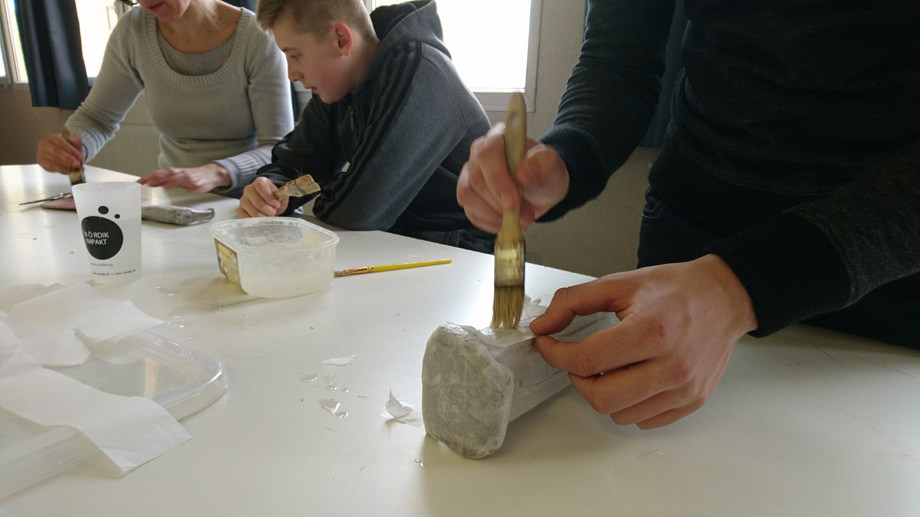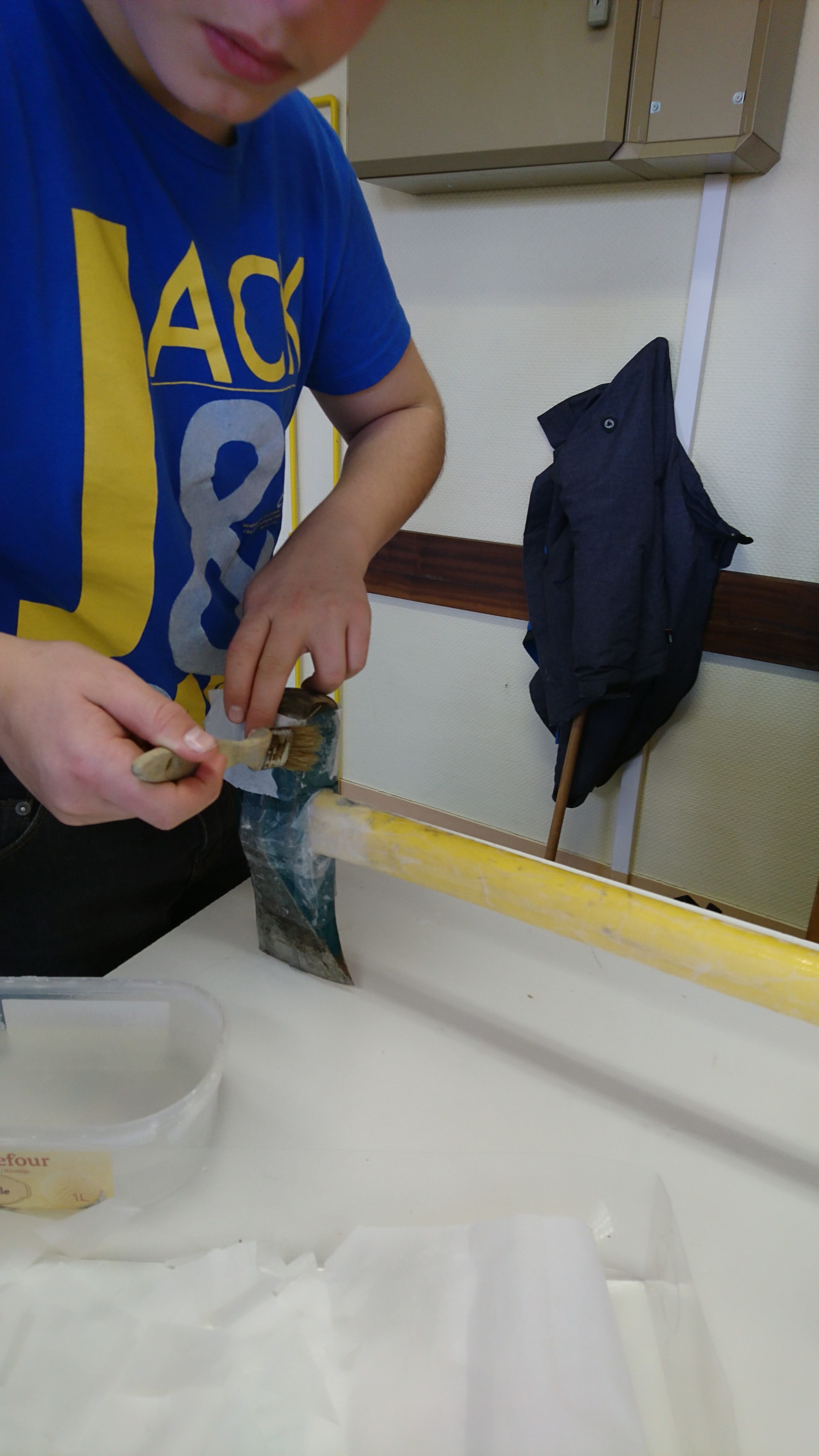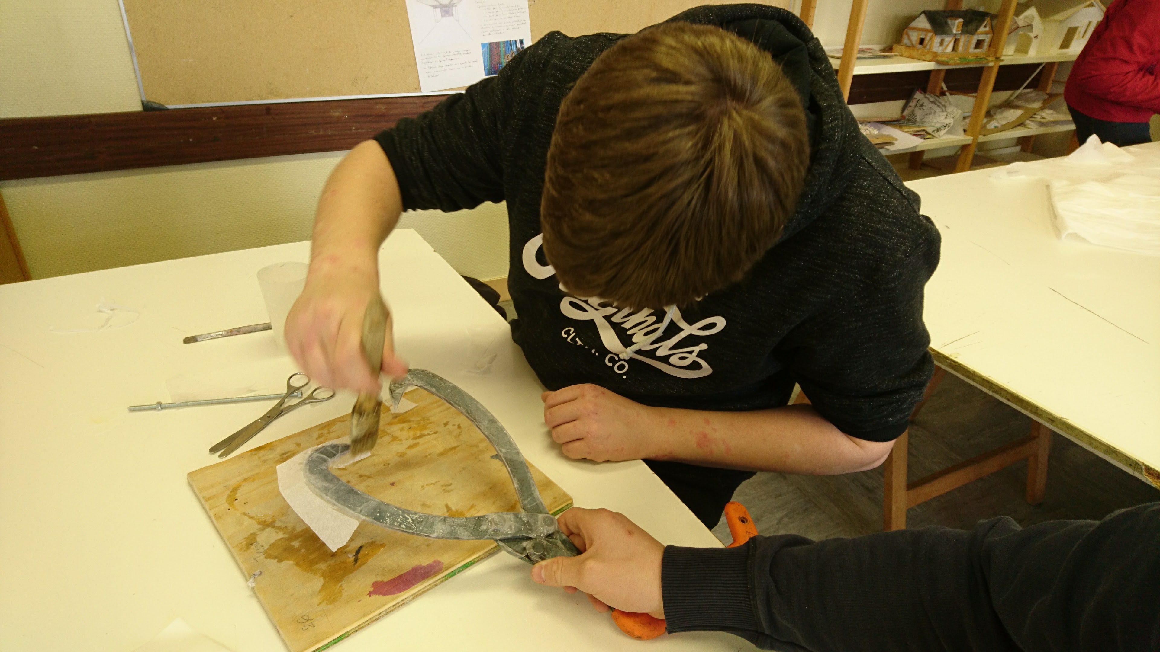 Les secondes expérimentent de nouvelles matières et de nouvelles formes à partir d’emballages alimentaires en carton. L’objectif est de tester des cartons broyés, d’expérimenter des colles, et des assemblages basés sur la répétition d’un motif.