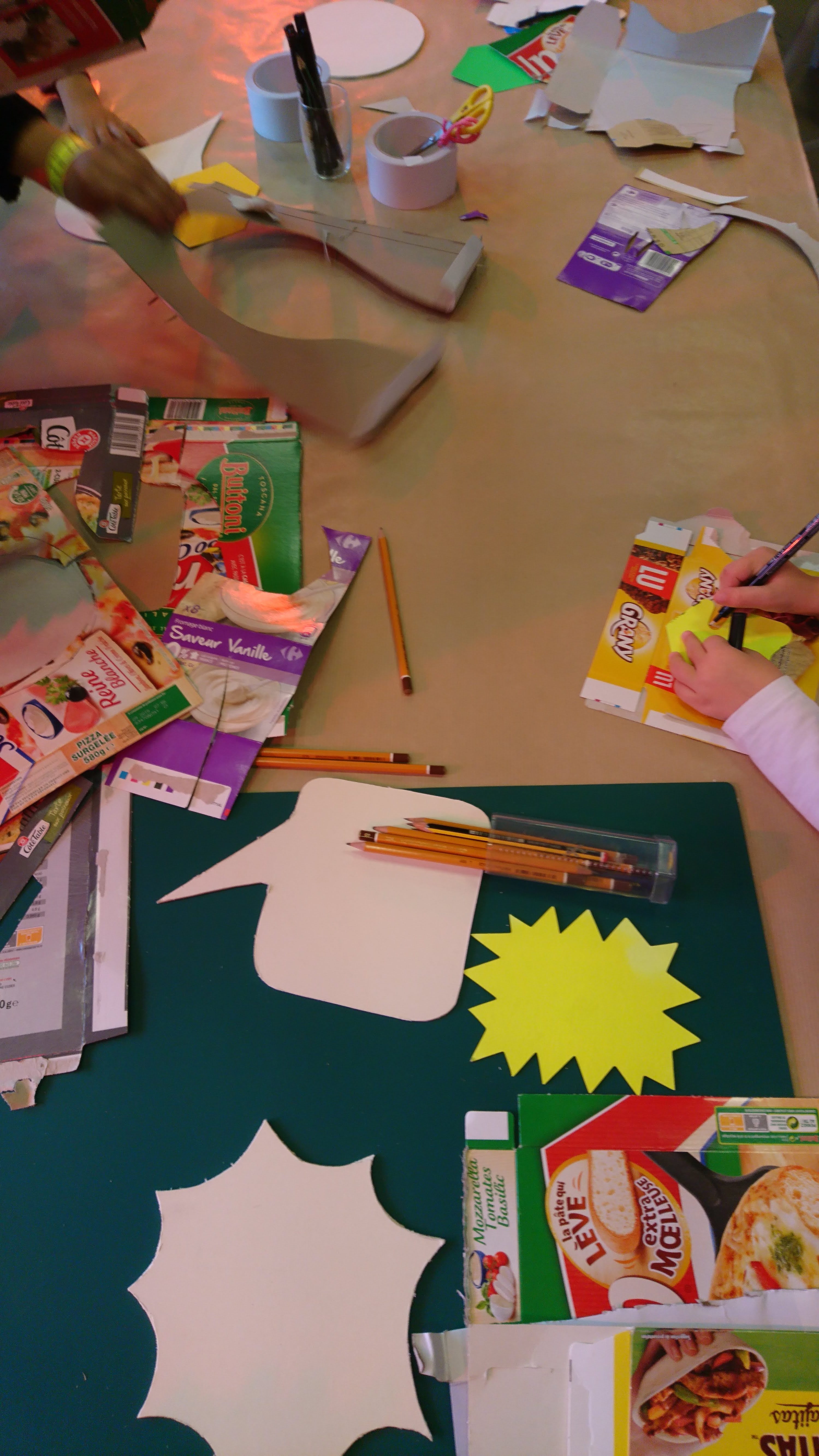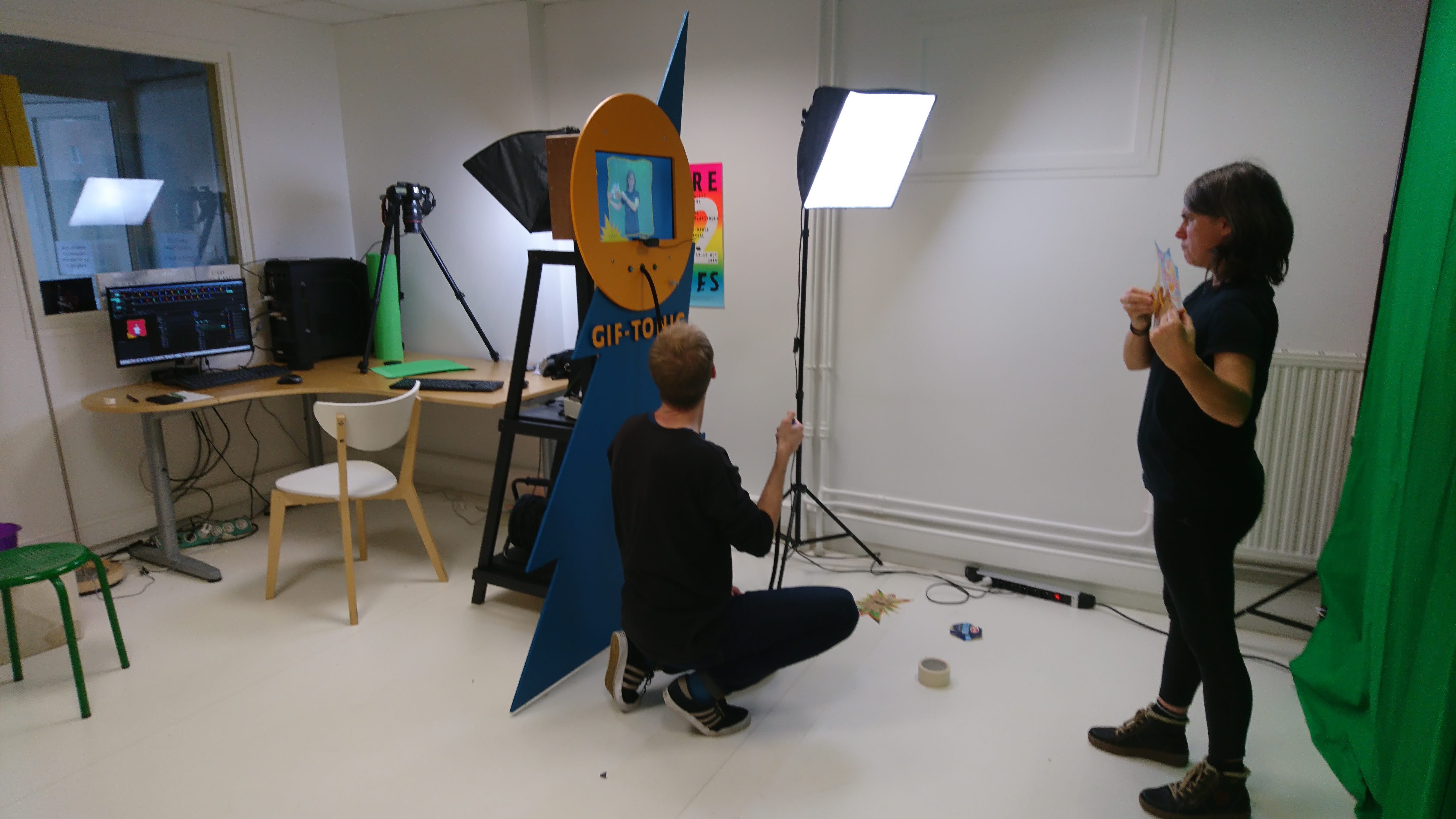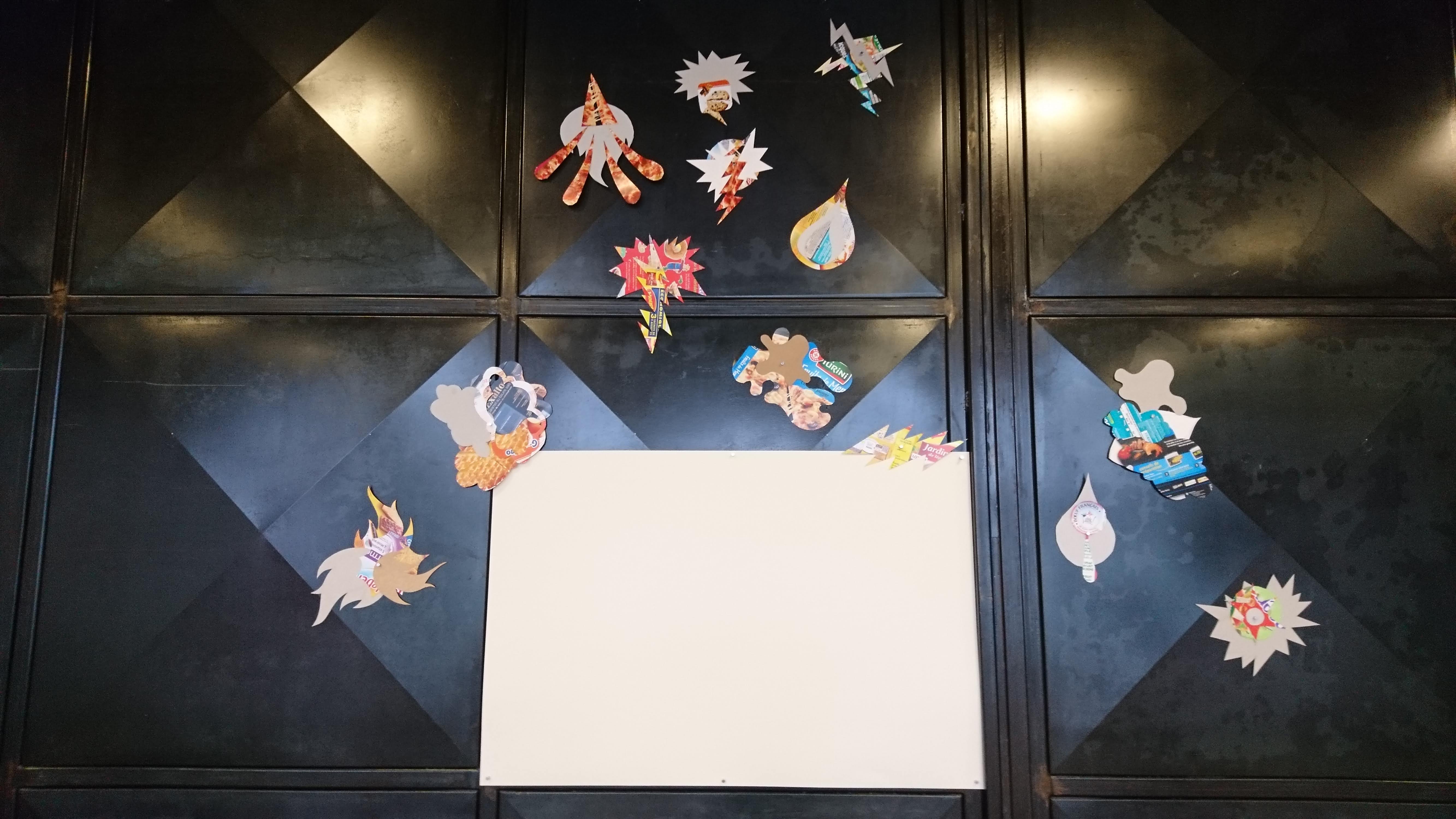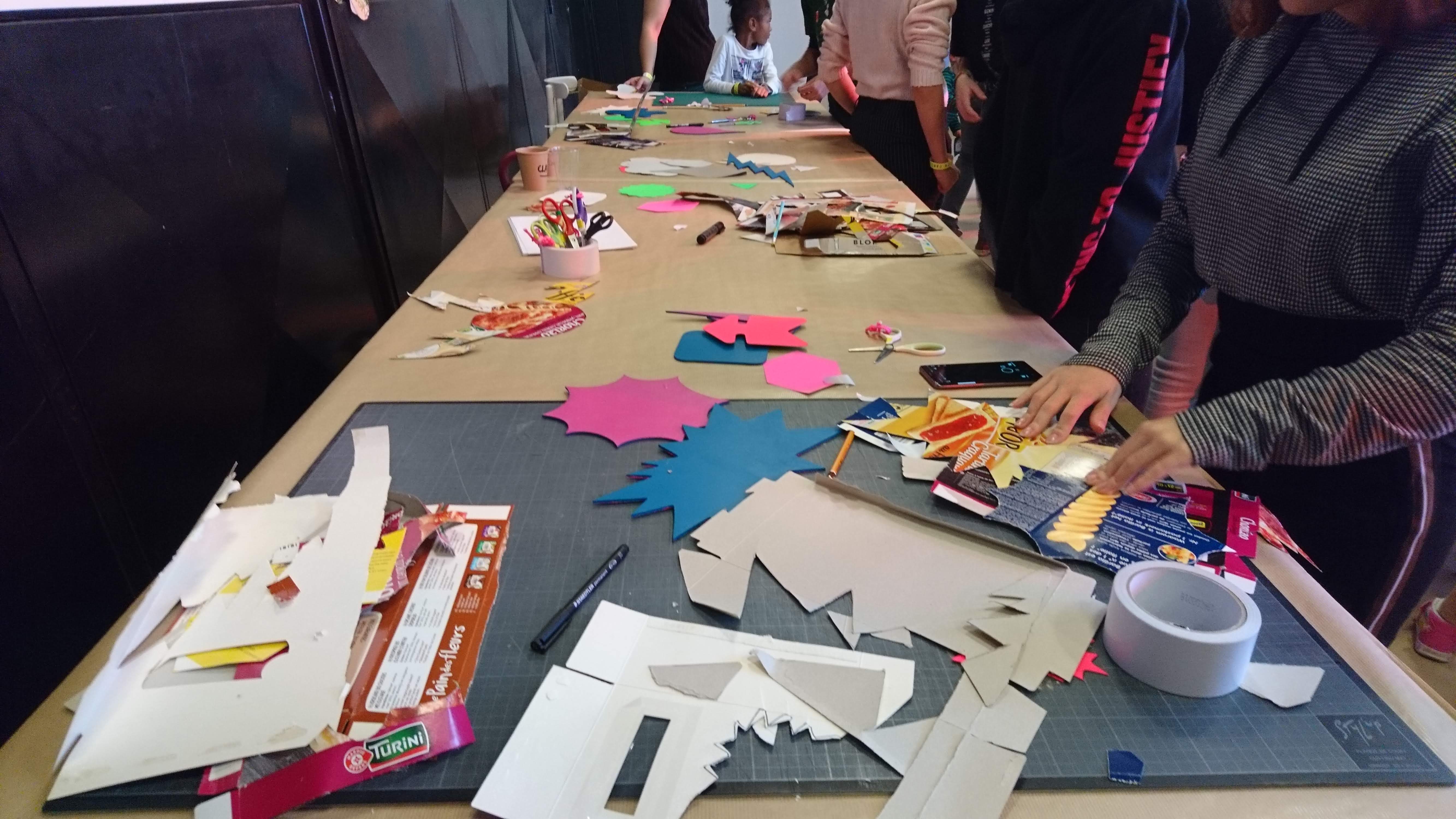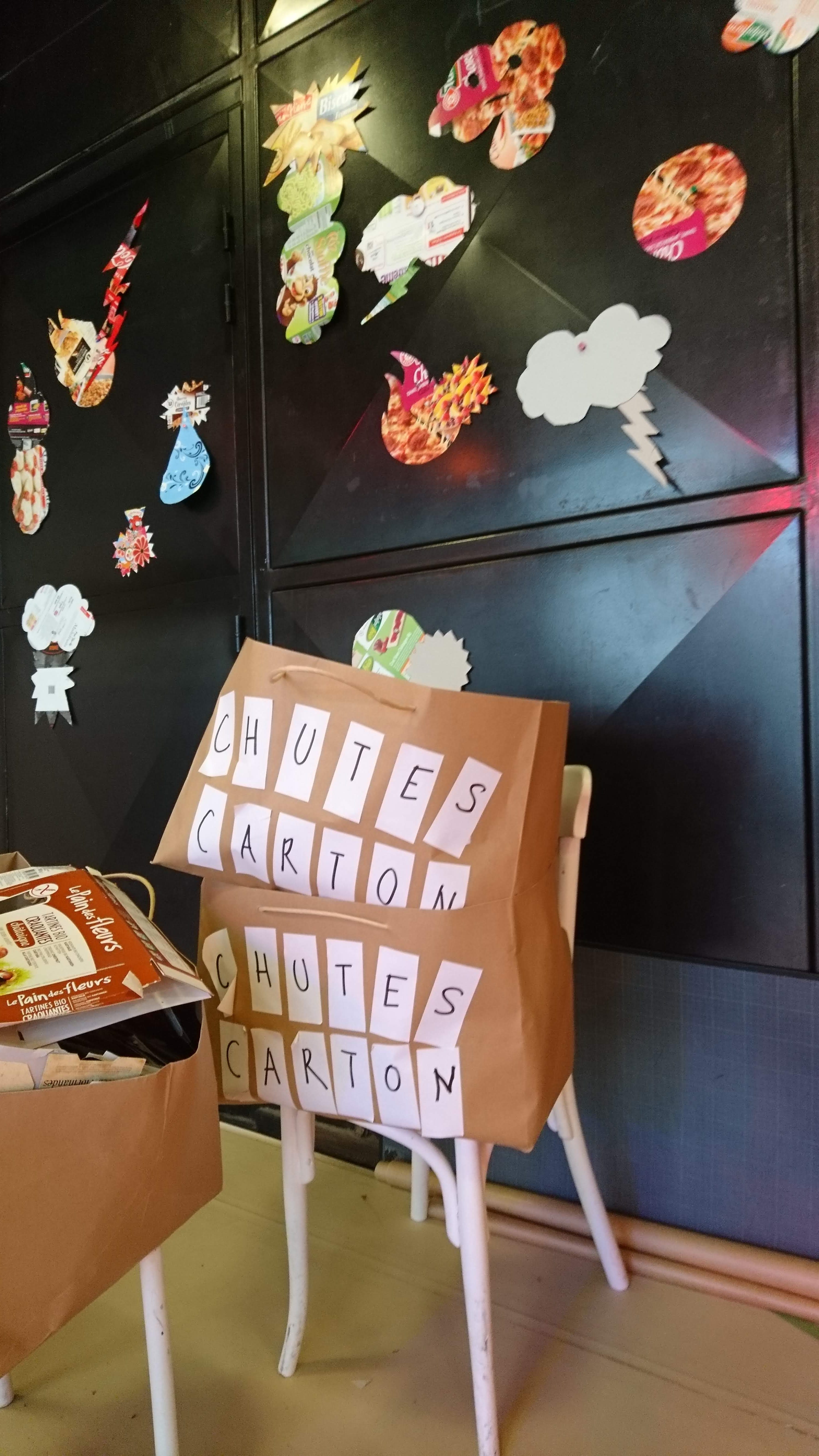 Faisant appel à l’onomatopée (= expression graphique évoquant des sons utiliser dans la BD), ils proposaient de créer un décor de fond avec des cartons d’emballage alimentaire, agrandis et incrustés au fond de l’image dans le dispositif ‘Gif Tonic’ et tenter d’interpréter un « son » avec le corps et des formes d’onomatopées en carton).