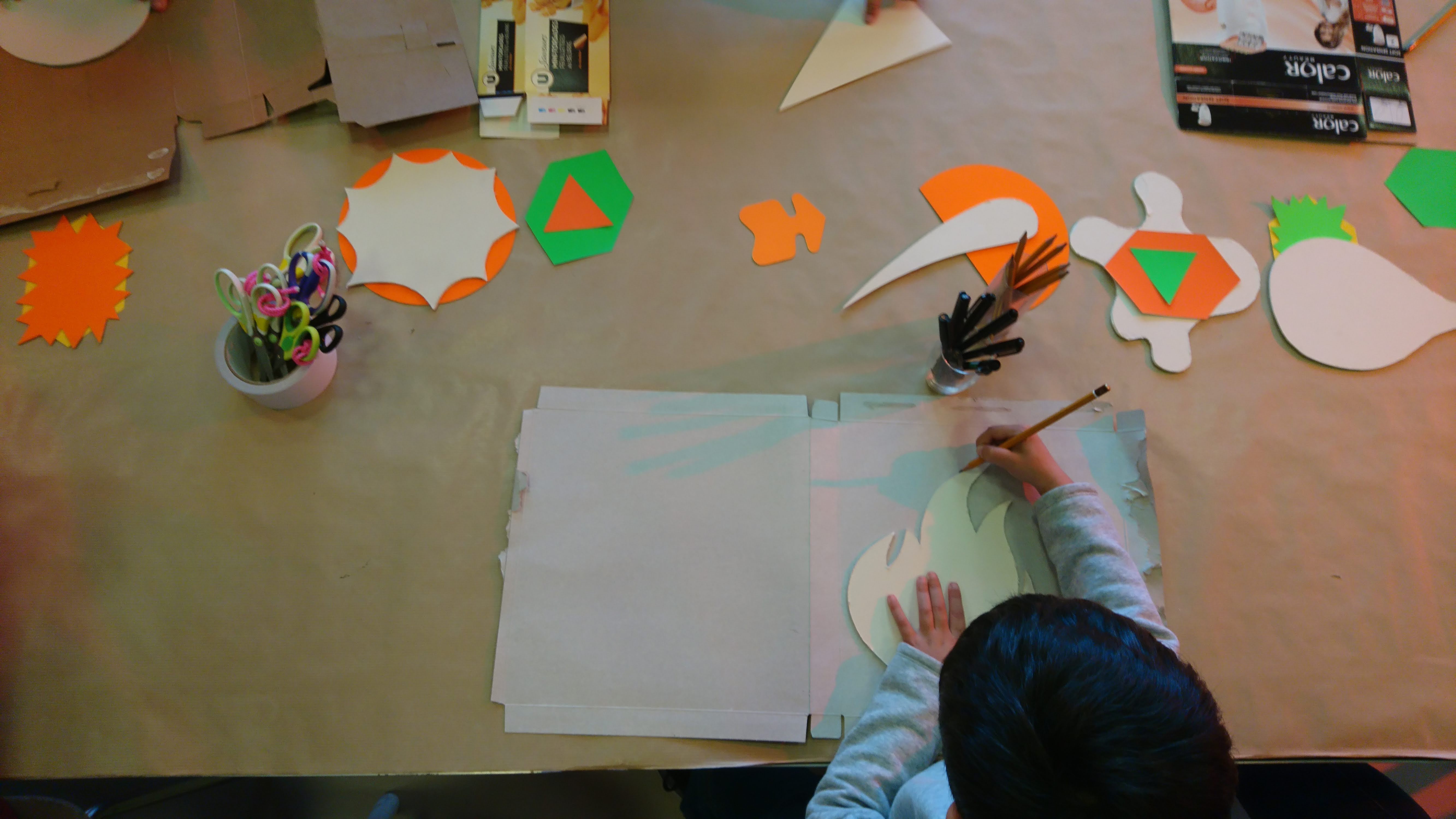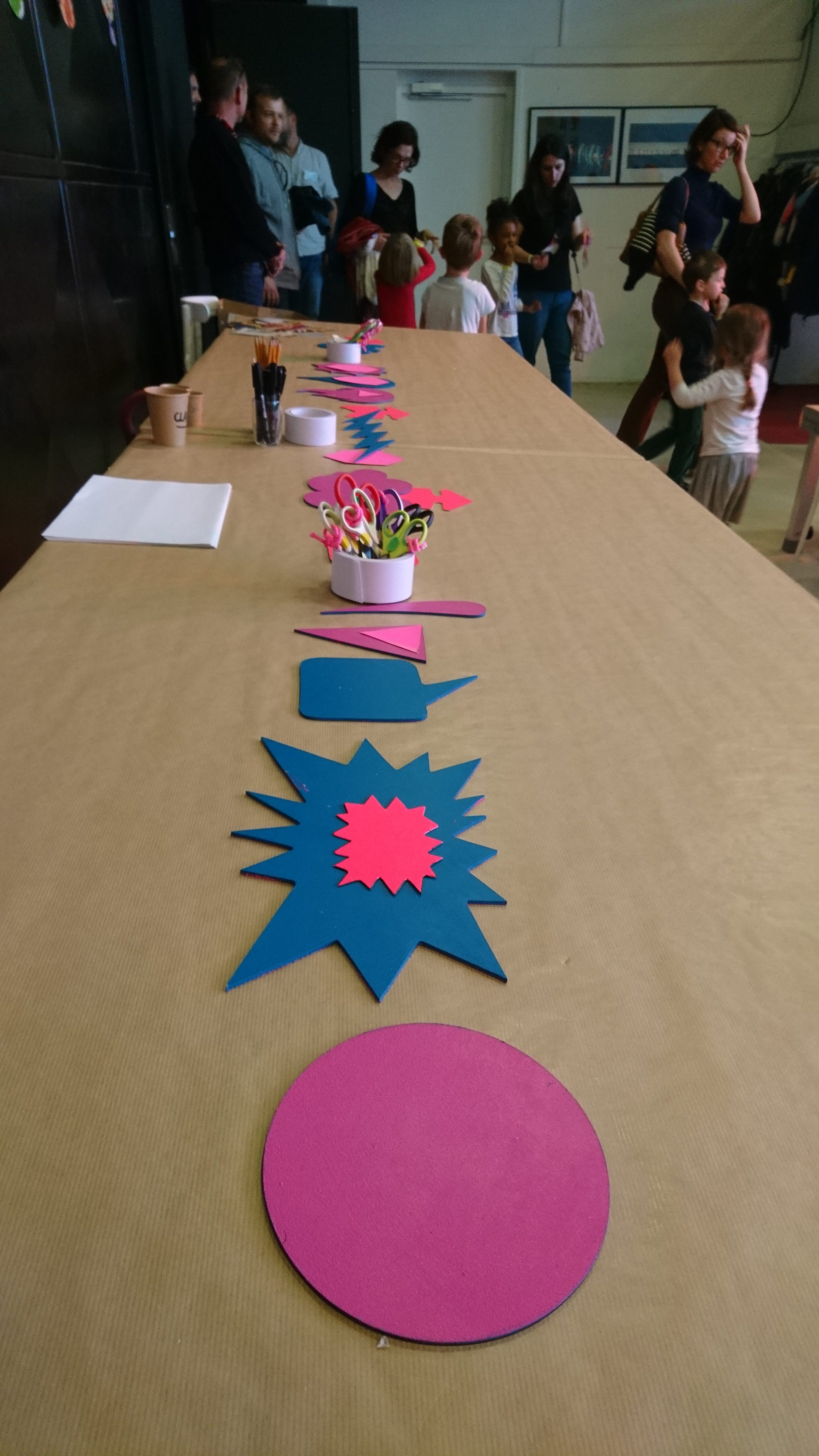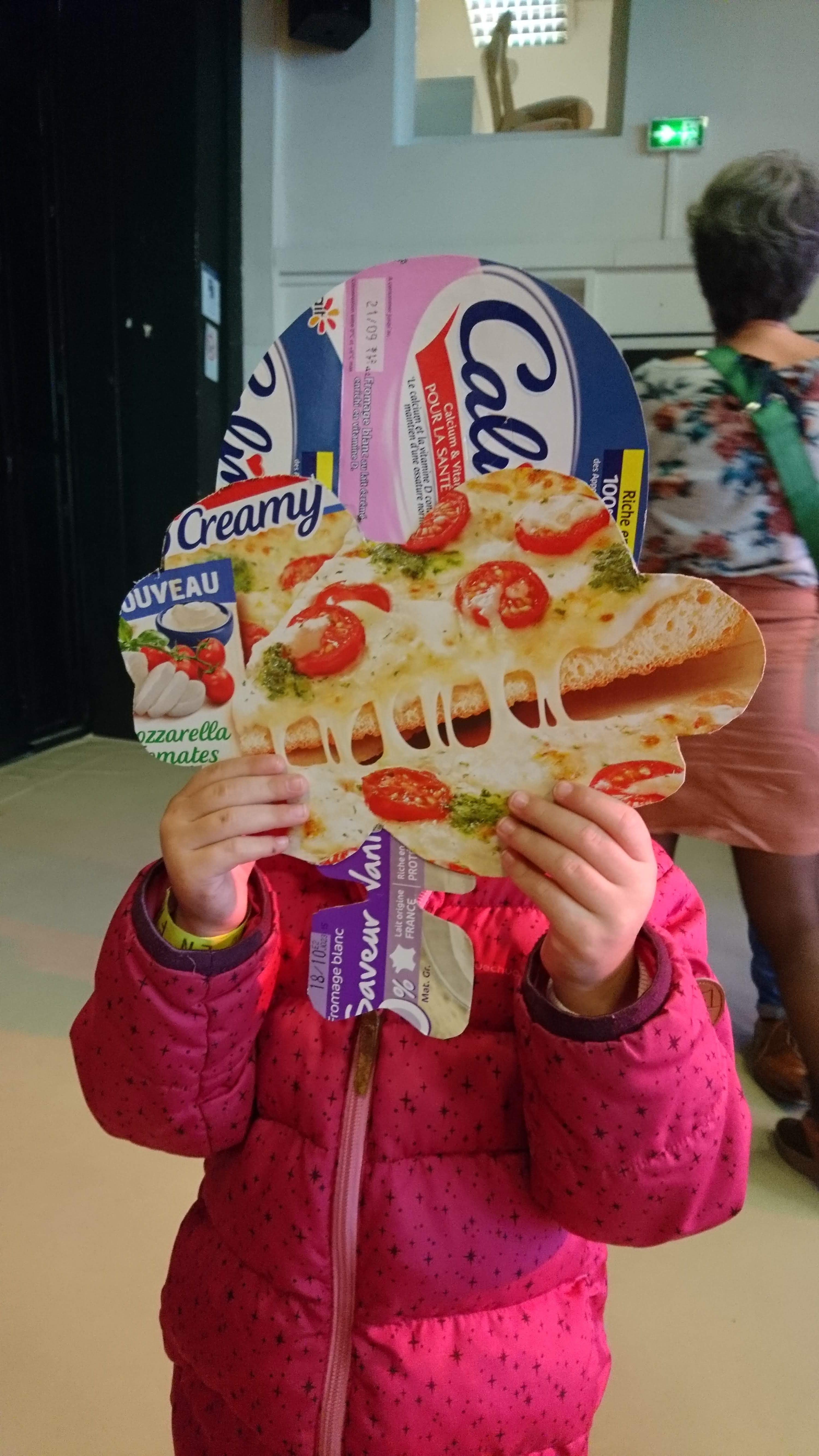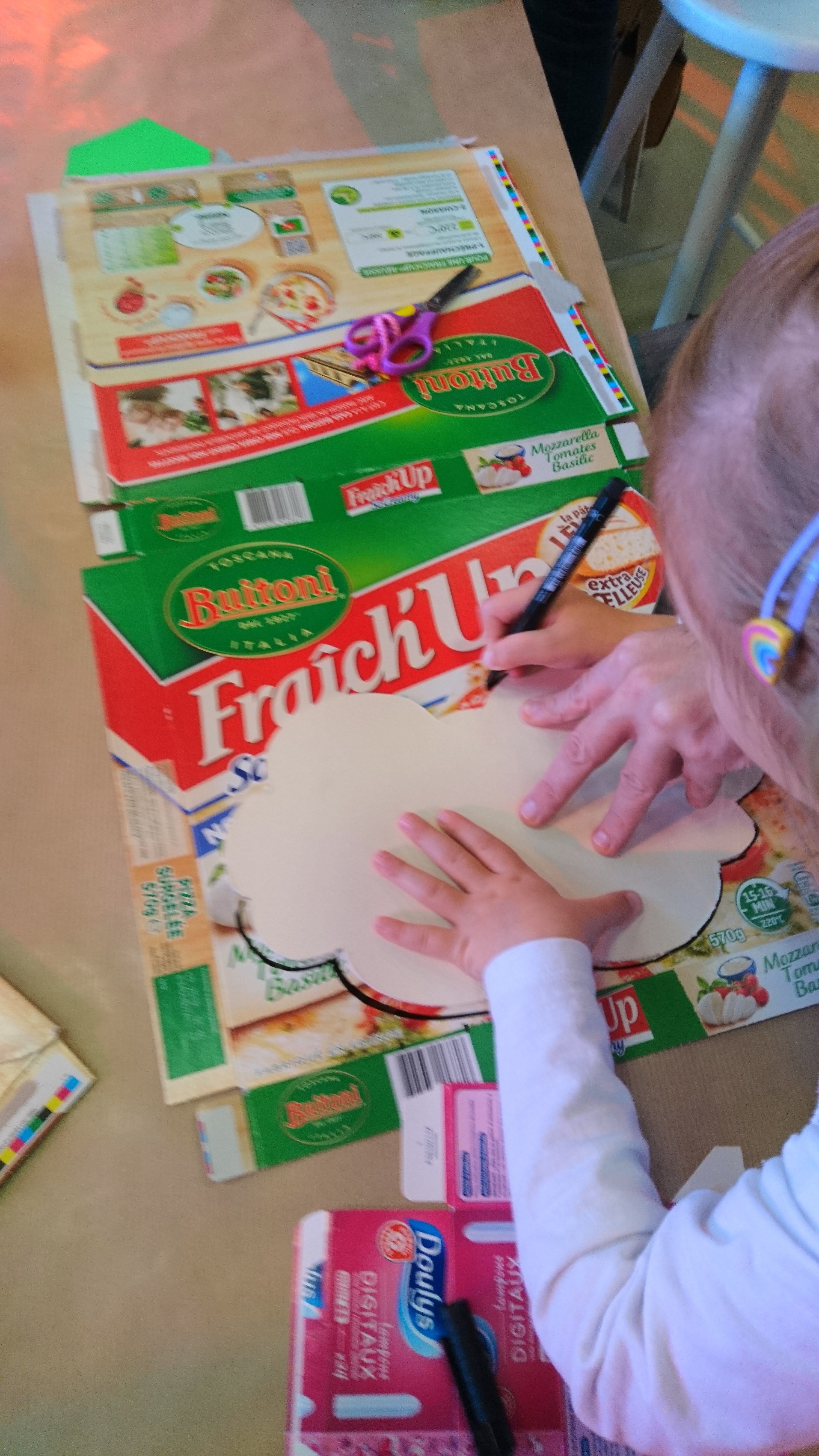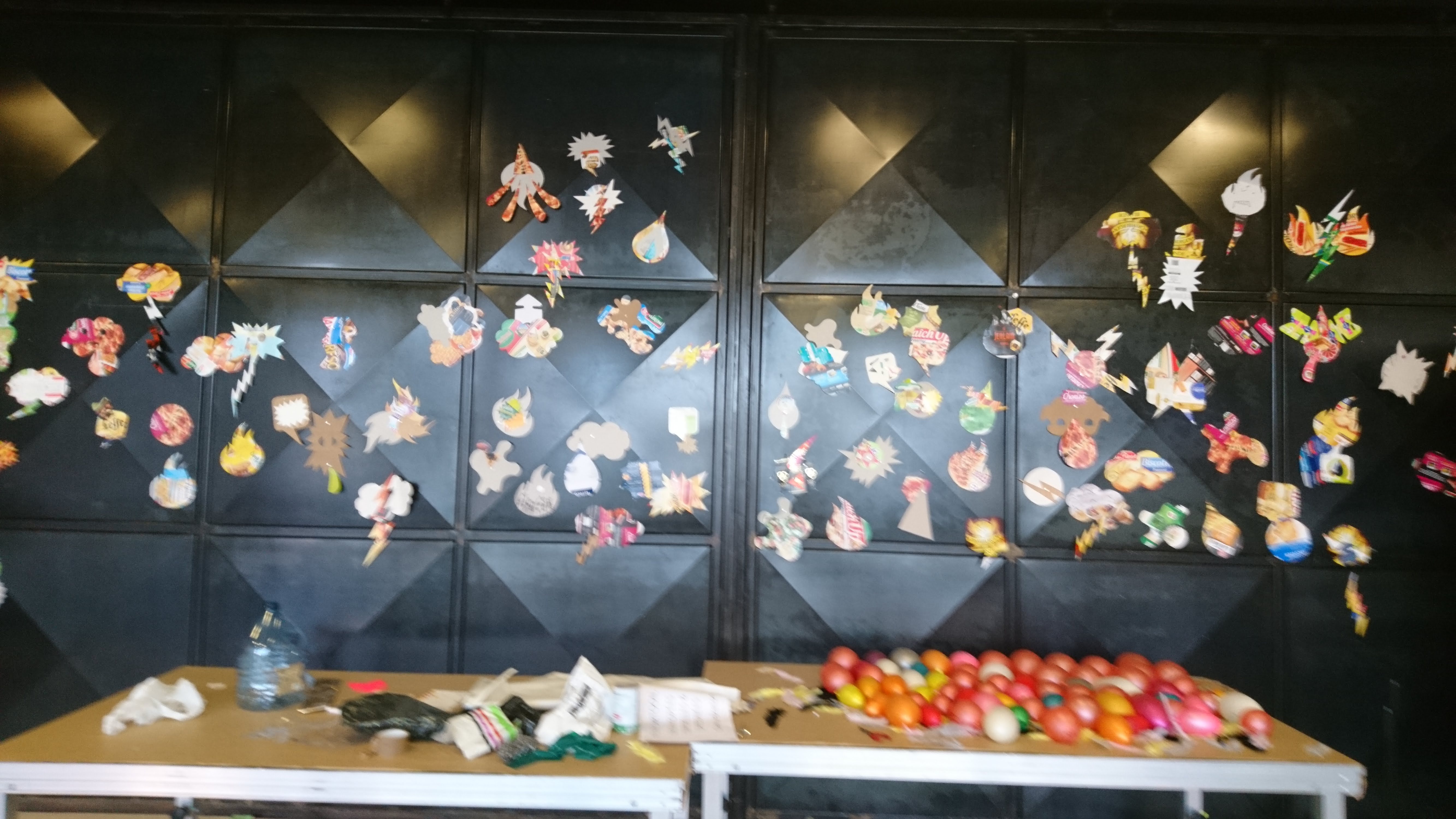 Faisant appel à l’onomatopée (= expression graphique évoquant des sons utiliser dans la BD), ils proposaient de créer un décor de fond avec des cartons d’emballage alimentaire, agrandis et incrustés au fond de l’image dans le dispositif ‘Gif Tonic’ et tenter d’interpréter un « son » avec le corps et des formes d’onomatopées en carton).