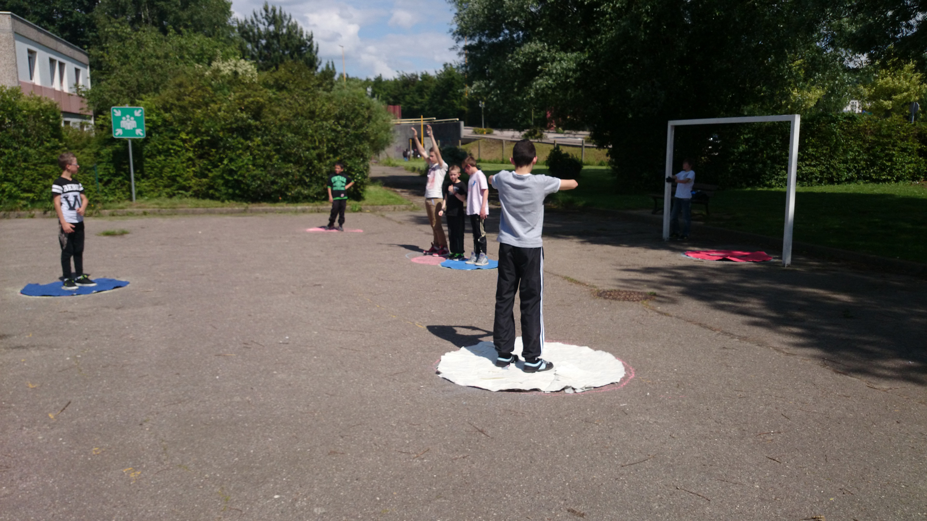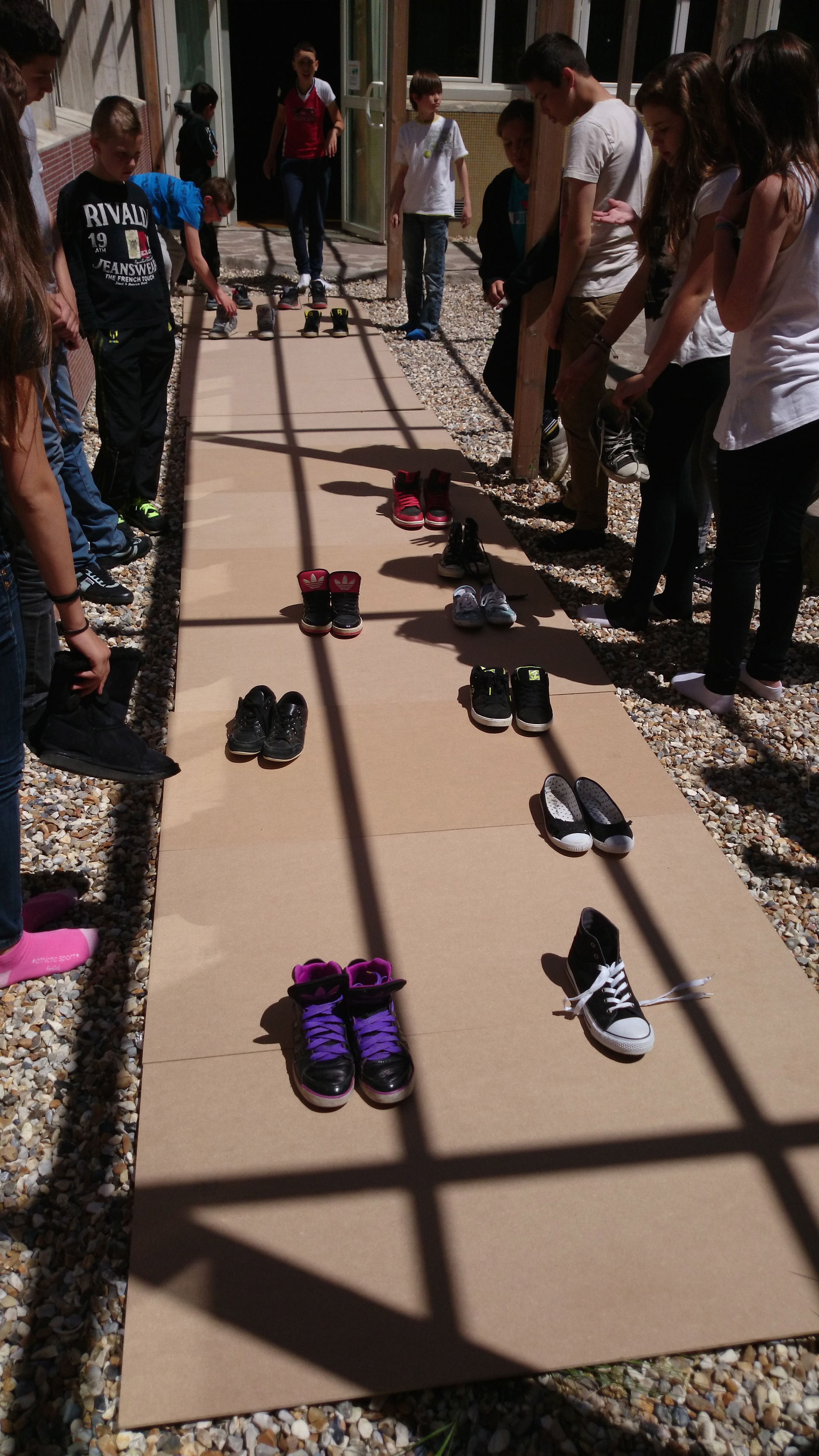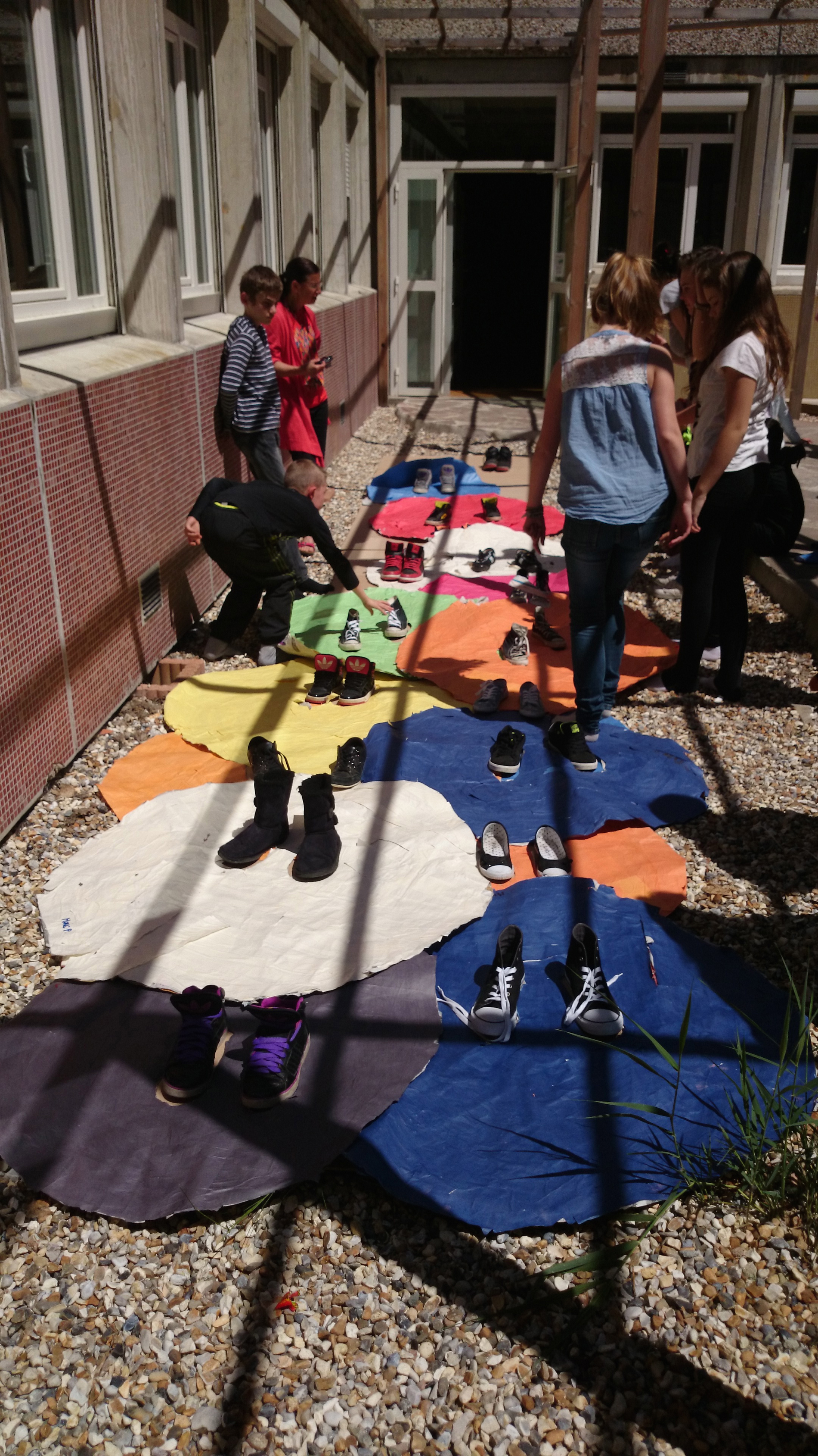 Dans un lieu sans mobilier : Chaque élève avec un feutre indélébile dessine au sol (sur bâche plastique) son propre ‘état physique de limite’. Deux contraintes : avoir les deux pieds fixes au sol et ne pas empiété sur l’espace des autres.
