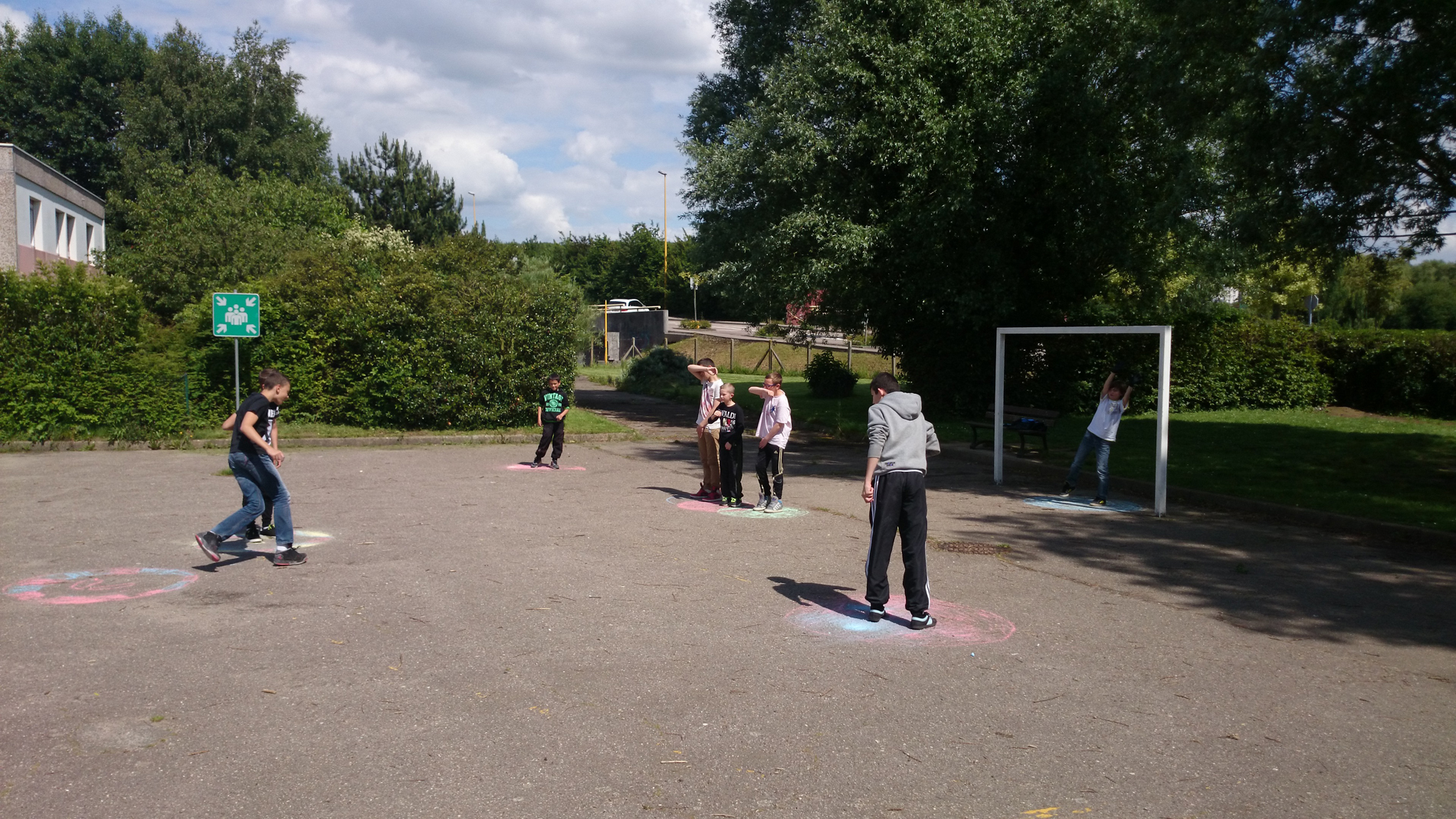 Réflexion sur situations dans le quotidien ou les deux pieds fixes sont au sol, puis dans l’espace de la cour