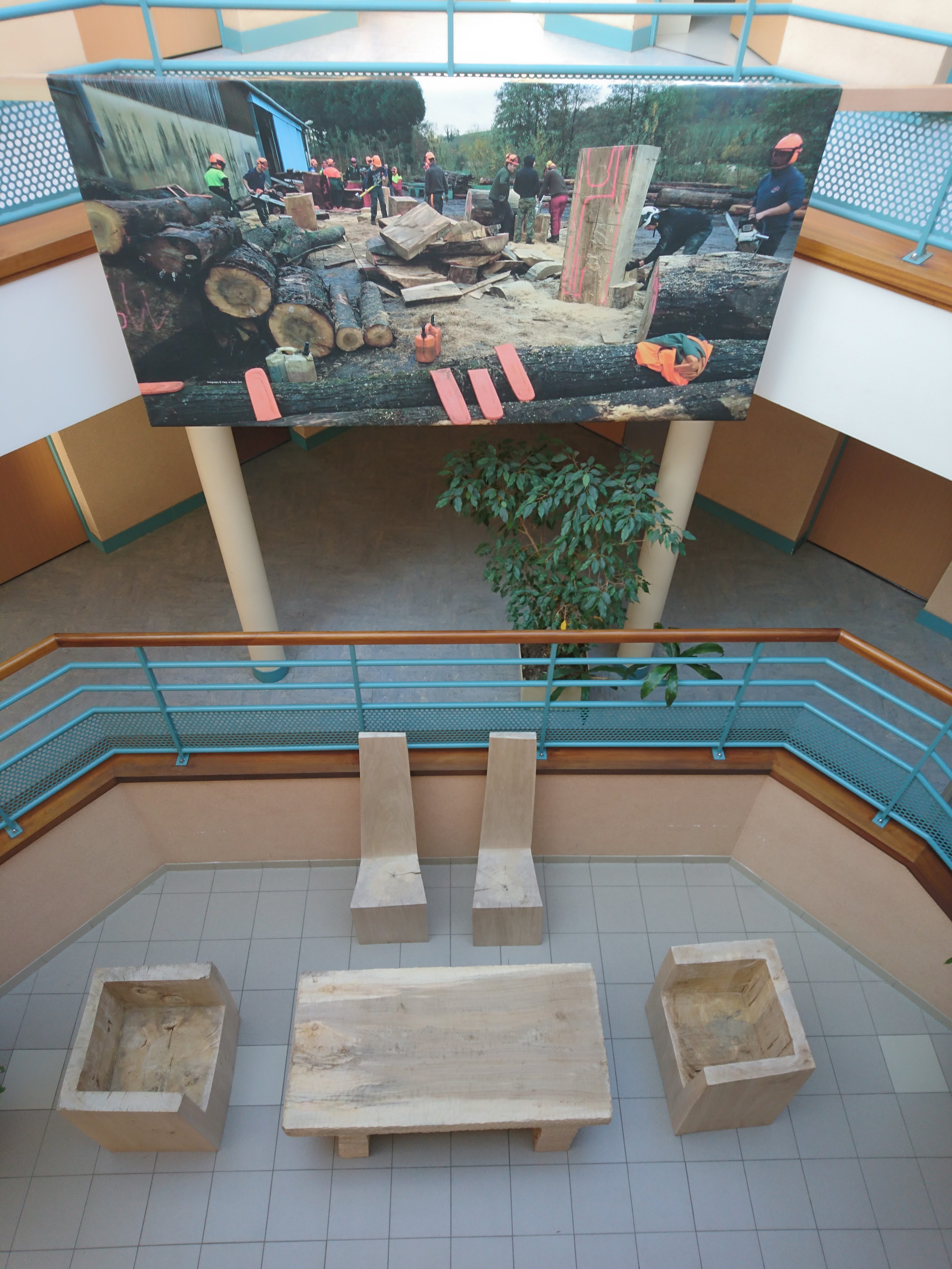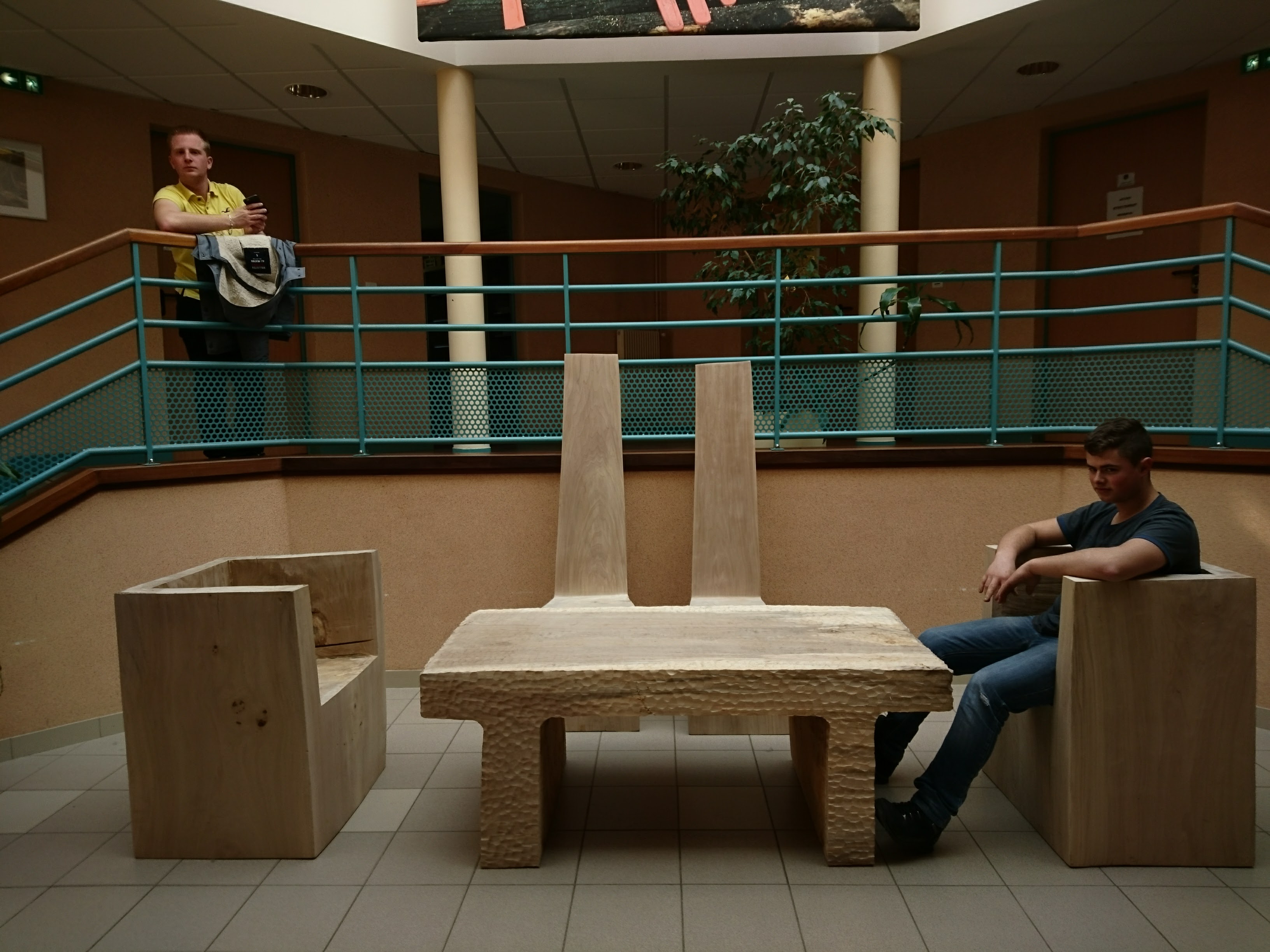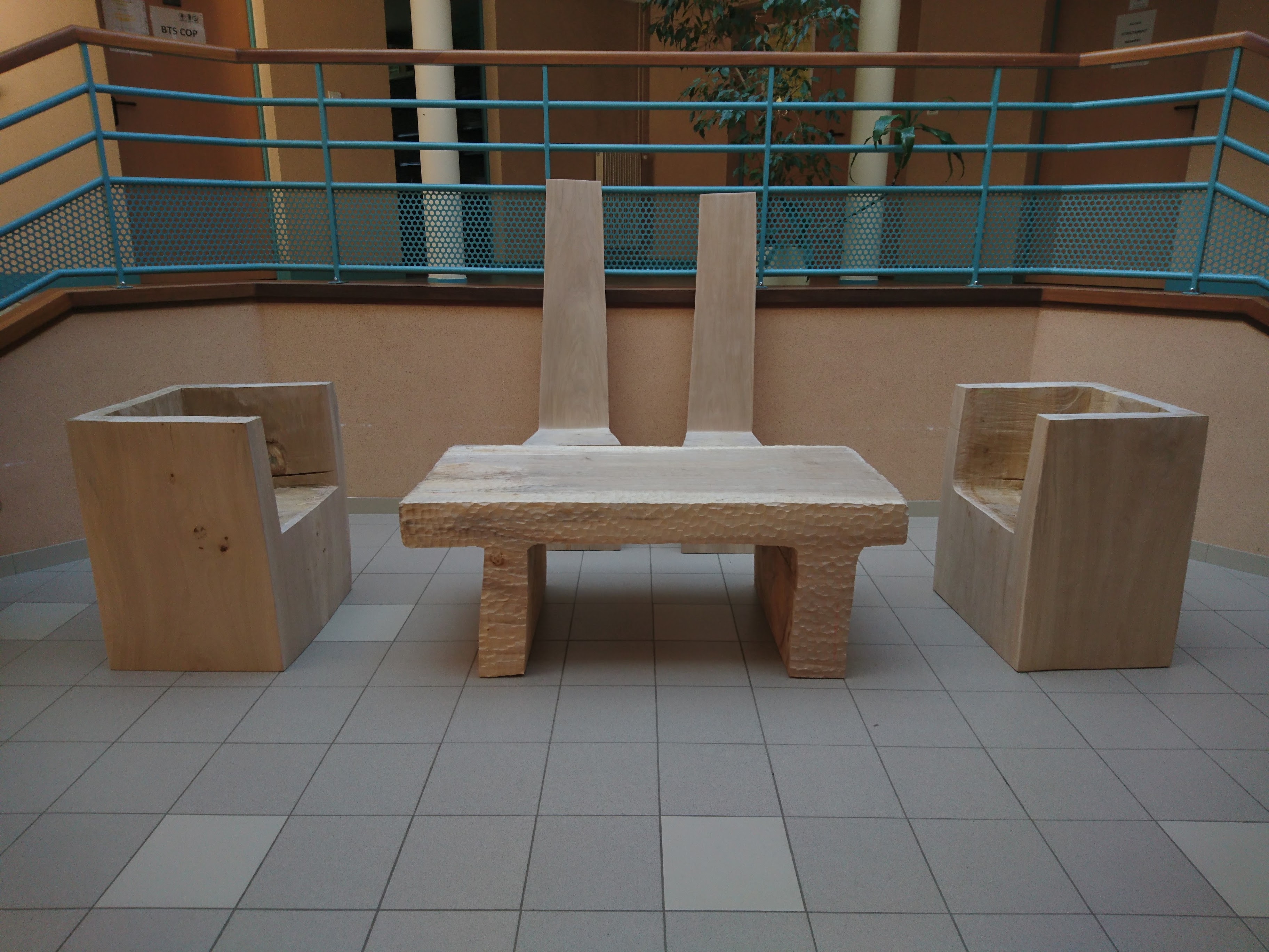 Le mobilier constitué de 2 fauteuils, 2 chaises et d’une table monoxyle en peuplier serve de mobilier dans l’entrée du Lycée.