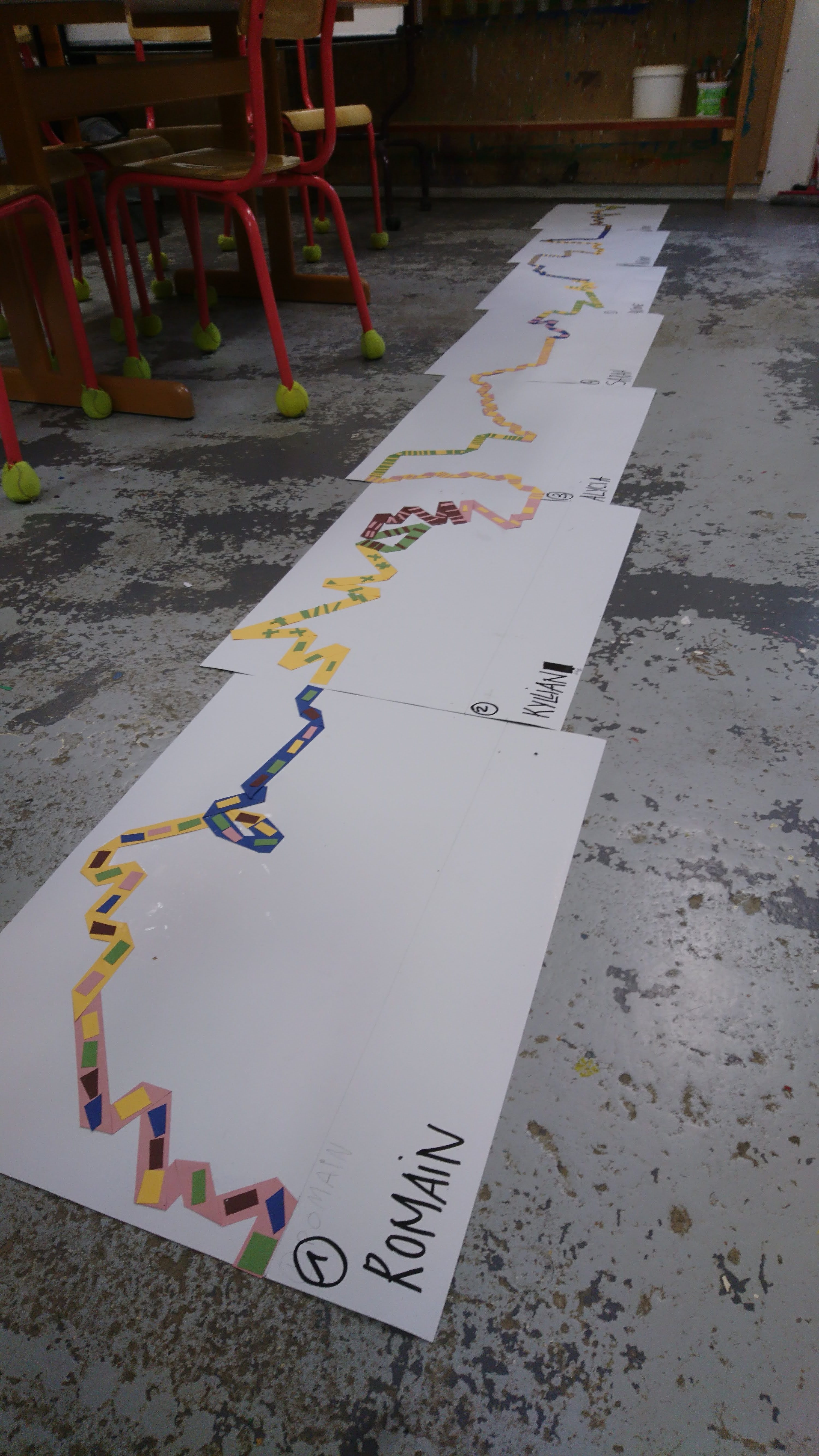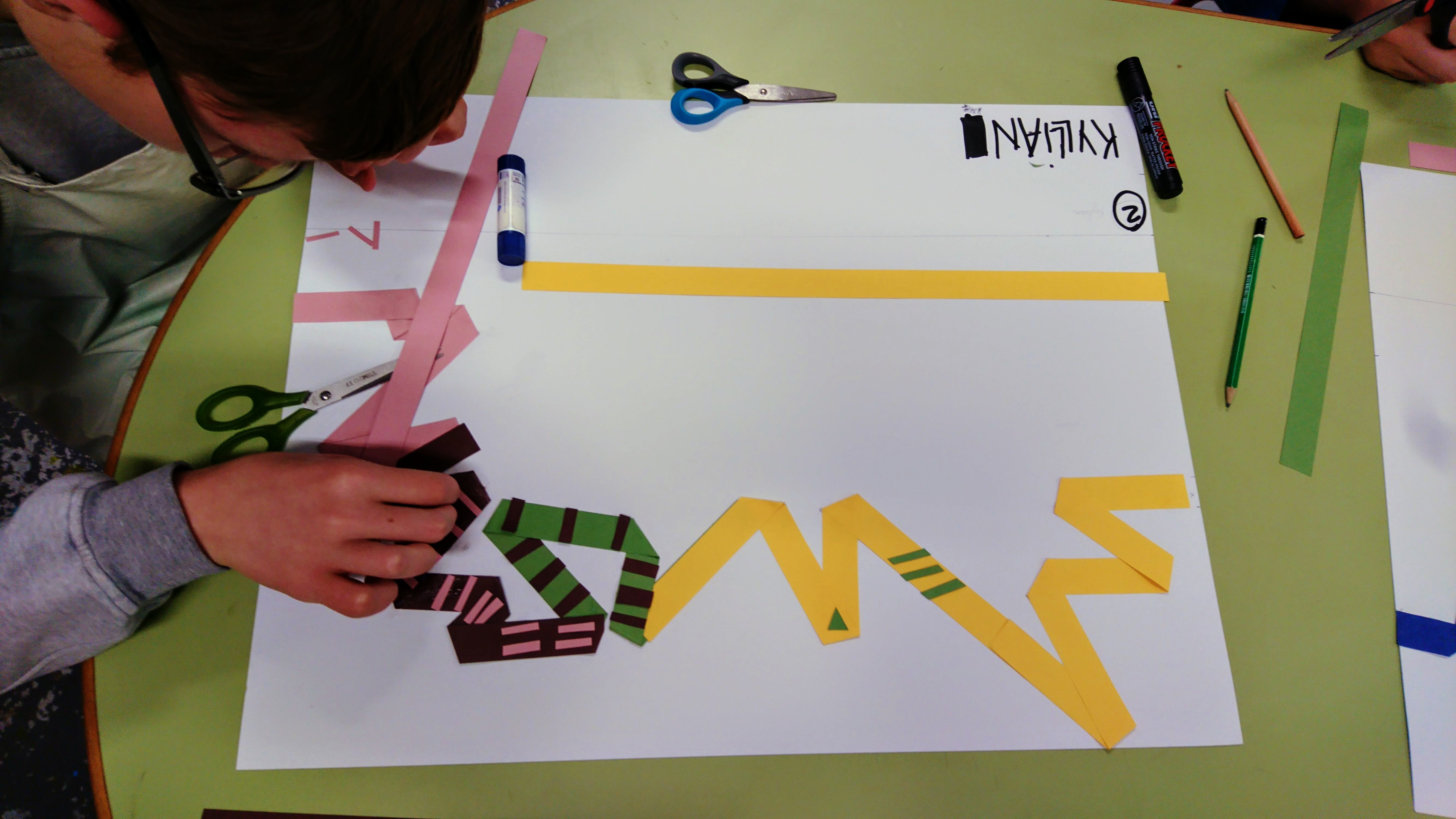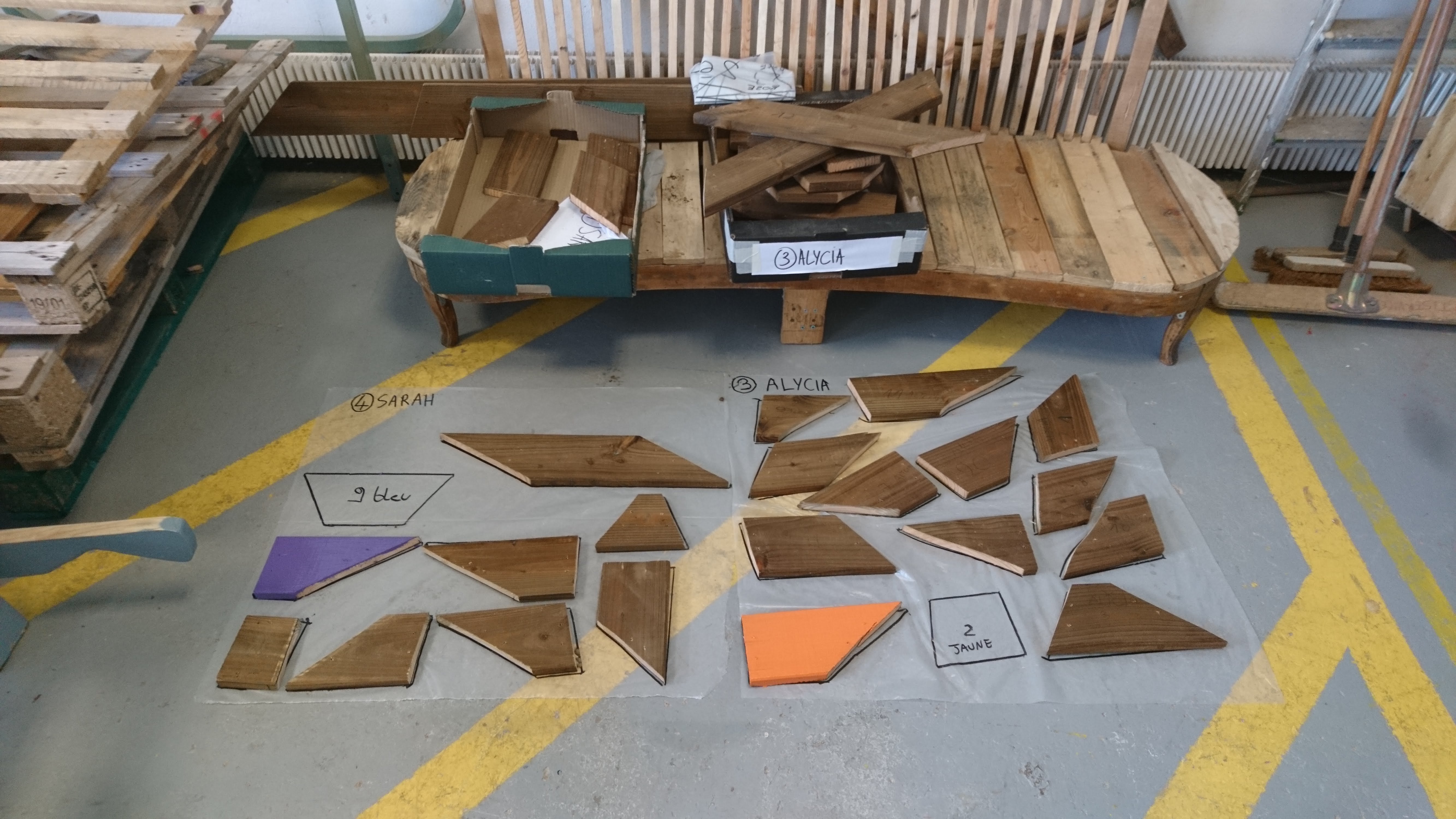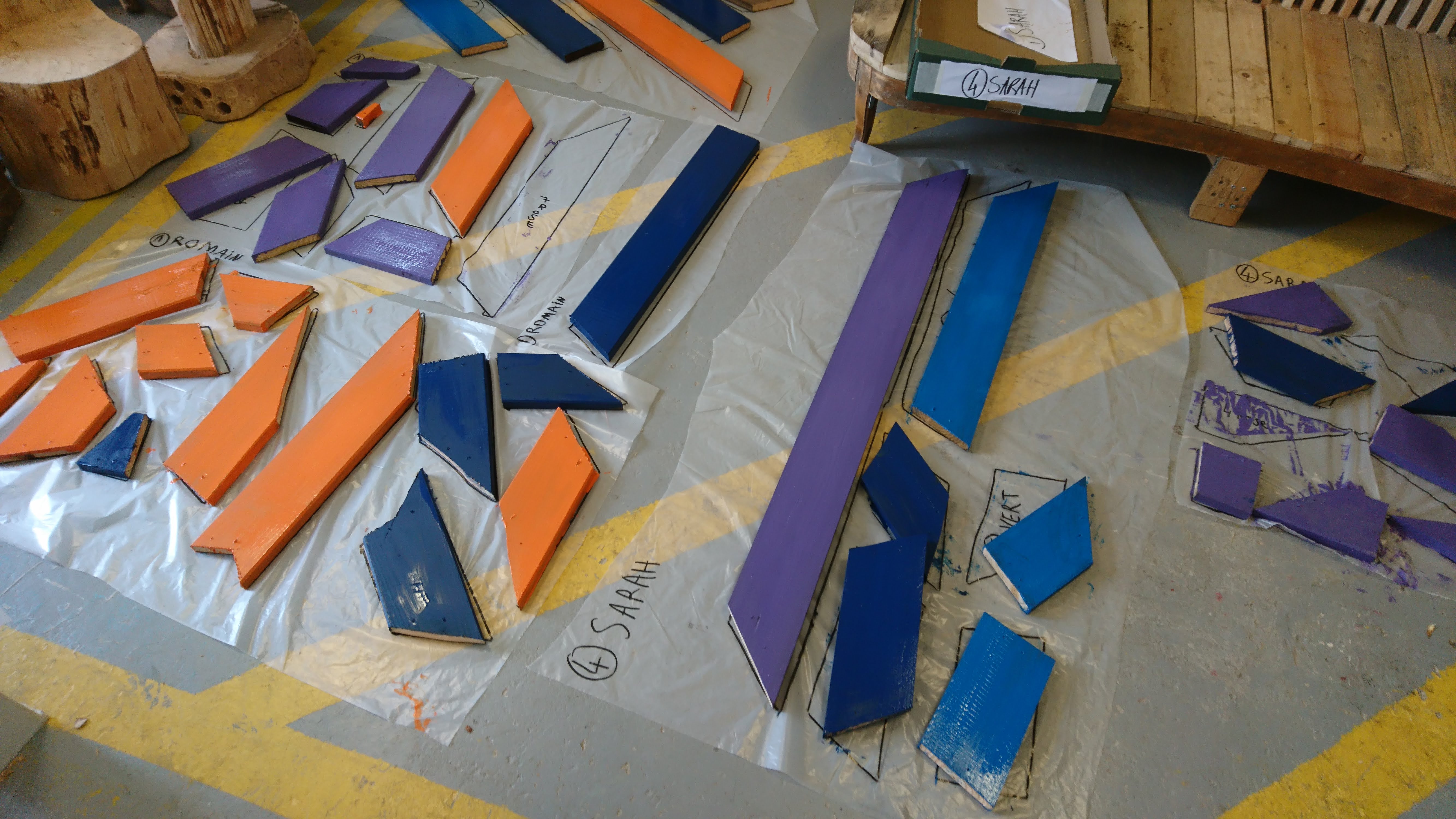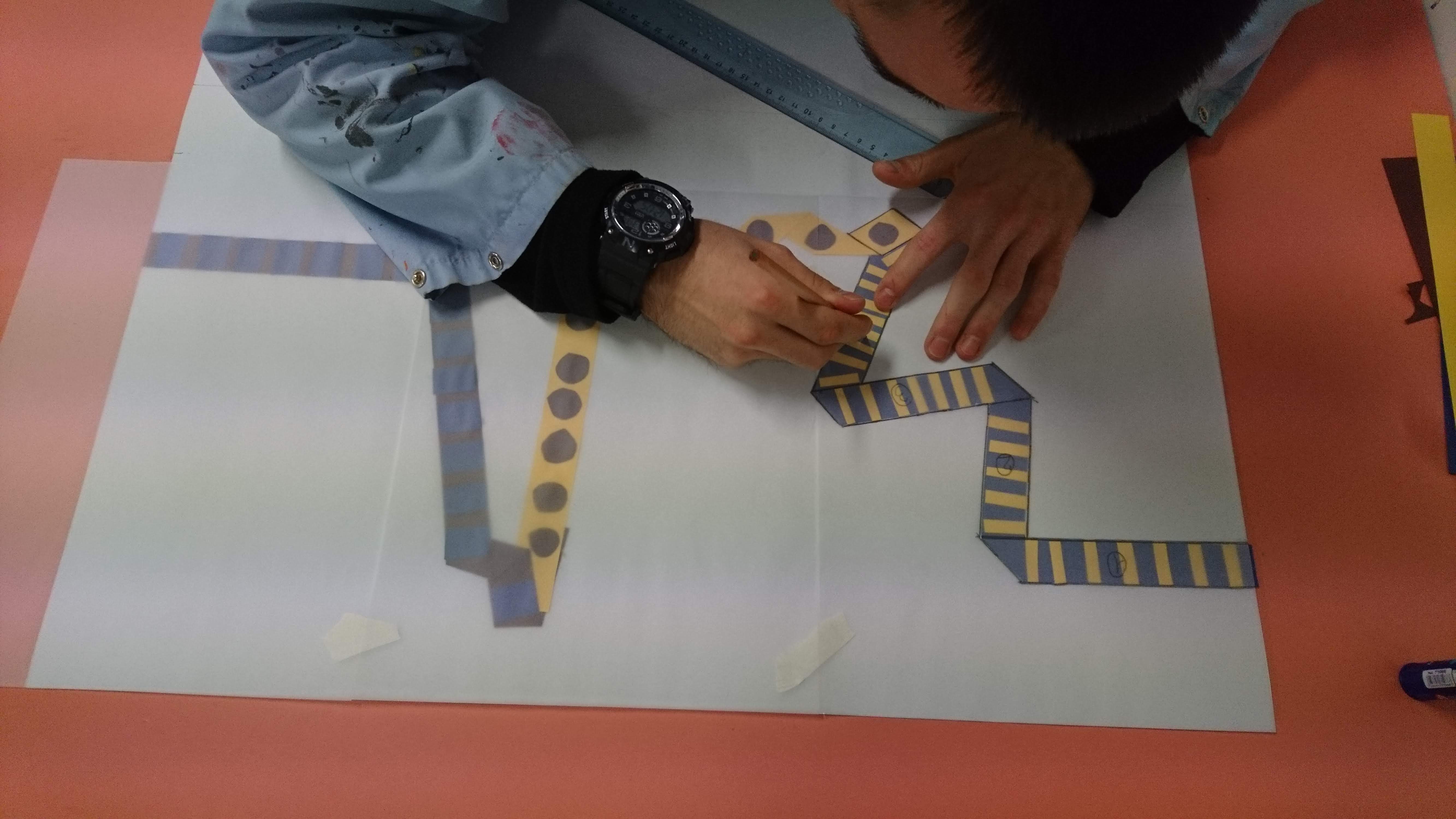 Réalisation dans un premier temps à partir de bande de papier de couleur pour esquisser le projet final (à l’échelle). Pour ensuite faire un travail avec des tasseaux de bois.