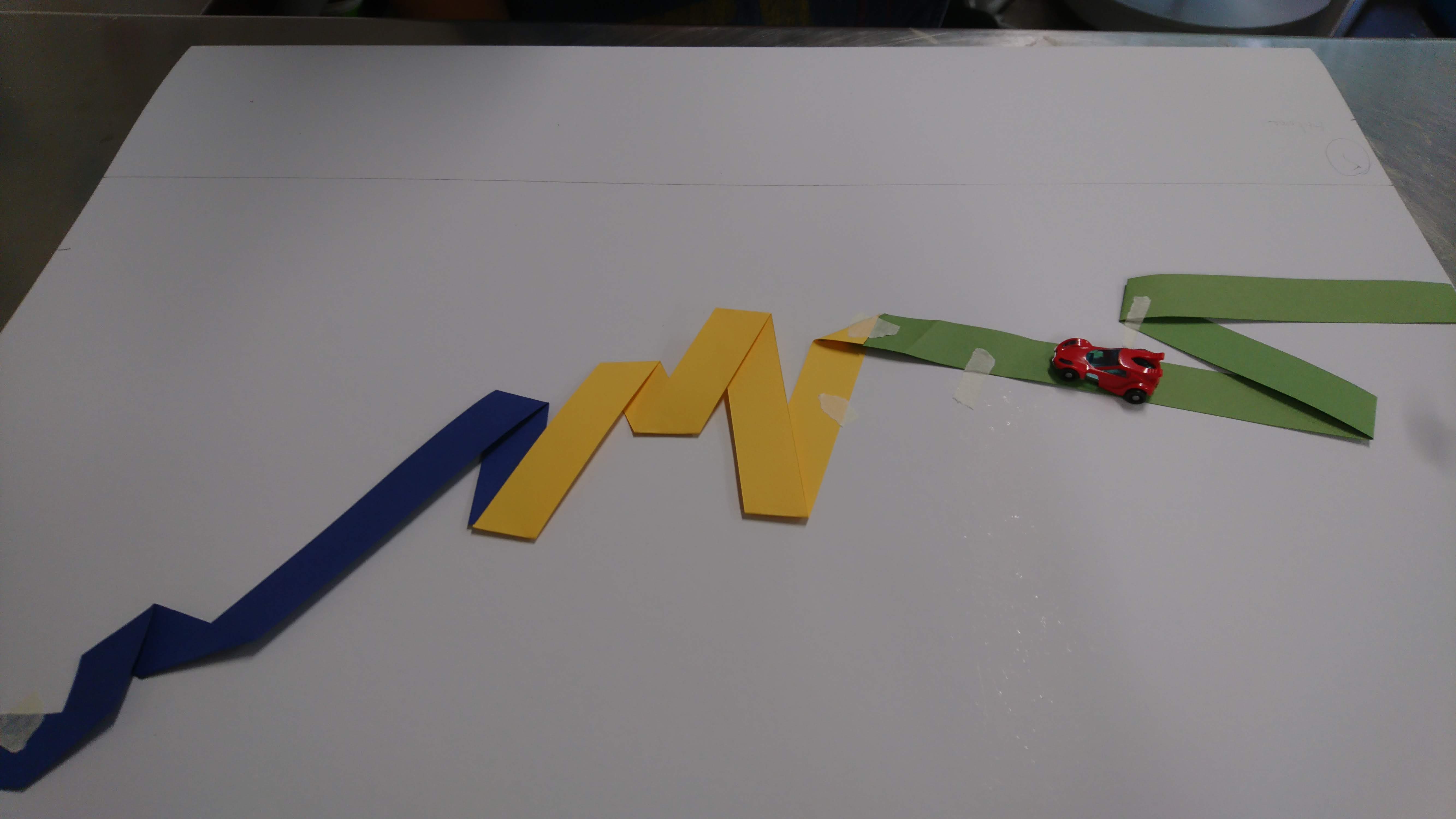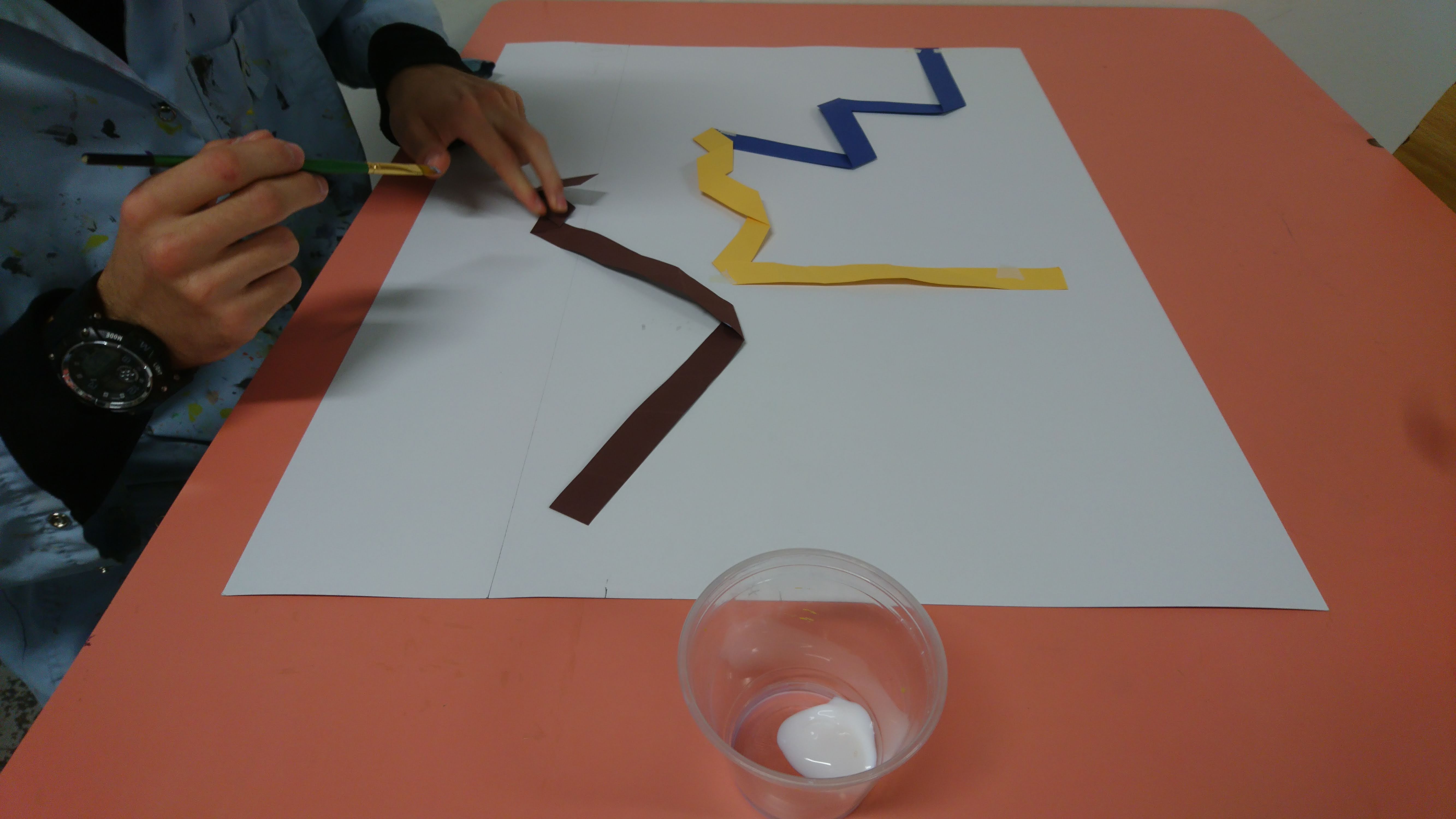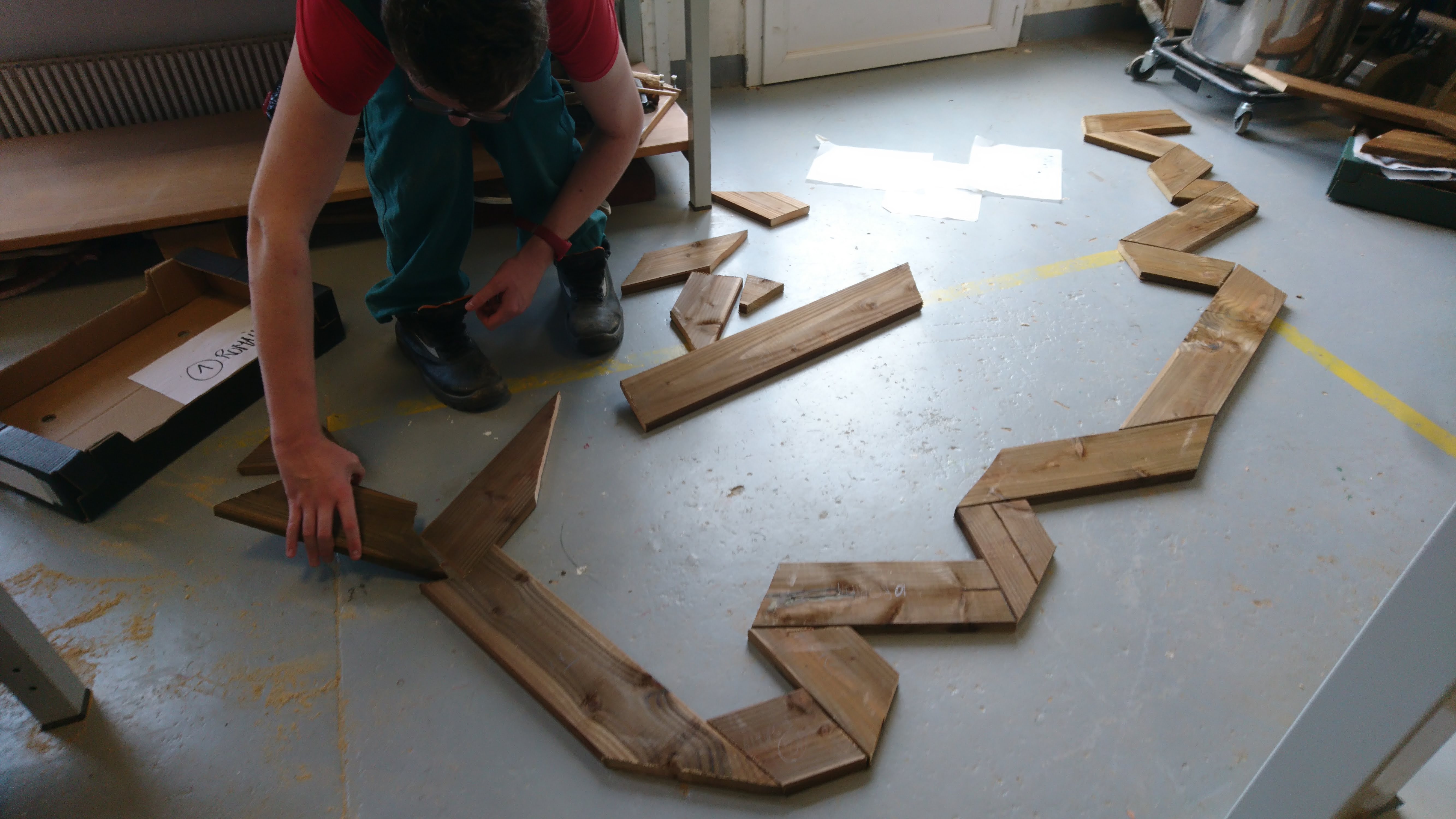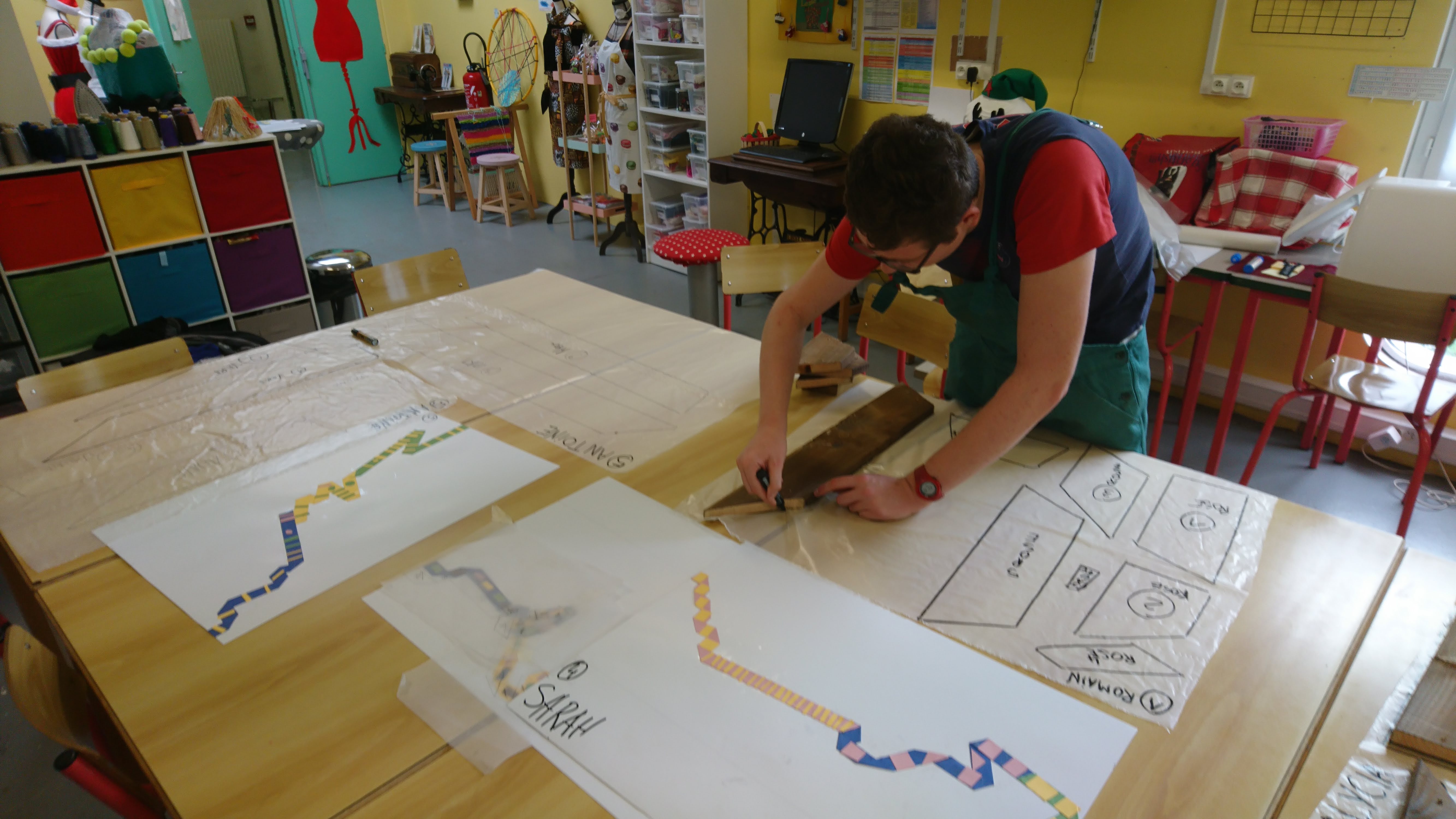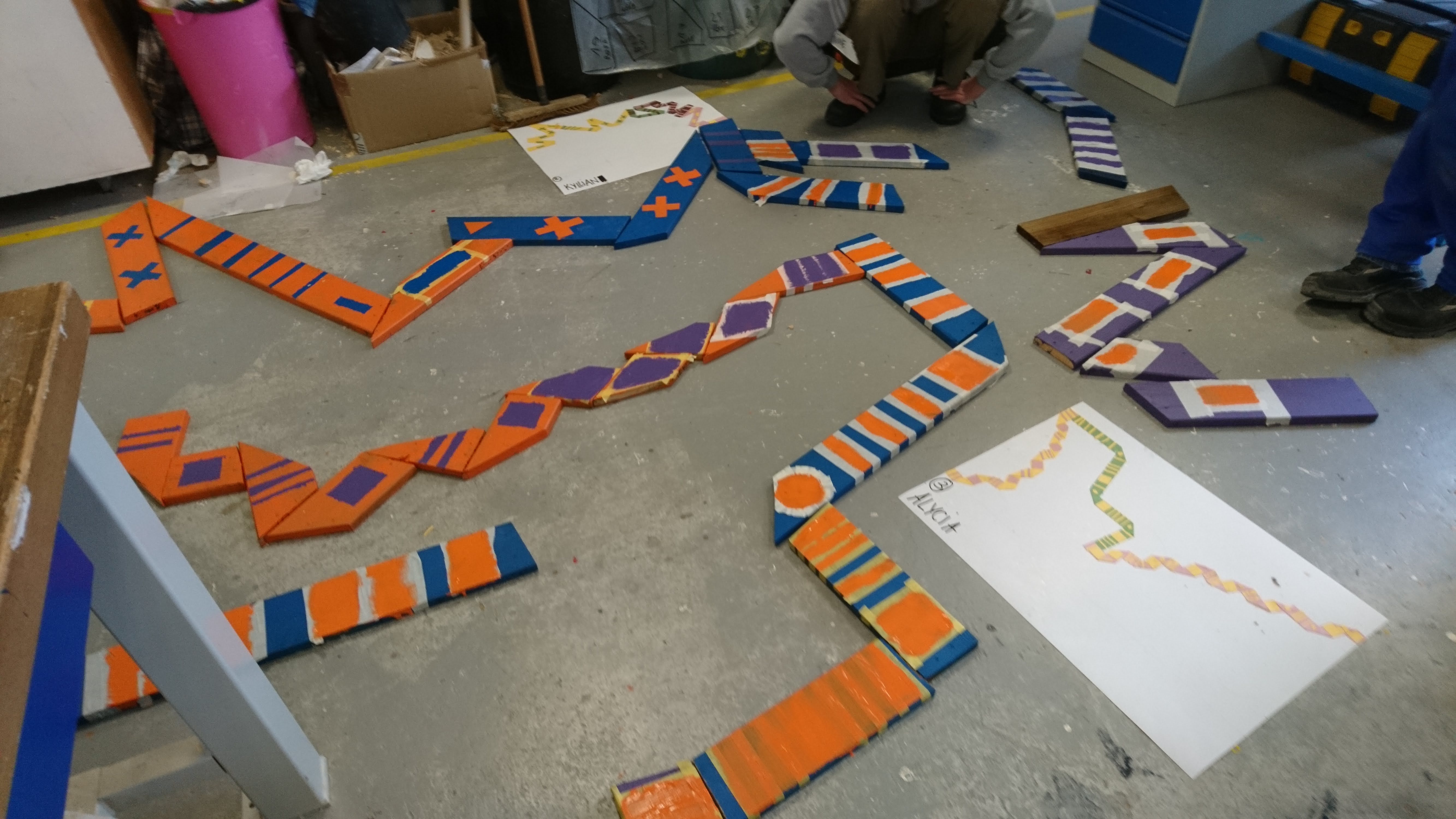 Réalisation dans un premier temps à partir de bande de papier de couleur pour esquisser le projet final (à l’échelle). Pour ensuite faire un travail avec des tasseaux de bois.