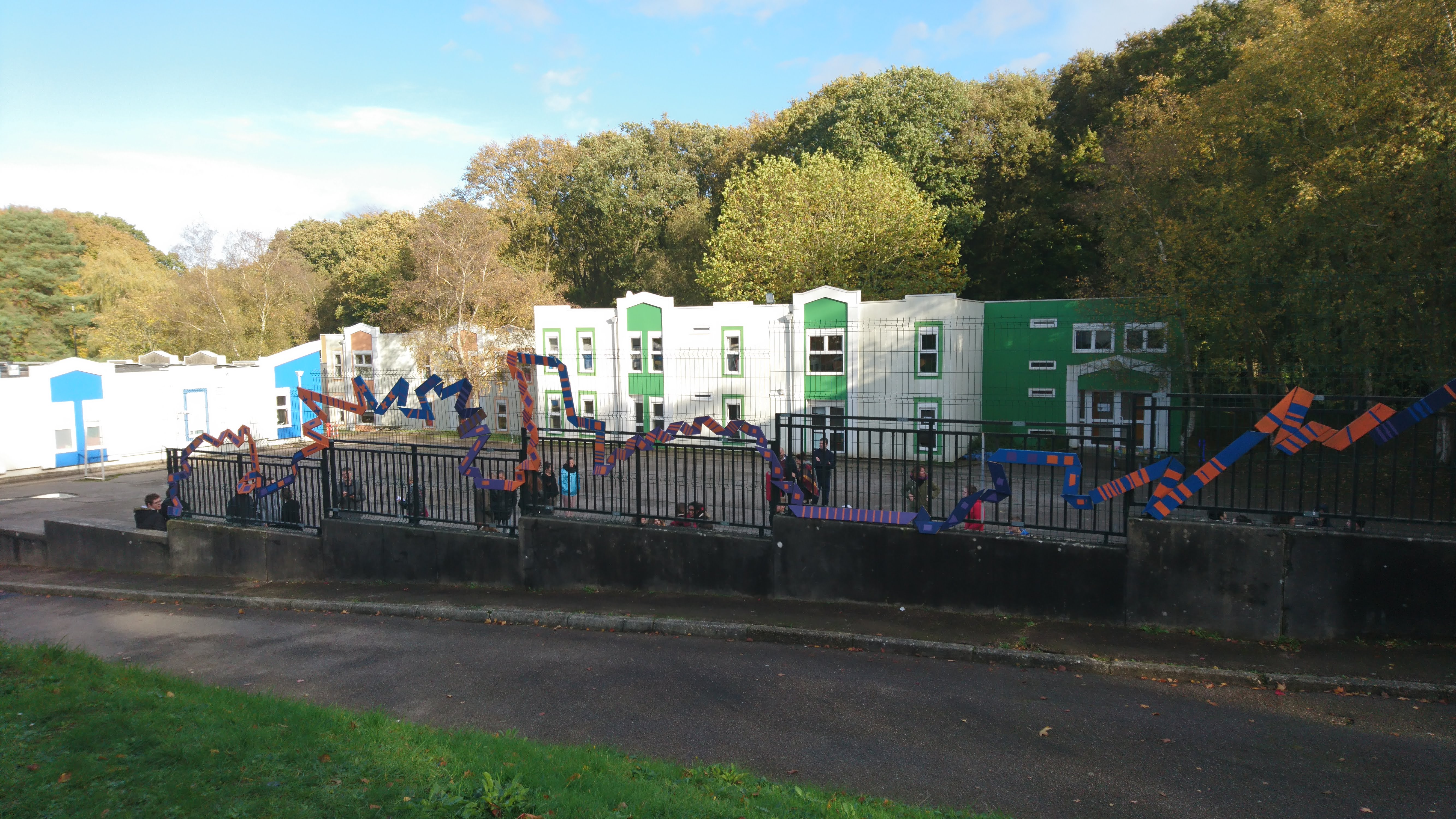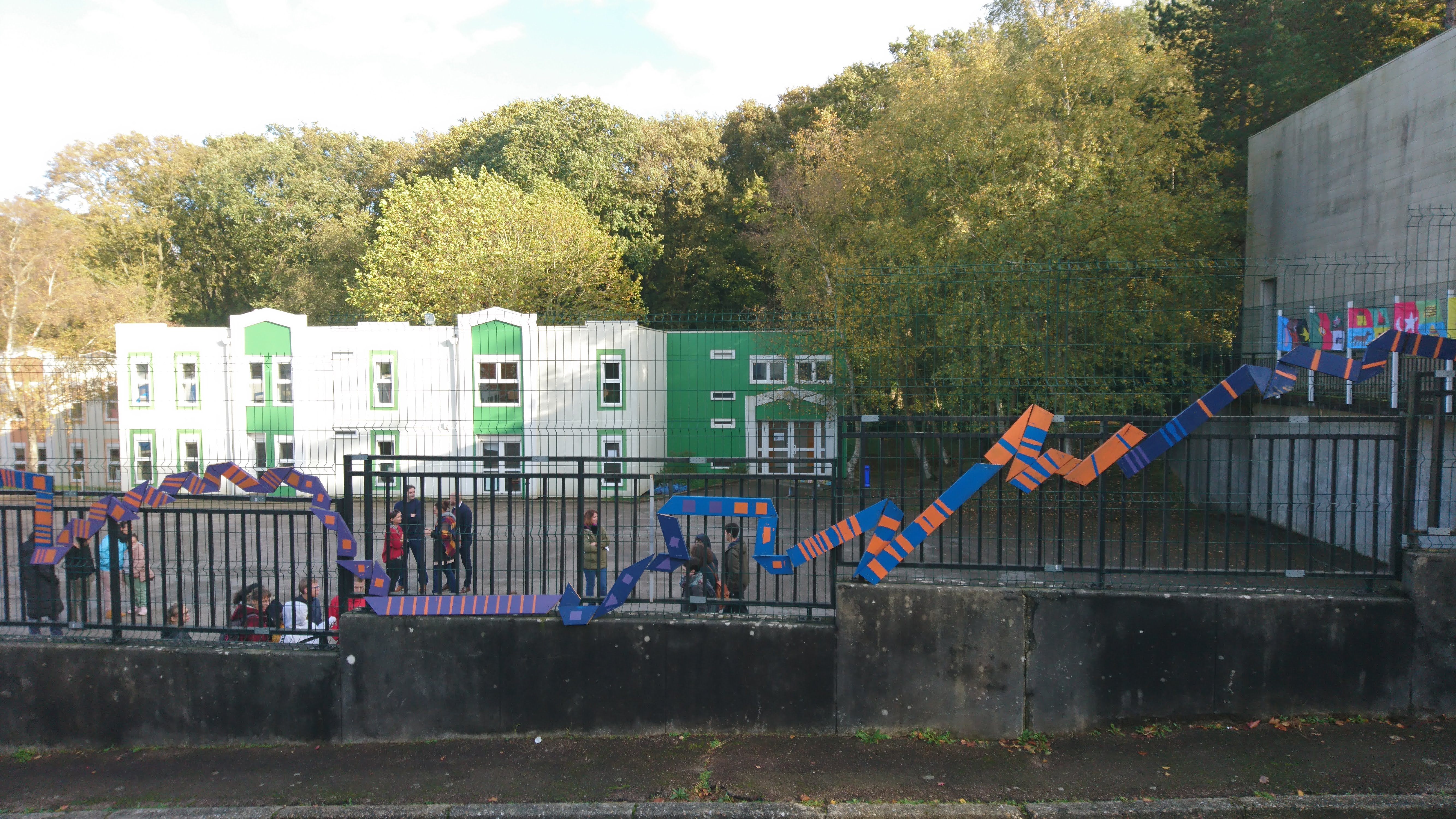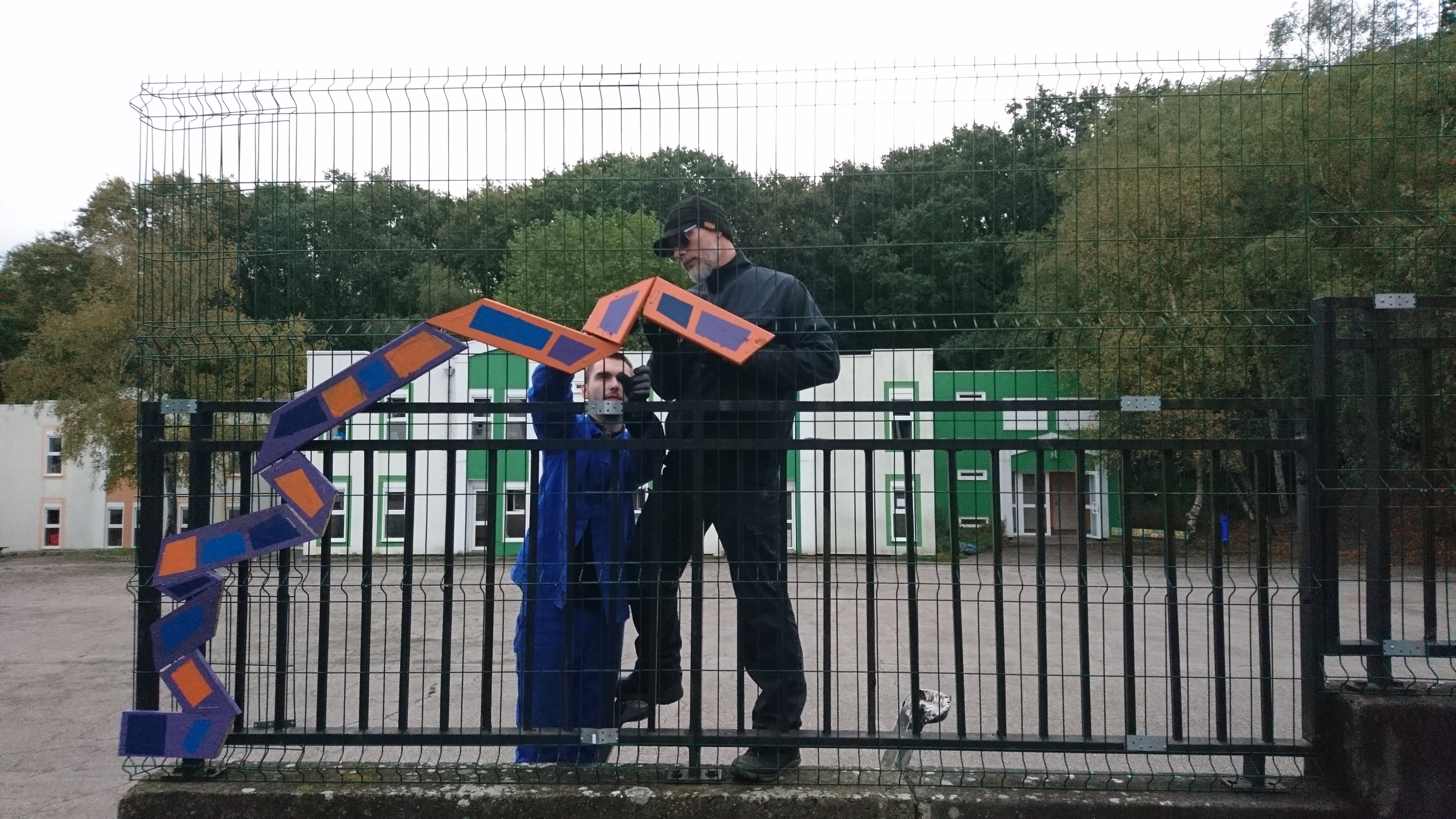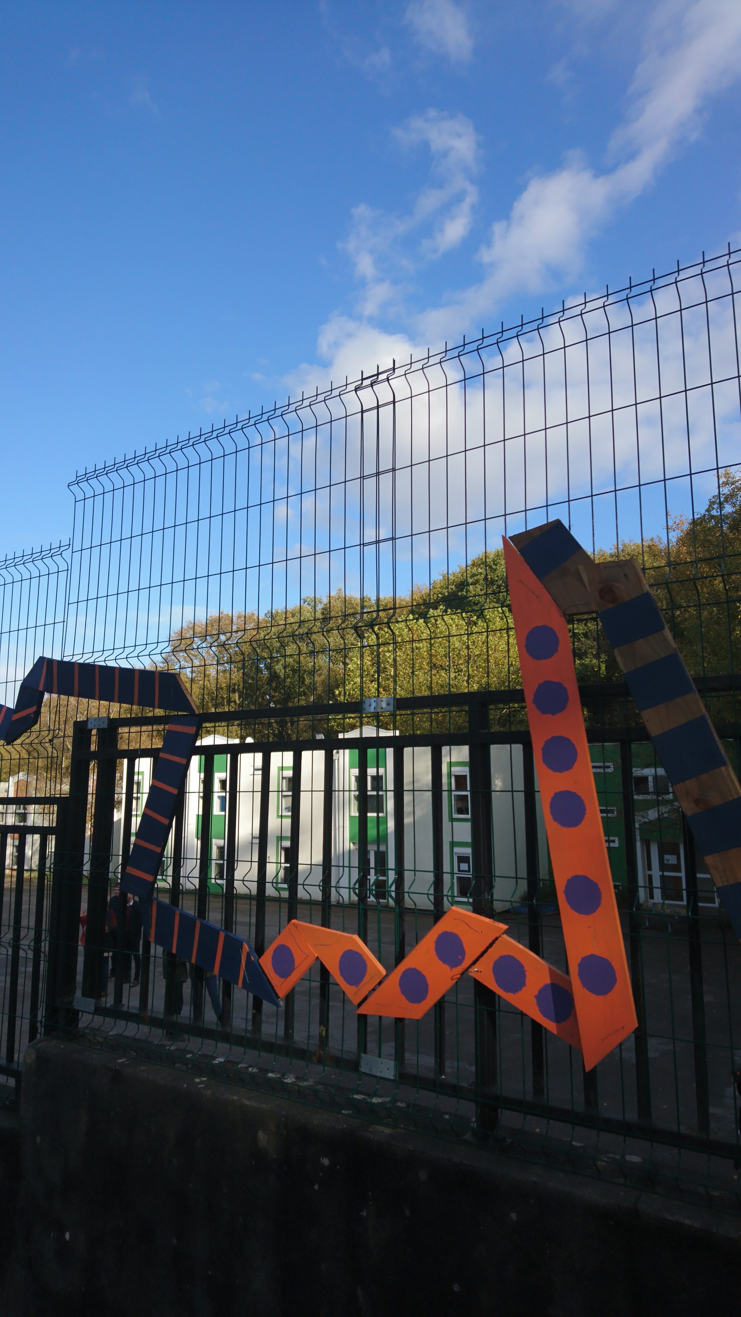 Restitution : Une installation coloré en bois sur une des grilles de la cours de l’IME
