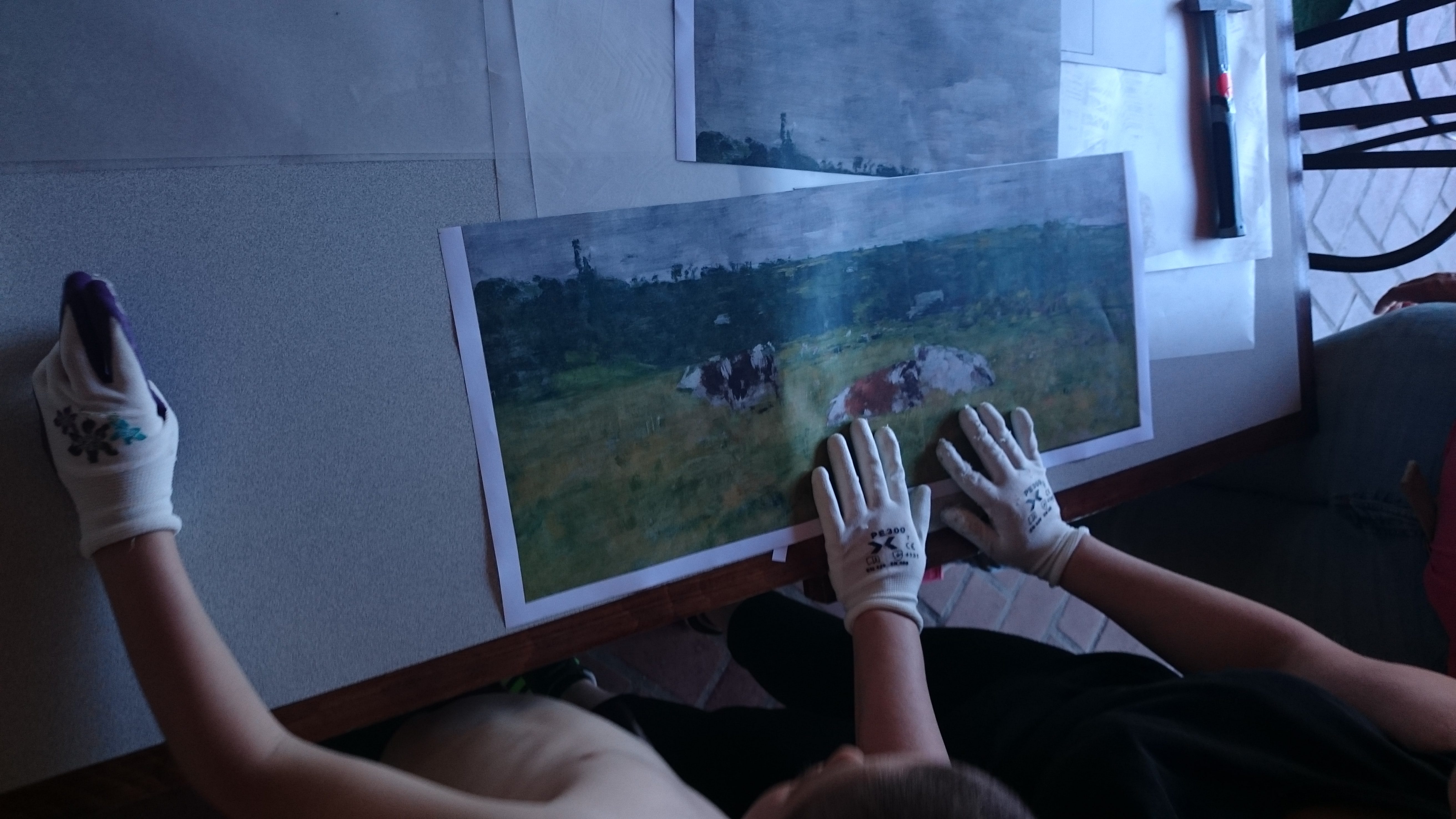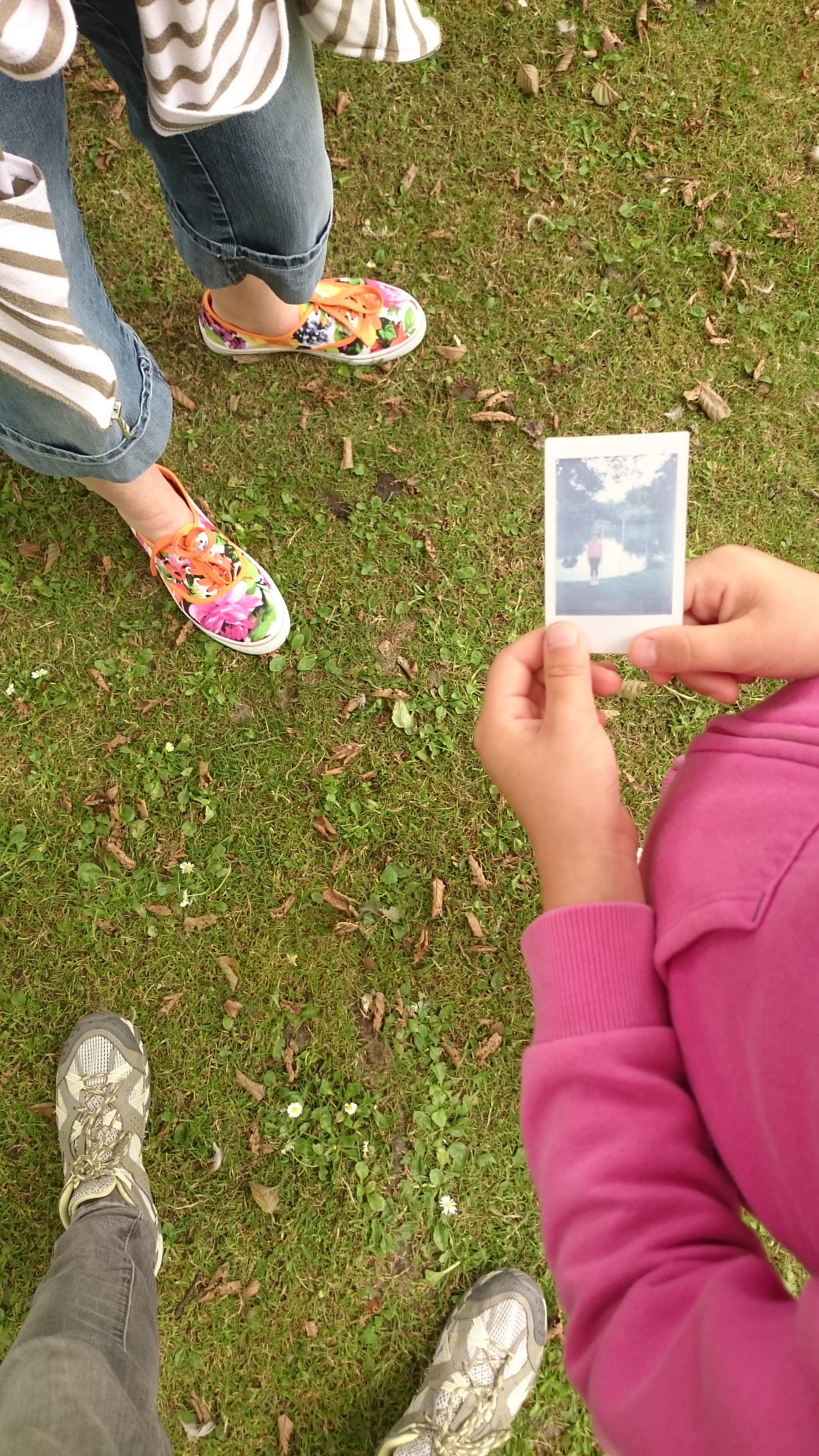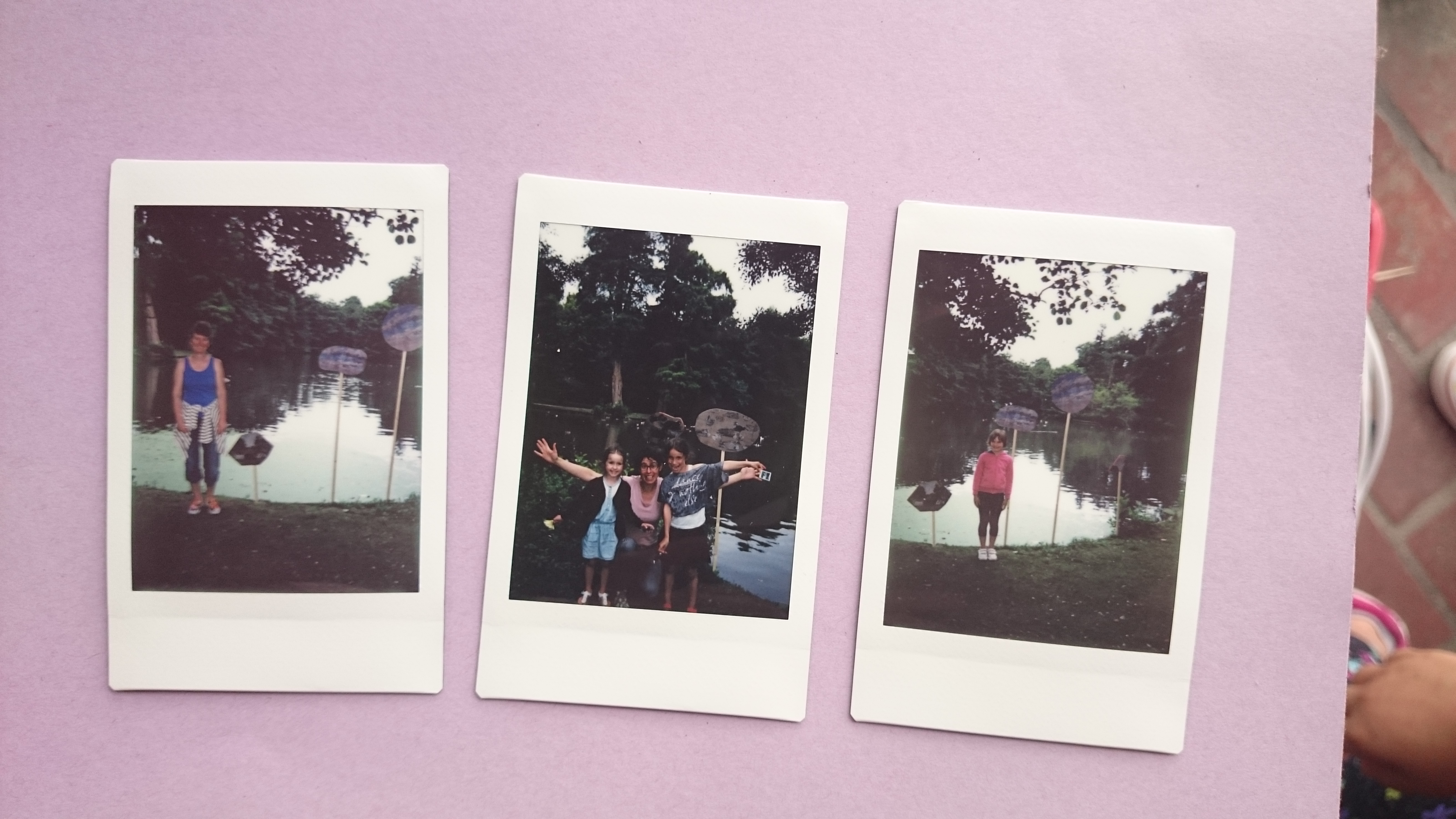 Ces fragments de peintures ont été ensuite installés, dispersés, dans des endroits du parc choisis par chaque participant puis ils ont été pris en photo a l’endroit choisis par le parc chacun avec sa pastille visuelle avec un polaroïd.