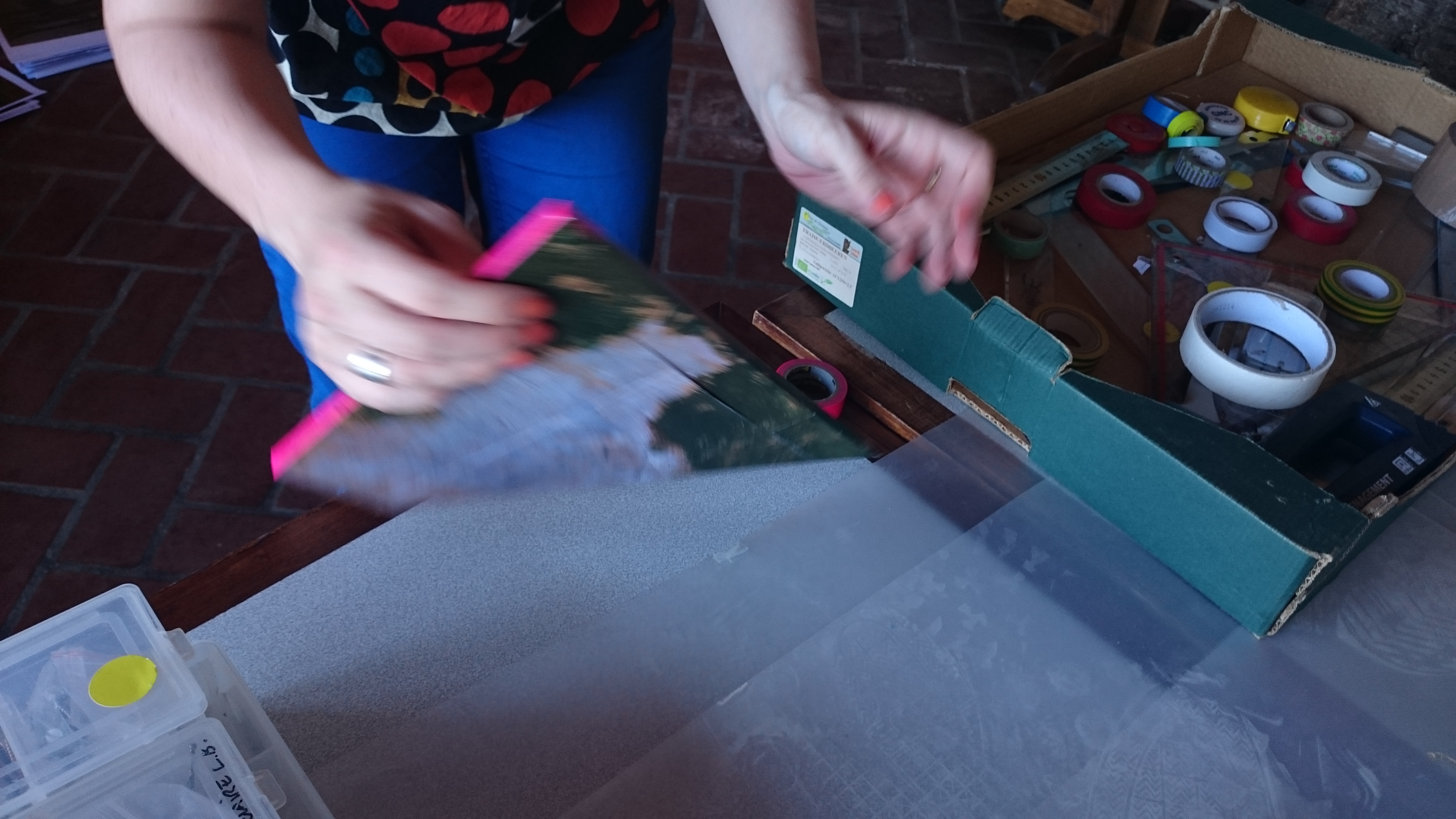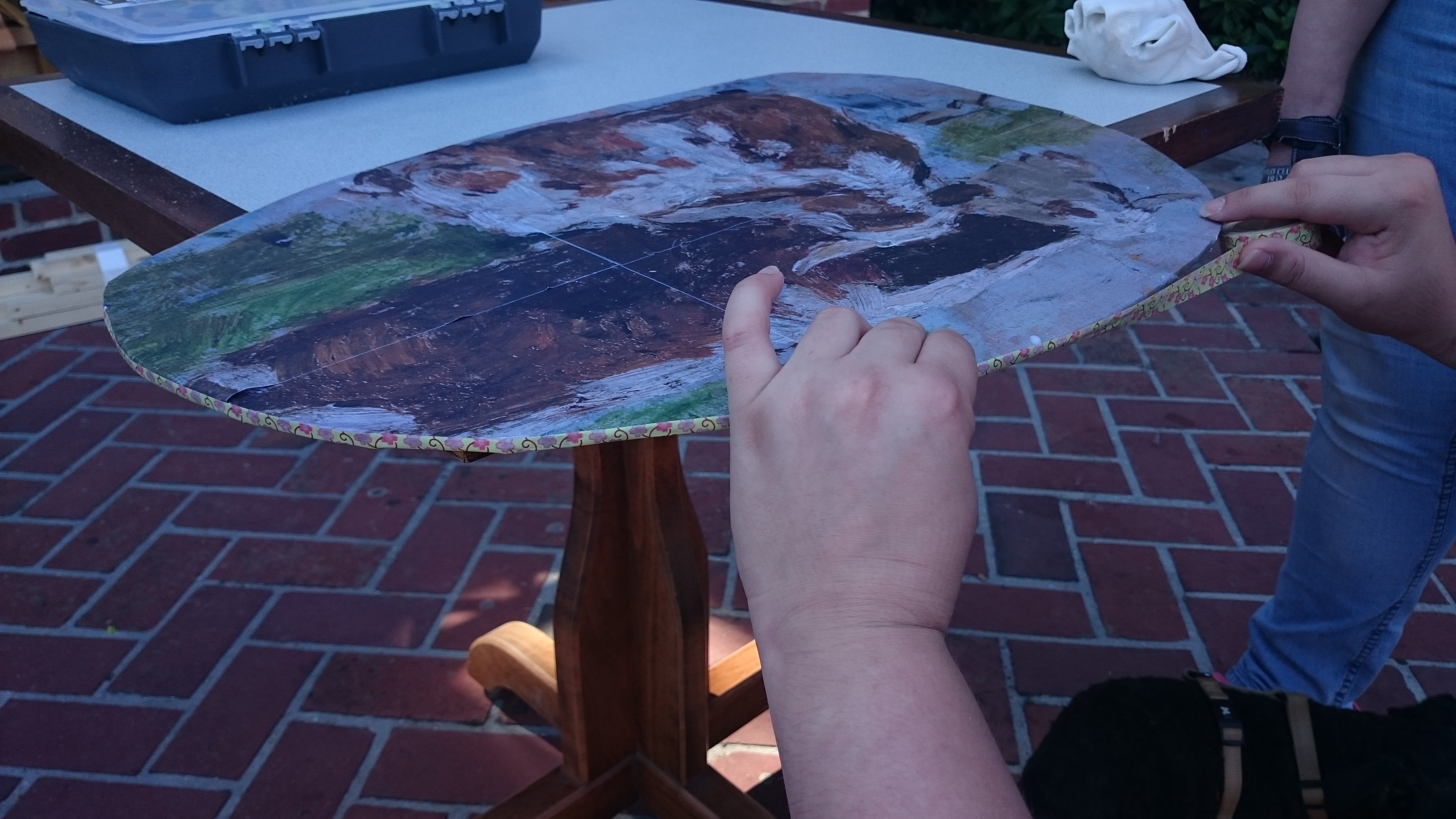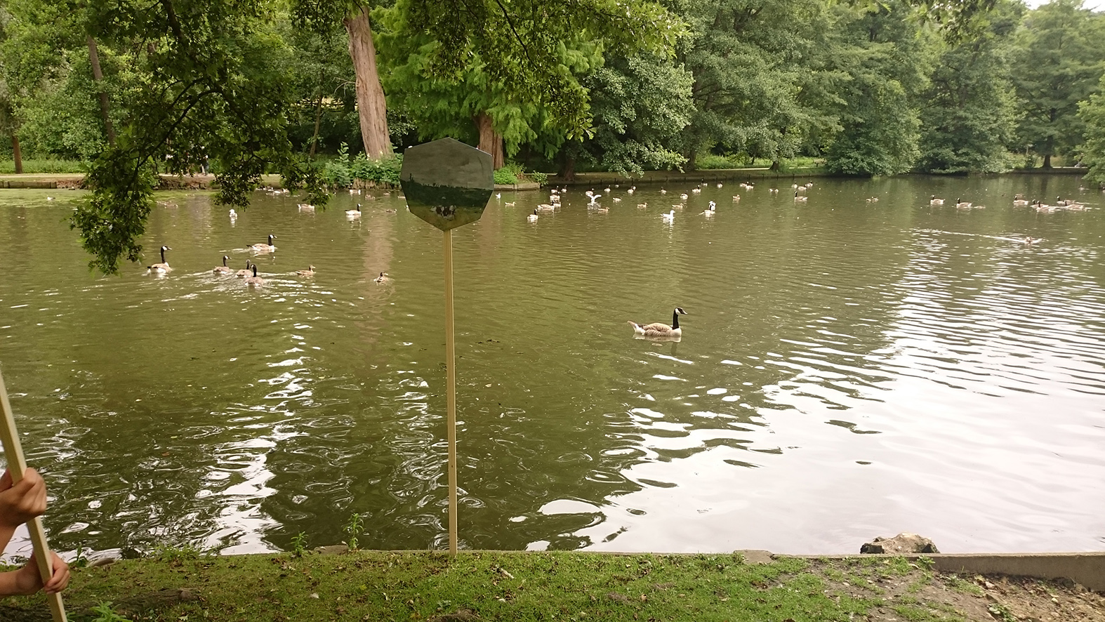 Ces fragments de peintures ont été ensuite installés, dispersés, dans des endroits du parc choisis par chaque participant puis ils ont été pris en photo a l’endroit choisis par le parc chacun avec sa pastille visuelle avec un polaroïd.